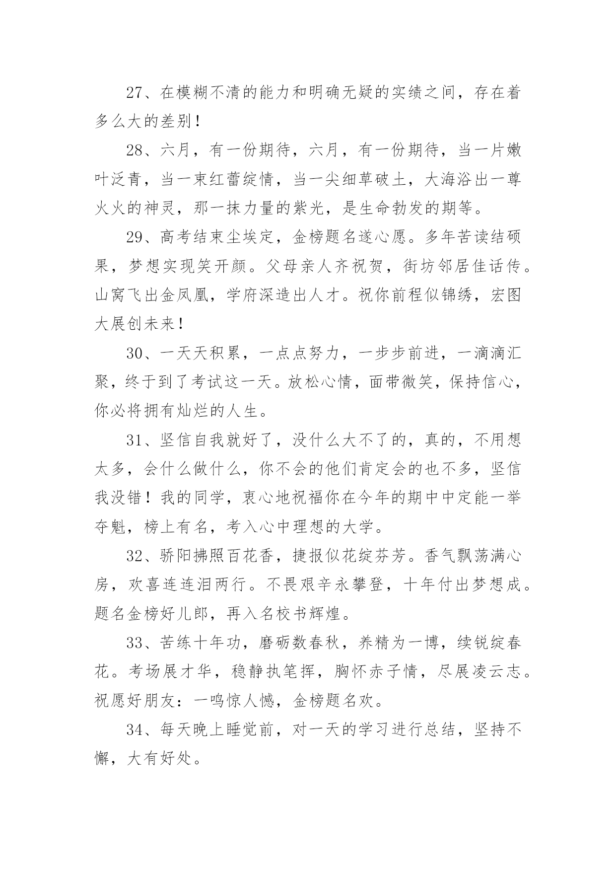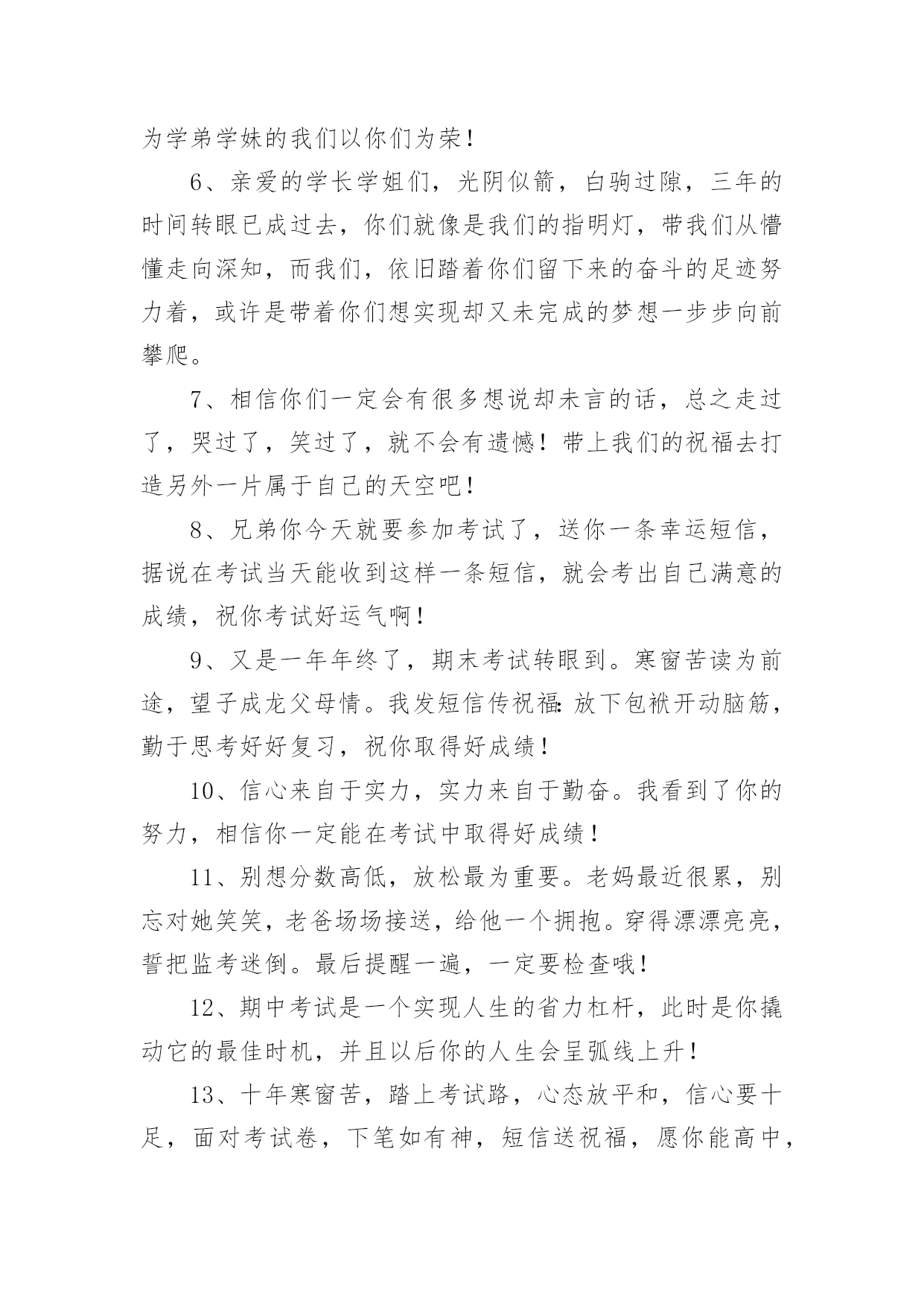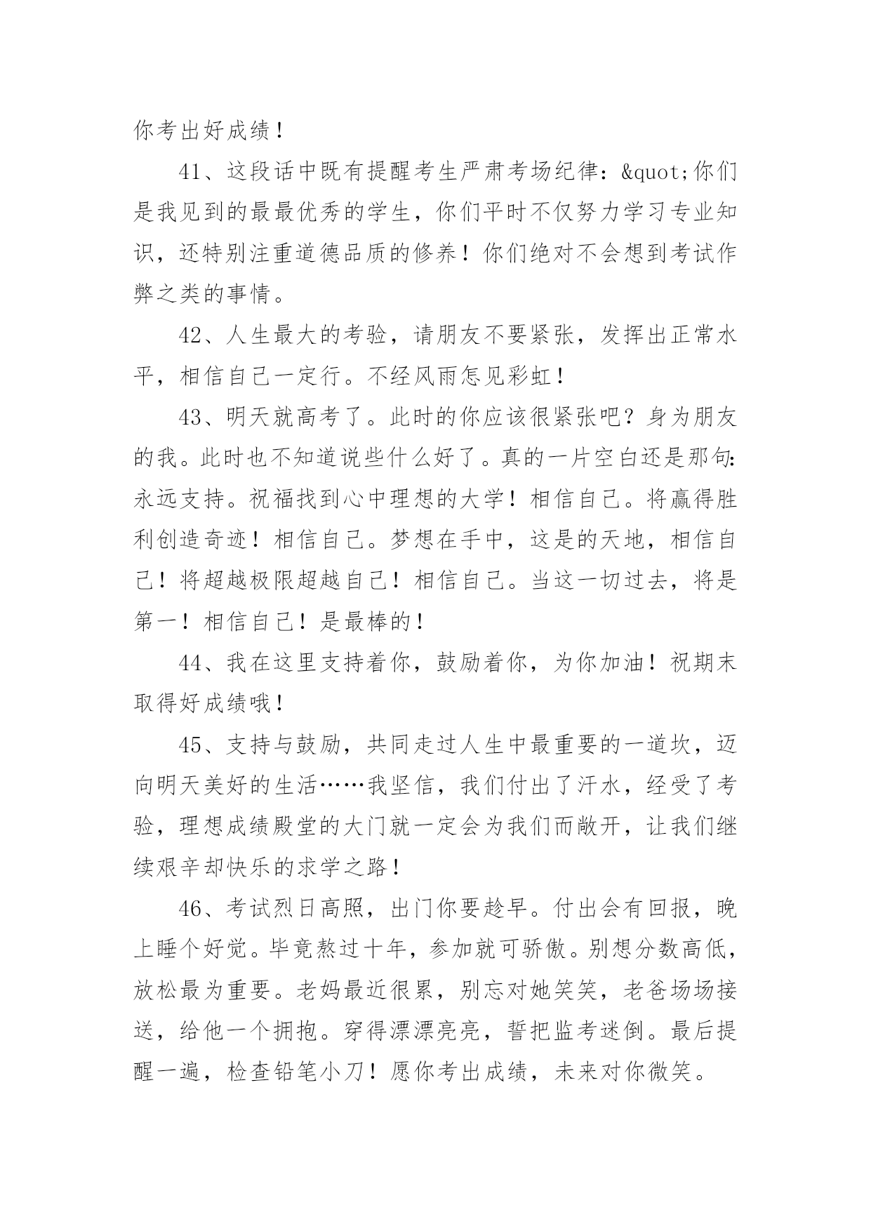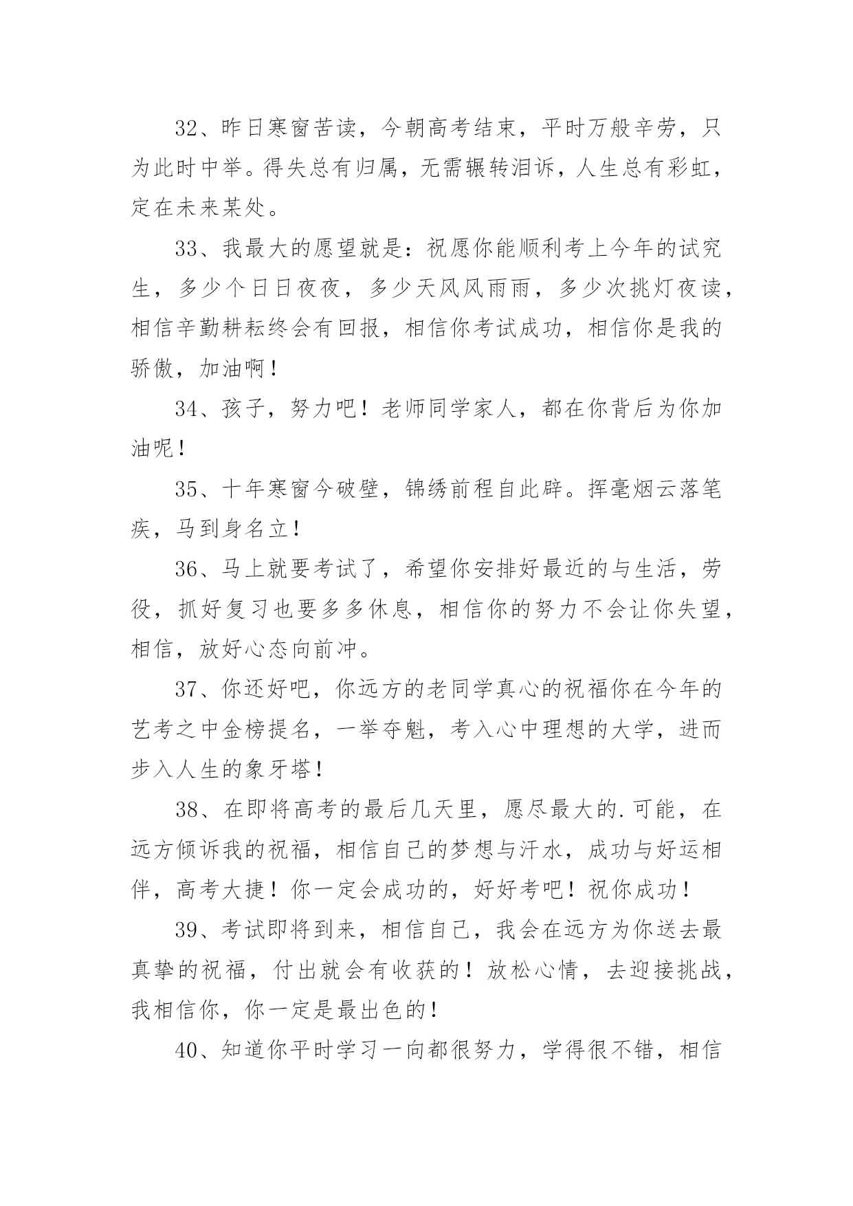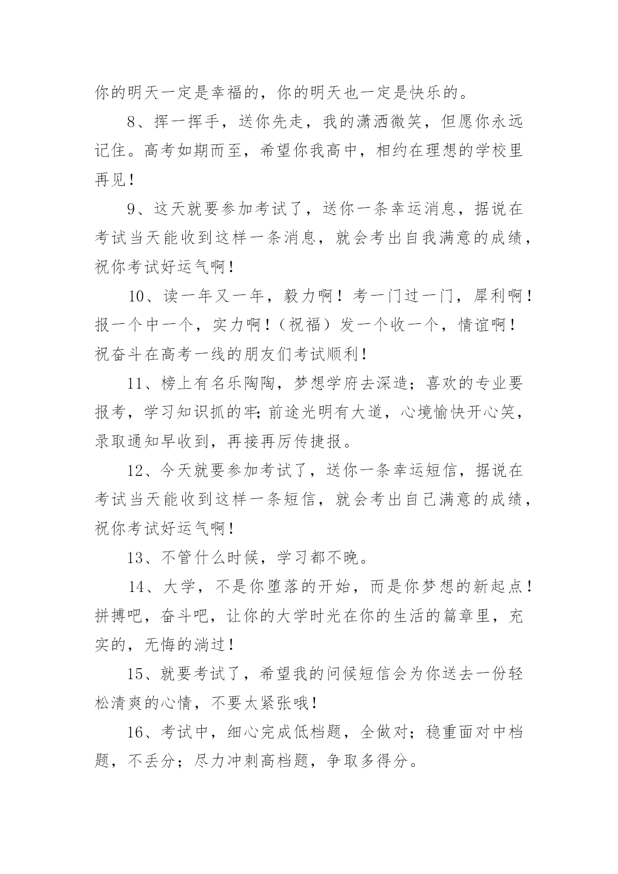 祝愿考试成功寄语关于祝愿考试成功寄语在平凡的学习、工作、生活中,大家最不陌生的就是寄语了吧,借助寄语人们可以寄托自己的希望。你知道寄语怎样写才规范吗?以下是小编整理的关于祝愿考试成功寄语,欢迎阅读,希望大家能够喜欢。祝愿考试成功寄语11、高考到,四化建设不能少。心态需要"冷静化"沉着应答不心慌;应考保持"自信化",发挥能力不失常;审题维持"细心化",心思缜密不马虎;答题尽量"工整化"字迹清秀不邋遢。四化工作做好,高考顺利准没跑。愿你高考顺利哦!2、你可以跌倒100次,但是并不妨碍你第101次爬起来。相信自己,你将如此坚强,忘却曾经的失败,义无反顾地去争取未来更大的建树。祝高考成功,蟾宫折桂。3、努力吧!不管结果怎样,经历过,总会有结果的!期末考试的朋友们,为你们祝福,也为自己祈祷!愿梦开始的地方,也是梦想实现的地方!嗯嗯,加油,嗯,加油!4、亲爱的同学,期末考试来了,愿你们考出好成绩,考到自己理想的成绩。5、相信经过三年的磨练,在今后的人生道路上,无论是荆棘丛生,还是鲜花相拥,一帆风顺,你们都能够坦然面对人生,笑看风云。你们是我们的榜样,是我们的骄傲,作为学弟学妹的我们以你们为荣!6、亲爱的学长学姐们,光阴似箭,白驹过隙,三年的时间转眼已成过去,你们就像是我们的指明灯,带我们从懵懂走向深知,而我们,依旧踏着你们留下来的奋斗的足迹努力着,或许是带着你们想实现却又未完成的梦想一步步向前攀爬。7、相信你们一定会有很多想说却未言的话,总之走过了,哭过了,笑过了,就不会有遗憾!带上我们的祝福去打造另外一片属于自己的天空吧!8、兄弟你今天就要参加考试了,送你一条幸运短信,据说在考试当天能收到这样一条短信,就会考出自己满意的成绩,祝你考试好运气啊!9、又是一年年终了,期末考试转眼到。寒窗苦读为前途,望子成龙父母情。我发短信传祝福:放下包袱开动脑筋,勤于思考好好复习,祝你取得好成绩!10、信心来自于实力,实力来自于勤奋。我看到了你的努力,相信你一定能在考试中取得好成绩!11、别想分数高低,放松最为重要。老妈最近很累,别忘对她笑笑,老爸场场接送,给他一个拥抱。穿得漂漂亮亮,誓把监考迷倒。最后提醒一遍,一定要检查哦!12、期中考试是一个实现人生的省力杠杆,此时是你撬动它的最佳时机,并且以后你的人生会呈弧线上升!13、十年寒窗苦,踏上考试路,心态放平和,信心要十足,面对考试卷,下笔如有神,短信送祝福,愿你能高中,马到功自成,金榜定题名。14、亲爱的同学,如果把这份试卷比作一份湛蓝的海,那么,我们现在启航,展开你自信和智慧的双翼,乘风踏浪,你定能收获无限风光!15、同学们,这里是蓝天,你可以振翅高飞;这里是大海,你可以尽情遨游,让我们自信地在此放飞希望,拥抱成功!16、成功的花由汗水浇灌,艰苦的掘流出甘甜的泉,辛劳的付出必有丰厚回报,紫气东来鸿运通天,孜孜不倦今朝梦圆。祝你考试成功!17、明天就是高考了,希望在这最后的日子,你能满怀着信心,发挥出你的水平,考出的成绩!加油;祝你马到成功,鹏程四海,轻松迎考,考试顺利如愿!18、报考事关终身事,切忌马虎对待之,静心思考心中喜,想的答案与他商,分析当今就业潮,择一往上填。高考报考小贴士:祝同学们,金榜题名,心想事成!19、考试在即,收到我的祝福,愿你开开心心上考场,轻轻松松的答题,快快乐乐的出考场,美滋滋的看成绩,幸福的去上理想的大学。20、考试的钟声即将要敲响,不管前面是狂风暴雨,还是风驰电掣,希望你都能够谈笑自如去面对,相信自己,一定能够鲤鱼跳龙门,门门考高分!21、加油!我要成为成功的那个人,而不是看着别人成功的那个人!!22、四级六级屈服于你,高分羡慕环抱着你,勤奋努力支持着你,美好人生等待着你!23、你看到了吗?梦想中的学府在向你走来;你听到了吗?家人朋友的掌声与你同在;你感受到了吗?每一份关怀都是没说出口的爱!祝考试成功!24、轻轻松松,考上名校;愿你从容,就在今朝;考场不慌,试题答好;思路准确,门门分高;开心快乐,舒心微笑;难题不怕,信心不少;鱼跃龙门,潇洒逍遥!25、把容易题作对,难题就会变容易。26、那年那月那个孤独的考研人,那山那水那条寂寞的考研路,那曰那夜那颗迷茫的考研心,那恨那爱那份无奈的考研情,那风那雨那个执着的考研梦。27、考试过后好好玩一把吧,用放纵的快乐把考试复习的那些功课统统忘掉,祝你期末取得好成绩哦!28、亲爱的同学,期末考试还有一个星期,愿你考出好成绩。考到自己理想的成绩,在此道出我最真心的祝福:考试顺利,身体健康,一切都好!相信自己,你一定是最棒的!29、每一日你所付出的代价都比前一日高,因为你的生命又消短了一天,所以每一日你都要更积极。今天太宝贵,不应该为酸苦的忧虑和辛涩的悔恨所销