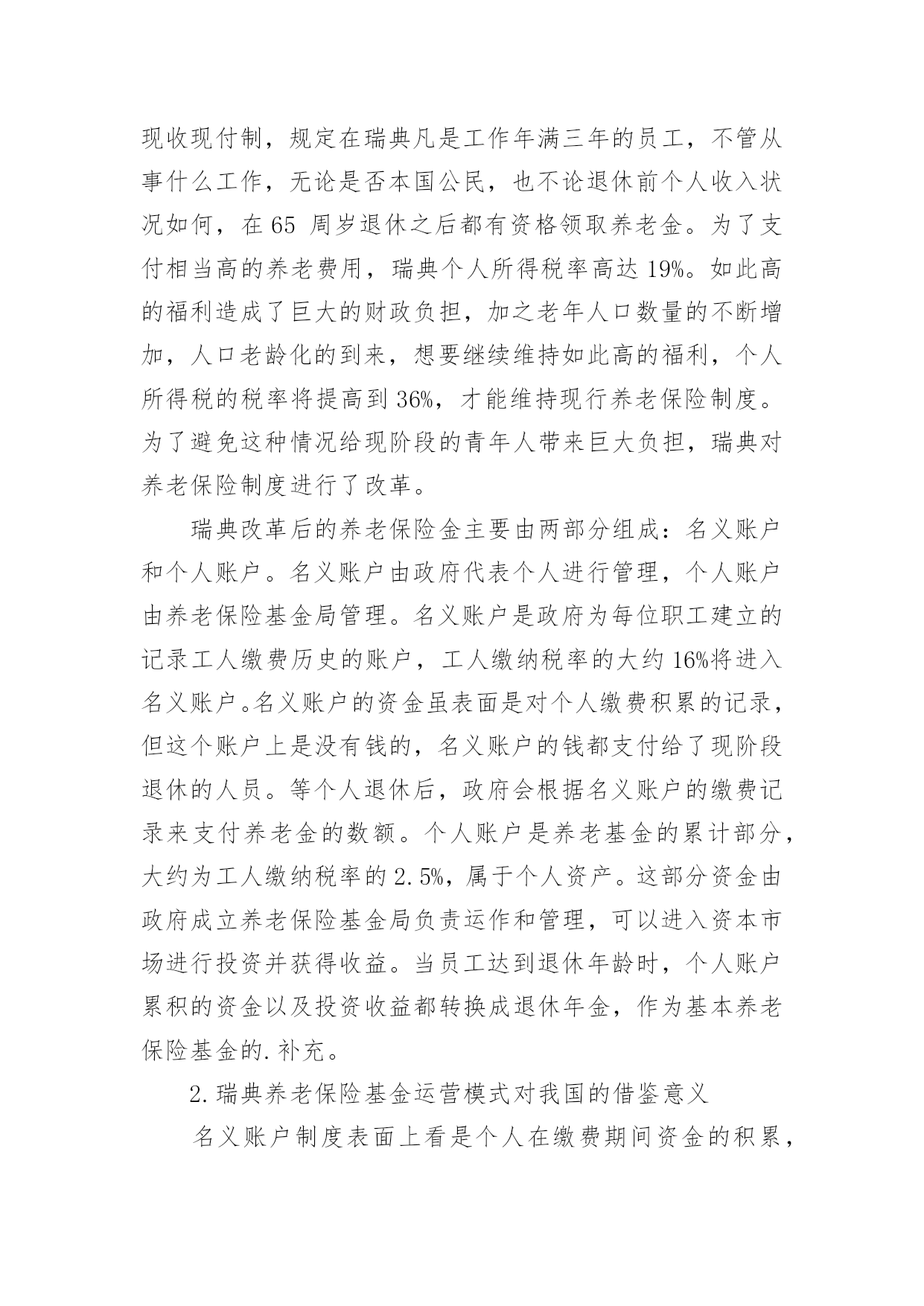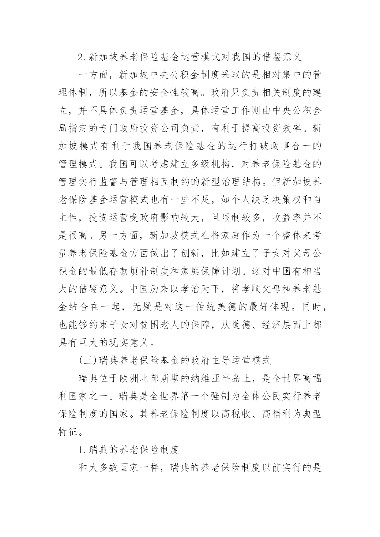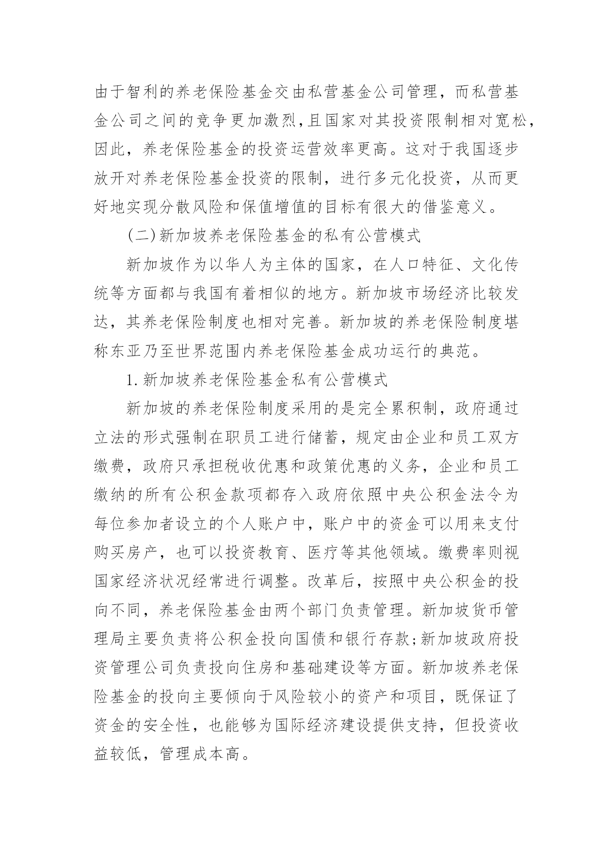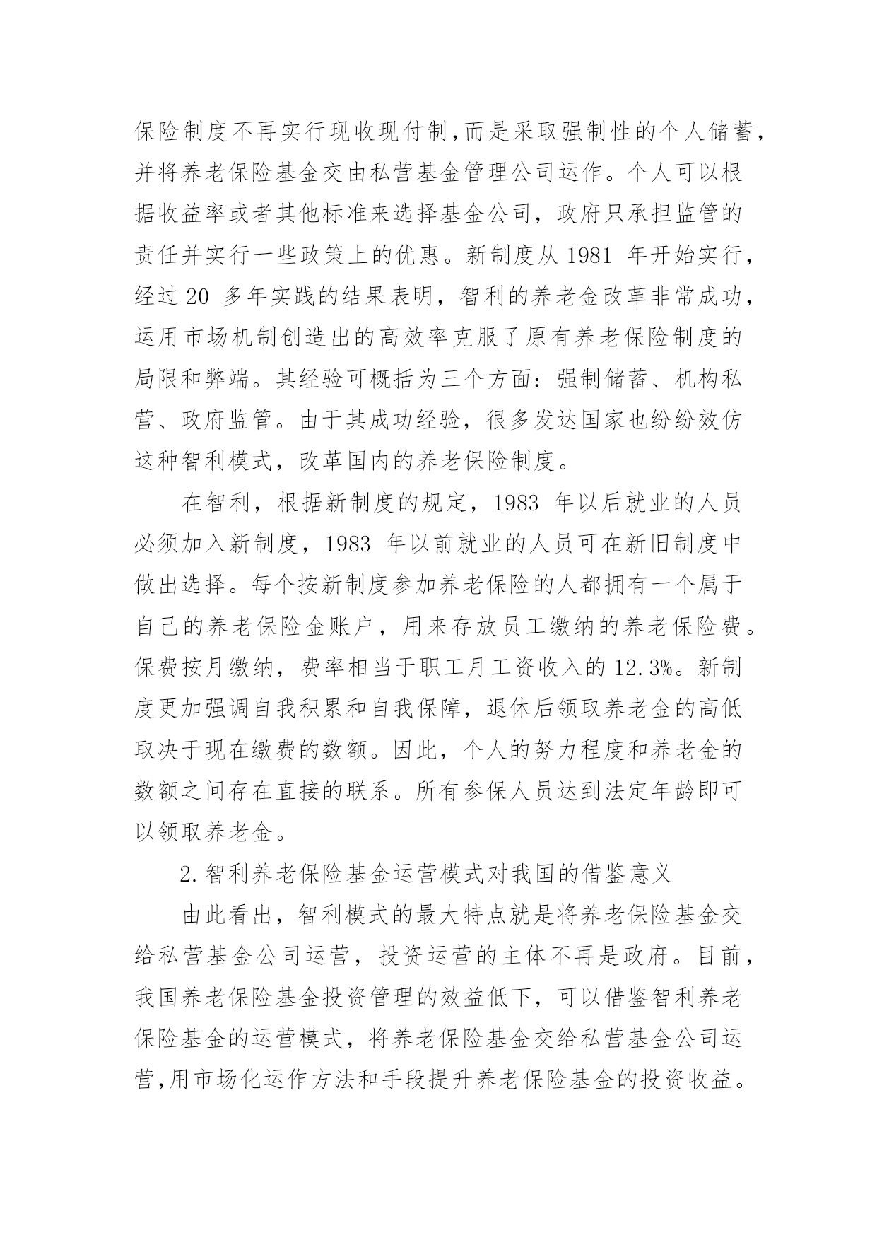 浅谈养老保险基金投资运营模式的国际借鉴及我国的现实选择浅谈养老保险基金投资运营模式的国际借鉴及我国的现实选择养老保险是社会保障制度的重要组成部分,世界各个国家都在努力完善本国的养老保险制度。养老保险制度是历史不断演进的结果,与一个国家的经济发展,社会制度、文化传统等因素密切相关。面对世界人口老龄化加速、通货膨胀严重等社会问题,各个国家都在积极完善本国的养老保险制度、探索养老保险基金运营管理方法,以应对人口老龄化的严峻形势。一、国外养老保险基金投资运营模式及经验借鉴(一)智利养老保险基金私有私营模式智利在养老保险基金私有化改革上做出了示范,对养老保险基金采用了完全积累方式和私营化、资本化的管理使得改革取得了巨大成功,不仅将政府从养老保险基金管理的负担上解放出来,而且也较好地解决了劳动者与雇主之间的矛盾。1.智利养老保险制度及养老保险基金私有私营模式智利20世纪初期建立了现收现付制的养老保险制度。20世纪中后期,由于人口寿命增加以及老龄化的加速等问题,使得智利养老金给财政带来了非常沉重的负担。智利政府不得不对社会保险制度进行了大刀阔斧的改革,新的养老保险制度不再实行现收现付制,而是采取强制性的个人储蓄,并将养老保险基金交由私营基金管理公司运作。个人可以根据收益率或者其他标准来选择基金公司,政府只承担监管的责任并实行一些政策上的优惠。新制度从1981年开始实行,经过20多年实践的结果表明,智利的养老金改革非常成功,运用市场机制创造出的高效率克服了原有养老保险制度的局限和弊端。其经验可概括为三个方面:强制储蓄、机构私营、政府监管。由于其成功经验,很多发达国家也纷纷效仿这种智利模式,改革国内的养老保险制度。在智利,根据新制度的规定,1983年以后就业的人员必须加入新制度,1983年以前就业的人员可在新旧制度中做出选择。每个按新制度参加养老保险的人都拥有一个属于自己的养老保险金账户,用来存放员工缴纳的养老保险费。保费按月缴纳,费率相当于职工月工资收入的12.3%。新制度更加强调自我积累和自我保障,退休后领取养老金的高低取决于现在缴费的数额。因此,个人的努力程度和养老金的数额之间存在直接的联系。所有参保人员达到法定年龄即可以领取养老金。2.智利养老保险基金运营模式对我国的借鉴意义由此看出,智利模式的最大特点就是将养老保险基金交给私营基金公司运营,投资运营的主体不再是政府。目前,我国养老保险基金投资管理的效益低下,可以借鉴智利养老保险基金的运营模式,将养老保险基金交给私营基金公司运营,用市场化运作方法和手段提升养老保险基金的投资收益。由于智利的养老保险基金交由私营基金公司管理,而私营基金公司之间的竞争更加激烈,且国家对其投资限制相对宽松,因此,养老保险基金的投资运营效率更高。这对于我国逐步放开对养老保险基金投资的限制,进行多元化投资,从而更好地实现分散风险和保值增值的目标有很大的借鉴意义。(二)新加坡养老保险基金的私有公营模式新加坡作为以华人为主体的国家,在人口特征、文化传统等方面都与我国有着相似的地方。新加坡市场经济比较发达,其养老保险制度也相对完善。新加坡的养老保险制度堪称东亚乃至世界范围内养老保险基金成功运行的典范。1.新加坡养老保险基金私有公营模式新加坡的养老保险制度采用的是完全累积制,政府通过立法的形式强制在职员工进行储蓄,规定由企业和员工双方缴费,政府只承担税收优惠和政策优惠的义务,企业和员工缴纳的所有公积金款项都存入政府依照中央公积金法令为每位参加者设立的个人账户中,账户中的资金可以用来支付购买房产,也可以投资教育、医疗等其他领域。缴费率则视国家经济状况经常进行调整。改革后,按照中央公积金的投向不同,养老保险基金由两个部门负责管理。新加坡货币管理局主要负责将公积金投向国债和银行存款;新加坡政府投资管理公司负责投向住房和基础建设等方面。新加坡养老保险基金的投向主要倾向于风险较小的资产和项目,既保证了资金的安全性,也能够为国际经济建设提供支持,但投资收益较低,管理成本高。2.新加坡养老保险基金运营模式对我国的借鉴意义一方面,新加坡中央公积金制度采取的是相对集中的管理体制,所以基金的安全性较高。政府只负责相关制度的建立,并不具体负责运营基金,具体运营工作则由中央公积金局指定的专门政府投资公司负责,有利于提高投资效率。新加坡模式有利于我国养老保险基金的运行打破政事合一的管理模式。我国可以考虑建立多级机构,对养老保险基金的管理实行监督与管理相互制约的新型治理结构。但新加坡养老保险基金运营模式也有一些不足,如个人缺乏决策权和自主性,投资运营受政府影响较大,且限制较多,收益率并不是很高。另一方面,新加坡模式在将家庭作为一个整体来考量养老保险基金方面做出了创新,比如建立了子女对父母公积金的最低存款填补制度和家庭保障计划。这对中国有相当大的借