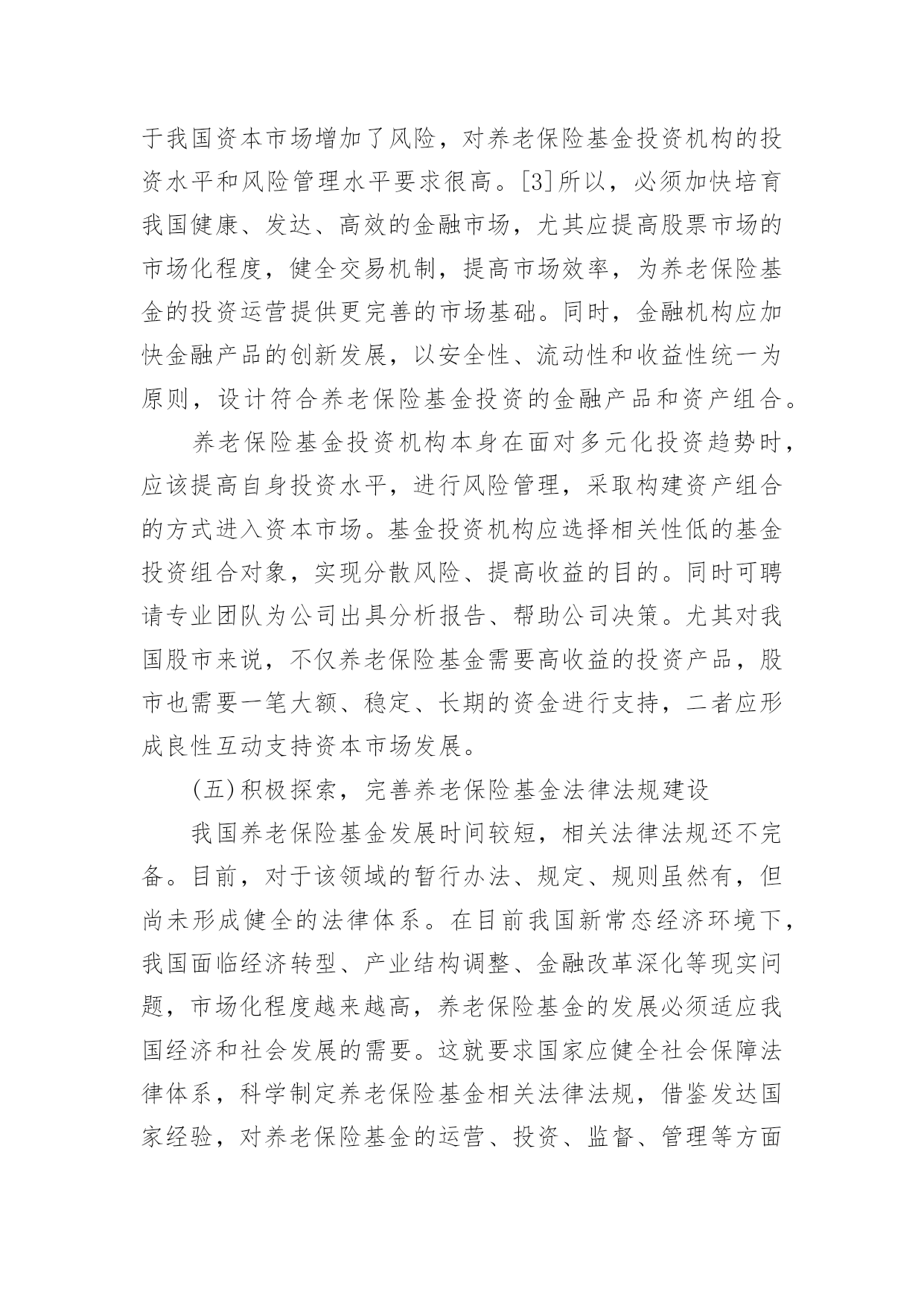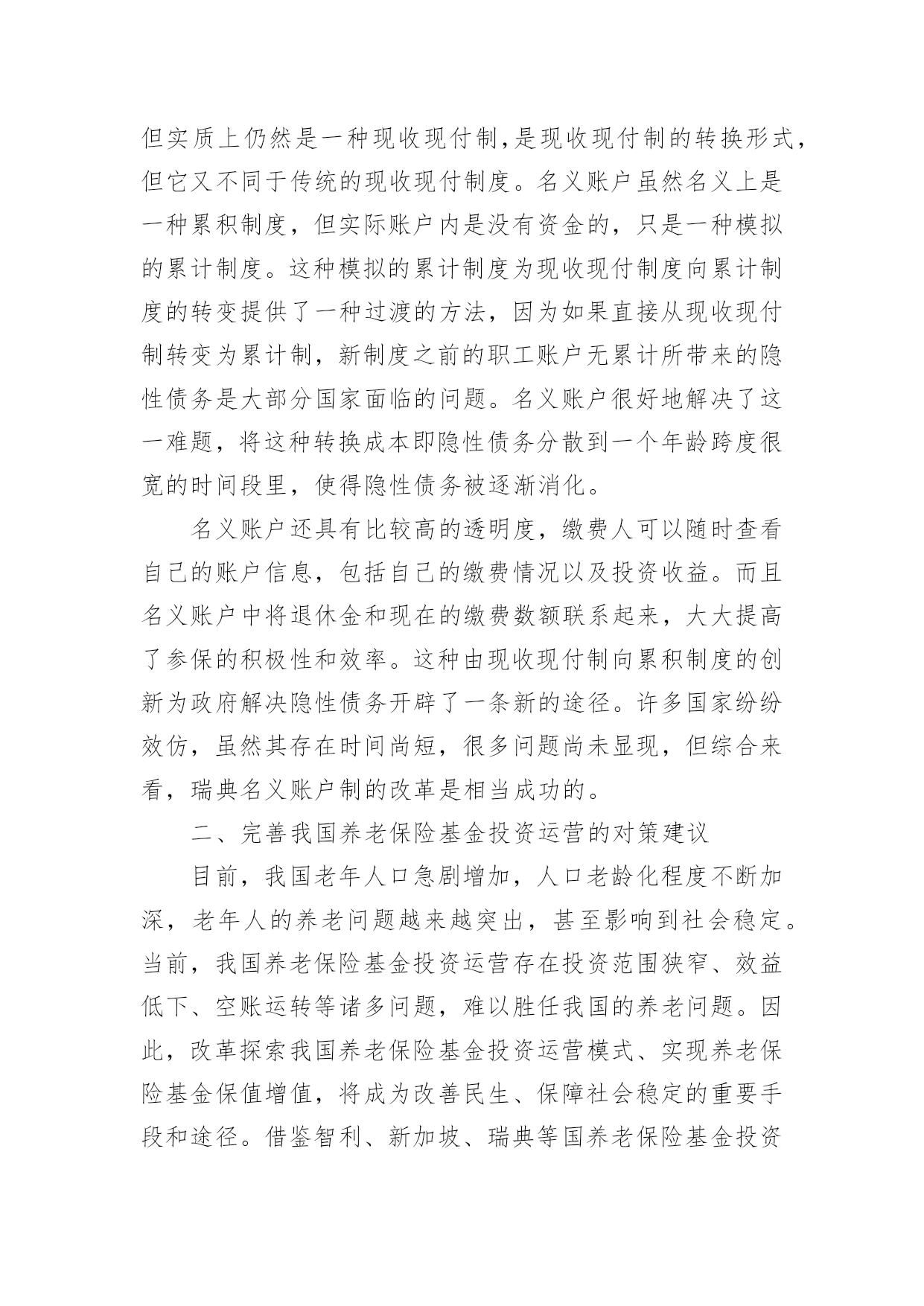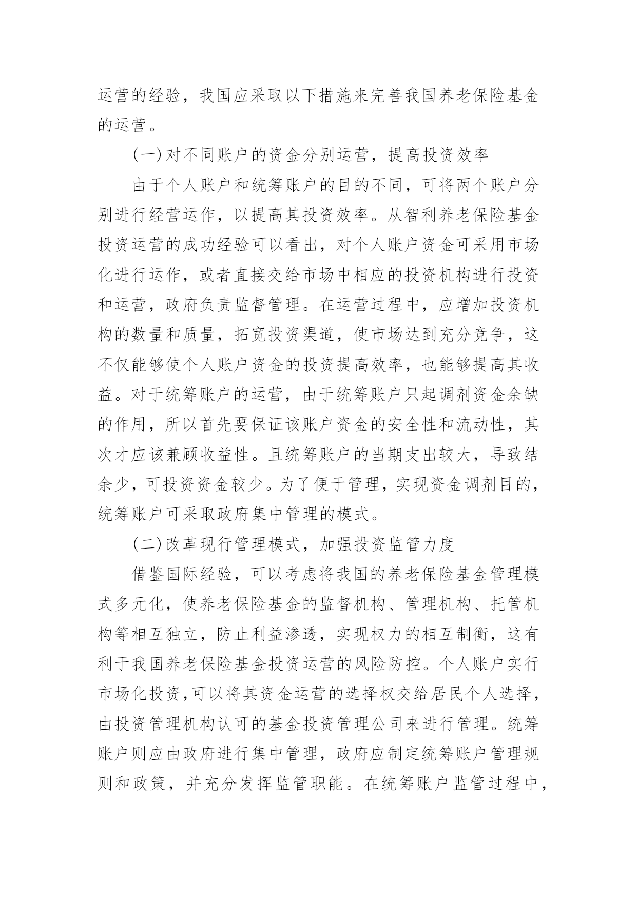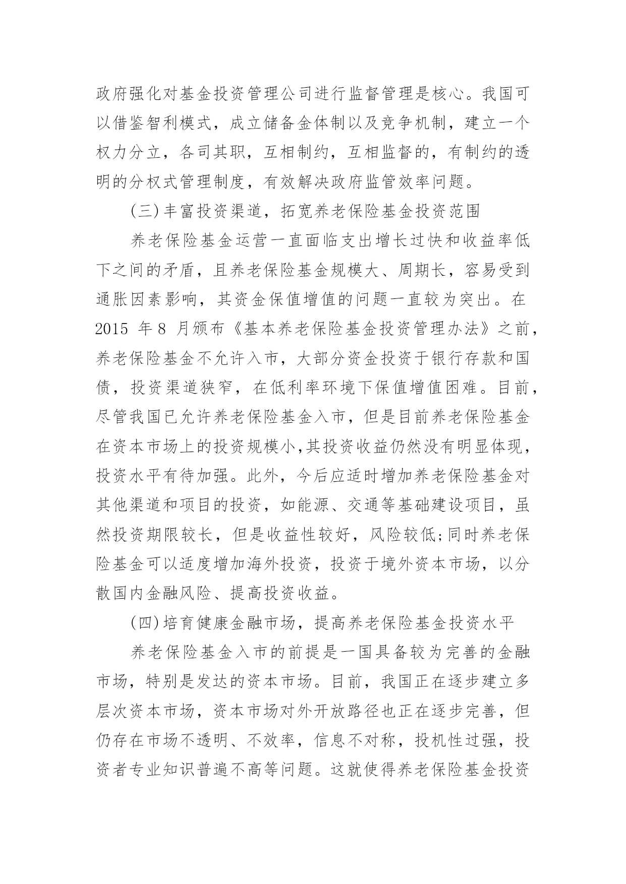 浅谈养老保险基金投资运营模式的国际借鉴及我国的现实选择浅谈养老保险基金投资运营模式的国际借鉴及我国的现实选择养老保险是社会保障制度的重要组成部分,世界各个国家都在努力完善本国的养老保险制度。养老保险制度是历史不断演进的结果,与一个国家的经济发展,社会制度、文化传统等因素密切相关。面对世界人口老龄化加速、通货膨胀严重等社会问题,各个国家都在积极完善本国的养老保险制度、探索养老保险基金运营管理方法,以应对人口老龄化的严峻形势。一、国外养老保险基金投资运营模式及经验借鉴(一)智利养老保险基金私有私营模式智利在养老保险基金私有化改革上做出了示范,对养老保险基金采用了完全积累方式和私营化、资本化的管理使得改革取得了巨大成功,不仅将政府从养老保险基金管理的负担上解放出来,而且也较好地解决了劳动者与雇主之间的矛盾。1.智利养老保险制度及养老保险基金私有私营模式智利20世纪初期建立了现收现付制的养老保险制度。20世纪中后期,由于人口寿命增加以及老龄化的加速等问题,使得智利养老金给财政带来了非常沉重的负担。智利政府不得不对社会保险制度进行了大刀阔斧的改革,新的养老保险制度不再实行现收现付制,而是采取强制性的个人储蓄,并将养老保险基金交由私营基金管理公司运作。个人可以根据收益率或者其他标准来选择基金公司,政府只承担监管的责任并实行一些政策上的优惠。新制度从1981年开始实行,经过20多年实践的结果表明,智利的养老金改革非常成功,运用市场机制创造出的高效率克服了原有养老保险制度的局限和弊端。其经验可概括为三个方面:强制储蓄、机构私营、政府监管。由于其成功经验,很多发达国家也纷纷效仿这种智利模式,改革国内的养老保险制度。在智利,根据新制度的规定,1983年以后就业的人员必须加入新制度,1983年以前就业的人员可在新旧制度中做出选择。每个按新制度参加养老保险的人都拥有一个属于自己的养老保险金账户,用来存放员工缴纳的养老保险费。保费按月缴纳,费率相当于职工月工资收入的12.3%。新制度更加强调自我积累和自我保障,退休后领取养老金的高低取决于现在缴费的数额。因此,个人的努力程度和养老金的数额之间存在直接的联系。所有参保人员达到法定年龄即可以领取养老金。2.智利养老保险基金运营模式对我国的借鉴意义由此看出,智利模式的最大特点就是将养老保险基金交给私营基金公司运营,投资运营的主体不再是政府。目前,我国养老保险基金投资管理的效益低下,可以借鉴智利养老保险基金的运营模式,将养老保险基金交给私营基金公司运营,用市场化运作方法和手段提升养老保险基金的投资收益。由于智利的养老保险基金交由私营基金公司管理,而私营基金公司之间的竞争更加激烈,且国家对其投资限制相对宽松,因此,养老保险基金的投资运营效率更高。这对于我国逐步放开对养老保险基金投资的限制,进行多元化投资,从而更好地实现分散风险和保值增值的目标有很大的借鉴意义。(二)新加坡养老保险基金的私有公营模式新加坡作为以华人为主体的国家,在人口特征、文化传统等方面都与我国有着相似的地方。新加坡市场经济比较发达,其养老保险制度也相对完善。新加坡的养老保险制度堪称东亚乃至世界范围内养老保险基金成功运行的典范。1.新加坡养老保险基金私有公营模式新加坡的养老保险制度采用的是完全累积制,政府通过立法的形式强制在职员工进行储蓄,规定由企业和员工双方缴费,政府只承担税收优惠和政策优惠的义务,企业和员工缴纳的所有公积金款项都存入政府依照中央公积金法令为每位参加者设立的个人账户中,账户中的资金可以用来支付购买房产,也可以投资教育、医疗等其他领域。缴费率则视国家经济状况经常进行调整。改革后,按照中央公积金的投向不同,养老保险基金由两个部门负责管理。新加坡货币管理局主要负责将公积金投向国债和银行存款;新加坡政府投资管理公司负责投向住房和基础建设等方面。新加坡养老保险基金的投向主要倾向于风险较小的资产和项目,既保证了资金的安全性,也能够为国际经济建设提供支持,但投资收益较低,管理成本高。2.新加坡养老保险基金运营模式对我国的借鉴意义一方面,新加坡中央公积金制度采取的是相对集中的管理体制,所以基金的安全性较高。政府只负责相关制度的建立,并不具体负责运营基金,具体运营工作则由中央公积金局指定的专门政府投资公司负责,有利于提高投资效率。新加坡模式有利于我国养老保险基金的运行打破政事合一的管理模式。我国可以考虑建立多级机构,对养老保险基金的管理实行监督与管理相互制约的新型治理结构。但新加坡养老保险基金运营模式也有一些不足,如个人缺乏决策权和自主性,投资运营受政府影响较大,且限制较多,收益率并不是很高。另一方面,新加坡模式在将家庭作为一个整体来考量养老保险基金方面做出了创新,比如建立了子女对父母公积金的最低存款填补制度和家庭保障计划。这对中国有相当大的借