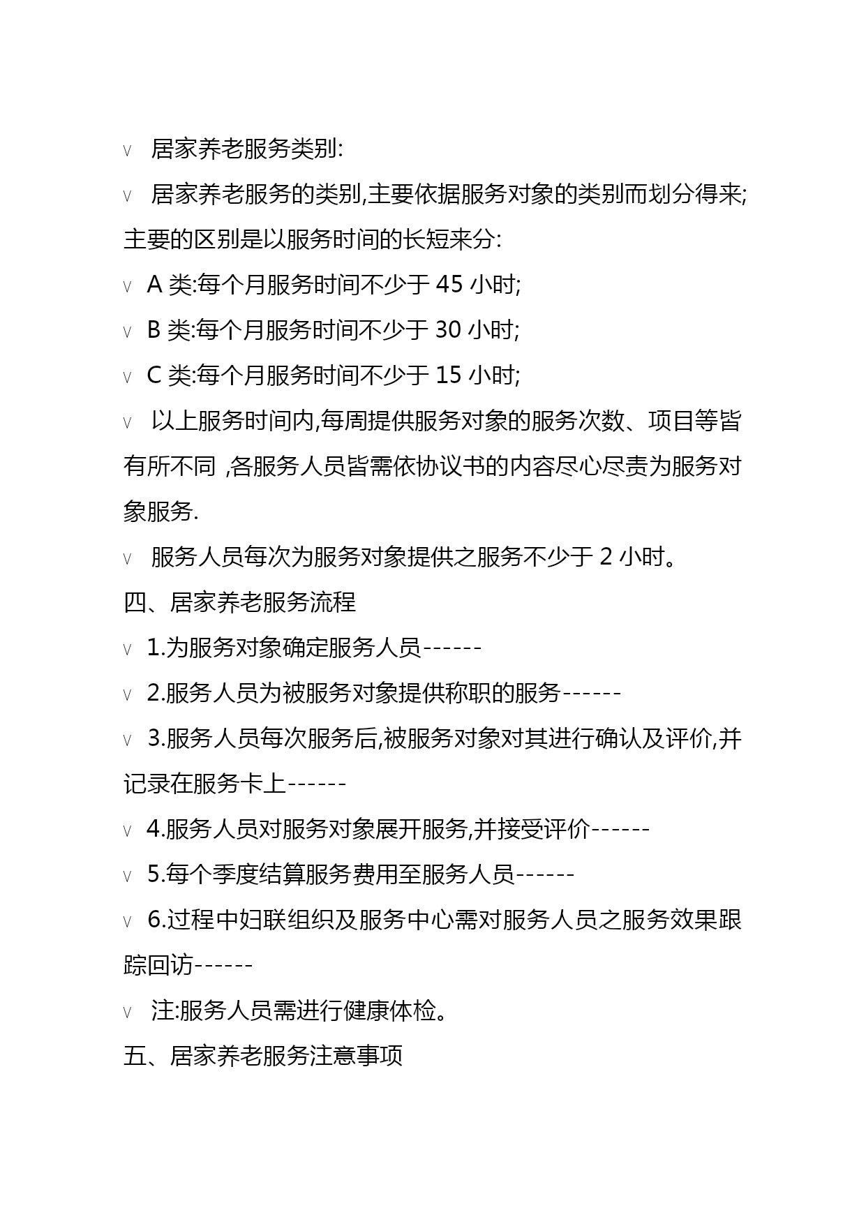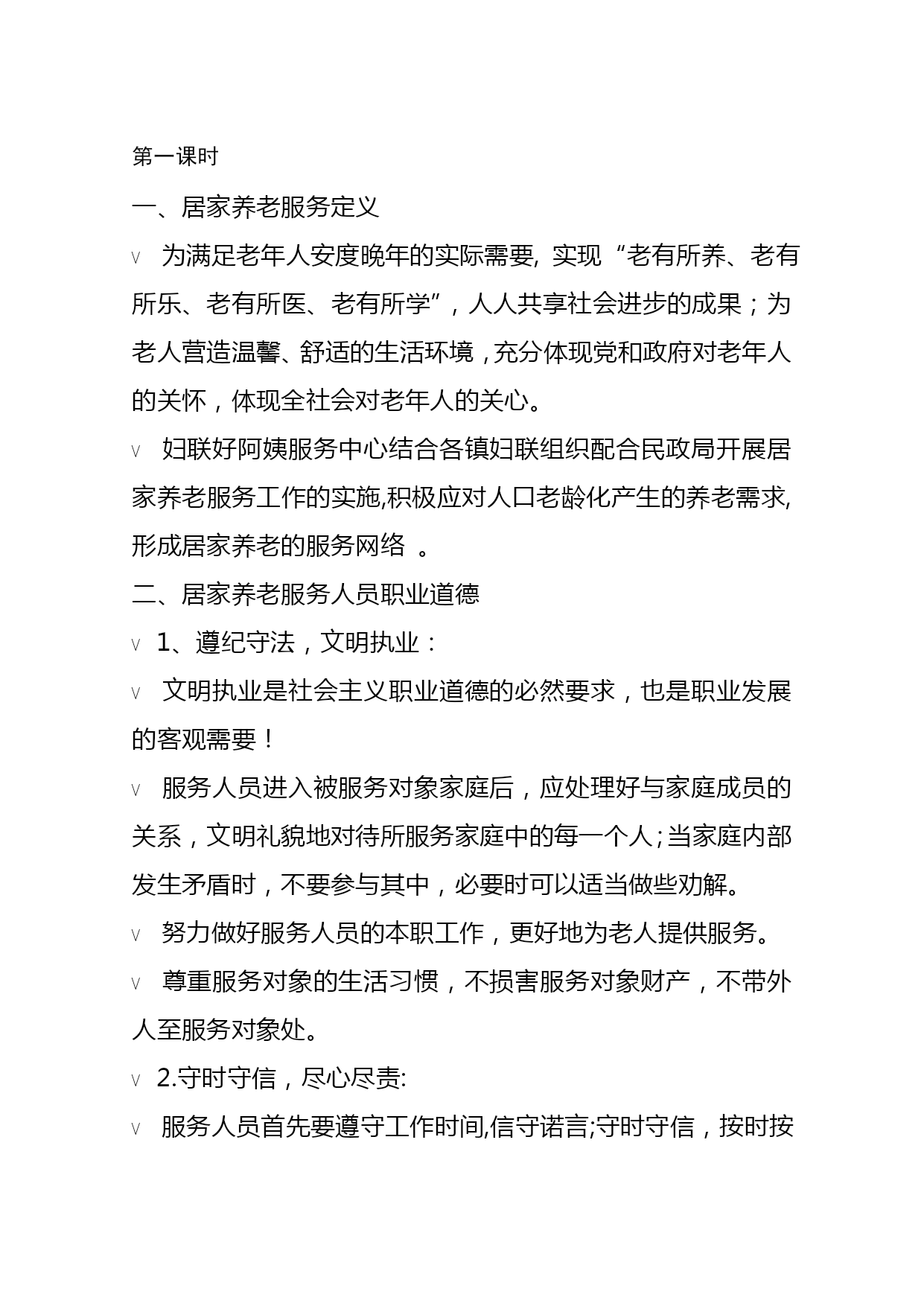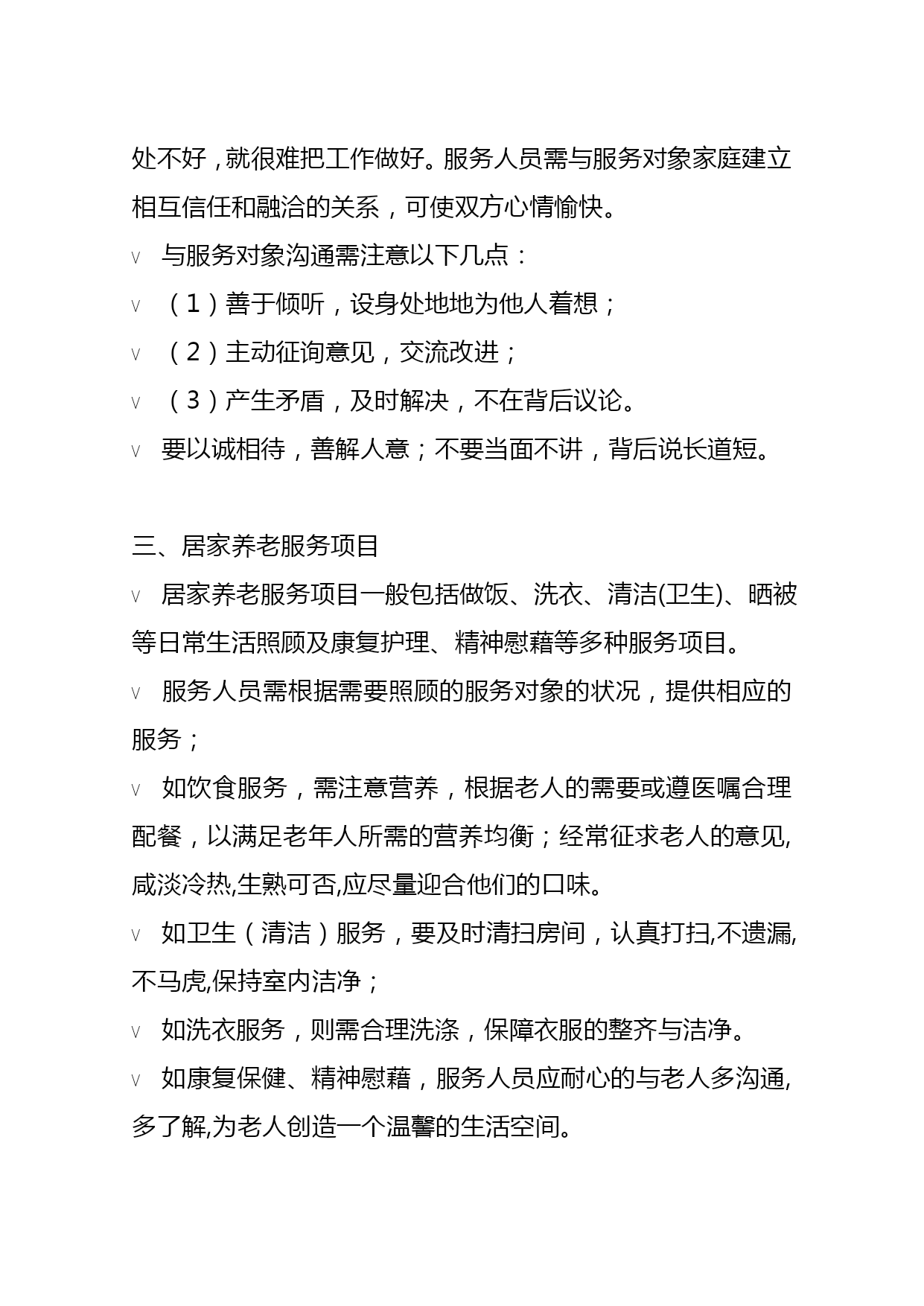 居家养老培训(完整版)资料(可以直接使用,可编辑优秀版资料,欢迎下载)第一课时一、居家养老服务定义为满足老年人安度晚年的实际需要,实现“老有所养、老有所乐、老有所医、老有所学”,人人共享社会进步的成果;为老人营造温馨、舒适的生活环境,充分体现党和政府对老年人的关怀,体现全社会对老年人的关心。妇联好阿姨服务中心结合各镇妇联组织配合民政局开展居家养老服务工作的实施,积极应对人口老龄化产生的养老需求,形成居家养老的服务网络。二、居家养老服务人员职业道德1、遵纪守法,文明执业:文明执业是社会主义职业道德的必然要求,也是职业发展的客观需要!服务人员进入被服务对象家庭后,应处理好与家庭成员的关系,文明礼貌地对待所服务家庭中的每一个人;当家庭内部发生矛盾时,不要参与其中,必要时可以适当做些劝解。努力做好服务人员的本职工作,更好地为老人提供服务。尊重服务对象的生活习惯,不损害服务对象财产,不带外人至服务对象处。2.守时守信,尽心尽责:服务人员首先要遵守工作时间,信守诺言;守时守信,按时按点至被服务对象处,有特殊情况需向被服务对象说明。服务人员需尽心尽责服务,根据服务对象的要求,积极主动完成约定的职责,不要让服务对象提醒;服务人员的工作是以时间为计算的,工作中应自觉高标准要求自己,合理安排,讲求效率,努力通过自己的劳动服务,为服务对象创设整洁、温馨、有条理的家庭环境;服务人员要积极主动,讲究信用,以自己的尽心、爱心和关心,换得服务对象的称心、放心和安心,成为服务对象家庭生活中不可缺少的得力助手。3.热情和蔼,体贴温馨,善解人意:一、对被服务对象热情和蔼,富有爱心,付出体贴温馨的服务,保障被服务对象的生活环境舒适、洁净。二、服务人员应认真踏实做好家务,把让服务对象满意作为自己的工作目标;在服务过程中,态度亲切和气,为人谦虚厚道,经常主动征询服务对象的意见,与服务对象的家人、亲朋好友都要亲切谦和,重视他们对自己的评价;三、服务人员要善解人意,理解服务对象的需要,有时老人心情不好,说话语气重了,做到不与他们计较,体谅他们的心情。4.善于沟通,不说长道短:服务人员直接地面对服务对象家庭的每一个成员,如果相处不好,就很难把工作做好。服务人员需与服务对象家庭建立相互信任和融洽的关系,可使双方心情愉快。与服务对象沟通需注意以下几点:(1)善于倾听,设身处地地为他人着想;(2)主动征询意见,交流改进;(3)产生矛盾,及时解决,不在背后议论。要以诚相待,善解人意;不要当面不讲,背后说长道短。三、居家养老服务项目居家养老服务项目一般包括做饭、洗衣、清洁(卫生)、晒被等日常生活照顾及康复护理、精神慰藉等多种服务项目。服务人员需根据需要照顾的服务对象的状况,提供相应的服务;如饮食服务,需注意营养,根据老人的需要或遵医嘱合理配餐,以满足老年人所需的营养均衡;经常征求老人的意见,咸淡冷热,生熟可否,应尽量迎合他们的口味。如卫生(清洁)服务,要及时清扫房间,认真打扫,不遗漏,不马虎,保持室内洁净;如洗衣服务,则需合理洗涤,保障衣服的整齐与洁净。如康复保健、精神慰藉,服务人员应耐心的与老人多沟通,多了解,为老人创造一个温馨的生活空间。居家养老服务类别:居家养老服务的类别,主要依据服务对象的类别而划分得来;主要的区别是以服务时间的长短来分:A类:每个月服务时间不少于45小时;B类:每个月服务时间不少于30小时;C类:每个月服务时间不少于15小时;以上服务时间内,每周提供服务对象的服务次数、项目等皆有所不同,各服务人员皆需依协议书的内容尽心尽责为服务对象服务.服务人员每次为服务对象提供之服务不少于2小时。四、居家养老服务流程1.为服务对象确定服务人员------2.服务人员为被服务对象提供称职的服务------3.服务人员每次服务后,被服务对象对其进行确认及评价,并记录在服务卡上------4.服务人员对服务对象展开服务,并接受评价------5.每个季度结算服务费用至服务人员------6.过程中妇联组织及服务中心需对服务人员之服务效果跟踪回访------注:服务人员需进行健康体检。五、居家养老服务注意事项1.防火安全:使用电器、煤气用具时严格按照操作规程,不使用时应保证其电源关闭及煤气阀门关闭;做饭或烧开水时,人不宜离开时间太长,且火源周边不能有易燃物;一旦发生触电事故或电器用具起火时,应立即先切断电源,然后再进行抢救。2.防盗安全:财物安全同样要注意,出入家门带好钥匙,关闭好门窗。3.意外事故的处理:A在老人家庭中如发生意外事故,自己不能处理时应及时报告相关人