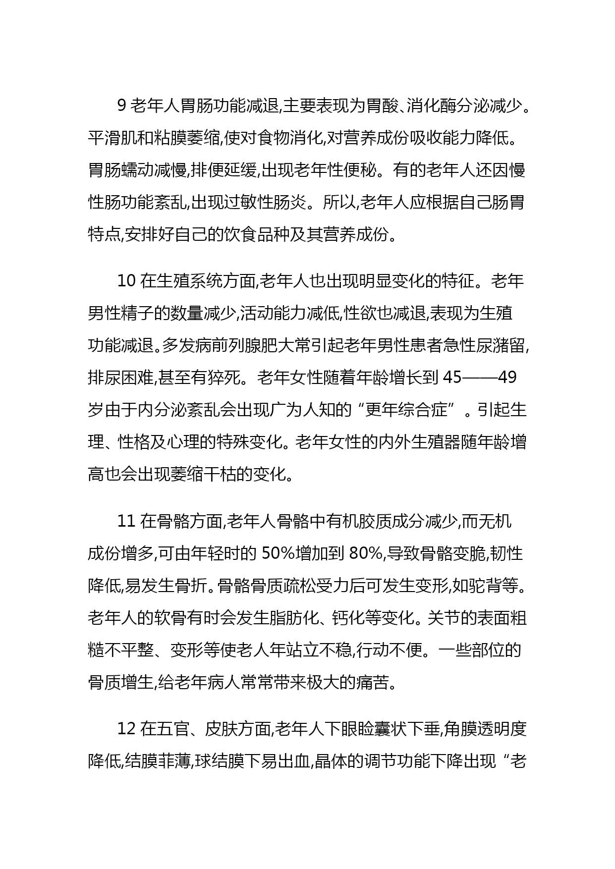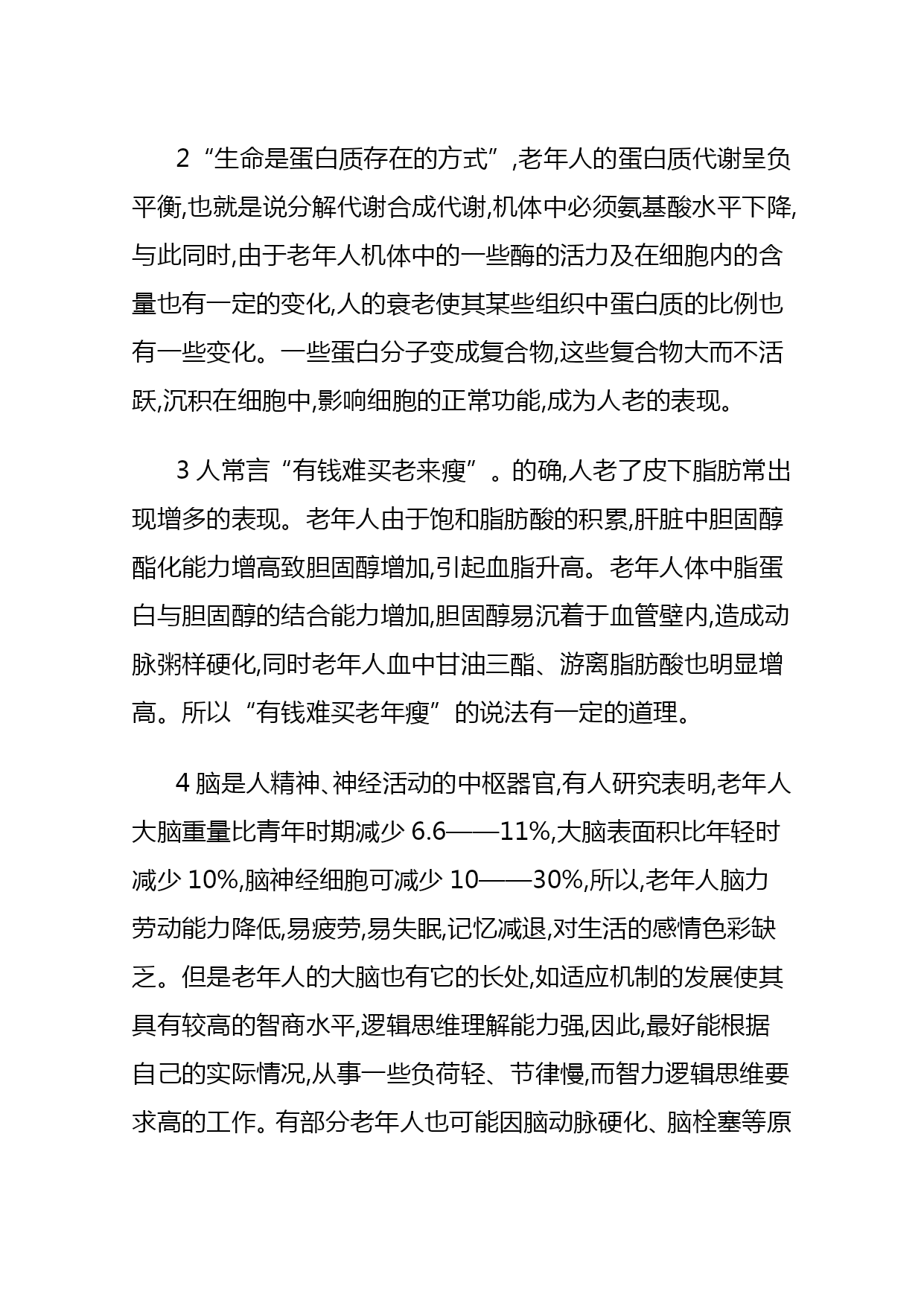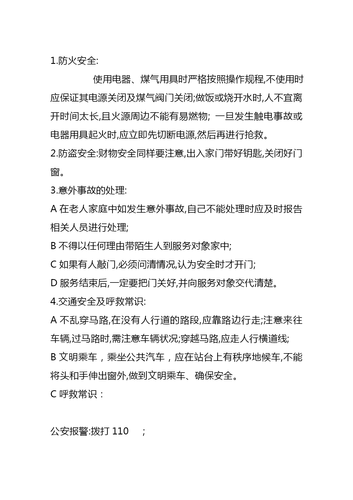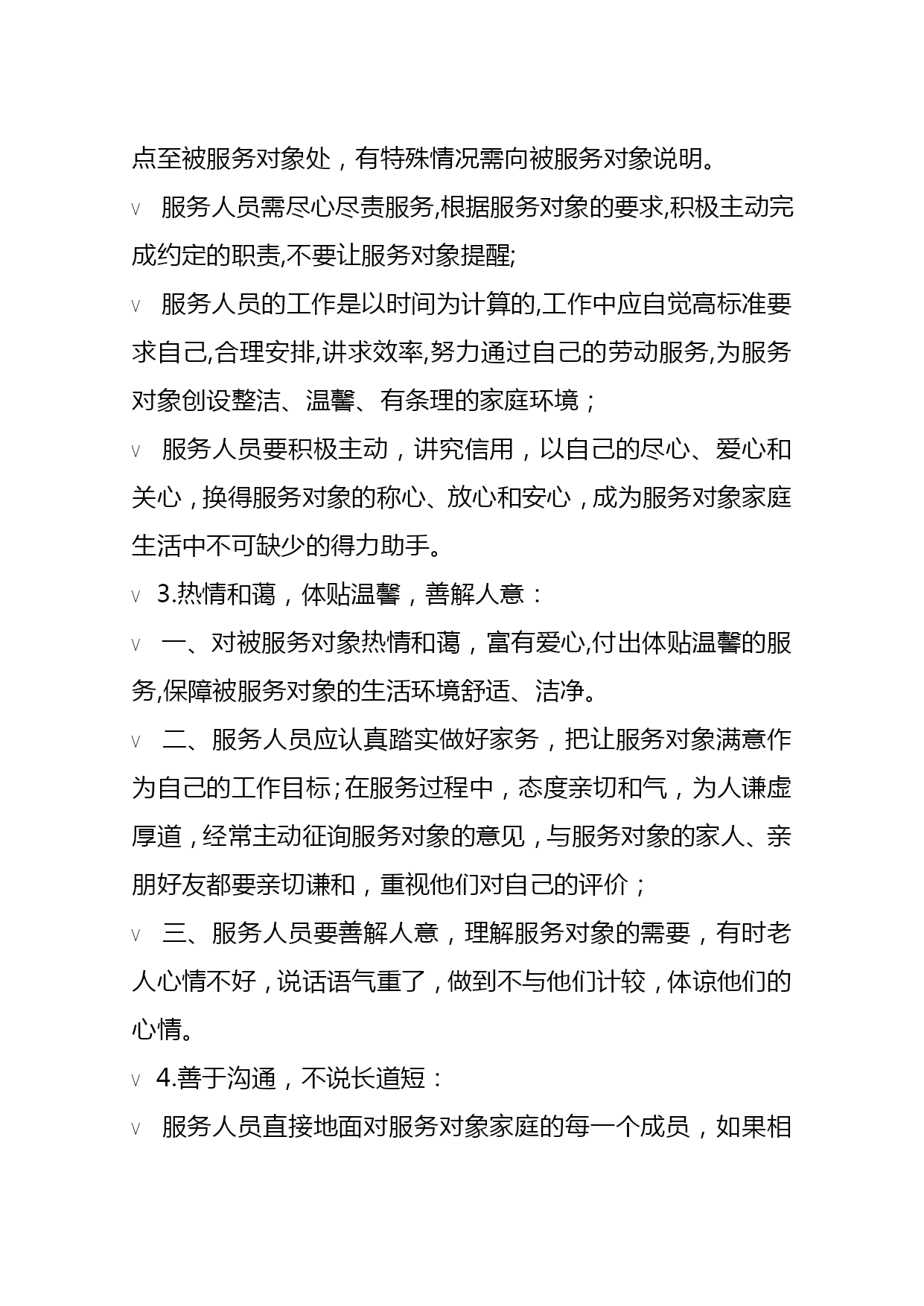居家养老培训(完整版)资料(可以直接使用,可编辑优秀版资料,欢迎下载)第一课时一、居家养老服务定义为满足老年人安度晚年的实际需要,实现“老有所养、老有所乐、老有所医、老有所学”,人人共享社会进步的成果;为老人营造温馨、舒适的生活环境,充分体现党和政府对老年人的关怀,体现全社会对老年人的关心。妇联好阿姨服务中心结合各镇妇联组织配合民政局开展居家养老服务工作的实施,积极应对人口老龄化产生的养老需求,形成居家养老的服务网络。二、居家养老服务人员职业道德1、遵纪守法,文明执业:文明执业是社会主义职业道德的必然要求,也是职业发展的客观需要!服务人员进入被服务对象家庭后,应处理好与家庭成员的关系,文明礼貌地对待所服务家庭中的每一个人;当家庭内部发生矛盾时,不要参与其中,必要时可以适当做些劝解。努力做好服务人员的本职工作,更好地为老人提供服务。尊重服务对象的生活习惯,不损害服务对象财产,不带外人至服务对象处。2.守时守信,尽心尽责:服务人员首先要遵守工作时间,信守诺言;守时守信,按时按点至被服务对象处,有特殊情况需向被服务对象说明。服务人员需尽心尽责服务,根据服务对象的要求,积极主动完成约定的职责,不要让服务对象提醒;服务人员的工作是以时间为计算的,工作中应自觉高标准要求自己,合理安排,讲求效率,努力通过自己的劳动服务,为服务对象创设整洁、温馨、有条理的家庭环境;服务人员要积极主动,讲究信用,以自己的尽心、爱心和关心,换得服务对象的称心、放心和安心,成为服务对象家庭生活中不可缺少的得力助手。3.热情和蔼,体贴温馨,善解人意:一、对被服务对象热情和蔼,富有爱心,付出体贴温馨的服务,保障被服务对象的生活环境舒适、洁净。二、服务人员应认真踏实做好家务,把让服务对象满意作为自己的工作目标;在服务过程中,态度亲切和气,为人谦虚厚道,经常主动征询服务对象的意见,与服务对象的家人、亲朋好友都要亲切谦和,重视他们对自己的评价;三、服务人员要善解人意,理解服务对象的需要,有时老人心情不好,说话语气重了,做到不与他们计较,体谅他们的心情。4.善于沟通,不说长道短:服务人员直接地面对服务对象家庭的每一个成员,如果相处不好,就很难把工作做好。服务人员需与服务对象家庭建立相互信任和融洽的关系,可使双方心情愉快。与服务对象沟通需注意以下几点:(1)善于倾听,设身处地地为他人着想;(2)主动征询意见,交流改进;(3)产生矛盾,及时解决,不在背后议论。要以诚相待,善解人意;不要当面不讲,背后说长道短。三、居家养老服务项目居家养老服务项目一般包括做饭、洗衣、清洁(卫生)、晒被等日常生活照顾及康复护理、精神慰藉等多种服务项目。服务人员需根据需要照顾的服务对象的状况,提供相应的服务;如饮食服务,需注意营养,根据老人的需要或遵医嘱合理配餐,以满足老年人所需的营养均衡;经常征求老人的意见,咸淡冷热,生熟可否,应尽量迎合他们的口味。如卫生(清洁)服务,要及时清扫房间,认真打扫,不遗漏,不马虎,保持室内洁净;如洗衣服务,则需合理洗涤,保障衣服的整齐与洁净。如康复保健、精神慰藉,服务人员应耐心的与老人多沟通,多了解,为老人创造一个温馨的生活空间。居家养老服务类别:居家养老服务的类别,主要依据服务对象的类别而划分得来;主要的区别是以服务时间的长短来分:A类:每个月服务时间不少于45小时;B类:每个月服务时间不少于30小时;C类:每个月服务时间不少于15小时;以上服务时间内,每周提供服务对象的服务次数、项目等皆有所不同,各服务人员皆需依协议书的内容尽心尽责为服务对象服务.服务人员每次为服务对象提供之服务不少于2小时。四、居家养老服务流程1.为服务对象确定服务人员------2.服务人员为被服务对象提供称职的服务------3.服务人员每次服务后,被服务对象对其进行确认及评价,并记录在服务卡上------4.服务人员对服务对象展开服务,并接受评价------5.每个季度结算服务费用至服务人员------6.过程中妇联组织及服务中心需对服务人员之服务效果跟踪回访------注:服务人员需进行健康体检。五、居家养老服务注意事项1.防火安全:使用电器、煤气用具时严格按照操作规程,不使用时应保证其电源关闭及煤气阀门关闭;做饭或烧开水时,人不宜离开时间太长,且火源周边不能有易燃物;一旦发生触电事故或电器用具起火时,应立即先切断电源,然后再进行抢救。2.防盗安全:财物安全同样要注意,出入家门带好钥匙,关闭好门窗。3.意外事故的处理:A在老人家庭中如发生意外事故,自己不能处理时应及时报告相关人