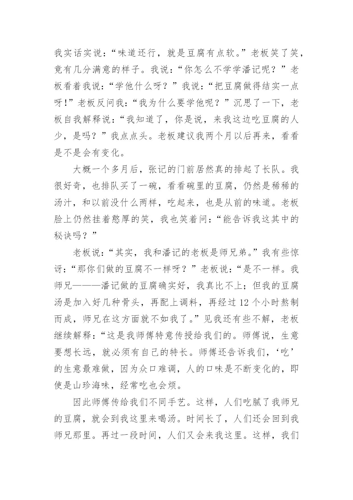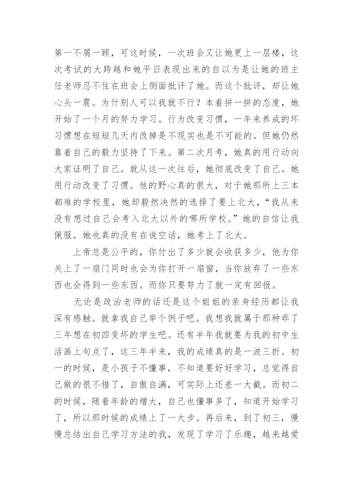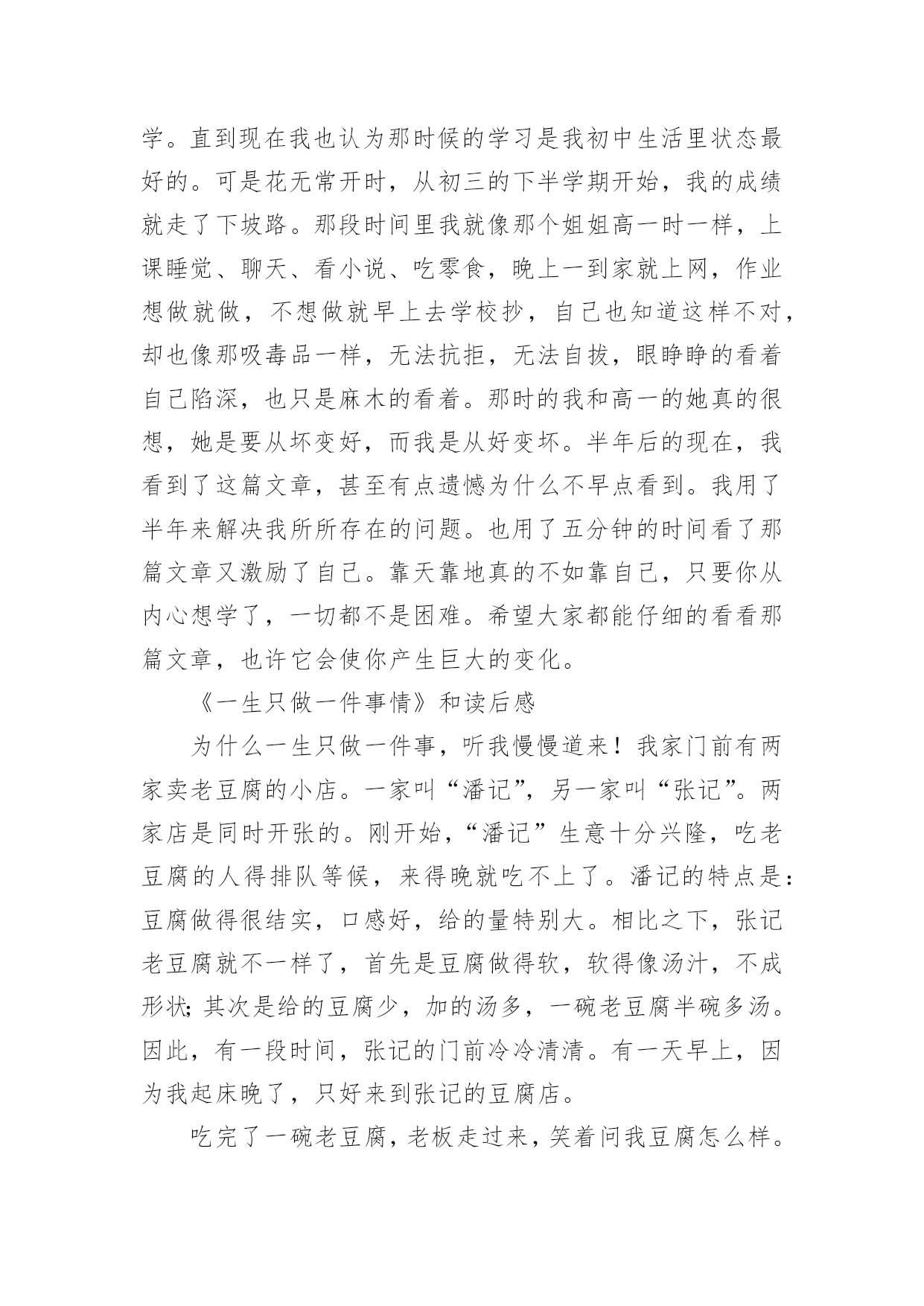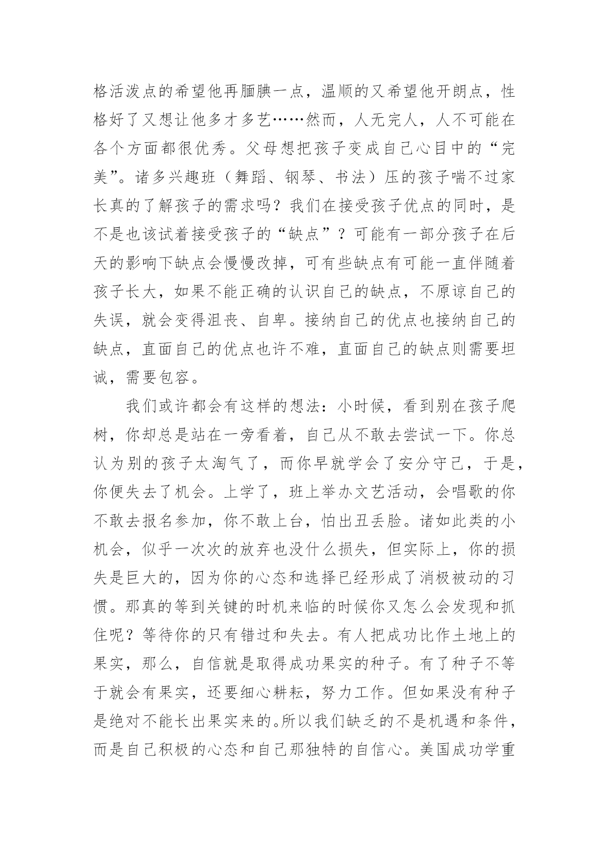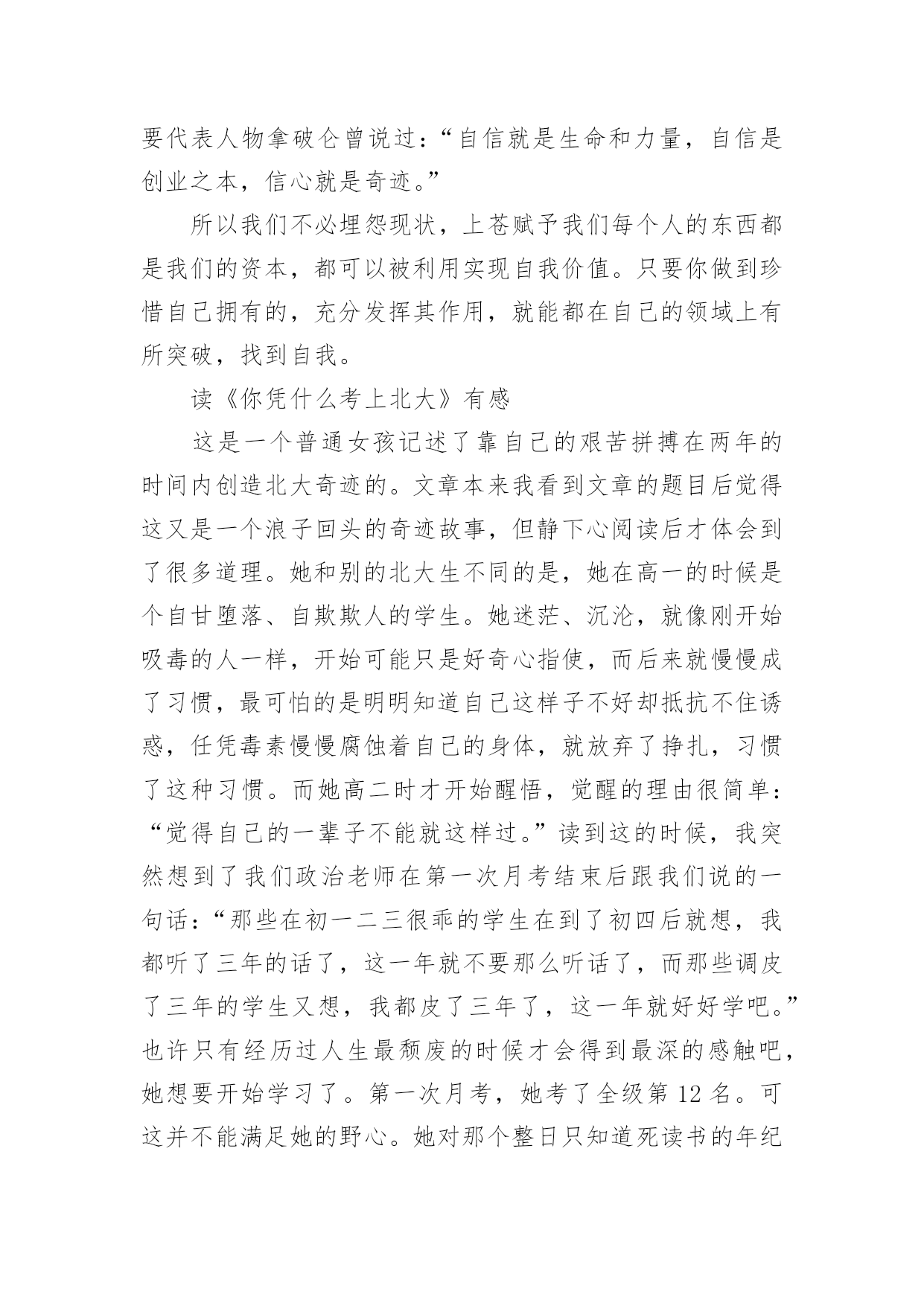 励志文章的观后感关于励志文章的观后感《个人励志与自我超越的心灵指南》读后感“正确地认识自我、经营自我”这一章节让我有着深刻的感悟。作为一个现代人,如果不能正确地认识自己,很难在社会中找准自己的位置。认识自己不仅要了解自己所受的教育,以及自己的人生观、世界观和自己的思想品德等;还要认识自己掌握的知识、专业技能和特长等等。在我们的工作和学习中,经常认识和接触不同的人,通过与别人的沟通、比较慢慢地了解自己与别人的不同,通过自己做过的事或所犯的错误看到自己身上的缺点。人在经历各种渠道认识自己之后,才能全面的认清自己,进而实际地制定一些目标,去追求自己心中的理想。在我们工作时,时常进行一些反思:反思自己的一个活动,反思自己一学期取得的结果,反思能使我们更清楚地认识自己,不断地完善自己。然而,反思、自我评估不能只评价自己的缺点、错误与无能。认识自己的缺点固然是好,可单单认识自己身上的缺点很难求改进,甚至会产生自卑的心理。因此,我们要经常以鼓励、支持的态度及时地发现幼儿身上的闪光点,扬长避短,挖掘每位幼儿的潜能。每个人都是独立的,一个人接纳另一个人很难,但接纳自己更难,我们时常对自己不满。为自己的缺点懊恼与烦闷,谁都想成为一个完美的人。同样的,家长对孩子也抱着一种“望子成龙,望女成风”的心态。性格活泼点的希望他再腼腆一点,温顺的又希望他开朗点,性格好了又想让他多才多艺……然而,人无完人,人不可能在各个方面都很优秀。父母想把孩子变成自己心目中的“完美”。诸多兴趣班(舞蹈、钢琴、书法)压的孩子喘不过家长真的了解孩子的需求吗?我们在接受孩子优点的同时,是不是也该试着接受孩子的“缺点”?可能有一部分孩子在后天的影响下缺点会慢慢改掉,可有些缺点有可能一直伴随着孩子长大,如果不能正确的认识自己的缺点,不原谅自己的失误,就会变得沮丧、自卑。接纳自己的优点也接纳自己的缺点,直面自己的优点也许不难,直面自己的缺点则需要坦诚,需要包容。我们或许都会有这样的想法:小时候,看到别在孩子爬树,你却总是站在一旁看着,自己从不敢去尝试一下。你总认为别的孩子太淘气了,而你早就学会了安分守己,于是,你便失去了机会。上学了,班上举办文艺活动,会唱歌的你不敢去报名参加,你不敢上台,怕出丑丢脸。诸如此类的小机会,似乎一次次的放弃也没什么损失,但实际上,你的损失是巨大的,因为你的心态和选择已经形成了消极被动的习惯。那真的等到关键的时机来临的时候你又怎么会发现和抓住呢?等待你的只有错过和失去。有人把成功比作土地上的果实,那么,自信就是取得成功果实的种子。有了种子不等于就会有果实,还要细心耕耘,努力工作。但如果没有种子是绝对不能长出果实来的。所以我们缺乏的不是机遇和条件,而是自己积极的心态和自己那独特的自信心。美国成功学重要代表人物拿破仑曾说过:“自信就是生命和力量,自信是创业之本,信心就是奇迹。”所以我们不必埋怨现状,上苍赋予我们每个人的东西都是我们的资本,都可以被利用实现自我价值。只要你做到珍惜自己拥有的,充分发挥其作用,就能都在自己的领域上有所突破,找到自我。读《你凭什么考上北大》有感这是一个普通女孩记述了靠自己的艰苦拼搏在两年的时间内创造北大奇迹的。文章本来我看到文章的题目后觉得这又是一个浪子回头的奇迹故事,但静下心阅读后才体会到了很多道理。她和别的北大生不同的是,她在高一的时候是个自甘堕落、自欺欺人的学生。她迷茫、沉沦,就像刚开始吸毒的人一样,开始可能只是好奇心指使,而后来就慢慢成了习惯,最可怕的是明明知道自己这样子不好却抵抗不住诱惑,任凭毒素慢慢腐蚀着自己的身体,就放弃了挣扎,习惯了这种习惯。而她高二时才开始醒悟,觉醒的理由很简单:“觉得自己的一辈子不能就这样过。”读到这的时候,我突然想到了我们政治老师在第一次月考结束后跟我们说的一句话:“那些在初一二三很乖的学生在到了初四后就想,我都听了三年的话了,这一年就不要那么听话了,而那些调皮了三年的学生又想,我都皮了三年了,这一年就好好学吧。”也许只有经历过人生最颓废的时候才会得到最深的感触吧,她想要开始学习了。第一次月考,她考了全级第12名。可这并不能满足她的野心。她对那个整日只知道死读书的年纪第一不屑一顾,可这时候,一次班会又让她更上一层楼,这次考试的大跨越和她平日表现出来的自以为是让她的班主任老师忍不住在班会上侧面批评了她。而这个批评,却让她心头一震。为什别人可以我就不行?本着拼一拼的态度,她开始了一个月的努力学习。行为改变习惯,一年来养成的坏习惯想在短短几天内改掉是不现实也是不可能的。但她仍然靠着自己的毅力坚持了下来。第二次月考,她真的用行动向大家证明了自己。就从这一次往后,她彻底改变了自己。她用行动改变了习惯。他的野心真的很大,对于她那所上三本都难的学校里,她却毅然决然的选择了要上北大,“我从来没有想过自己会考入北大