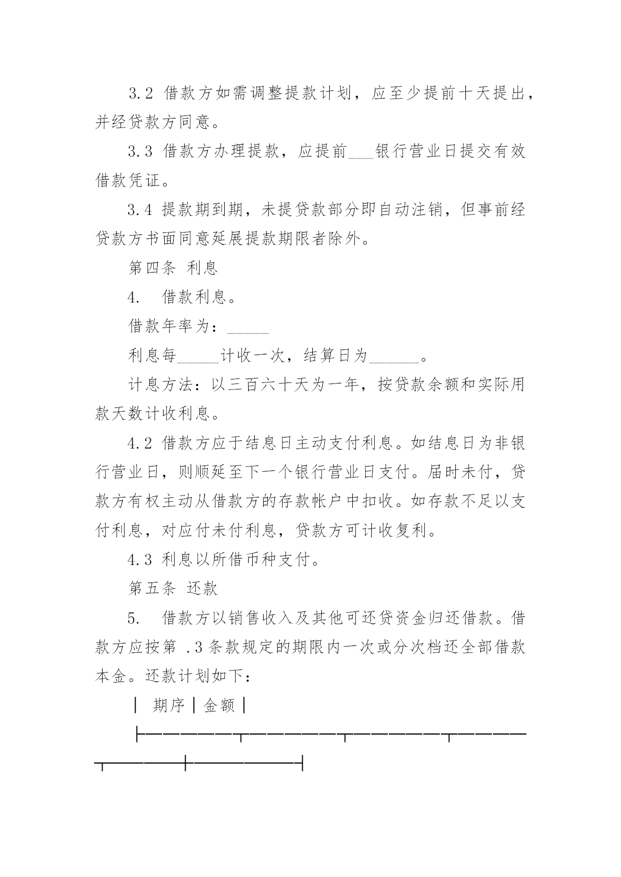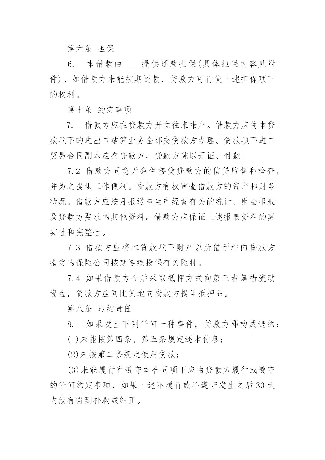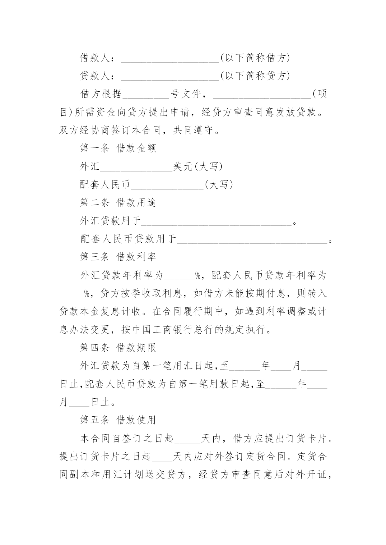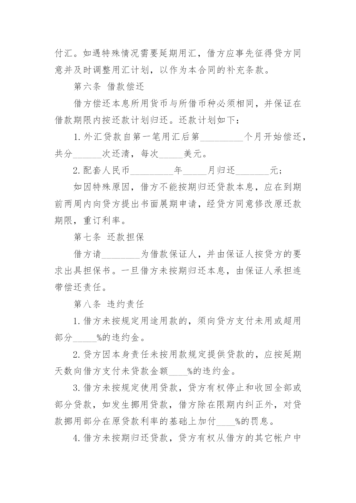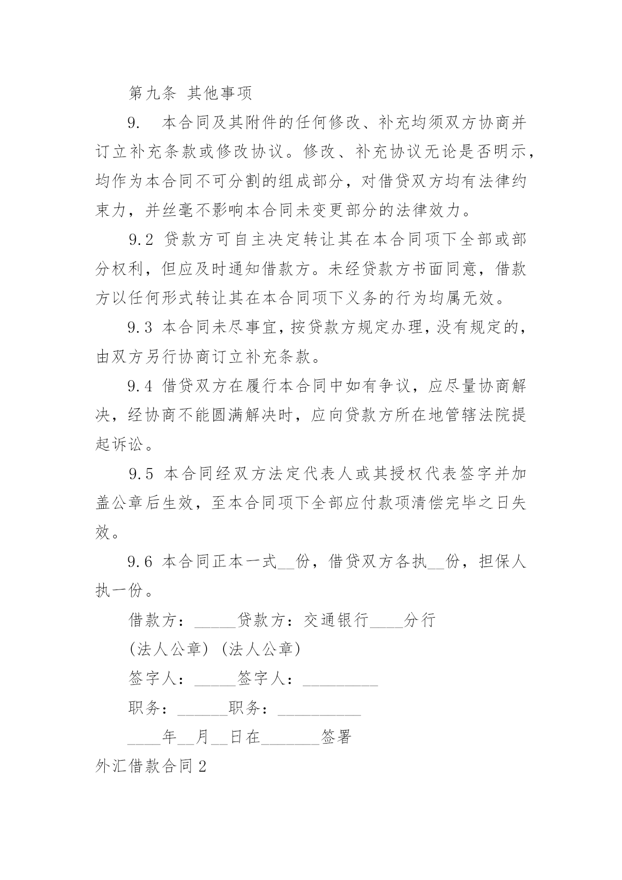 外汇借款合同外汇借款合同【热门】随着人们法律意识的加强,越来越多事情需要用到合同,合同协调着人与人,人与事之间的关系。那么大家知道合法的合同书怎么写吗?下面是小编整理的外汇借款合同,仅供参考,希望能够帮助到大家。外汇借款合同1合同编号:________借款方:_________法定代表人:_______法定地址:________贷款方:交通银行____分行法定代表人:________法定地址:_________应借款方____年__月__日的借款申请,贷款方愿意向借款方提供流动资金外汇贷款。借款双方依据《中华人民共和国合同法》等法规以及交通银行有关业务办法的规定,经过平等协商,现达成以下条款,以资共同遵照执行。第一条借款币种、金额和期限1.借款币种:2.借款金额:___(大写:____)3.借款期限:________借款期限为_____,自____年__月__日起至____年__月__日止。第二条借款用途2.借款限用于:______第三条提款3.提款期为___天,自合同签订生效之日起算。在提款期内,借方应按下列计划提款。┌─────────────────────────┬────────┐│计划提款│金额│├─────┬─────┬──────┬──────┼────────┤│年│季│月│││├─────┼─────┼──────┼──────┼────────┤││││││├─────┼─────┼──────┼──────┼────────┤││││││├─────┼─────┼──────┼──────┼────────┤││││││└─────┴─────┴──────┴──────┴────────┘3.2借款方如需调整提款计划,应至少提前十天提出,并经贷款方同意。3.3借款方办理提款,应提前___银行营业日提交有效借款凭证。3.4提款期到期,未提贷款部分即自动注销,但事前经贷款方书面同意延展提款期限者除外。第四条利息4.借款利息。借款年率为:_____利息每_____计收一次,结算日为______。计息方法:以三百六十天为一年,按贷款余额和实际用款天数计收利息。4.2借款方应于结息日主动支付利息。如结息日为非银行营业日,则顺延至下一个银行营业日支付。届时未付,贷款方有权主动从借款方的存款帐户中扣收。如存款不足以支付利息,对应付未付利息,贷款方可计收复利。4.3利息以所借币种支付。第五条还款5.借款方以销售收入及其他可还贷资金归还借款。借款方应按第.3条款规定的期限内一次或分次档还全部借款本金。还款计划如下:│期序│金额│├─────┬─────┬─────┬────┬────┼──────┤│序数│年│季│月││币种│├─────┼─────┼─────┼────┼────┼──────┤│││││││├─────┼─────┼─────┼────┼────┼──────┤│2││││││├─────┼─────┼─────┼────┼────┼──────┤│3││││││├─────┼─────┼─────┼────┼────┼──────┤│4││││││├─────┼─────┼─────┼────┼────┼──────┤│5││││││├─────┼─────┼─────┼────┼────┼──────┤│6││││││├─────┼─────┼─────┼────┼────┼──────┤│7││││││├─────┼─────┼─────┼────┼────┼──────┤│8││││││├─────┼─────┼─────┼────┼────┼──────┤│9││││││├─────┼─────┼─────┼────┼────┼──────┤│0││││││├─────┼─────┼─────┼────┼────┼──────┤│││││││├─────┼─────┼─────┼────┼────┼──────┤│2││││││└─────┴─────┴─────┴────┴────┴──────┘5.2借款方在原定借款期限内如确需调整还款计划,应提前一个月通知贷款方,并经贷款方同意。贷款到期,借款方因客观原因不能如数归还,贷款方应至少提前十五天向贷款方提交展期申请,经贷款方同意后才能展期;同时,借贷双方对本合同中贷款期限、利率和还款计划部分作出补充和修订。展期贷款利息按修改后期限的相应利率档次确定。5.3借款到期未还又未经贷款方批准展期,对该逾期贷款,贷款方有权从逾期之日起,在原定利率基础上加收___%的利息。第六条担保6.本借款由____提供还款担保(具体担保内容见附件)。如借款方未能按期还款,贷款方可行使上述担保项下的权利。第七条约定事项7.借款方应在贷款方开立往来帐户。借款方应
