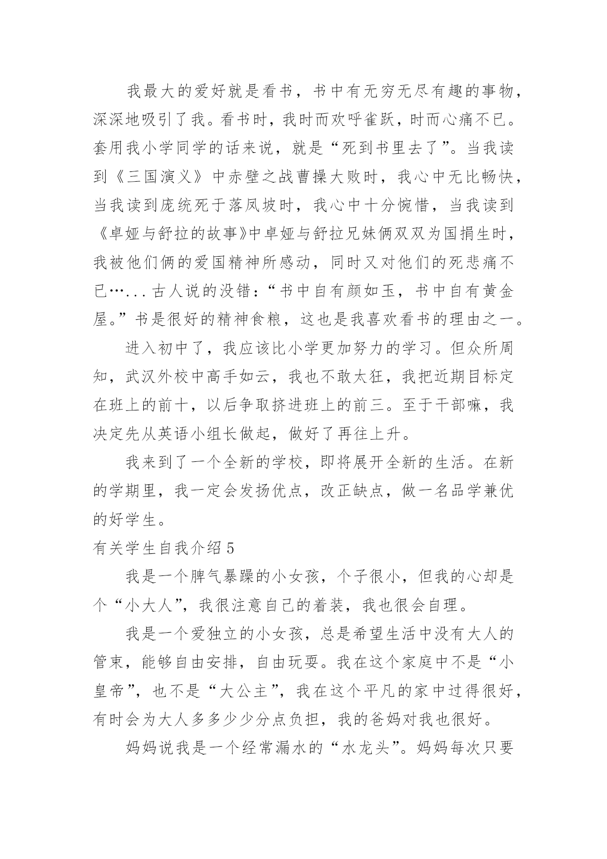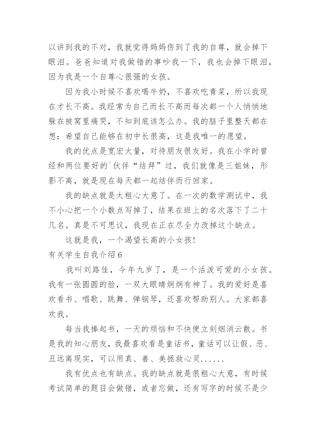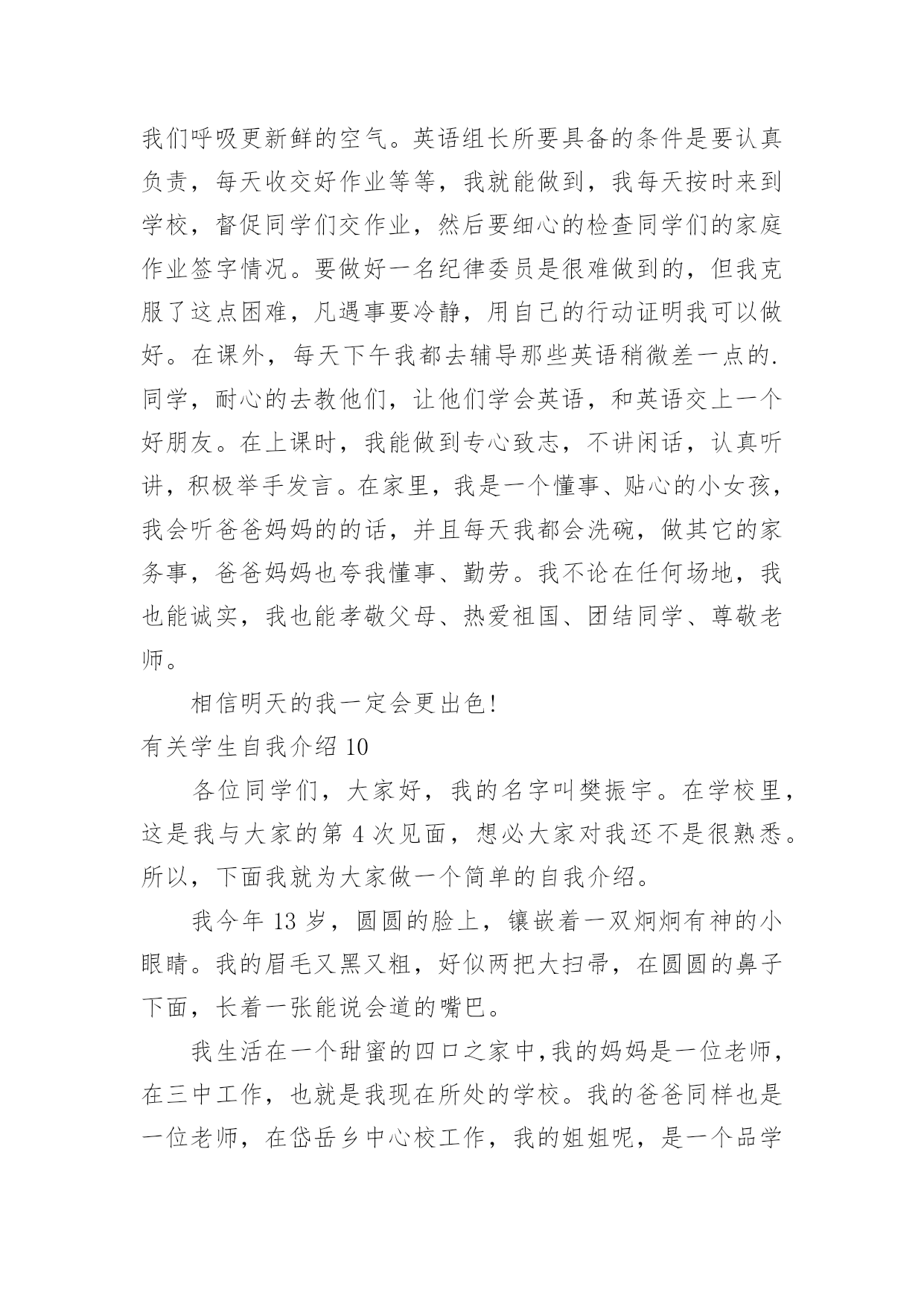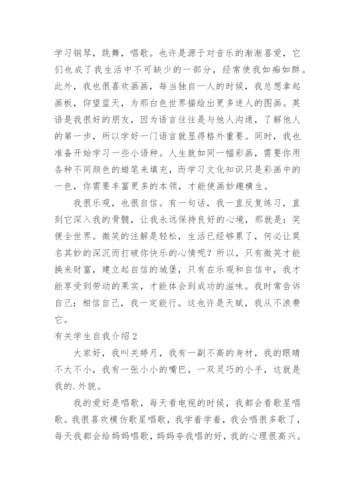 学生自我介绍有关学生自我介绍来到一个陌生的地方时,可能需要我们进行自我介绍,自我介绍可以唤起他人对我们的兴趣。到底应如何写自我介绍呢?以下是小编帮大家整理的有关学生自我介绍,欢迎阅读,希望大家能够喜欢。有关学生自我介绍1我的名字叫卓兰,妈妈说这是“神灯”的意思,也就意味着从我出生的那一刻起,这盏“灯”就将伴随着我的生命,开始照亮我的人生旅程。我很爱打扮,喜欢收集衣服,包包,鞋子,也许是因为女孩子的天性。每当照镜子时,笑看镜中的我:一张小小的脸,一双灵气的.眼,一抹纯真的笑,乌黑长发之中,高挑的个头下,显出一种特殊的气质。不因五官娇小而感到自卑,却因它们小巧玲珑而更加自信;不因肤色不够白皙而感到懊丧,那位青春代表健康。我的笑中时显活泼,时显文静,时显叛逆。同学们说我赋有双重性格,笑容恰到好处,很好相处。在家里,我是一个典型的“乖乖女”,基本上很少让父母操心。我不是班上学习最好的女孩,却是最多才多艺的女孩。从三岁起,妈妈就开启了我心中音乐之门的钥匙,让我开始学习钢琴,跳舞,唱歌。也许是源于对音乐的渐渐喜爱,它们也成了我生活中不可缺少的一部分,经常使我如痴如醉。此外,我也很喜欢画画,每当独自一人的时候,我总想拿起画板,仰望蓝天,为那白色世界描绘出更多迷人的图画。英语是我很好的朋友,因为语言往往是与他人沟通,了解他人的第一步,所以学好一门语言就显得格外重要。同时,我也准备开始学习一些小语种。人生就如同一幅彩画,需要你用各种不同颜色的蜡笔来填充,而学习文化知识只是彩画中的一色,你需要丰富更多的本领,才能使画妙趣横生。我很乐观,也很自信。有一句话,我一直反复练习,直到它深入我的骨髓,让我永远保持良好的心境,那就是:笑便全世界。微笑的注解是轻松,生活已经够累了,何必让莫名其妙的深沉而打破你快乐的心情呢?所以,只有微笑才能换来财富,建立起自信的城堡,只有在乐观和自信中,我才能享受到劳动的果实,才能体会到成功的滋味。我时常告诉自己:相信自己,我一定能行。这也许是天赋,我从不浪费它。有关学生自我介绍2大家好,我叫关婷月,我有一副不高的身材,我的眼睛不大不小,我有一张小小的嘴巴,一双灵巧的小手,这就是我的.外貌。我的爱好是唱歌,每天看电视的时候,我都会看歌星唱歌。我很喜欢模仿歌星唱歌,我学着学着,我会唱很多歌了,每天我都会给妈妈唱歌,妈妈夸我唱的好,我的心理很高兴。你说,我爱唱歌得我是不是很可爱?如果你觉得我这个人很好,你就来和我做朋友吧!有关学生自我介绍3尊敬的各位:你们好!我是一个来自于x市农村的孩子,今年xx岁,以前对所有事物都充满好奇。所以就带着好奇来到了一个不知名的学校。来开始我的所谓的大学生活。虽然如此但是我对我的专业还是很有信心的`。我所学的专业就是计算机。正是由于这个专业才使对自己的前途充满信心。我觉得学好一门编程语言并不难,难的就是你自己不去学,我就是带着这样的开始我的求学之路。在专业老师和自己的努力下,我的专业有所成就。虽然没有考什么证件。但是我相信不会比那些考了证件的人差,JAVA已经达到二级水平。目前我已经做了两个小型的项目,一个就是超市里面的收银项目。还有一个就是音乐站,我相信只要我自己努力学习,我会走得更好,同时我也是为了有这天的到来。谢谢大家!有关学生自我介绍4大家好,我叫XX。取名时,我爸妈正是想到了杨万里的名句:“小荷才露尖尖角,早有蜻蜓立上头”才给我取了这么一个名字。怎么样?听起来够淑女的吧。但现实中的我却长得丑、嗓门大、胆子粗,活像一个假小子,希望列位及早做好心理准备。我毕业于武汉理工大学第二附属小学,这虽然只是一个很小的学校,一个年级只有100来个人,但教学质量还可以,光是今年,就有7位同学考进了我们武汉试验外国语学校,这个成绩还是挺不错的。我出生于1997年1月13日,再有四个月就满十二岁了。很多人听了我的出生年月后非常惊讶,确实,我上学早了点儿,我或许会是咱们初一(1)班最小的一个,有什么不懂的地方,还望大家多多指教。我虽然小了点儿,但成绩也还说得过去,在小学时,一般都能考进前三。我最好的科目是数学和英语,经常在各个大赛中取得较好的'名次。我的语文稍差一些,尤其是作文,希望哪位语文好的同学能帮帮我,我相信,在大家的帮助下,我的语文成绩会有所提高。我在小学时当了五年的体育委员,这并不是因为我体育好,而是因为我嗓门大。其实说来也够惭愧的,当了这么长时间的体育委员,跑步居然还有时不及格,不只是体育,美术也一样,这完全是因为我只注重主课,不关心副科。现在上中学了,我一定要改掉这个坏习惯,再也不偏科了。我也报了一些兴趣班。我小的时候学过电子琴和舞蹈,现在在学小提琴和软笔书法。我电子琴学到了五级,小提琴学到了六级。我的毛笔字写得还可以(虽然硬笔写得有点烂),秦楷已经学完了,正在学隶书,我的书法还在比赛中取得过奖项