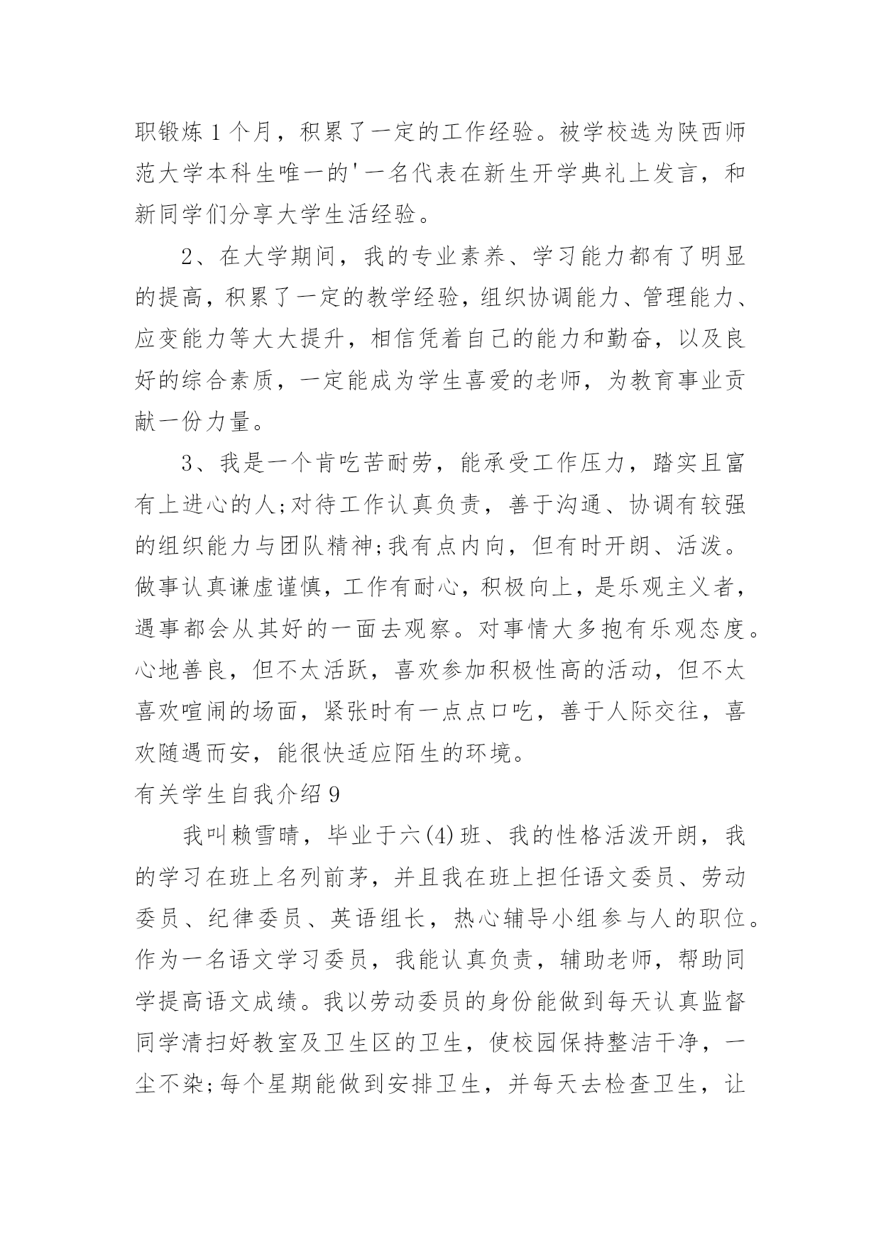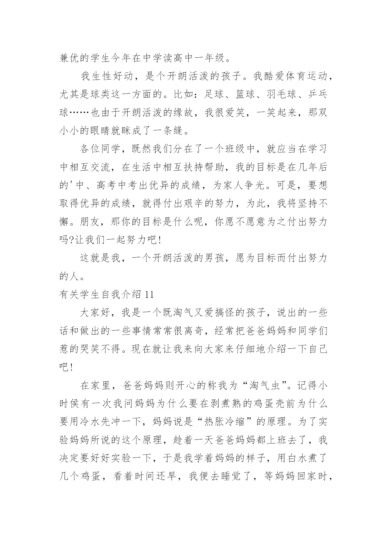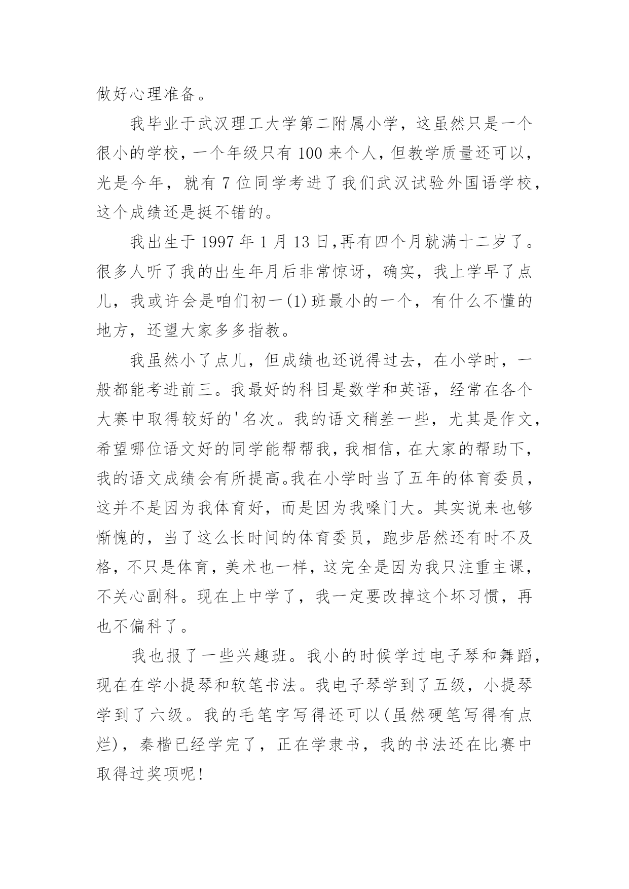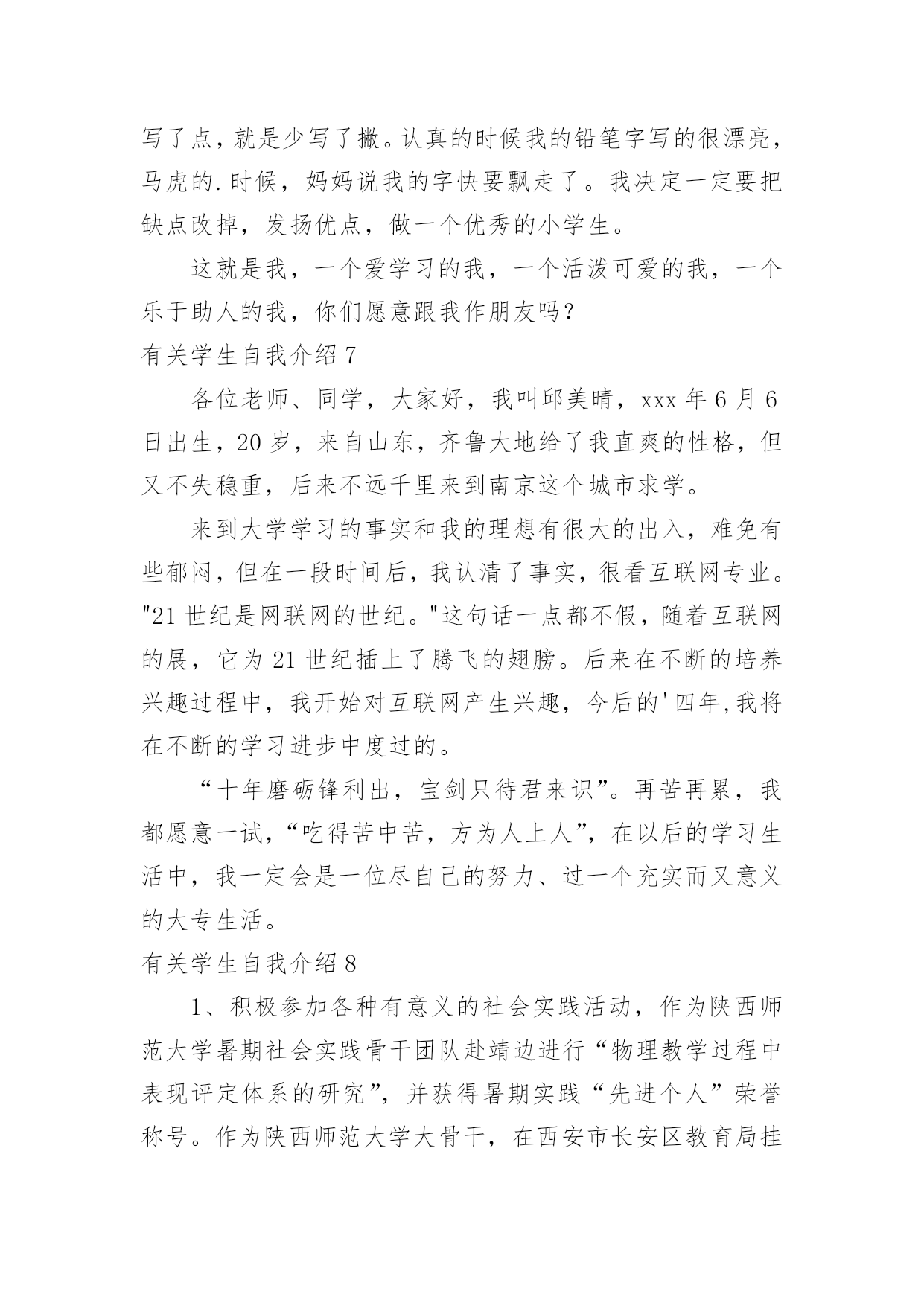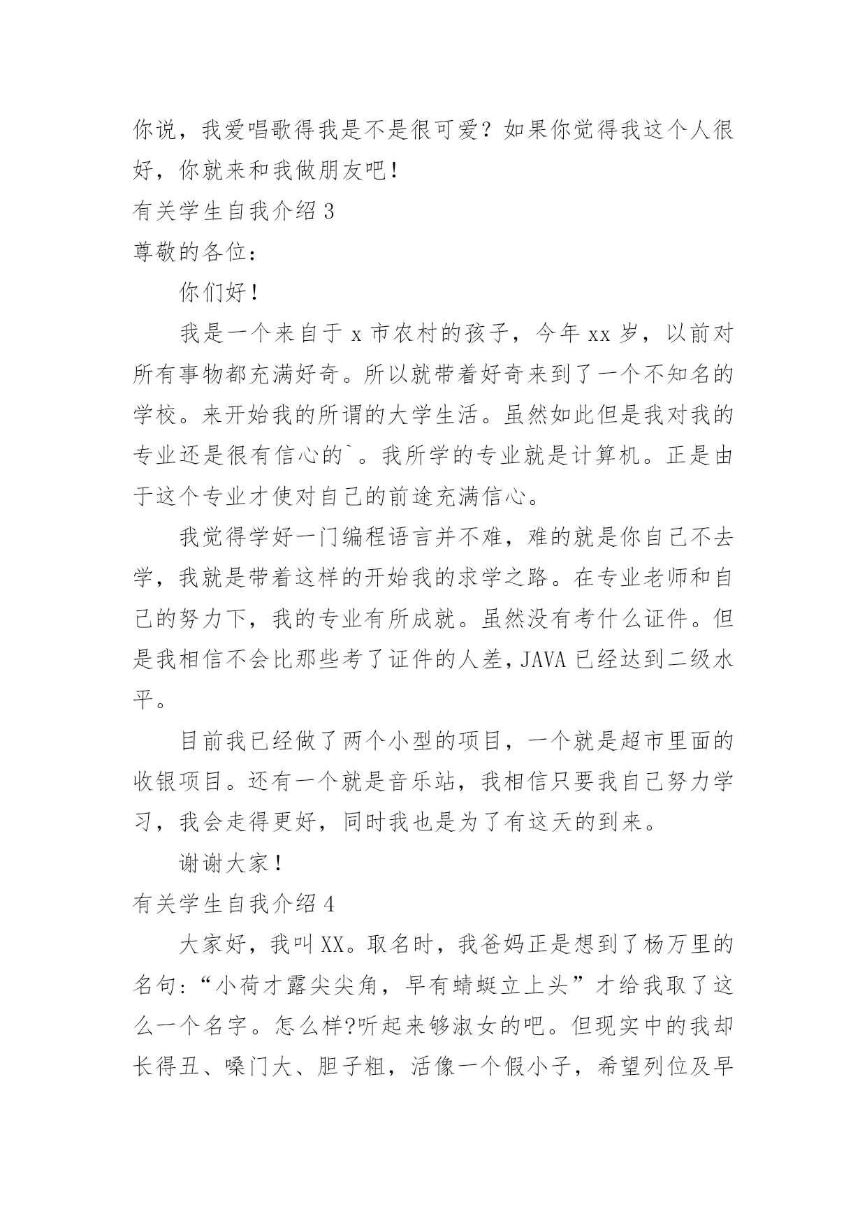 学生自我介绍有关学生自我介绍来到一个陌生的地方时,可能需要我们进行自我介绍,自我介绍可以唤起他人对我们的兴趣。到底应如何写自我介绍呢?以下是小编帮大家整理的有关学生自我介绍,欢迎阅读,希望大家能够喜欢。有关学生自我介绍1我的名字叫卓兰,妈妈说这是“神灯”的意思,也就意味着从我出生的那一刻起,这盏“灯”就将伴随着我的生命,开始照亮我的人生旅程。我很爱打扮,喜欢收集衣服,包包,鞋子,也许是因为女孩子的天性。每当照镜子时,笑看镜中的我:一张小小的脸,一双灵气的.眼,一抹纯真的笑,乌黑长发之中,高挑的个头下,显出一种特殊的气质。不因五官娇小而感到自卑,却因它们小巧玲珑而更加自信;不因肤色不够白皙而感到懊丧,那位青春代表健康。我的笑中时显活泼,时显文静,时显叛逆。同学们说我赋有双重性格,笑容恰到好处,很好相处。在家里,我是一个典型的“乖乖女”,基本上很少让父母操心。我不是班上学习最好的女孩,却是最多才多艺的女孩。从三岁起,妈妈就开启了我心中音乐之门的钥匙,让我开始学习钢琴,跳舞,唱歌。也许是源于对音乐的渐渐喜爱,它们也成了我生活中不可缺少的一部分,经常使我如痴如醉。此外,我也很喜欢画画,每当独自一人的时候,我总想拿起画板,仰望蓝天,为那白色世界描绘出更多迷人的图画。英语是我很好的朋友,因为语言往往是与他人沟通,了解他人的第一步,所以学好一门语言就显得格外重要。同时,我也准备开始学习一些小语种。人生就如同一幅彩画,需要你用各种不同颜色的蜡笔来填充,而学习文化知识只是彩画中的一色,你需要丰富更多的本领,才能使画妙趣横生。我很乐观,也很自信。有一句话,我一直反复练习,直到它深入我的骨髓,让我永远保持良好的心境,那就是:笑便全世界。微笑的注解是轻松,生活已经够累了,何必让莫名其妙的深沉而打破你快乐的心情呢?所以,只有微笑才能换来财富,建立起自信的城堡,只有在乐观和自信中,我才能享受到劳动的果实,才能体会到成功的滋味。我时常告诉自己:相信自己,我一定能行。这也许是天赋,我从不浪费它。有关学生自我介绍2大家好,我叫关婷月,我有一副不高的身材,我的眼睛不大不小,我有一张小小的嘴巴,一双灵巧的小手,这就是我的.外貌。我的爱好是唱歌,每天看电视的时候,我都会看歌星唱歌。我很喜欢模仿歌星唱歌,我学着学着,我会唱很多歌了,每天我都会给妈妈唱歌,妈妈夸我唱的好,我的心理很高兴。你说,我爱唱歌得我是不是很可爱?如果你觉得我这个人很好,你就来和我做朋友吧!有关学生自我介绍3尊敬的各位:你们好!我是一个来自于x市农村的孩子,今年xx岁,以前对所有事物都充满好奇。所以就带着好奇来到了一个不知名的学校。来开始我的所谓的大学生活。虽然如此但是我对我的专业还是很有信心的`。我所学的专业就是计算机。正是由于这个专业才使对自己的前途充满信心。我觉得学好一门编程语言并不难,难的就是你自己不去学,我就是带着这样的开始我的求学之路。在专业老师和自己的努力下,我的专业有所成就。虽然没有考什么证件。但是我相信不会比那些考了证件的人差,JAVA已经达到二级水平。目前我已经做了两个小型的项目,一个就是超市里面的收银项目。还有一个就是音乐站,我相信只要我自己努力学习,我会走得更好,同时我也是为了有这天的到来。谢谢大家!有关学生自我介绍4大家好,我叫XX。取名时,我爸妈正是想到了杨万里的名句:“小荷才露尖尖角,早有蜻蜓立上头”才给我取了这么一个名字。怎么样?听起来够淑女的吧。但现实中的我却长得丑、嗓门大、胆子粗,活像一个假小子,希望列位及早做好心理准备。我毕业于武汉理工大学第二附属小学,这虽然只是一个很小的学校,一个年级只有100来个人,但教学质量还可以,光是今年,就有7位同学考进了我们武汉试验外国语学校,这个成绩还是挺不错的。我出生于1997年1月13日,再有四个月就满十二岁了。很多人听了我的出生年月后非常惊讶,确实,我上学早了点儿,我或许会是咱们初一(1)班最小的一个,有什么不懂的地方,还望大家多多指教。我虽然小了点儿,但成绩也还说得过去,在小学时,一般都能考进前三。我最好的科目是数学和英语,经常在各个大赛中取得较好的'名次。我的语文稍差一些,尤其是作文,希望哪位语文好的同学能帮帮我,我相信,在大家的帮助下,我的语文成绩会有所提高。我在小学时当了五年的体育委员,这并不是因为我体育好,而是因为我嗓门大。其实说来也够惭愧的,当了这么长时间的体育委员,跑步居然还有时不及格,不只是体育,美术也一样,这完全是因为我只注重主课,不关心副科。现在上中学了,我一定要改掉这个坏习惯,再也不偏科了。我也报了一些兴趣班。我小的时候学过电子琴和舞蹈,现在在学小提琴和软笔书法。我电子琴学到了五级,小提琴学到了六级。我的毛笔字写得还可以(虽然硬笔写得有点烂),秦楷已经学完了,正在学隶书,我的书法还在比赛中取得过奖项