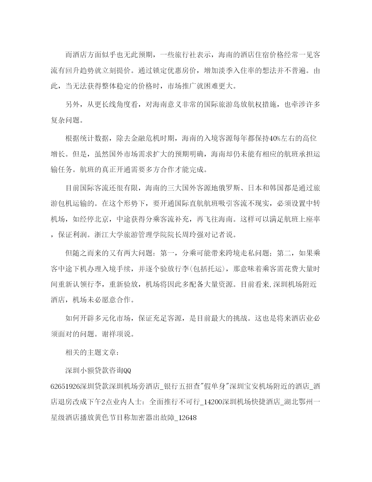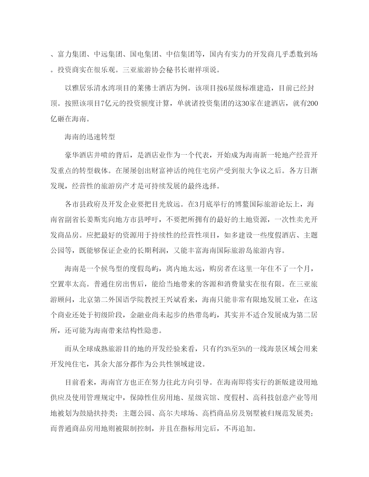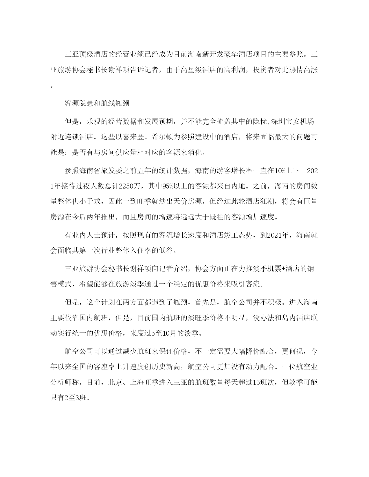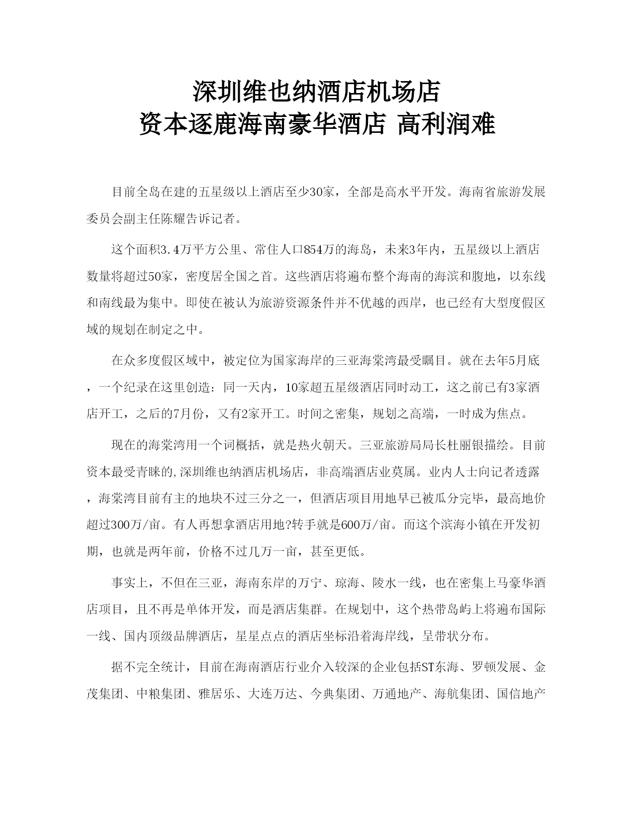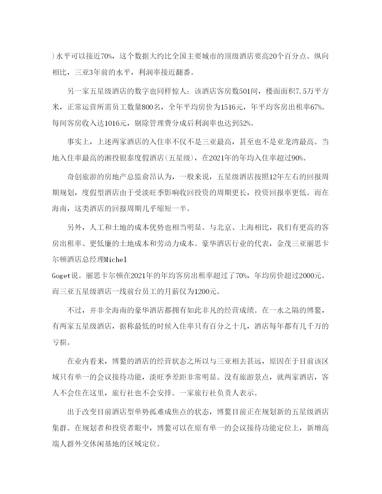 深圳维也纳酒店机场店资本逐鹿海南豪华酒店高利润难(常用版)(可以直接使用,可编辑完整版资料,欢迎下载)深圳维也纳酒店机场店资本逐鹿海南豪华酒店高利润难目前全岛在建的五星级以上酒店至少30家,全部是高水平开发。海南省旅游发展委员会副主任陈耀告诉记者。这个面积3.4万平方公里、常住人口854万的海岛,未来3年内,五星级以上酒店数量将超过50家,密度居全国之首。这些酒店将遍布整个海南的海滨和腹地,以东线和南线最为集中。即使在被认为旅游资源条件并不优越的西岸,也已经有大型度假区域的规划在制定之中。在众多度假区域中,被定位为国家海岸的三亚海棠湾最受瞩目。就在去年5月底,一个纪录在这里创造:同一天内,10家超五星级酒店同时动工,这之前已有3家酒店开工,之后的7月份,又有2家开工。时间之密集,规划之高端,一时成为焦点。现在的海棠湾用一个词概括,就是热火朝天。三亚旅游局局长杜丽银描绘。目前资本最受青睐的,深圳维也纳酒店机场店,非高端酒店业莫属。业内人士向记者透露,海棠湾目前有主的地块不过三分之一,但酒店项目用地早已被瓜分完毕,最高地价超过300万/亩。有人再想拿酒店用地?转手就是600万/亩。而这个滨海小镇在开发初期,也就是两年前,价格不过几万一亩,甚至更低。事实上,不但在三亚,海南东岸的万宁、琼海、陵水一线,也在密集上马豪华酒店项目,且不再是单体开发,而是酒店集群。在规划中,这个热带岛屿上将遍布国际一线、国内顶级品牌酒店,星星点点的酒店坐标沿着海岸线,呈带状分布。据不完全统计,目前在海南酒店行业介入较深的企业包括ST东海、罗顿发展、金茂集团、中粮集团、雅居乐、大连万达、今典集团、万通地产、海航集团、国信地产、富力集团、中远集团、国电集团、中信集团等,国内有实力的开发商几乎悉数到场。投资商实在很乐观。三亚旅游协会秘书长谢祥项说。以雅居乐清水湾项目的莱佛士酒店为例。该项目按6星级标准建造,目前已经封顶。按照该项目7亿元的投资额度计算,单就诸投资集团的这30家在建酒店,就有200亿砸在海南。海南的迅速转型豪华酒店井喷的背后,是酒店业作为一个代表,开始成为海南新一轮地产经营开发重点的转型载体。在屡屡创出财富神话的纯住宅房产受到很大争议之后。各方日渐发现,经营性的旅游房产才是可持续发展的最终选择。各市县政府及开发企业要把目光放远。在3月底举行的博鳌国际旅游论坛上,海南省副省长姜斯宪向地方市县呼吁,不要把所拥有的最好的土地资源,一次性卖光开发商品房。应把最好的资源用于持续性的经营性项目,如多建设一些度假酒店、主题公园等,既能够保证企业的长期利润,又能丰富海南国际旅游岛旅游内容。海南是一个候鸟型的度假岛屿,离内地太远,购房者在这里一年住不了一个月,空置率太高。普通住房出售后,能给当地带来的客源和消费量实在很有限。在三亚旅游顾问,北京第二外国语学院教授王兴斌看来,海南只能非常有限地发展工业,在这个商业还处于初级阶段,金融业尚未起步的热带岛屿,其实并不适合发展成为第二居所,还可能为海南带来结构性隐患。而从全球成熟旅游目的地的开发经验来看,只有约3%至5%的一线海景区域会用来开发纯住宅,其余大部分都作为公共性领域建设。目前看来,海南官方也正在努力往此方向引导。在海南即将实行的新版建设用地供应及使用管理规定中,保障性住房用地、星级宾馆、度假村、高科技创意产业等用地被划为鼓励扶持类;主题公园、高尔夫球场、高档商品房及别墅被归规范发展类;而普通商品房用地则被限制控制,并且在指标用完后,不再追加。清一色豪华酒店市场何在?但是,当旅游地产成为共识之后,又一个质疑被提出:为什么开发的全是清一色的豪华酒店?其他地区红火的经济性酒店为何不见一家?这会不会是泡沫?陈耀对记者解释,现在海南的豪华酒店数量,若按照地块平均数来算,的确密度最大,但是,海南面临的是全国的市场。我们的业绩高于行业平均水平,说明现在还是有发展空间。奇创旅游咨询运营机构房地产部总监俞昂则算了一笔账:目前海南五星级酒店平均每平米实际造价在7000至10000元(不含地价),折合下来每间五星级客房约100至200万人民币。开业运营后,实际上来自房间维护的支出相当少。但是,五星级酒店的房价比经济型高得多,旺季的上涨幅度远超经济型。与价格只能维持在一个小区间内以保证高入住率的经济型酒店相比,五星级客房的投入产出效益更加良好。从相关渠道获得的多份三亚4星、5星级酒店在2021年的运营数据显示,三亚的高星级酒店利润水平与国内其他地区相比遥遥领先。部分五星级酒店的经营利润率(GOP)水平可以接近70%,这个数据大约比全国主要城市的顶级酒店要高20个百分点。纵向相比,三亚3年前的水平,利润率接近翻番。汉庭连锁酒店执行董事长季琦对记者直言,由于客人对度假酒店要求更高,且淡旺季客流不稳定