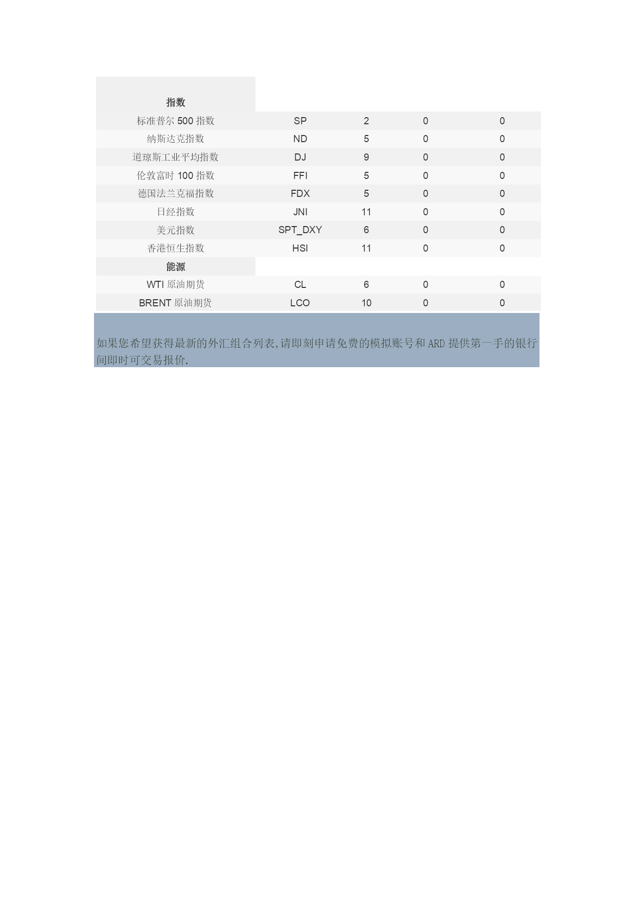 ARD点差_ARD开户点差介绍什么是点差?点差-在货币市场中运用的术语,表示汇率可进行的最小增幅移动.根据市场环境,正常情况下是一个基点(欧元/美元、英磅/美元、美元/瑞士法郎货币对中为0.0001,而在美元/日元货币对中为0.01).买/卖差价(ARD提供的是固定点差,而非浮动点差.)固定点差:除了极特殊的市场波动情况外,均维持固定点差交易。浮动点差:交易点差随市场波动情况进行改变.(如很多交易平台提供低于1点的浮动点差,但在真实交易时点差往往达到3点、4点甚至9点,将远远大于固定点差)交易品种品种代码差价利息(买)利息(卖)货币交易欧元兑美元EUR/USD2+0.25%-1.50%美元兑日元USD/JPY30.00%-1.75%美元兑瑞郎USD/CHF30.00%-1.75%欧元兑瑞郎EUR/CHF3+0.25%-2.00%欧元兑英镑EUR/GBP4+0.25%-1.75%欧元兑日元EUR/JPY5+0.50%-2.50%英镑兑美元GBP/USD4+0.25%-1.50%美元兑加元USD/CAD4-1.75%+0.50%澳元兑美元AUD/USD4+2.25%-5.50%澳元兑欧元AUD/EUR6-1.75%-4.50%英镑兑加元GBP/CAD50.00%-1.75%英镑兑瑞郎GBP/CHF6+0.50%-1.75%英镑兑日元GBP/JPY6+0.25%-1.75%澳元兑英镑AUD/GBP5+2.00%-5.50%澳元兑加元AUD/CAD8+2.00%-5.00%澳元兑日元AUD/JPY8+2.00%-2.00%加元兑瑞郎CAD/CHF5+1.75%-2.00%瑞郎兑日元CHF/JPY6+0.25%-2.00%欧元兑加元EUR/CAD120.00%-2.00%澳元兑瑞郎AUD/CHF6+0.25%-5.00%加元兑日元CAD/JPY6+0.25%-1.50%贵金属交易黄金/美元XAU/USD5-1.50%+0.25%白银/美元XAG/USD3-1.50%+0.25%指数标准普尔500指数SP200纳斯达克指数ND500道琼斯工业平均指数DJ900伦敦富时100指数FFI500德国法兰克福指数FDX500日经指数JNI1100美元指数SPT_DXY600香港恒生指数HSI1100能源WTI原油期货CL600BRENT原油期货LCO1000如果您希望获得最新的外汇组合列表,请即刻申请免费的模拟账号和ARD提供第一手的银行间即时可交易报价.