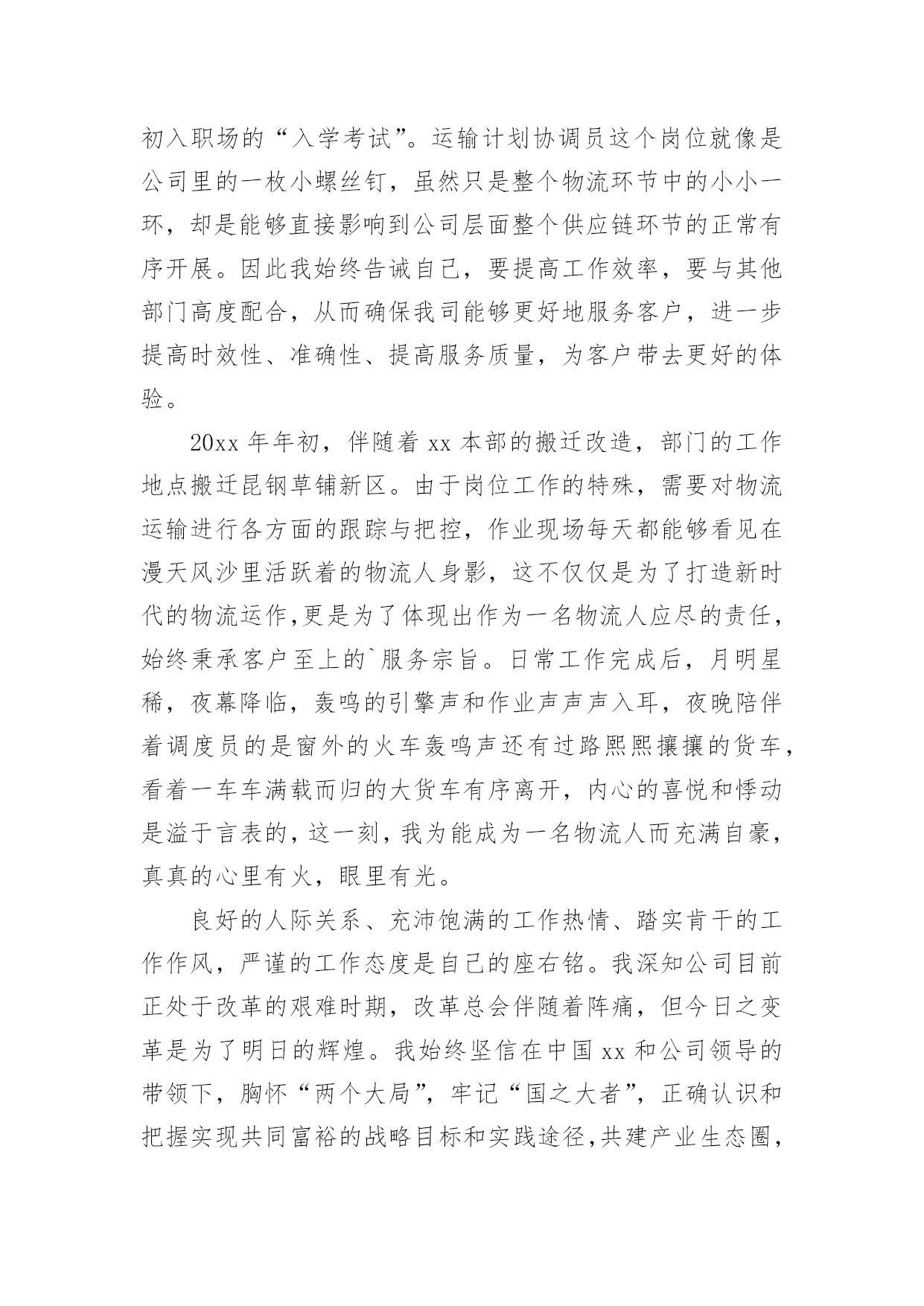 物流投资青年个人工作心得体会心中有不少心得体会时,往往会写一篇心得体会,这样可以帮助我们总结以往思想、工作和学习。那么心得体会该怎么写?想必这让大家都很苦恼吧,以下是小编为大家整理的物流投资青年个人工作心得体会,希望对大家有所帮助。时光荏苒,一眨眼我进入xx省物流投资集团有限公司已经有一年半的时间。我是xxx,是20xx年毕业的一名应届大学生,首先我为能够进入xx物投感到很荣幸,能够在茫茫人海中、在许许多多的磕绊中成为了一名新时代物流人。刚进入公司时,我仿佛回到出入大学时的场景,xx公司秉承“师带徒”、“传帮带”的宝贵精神,给我们每个入职的新员工都安排了经验丰富的师傅带领,此举让我们在短时间内多元化,深层次的了解到xx的种种,也为我们日后的工作发展奠定了坚实的基础。在正式成为这个温暖的大家庭的一员之后,在各位领导和众多同事的帮助下,我在工作上越来越得心应手,已经开始能够独当一面,独自应对工作中的各项事宜。我的工作岗位是运输协调业务员,负责分配每日钢材运输计划,协调整个计划执行中遇到的问题。在实习期间,师傅也耐心地、不厌其烦地教我如何分配计划、如何处理遇到的问题。除此之外,我更多的是学会如何与人交流、如何与人相处,如何从一名在校大学生过度为职场人,在历练期间顺利通过了我们初入职场的“入学考试”。运输计划协调员这个岗位就像是公司里的一枚小螺丝钉,虽然只是整个物流环节中的小小一环,却是能够直接影响到公司层面整个供应链环节的正常有序开展。因此我始终告诫自己,要提高工作效率,要与其他部门高度配合,从而确保我司能够更好地服务客户,进一步提高时效性、准确性、提高服务质量,为客户带去更好的体验。20xx年年初,伴随着xx本部的搬迁改造,部门的工作地点搬迁昆钢草铺新区。由于岗位工作的特殊,需要对物流运输进行各方面的跟踪与把控,作业现场每天都能够看见在漫天风沙里活跃着的物流人身影,这不仅仅是为了打造新时代的物流运作,更是为了体现出作为一名物流人应尽的责任,始终秉承客户至上的`服务宗旨。日常工作完成后,月明星稀,夜幕降临,轰鸣的引擎声和作业声声声入耳,夜晚陪伴着调度员的是窗外的火车轰鸣声还有过路熙熙攘攘的货车,看着一车车满载而归的大货车有序离开,内心的喜悦和悸动是溢于言表的,这一刻,我为能成为一名物流人而充满自豪,真真的心里有火,眼里有光。良好的人际关系、充沛饱满的工作热情、踏实肯干的工作作风,严谨的工作态度是自己的座右铭。我深知公司目前正处于改革的艰难时期,改革总会伴随着阵痛,但今日之变革是为了明日的辉煌。我始终坚信在中国xx和公司领导的带领下,胸怀“两个大局”,牢记“国之大者”,正确认识和把握实现共同富裕的战略目标和实践途径,共建产业生态圈,实现钢铁报国、钢铁强国的伟大征程。我愿与公司共克时艰,充分将个人发展充分融入进企业发展,积青年力之所举,展现代物流风采,一同努力,共赴未来!