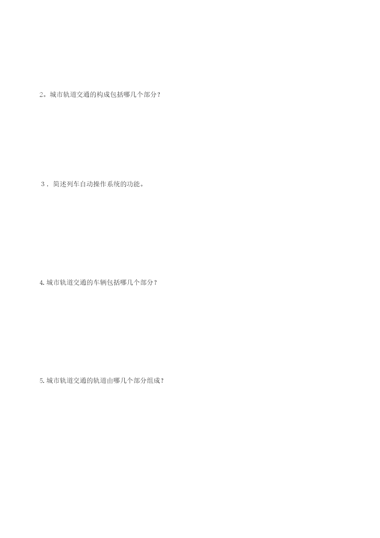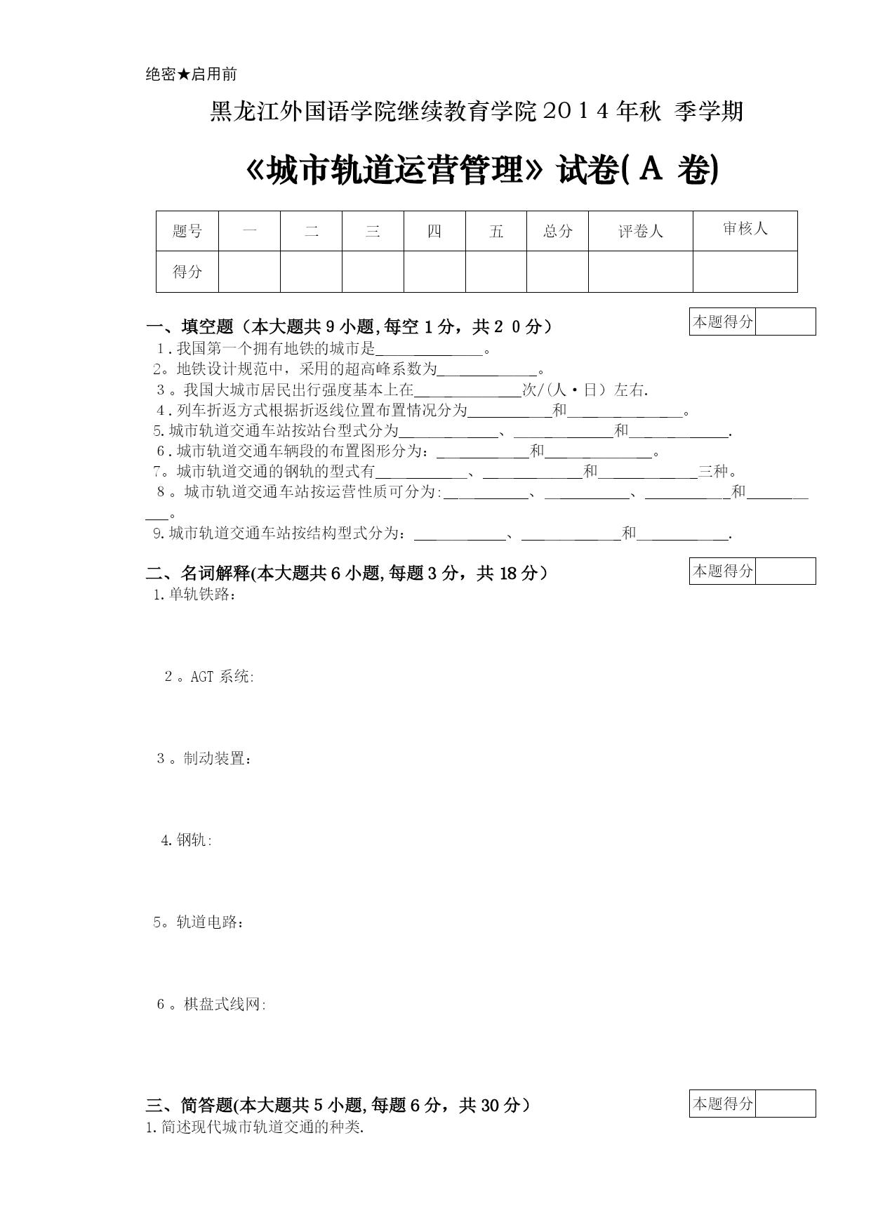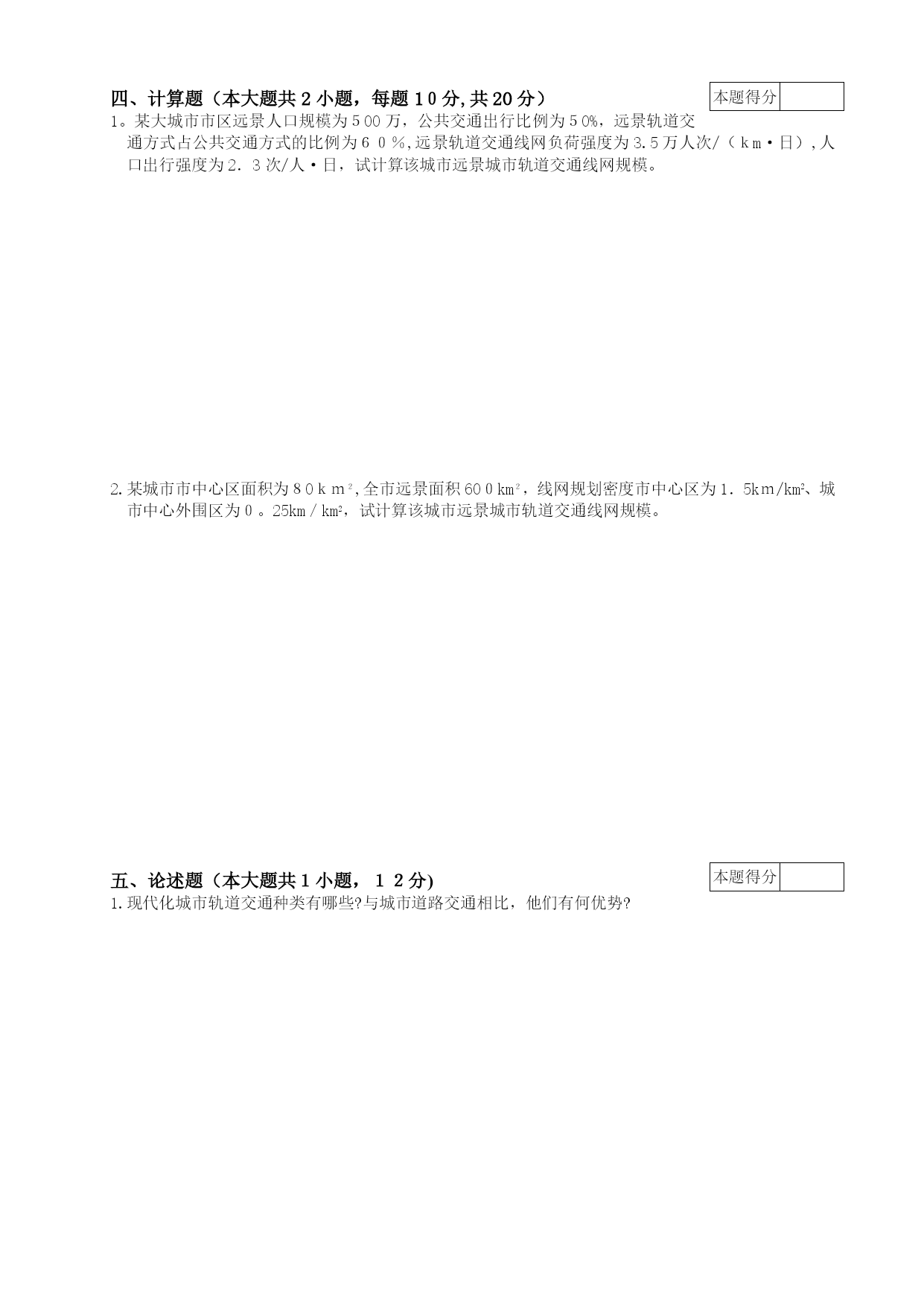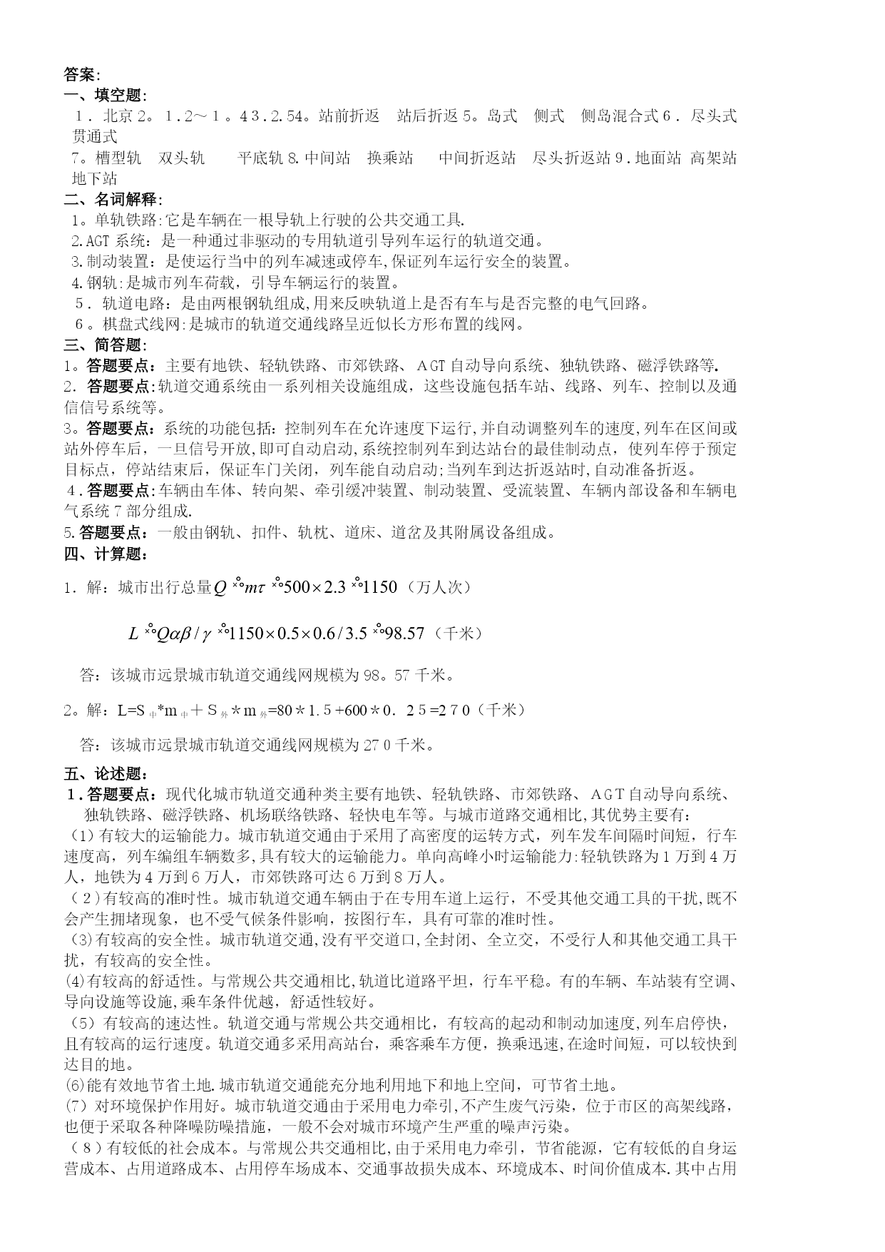 城市轨道运营管理试卷A以及答案(完整资料)(可以直接使用,可编辑优秀版资料,欢迎下载)绝密★启用前黑龙江外国语学院继续教育学院2014年秋季学期《城市轨道运营管理》试卷(A卷)题号一二三四五总分评卷人审核人得分本题得分一、填空题(本大题共9小题,每空1分,共20分)1.我国第一个拥有地铁的城市是__________。2。地铁设计规范中,采用的超高峰系数为__________。3。我国大城市居民出行强度基本上在__________次/(人·日)左右.4.列车折返方式根据折返线位置布置情况分为__________和__________。5.城市轨道交通车站按站台型式分为__________、__________和__________.6.城市轨道交通车辆段的布置图形分为:__________和__________。7。城市轨道交通的钢轨的型式有__________、__________和__________三种。8。城市轨道交通车站按运营性质可分为:__________、__________、__________和__________。9.城市轨道交通车站按结构型式分为:__________、__________和__________.本题得分二、名词解释(本大题共6小题,每题3分,共18分)1.单轨铁路:2。AGT系统:3。制动装置:4.钢轨:5。轨道电路:6。棋盘式线网:本题得分三、简答题(本大题共5小题,每题6分,共30分)1.简述现代城市轨道交通的种类.2。城市轨道交通的构成包括哪几个部分?3.简述列车自动操作系统的功能。4.城市轨道交通的车辆包括哪几个部分?5.城市轨道交通的轨道由哪几个部分组成?本题得分四、计算题(本大题共2小题,每题10分,共20分)1。某大城市市区远景人口规模为500万,公共交通出行比例为50%,远景轨道交通方式占公共交通方式的比例为60%,远景轨道交通线网负荷强度为3.5万人次/(km·日),人口出行强度为2.3次/人·日,试计算该城市远景城市轨道交通线网规模。2.某城市市中心区面积为80km2,全市远景面积600km2,线网规划密度市中心区为1.5km/km2、城市中心外围区为0。25km/km2,试计算该城市远景城市轨道交通线网规模。本题得分五、论述题(本大题共1小题,12分)1.现代化城市轨道交通种类有哪些?与城市道路交通相比,他们有何优势?答案:一、填空题:1.北京2。1.2~1。43.2.54。站前折返站后折返5。岛式侧式侧岛混合式6.尽头式贯通式7。槽型轨双头轨平底轨8.中间站换乘站中间折返站尽头折返站9.地面站高架站地下站二、名词解释:1。单轨铁路:它是车辆在一根导轨上行驶的公共交通工具.2.AGT系统:是一种通过非驱动的专用轨道引导列车运行的轨道交通。3.制动装置:是使运行当中的列车减速或停车,保证列车运行安全的装置。4.钢轨:是城市列车荷载,引导车辆运行的装置。5.轨道电路:是由两根钢轨组成,用来反映轨道上是否有车与是否完整的电气回路。6。棋盘式线网:是城市的轨道交通线路呈近似长方形布置的线网。三、简答题:1。答题要点:主要有地铁、轻轨铁路、市郊铁路、AGT自动导向系统、独轨铁路、磁浮铁路等.2.答题要点:轨道交通系统由一系列相关设施组成,这些设施包括车站、线路、列车、控制以及通信信号系统等。3。答题要点:系统的功能包括:控制列车在允许速度下运行,并自动调整列车的速度,列车在区间或站外停车后,一旦信号开放,即可自动启动,系统控制列车到达站台的最佳制动点,使列车停于预定目标点,停站结束后,保证车门关闭,列车能自动启动;当列车到达折返站时,自动准备折返。4.答题要点:车辆由车体、转向架、牵引缓冲装置、制动装置、受流装置、车辆内部设备和车辆电气系统7部分组成.5.答题要点:一般由钢轨、扣件、轨枕、道床、道岔及其附属设备组成。四、计算题:1.解:城市出行总量(万人次)(千米)答:该城市远景城市轨道交通线网规模为98。57千米。2。解:L=S中*m中+S外*m外=80*1.5+600*0.25=270(千米)答:该城市远景城市轨道交通线网规模为270千米。五、论述题:1.答题要点:现代化城市轨道交通种类主要有地铁、轻轨铁路、市郊铁路、AGT自动导向系统、独轨铁路、磁浮铁路、机场联络铁路、轻快电车等。与城市道路交通相比,其优势主要有:(1)有较大的运输能力。城市轨道交通由于采用了高密度的运转方式