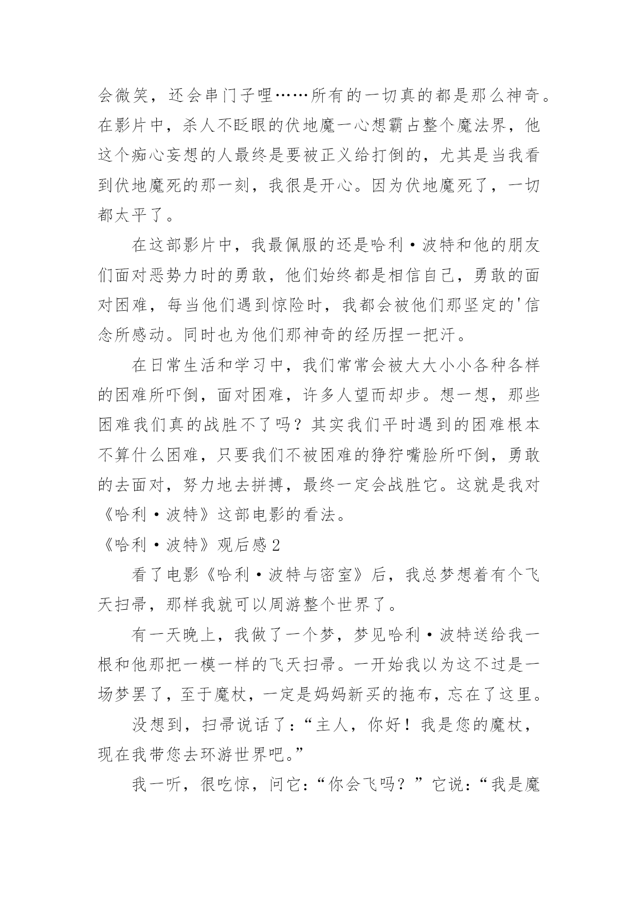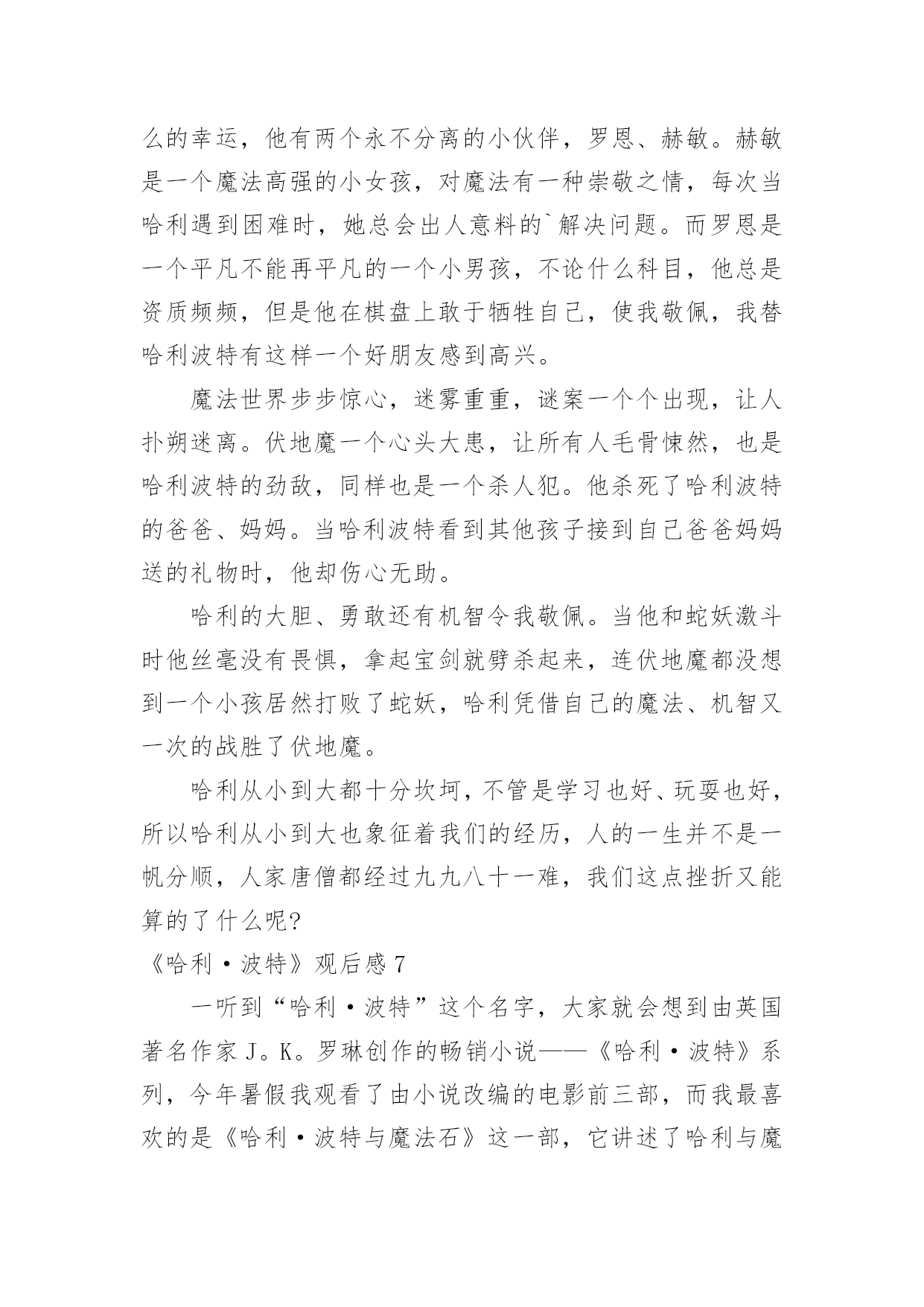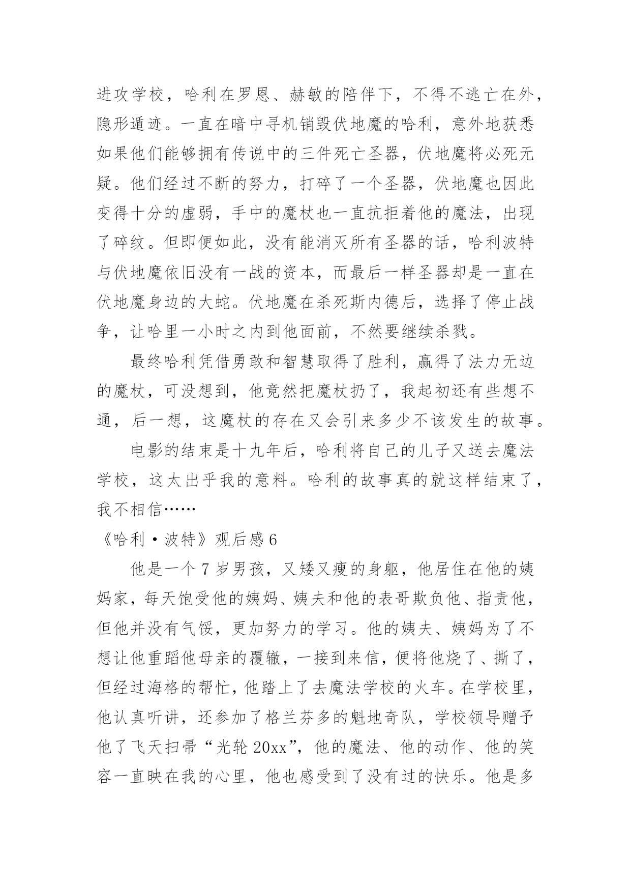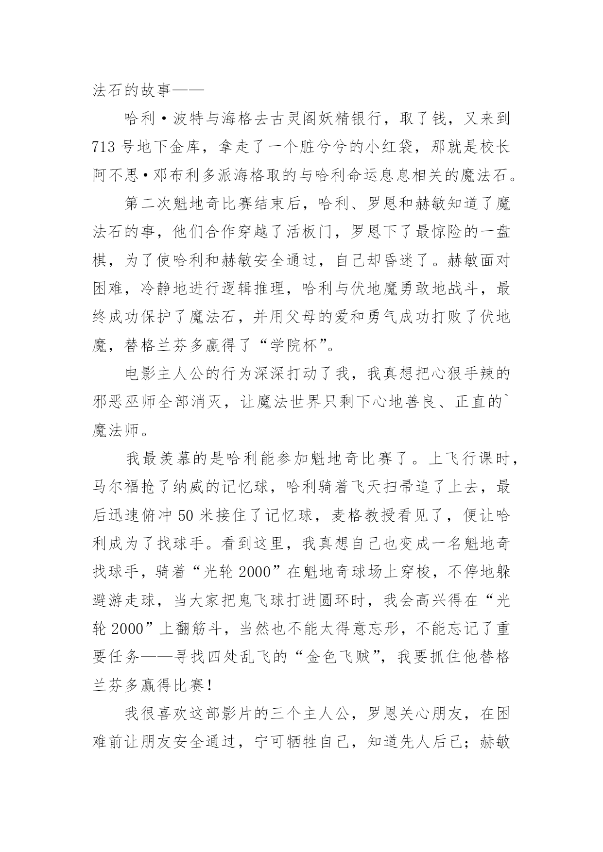 《哈利·波特》观后感《哈利·波特》观后感当认真看完一部影视作品后,想必你有不少可以分享的东西,这时候十分有必须要写一篇观后感了!那要怎么写好观后感呢?以下是小编整理的《哈利·波特》观后感,仅供参考,希望能够帮助到大家。《哈利·波特》观后感1这是一部关于魔法世界的电影。故事曲折,神奇,非常之精彩,让我一开始就被深深感动了。还有四天,哈利就要迎来自己十七岁的生日,成为一名真正的魔法师。为了不让哈利遭到伏地魔的袭击,凤凰社的成员精心策划了秘密转移哈利的计划,然而,可怕的意外还是发生了。与此同时,卷土重来的伏地魔已经占领了霍格沃茨和魔法部,控制了半个魔法世界。哈利在好朋友罗恩,赫敏的陪伴下逃亡在外,他意外得知,如果能拥有传说中的三件死亡圣器,伏地魔将必死无疑。一次偶然的遭遇,哈利倒在伏地魔的圣器之下,然而,伏地魔未能如愿以偿。最终,哈利凭借勇敢和智慧取得了胜利。这是一部上座率极高的影片,场面炫目,特技甚好,故事中到处充满着超神奇的魔法力量,猫头鹰可以成为他们的信差,飞天扫帚是交通工具,画像中的人是活的,会眨眼,会微笑,还会串门子哩……所有的一切真的都是那么神奇。在影片中,杀人不眨眼的伏地魔一心想霸占整个魔法界,他这个痴心妄想的人最终是要被正义给打倒的,尤其是当我看到伏地魔死的那一刻,我很是开心。因为伏地魔死了,一切都太平了。在这部影片中,我最佩服的还是哈利·波特和他的朋友们面对恶势力时的勇敢,他们始终都是相信自己,勇敢的面对困难,每当他们遇到惊险时,我都会被他们那坚定的'信念所感动。同时也为他们那神奇的经历捏一把汗。在日常生活和学习中,我们常常会被大大小小各种各样的困难所吓倒,面对困难,许多人望而却步。想一想,那些困难我们真的战胜不了吗?其实我们平时遇到的困难根本不算什么困难,只要我们不被困难的狰狞嘴脸所吓倒,勇敢的去面对,努力地去拼搏,最终一定会战胜它。这就是我对《哈利·波特》这部电影的看法。《哈利·波特》观后感2看了电影《哈利·波特与密室》后,我总梦想着有个飞天扫帚,那样我就可以周游整个世界了。有一天晚上,我做了一个梦,梦见哈利·波特送给我一根和他那把一模一样的飞天扫帚。一开始我以为这不过是一场梦罢了,至于魔杖,一定是妈妈新买的拖布,忘在了这里。没想到,扫帚说话了:“主人,你好!我是您的魔杖,现在我带您去环游世界吧。”我一听,很吃惊,问它:“你会飞吗?”它说:“我是魔杖当然会飞了。”我高兴极了,骑着魔杖飞出窗户。外面一片漆黑,街上很宁静,只有几颗小星星挂在天上。不知过了多久,我来到一座大城市,那儿正是白昼。我想,这应该是到了西半球了!我让魔杖飞低一些,下面的.景物马上清楚了。哇!我看见英国国旗了。我让魔杖多绕几圈看看。我看时间很晚了,就让魔杖往回飞。翻山越岭,不多久魔杖又把我带回到北京。这时,太阳已经出来了,北京城的面貌展现在我眼前,让我一饱眼福,北京城真是壮丽哦。我看够了,就问魔杖:“能不能带我去月球?”它说:“当然。”我说:“出发!”魔杖像火箭一样冲了出去,我不由得大叫一声,“咚”的一声我醒了,发现自己从床上掉了下来,我的魔杖也不见了。快乐作文一点通:相信没有一个小朋友不喜欢看《哈里·波特》吧?这篇文章的作者也是一个哈里·波特迷了,他的想像力非常大胆。全文语言幽默流畅,结构安排得很合理。小朋友们,你们看完《哈里·波特》会不会有这样的想象呢?那就赶快记下来吧!《哈利·波特》观后感3哈利·波特,这个名字想必大家都很熟悉了,是呀。《哈利·波特》这部小说如今已经是风靡全球的小说之一,它里面塑造的人物形象、生动的故事情节等,都让人觉得眼前一亮。在那个学校里,让人觉得到处都充满了魔法。这部小说现在已拍成了电影、电视剧。然而,我任为最好看,情景最棒的,就是《《哈利·波特之消失的密室》。这部影片一开头,就是讲哈利在表哥达力家的.事,哈利在表哥家天天都受冷漠和责骂,当哈利想回去学校上学时,家养小精灵多比却前来阻止他,但哈利不想留在表哥家里,他想回霍可沃茨学校去。多比为了让哈利不要去霍可沃茨学校就把蛋糕扔在了客人的头上,姨夫以为是哈利故意弄砸生意的,就在他的窗上装了闸栏。后来,罗恩把哈利接到了他家里。多比又将墙壁给封了,不让哈利和罗恩去乘火车去学校。他们两个只好开车去。接着,车快到校了。多比又让打人柳去打正失控的车……。这一切让不知情的人看来,那多比是在害哈利。但实情不是的,多比知道那个魔法学校将面临大灾难,多比想让哈利被学校开除,这样一来哈利就不会受到灾难。可是哈利却克服了这些致命的困难。依然在学校生活了下来。然而,灾难终于降临了,霍可沃茨学校里的学生们都接二连三得变成了石头,最后,就连哈利最好的朋友赫敏也变成了石头。终于,通过了哈利、赫敏和罗恩的一起努力,终于他们找到了密室的入口:女厕所。最后,洛哈特、哈利和罗恩进入了密室,打败了佛地魔和