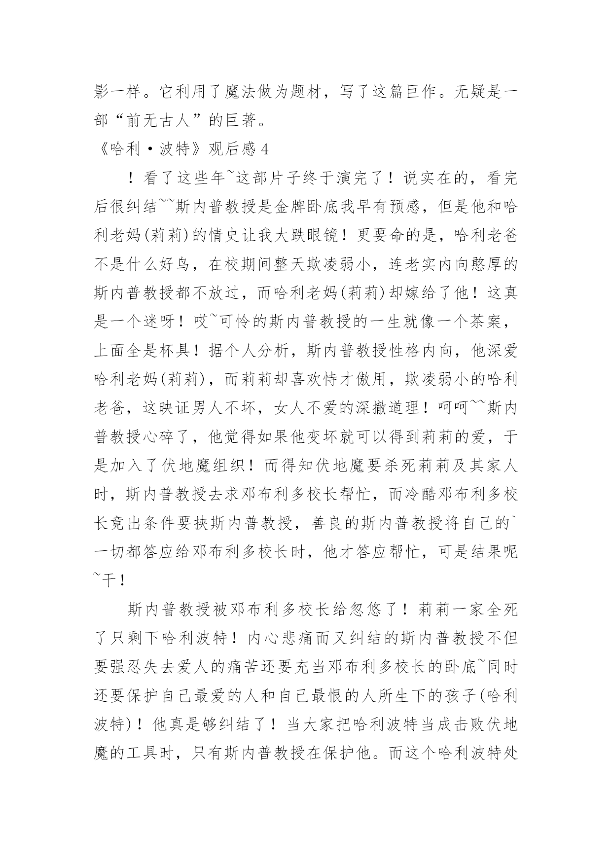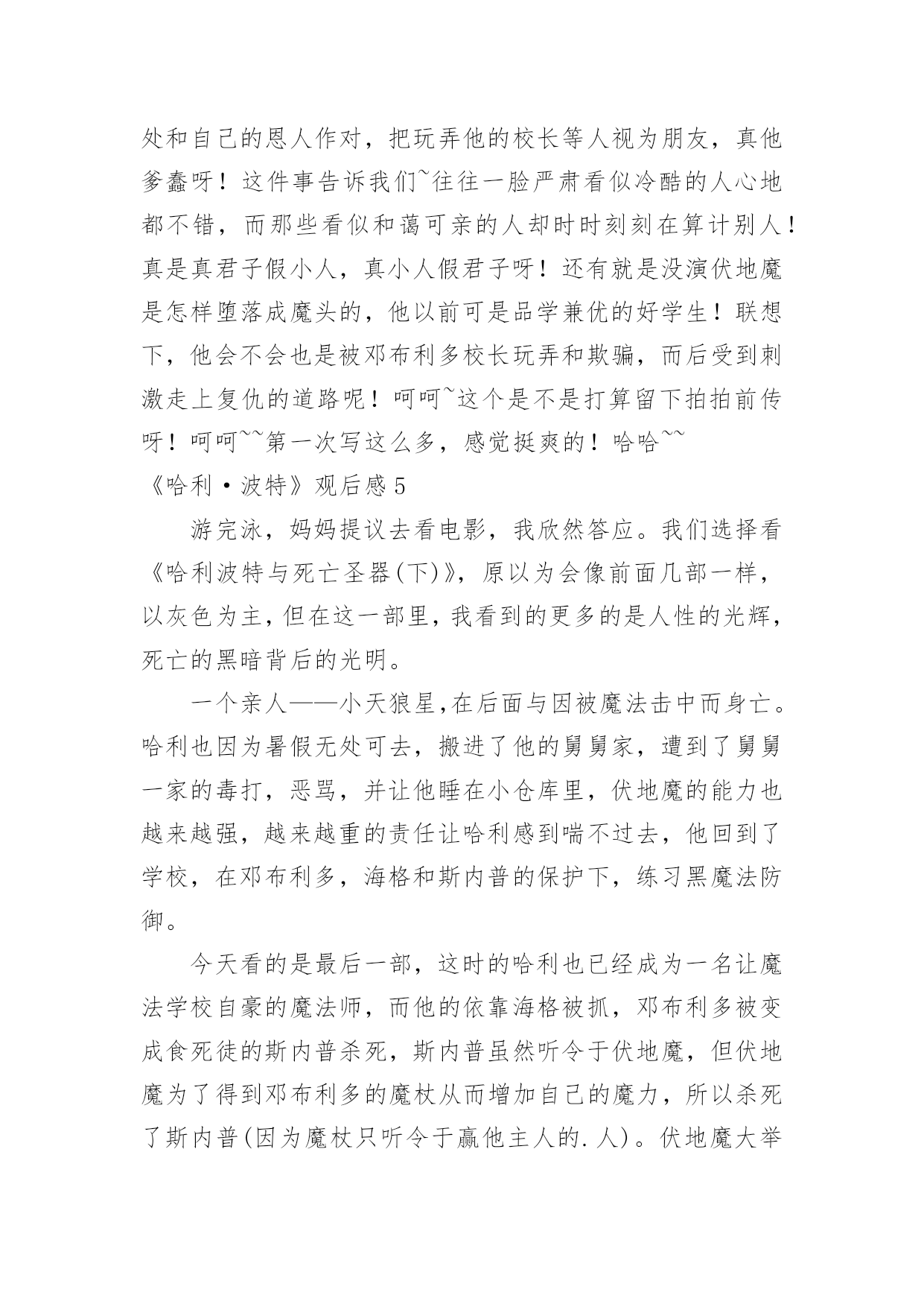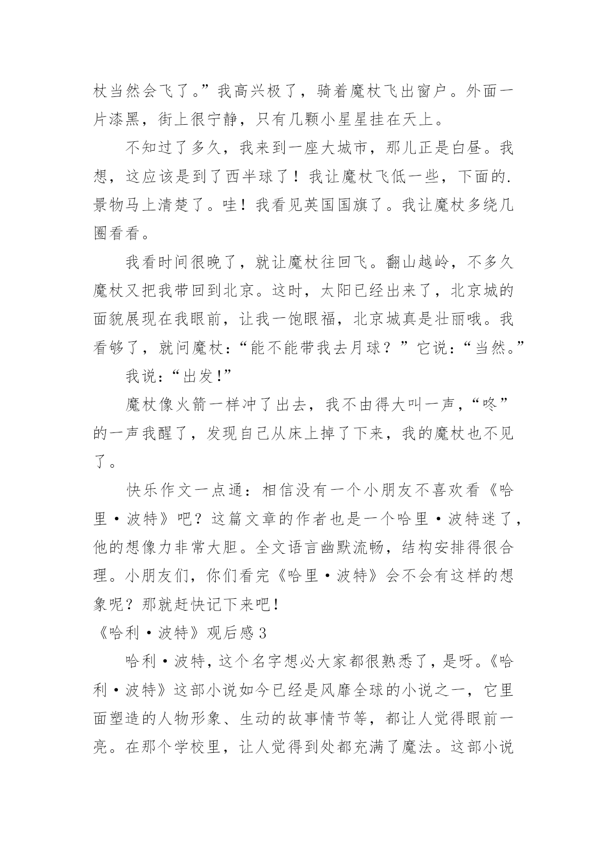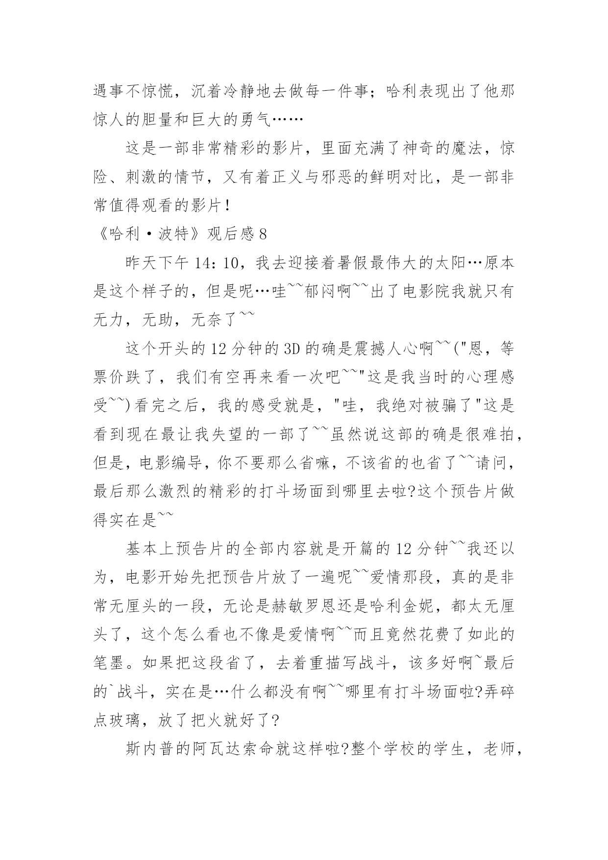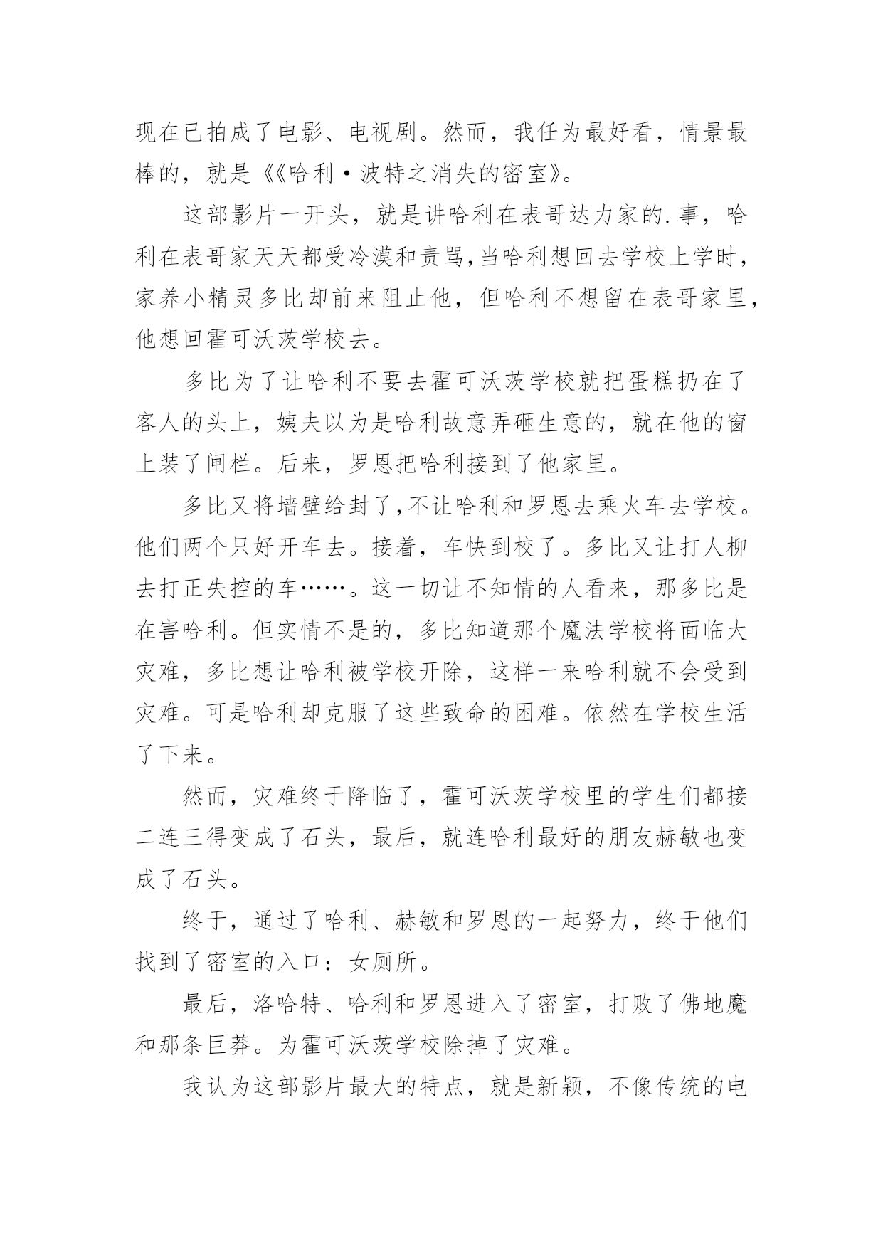 《哈利·波特》观后感《哈利·波特》观后感当认真看完一部影视作品后,想必你有不少可以分享的东西,这时候十分有必须要写一篇观后感了!那要怎么写好观后感呢?以下是小编整理的《哈利·波特》观后感,仅供参考,希望能够帮助到大家。《哈利·波特》观后感1这是一部关于魔法世界的电影。故事曲折,神奇,非常之精彩,让我一开始就被深深感动了。还有四天,哈利就要迎来自己十七岁的生日,成为一名真正的魔法师。为了不让哈利遭到伏地魔的袭击,凤凰社的成员精心策划了秘密转移哈利的计划,然而,可怕的意外还是发生了。与此同时,卷土重来的伏地魔已经占领了霍格沃茨和魔法部,控制了半个魔法世界。哈利在好朋友罗恩,赫敏的陪伴下逃亡在外,他意外得知,如果能拥有传说中的三件死亡圣器,伏地魔将必死无疑。一次偶然的遭遇,哈利倒在伏地魔的圣器之下,然而,伏地魔未能如愿以偿。最终,哈利凭借勇敢和智慧取得了胜利。这是一部上座率极高的影片,场面炫目,特技甚好,故事中到处充满着超神奇的魔法力量,猫头鹰可以成为他们的信差,飞天扫帚是交通工具,画像中的人是活的,会眨眼,会微笑,还会串门子哩……所有的一切真的都是那么神奇。在影片中,杀人不眨眼的伏地魔一心想霸占整个魔法界,他这个痴心妄想的人最终是要被正义给打倒的,尤其是当我看到伏地魔死的那一刻,我很是开心。因为伏地魔死了,一切都太平了。在这部影片中,我最佩服的还是哈利·波特和他的朋友们面对恶势力时的勇敢,他们始终都是相信自己,勇敢的面对困难,每当他们遇到惊险时,我都会被他们那坚定的'信念所感动。同时也为他们那神奇的经历捏一把汗。在日常生活和学习中,我们常常会被大大小小各种各样的困难所吓倒,面对困难,许多人望而却步。想一想,那些困难我们真的战胜不了吗?其实我们平时遇到的困难根本不算什么困难,只要我们不被困难的狰狞嘴脸所吓倒,勇敢的去面对,努力地去拼搏,最终一定会战胜它。这就是我对《哈利·波特》这部电影的看法。《哈利·波特》观后感2看了电影《哈利·波特与密室》后,我总梦想着有个飞天扫帚,那样我就可以周游整个世界了。有一天晚上,我做了一个梦,梦见哈利·波特送给我一根和他那把一模一样的飞天扫帚。一开始我以为这不过是一场梦罢了,至于魔杖,一定是妈妈新买的拖布,忘在了这里。没想到,扫帚说话了:“主人,你好!我是您的魔杖,现在我带您去环游世界吧。”我一听,很吃惊,问它:“你会飞吗?”它说:“我是魔杖当然会飞了。”我高兴极了,骑着魔杖飞出窗户。外面一片漆黑,街上很宁静,只有几颗小星星挂在天上。不知过了多久,我来到一座大城市,那儿正是白昼。我想,这应该是到了西半球了!我让魔杖飞低一些,下面的.景物马上清楚了。哇!我看见英国国旗了。我让魔杖多绕几圈看看。我看时间很晚了,就让魔杖往回飞。翻山越岭,不多久魔杖又把我带回到北京。这时,太阳已经出来了,北京城的面貌展现在我眼前,让我一饱眼福,北京城真是壮丽哦。我看够了,就问魔杖:“能不能带我去月球?”它说:“当然。”我说:“出发!”魔杖像火箭一样冲了出去,我不由得大叫一声,“咚”的一声我醒了,发现自己从床上掉了下来,我的魔杖也不见了。快乐作文一点通:相信没有一个小朋友不喜欢看《哈里·波特》吧?这篇文章的作者也是一个哈里·波特迷了,他的想像力非常大胆。全文语言幽默流畅,结构安排得很合理。小朋友们,你们看完《哈里·波特》会不会有这样的想象呢?那就赶快记下来吧!《哈利·波特》观后感3哈利·波特,这个名字想必大家都很熟悉了,是呀。《哈利·波特》这部小说如今已经是风靡全球的小说之一,它里面塑造的人物形象、生动的故事情节等,都让人觉得眼前一亮。在那个学校里,让人觉得到处都充满了魔法。这部小说现在已拍成了电影、电视剧。然而,我任为最好看,情景最棒的,就是《《哈利·波特之消失的密室》。这部影片一开头,就是讲哈利在表哥达力家的.事,哈利在表哥家天天都受冷漠和责骂,当哈利想回去学校上学时,家养小精灵多比却前来阻止他,但哈利不想留在表哥家里,他想回霍可沃茨学校去。多比为了让哈利不要去霍可沃茨学校就把蛋糕扔在了客人的头上,姨夫以为是哈利故意弄砸生意的,就在他的窗上装了闸栏。后来,罗恩把哈利接到了他家里。多比又将墙壁给封了,不让哈利和罗恩去乘火车去学校。他们两个只好开车去。接着,车快到校了。多比又让打人柳去打正失控的车……。这一切让不知情的人看来,那多比是在害哈利。但实情不是的,多比知道那个魔法学校将面临大灾难,多比想让哈利被学校开除,这样一来哈利就不会受到灾难。可是哈利却克服了这些致命的困难。依然在学校生活了下来。然而,灾难终于降临了,霍可沃茨学校里的学生们都接二连三得变成了石头,最后,就连哈利最好的朋友赫敏也变成了石头。终于,通过了哈利、赫敏和罗恩的一起努力,终于他们找到了密室的入口:女厕所。最后,洛哈特、哈利和罗恩进入了密室,打败了佛地魔和
