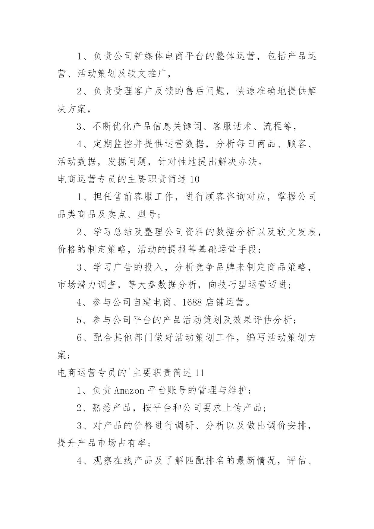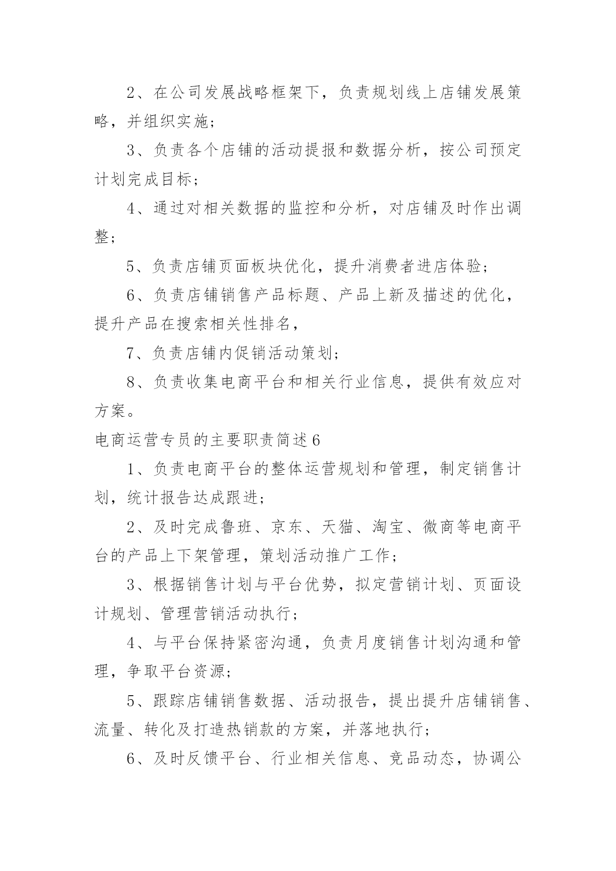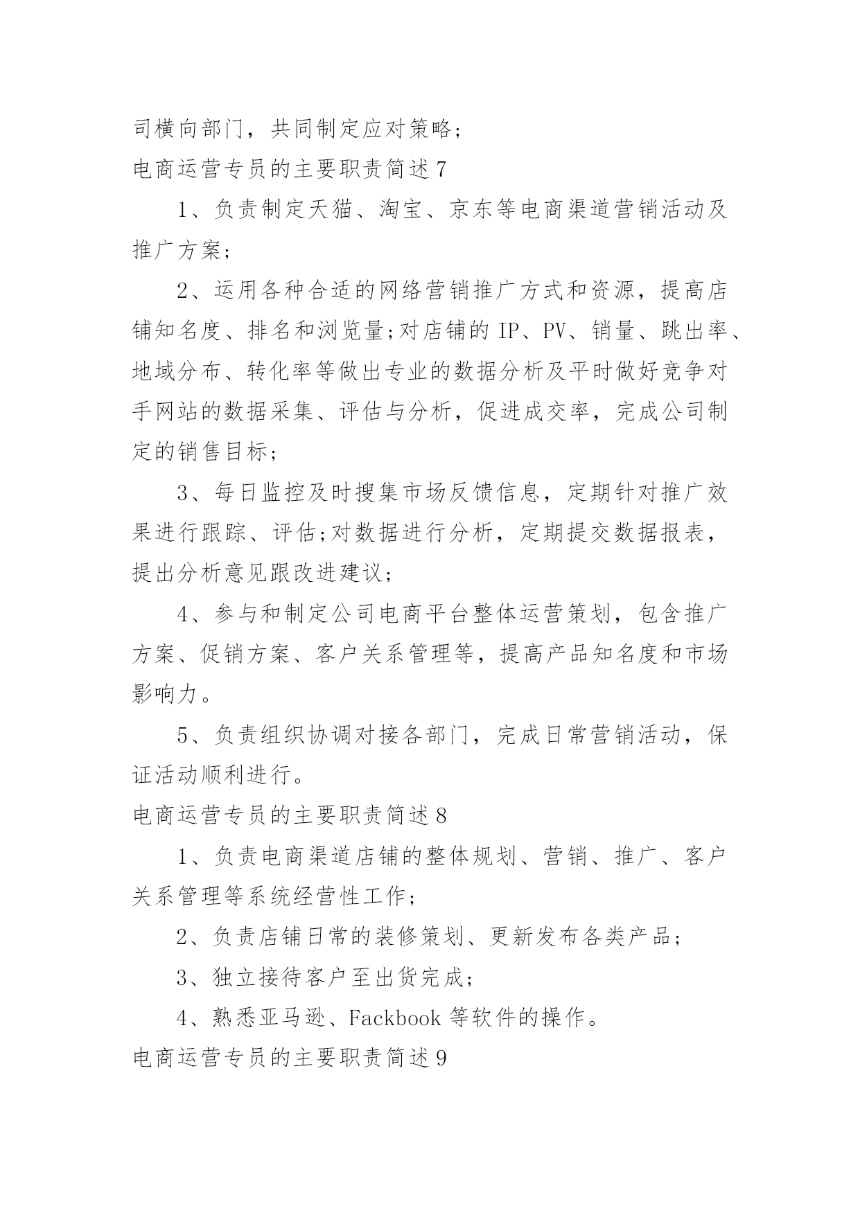 电商运营专员的主要职责简述电商运营专员的主要职责简述11、负责淘宝电商平台、集团官网的日常运营与设计美工对接,对电商平台内的功能、用户体验、页面设置进行优化。2、配合领导完成月度和季度销量,以及月目标分解。3、协助运营及主管进行店铺整体运作。4、店铺以产品线上推广计划及执行负责店铺活动和数据分析,定期进行营销数据分析、竞品分析,发掘隐含内在问题,有针对性的提出解决办法。电商运营专员的主要职责简述21.负责京东/天猫平台店铺运营、营销活动策划及报名、协调相应内外资源、执行活动方案,保证网店的正常运作;2.熟悉京东/天猫的各种活动策划、提报和开展。能独立组织各种节日活动、大中型活动的文案撰写、策划和执行;并针对活动效果进行总结和改进;3.能独立完成店铺策划,店铺构架,有良好的店铺设计、店铺运营、店铺推广的能力;4.能和京东/天猫对接运营进行良好的沟通,争取资源位。电商运营专员的主要职责简述31、负责淘宝京东的整体运营,熟悉平台流程及推广规则;2、负责淘宝京东店铺推广工作,能够熟练运用直通车,钻展等营销工具。能有效提高店铺的浏览量、点击率和转化率等;3、控制运营成本,扩张免费流量渠道和提升流量,安排店铺各类促销活动;4、制定推广方案并负责实施,对推广效果进行评估,对店铺及产品访问量、转化率数据进行分析;5、新品宝贝销量的破零以及提升,进行评价维护,打造爆款。6、完成领导交办的其他工作电商运营专员的主要职责简述41、电商推广平台的网站信息维护、更新、优化及统计分析等2、线上线下的客户洽谈、跟单、订单处理、发货、催款、开票等3、通过网络渠道进行客户开发和业务拓展4、妥善解决客户提出的售后支持,协助技术和客户之间的沟通5、完成上级领导交代的其它任务电商运营专员的主要职责简述51、负责公司在各电商平台的店铺资源整合及运营,优化运营战略、实施运营方案;提报活动策划、商品报名、提高UV/PV、提高店铺转化率,宝贝详情完善、对接销售推广、美工。2、在公司发展战略框架下,负责规划线上店铺发展策略,并组织实施;3、负责各个店铺的活动提报和数据分析,按公司预定计划完成目标;4、通过对相关数据的监控和分析,对店铺及时作出调整;5、负责店铺页面板块优化,提升消费者进店体验;6、负责店铺销售产品标题、产品上新及描述的优化,提升产品在搜索相关性排名,7、负责店铺内促销活动策划;8、负责收集电商平台和相关行业信息,提供有效应对方案。电商运营专员的主要职责简述61、负责电商平台的整体运营规划和管理,制定销售计划,统计报告达成跟进;2、及时完成鲁班、京东、天猫、淘宝、微商等电商平台的产品上下架管理,策划活动推广工作;3、根据销售计划与平台优势,拟定营销计划、页面设计规划、管理营销活动执行;4、与平台保持紧密沟通,负责月度销售计划沟通和管理,争取平台资源;5、跟踪店铺销售数据、活动报告,提出提升店铺销售、流量、转化及打造热销款的方案,并落地执行;6、及时反馈平台、行业相关信息、竞品动态,协调公司横向部门,共同制定应对策略;电商运营专员的主要职责简述71、负责制定天猫、淘宝、京东等电商渠道营销活动及推广方案;2、运用各种合适的网络营销推广方式和资源,提高店铺知名度、排名和浏览量;对店铺的IP、PV、销量、跳出率、地域分布、转化率等做出专业的数据分析及平时做好竞争对手网站的数据采集、评估与分析,促进成交率,完成公司制定的销售目标;3、每日监控及时搜集市场反馈信息,定期针对推广效果进行跟踪、评估;对数据进行分析,定期提交数据报表,提出分析意见跟改进建议;4、参与和制定公司电商平台整体运营策划,包含推广方案、促销方案、客户关系管理等,提高产品知名度和市场影响力。5、负责组织协调对接各部门,完成日常营销活动,保证活动顺利进行。电商运营专员的主要职责简述81、负责电商渠道店铺的整体规划、营销、推广、客户关系管理等系统经营性工作;2、负责店铺日常的装修策划、更新发布各类产品;3、独立接待客户至出货完成;4、熟悉亚马逊、Fackbook等软件的操作。电商运营专员的主要职责简述91、负责公司新媒体电商平台的整体运营,包括产品运营、活动策划及软文推广,2、负责受理客户反馈的售后问题,快速准确地提供解决方案,3、不断优化产品信息关键词、客服话术、流程等,4、定期监控并提供运营数据,分析每日商品、顾客、活动数据,发掘问题,针对性地提出解决办法。电商运营专员的主要职责简述101、担任售前客服工作,进行顾客咨询对应,掌握公司品类商品及卖点、型号;2、学习总结及整理公司资料的数据分析以及软文发表,价格的制定策略,活动的提报等基础运营手段;3、学习广告的投入,分析竞争品牌来制定商品策略,市场潜力调查,等大盘数据分析,向技巧型运营迈进;4、参与公司自建电商、1688店铺运营。5、参与公司平台的产品