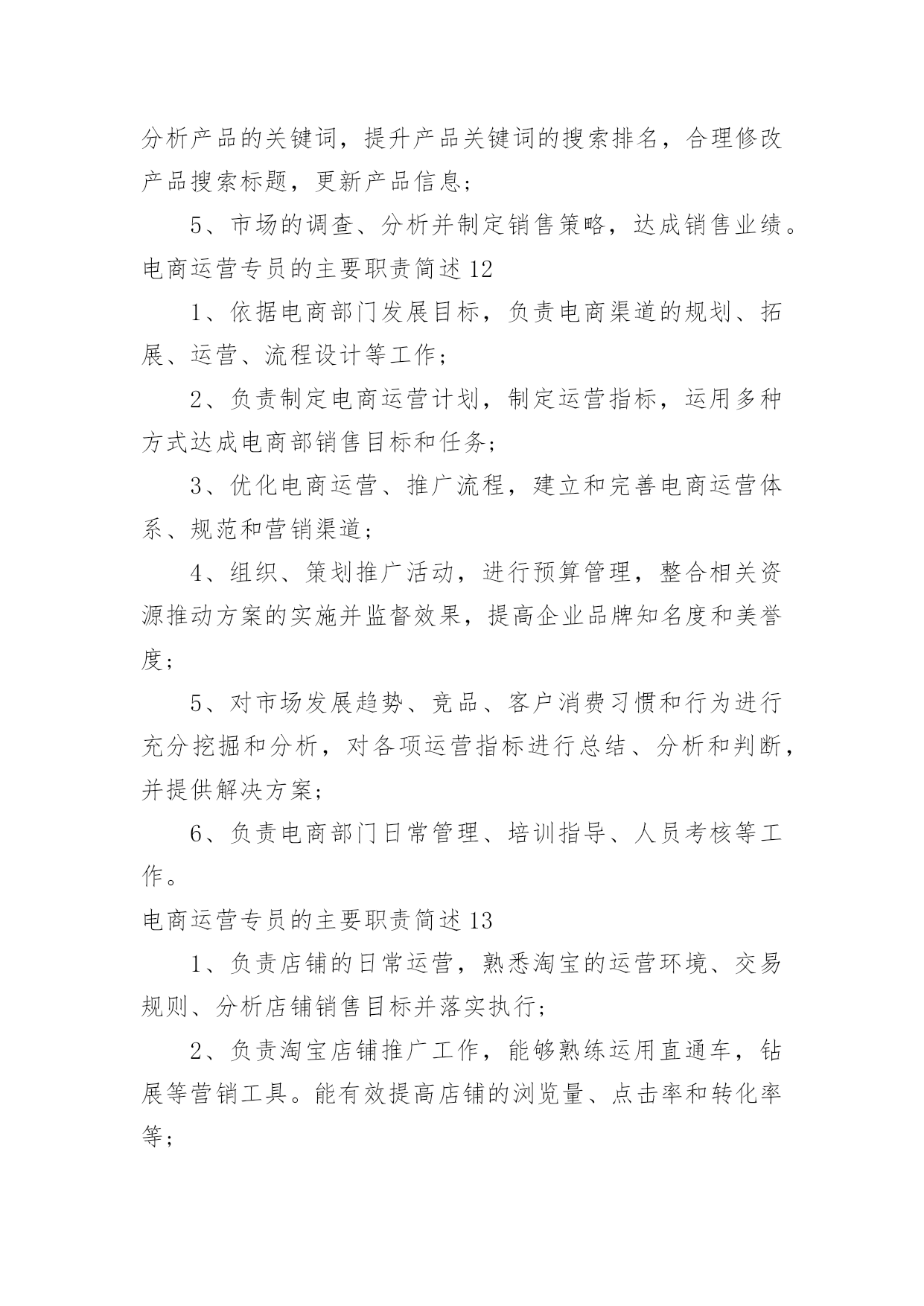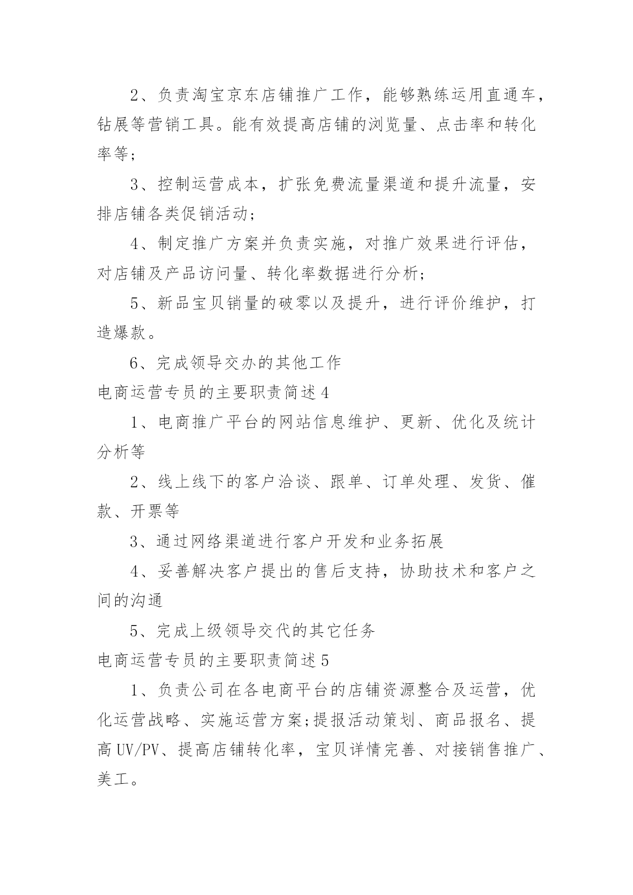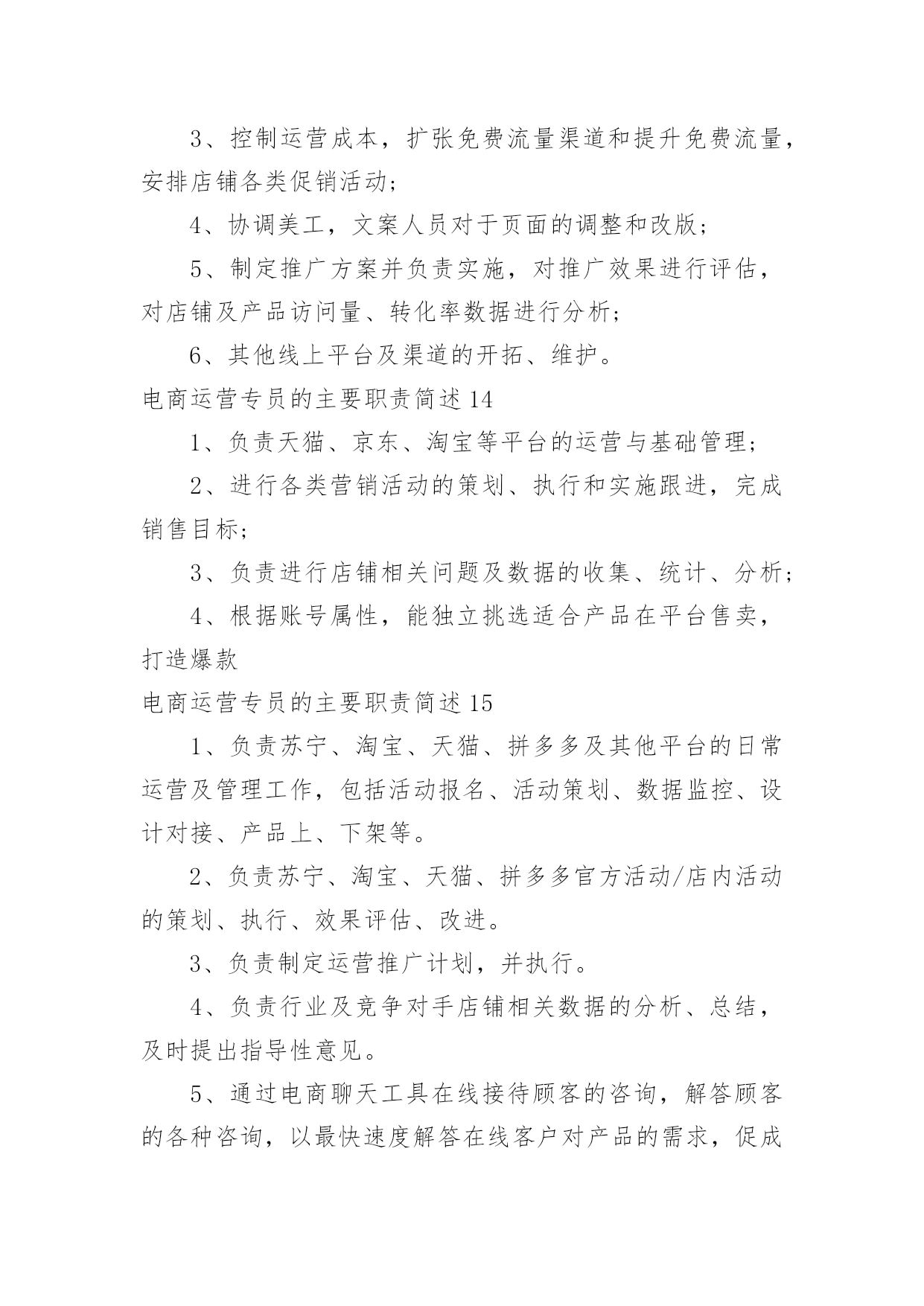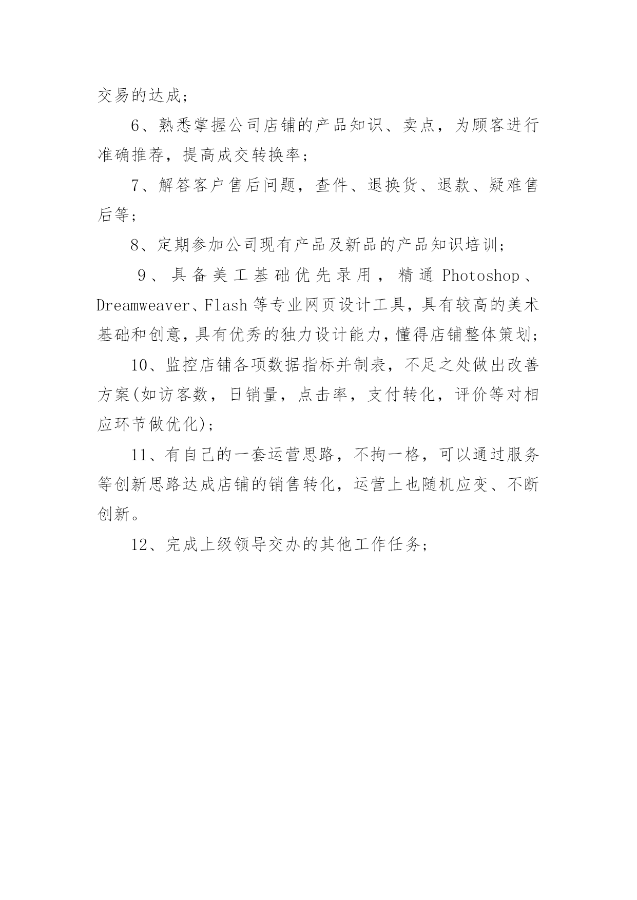 电商运营专员的主要职责简述电商运营专员的主要职责简述11、负责淘宝电商平台、集团官网的日常运营与设计美工对接,对电商平台内的功能、用户体验、页面设置进行优化。2、配合领导完成月度和季度销量,以及月目标分解。3、协助运营及主管进行店铺整体运作。4、店铺以产品线上推广计划及执行负责店铺活动和数据分析,定期进行营销数据分析、竞品分析,发掘隐含内在问题,有针对性的提出解决办法。电商运营专员的主要职责简述21.负责京东/天猫平台店铺运营、营销活动策划及报名、协调相应内外资源、执行活动方案,保证网店的正常运作;2.熟悉京东/天猫的各种活动策划、提报和开展。能独立组织各种节日活动、大中型活动的文案撰写、策划和执行;并针对活动效果进行总结和改进;3.能独立完成店铺策划,店铺构架,有良好的店铺设计、店铺运营、店铺推广的能力;4.能和京东/天猫对接运营进行良好的沟通,争取资源位。电商运营专员的主要职责简述31、负责淘宝京东的整体运营,熟悉平台流程及推广规则;2、负责淘宝京东店铺推广工作,能够熟练运用直通车,钻展等营销工具。能有效提高店铺的浏览量、点击率和转化率等;3、控制运营成本,扩张免费流量渠道和提升流量,安排店铺各类促销活动;4、制定推广方案并负责实施,对推广效果进行评估,对店铺及产品访问量、转化率数据进行分析;5、新品宝贝销量的破零以及提升,进行评价维护,打造爆款。6、完成领导交办的其他工作电商运营专员的主要职责简述41、电商推广平台的网站信息维护、更新、优化及统计分析等2、线上线下的客户洽谈、跟单、订单处理、发货、催款、开票等3、通过网络渠道进行客户开发和业务拓展4、妥善解决客户提出的售后支持,协助技术和客户之间的沟通5、完成上级领导交代的其它任务电商运营专员的主要职责简述51、负责公司在各电商平台的店铺资源整合及运营,优化运营战略、实施运营方案;提报活动策划、商品报名、提高UV/PV、提高店铺转化率,宝贝详情完善、对接销售推广、美工。2、在公司发展战略框架下,负责规划线上店铺发展策略,并组织实施;3、负责各个店铺的活动提报和数据分析,按公司预定计划完成目标;4、通过对相关数据的监控和分析,对店铺及时作出调整;5、负责店铺页面板块优化,提升消费者进店体验;6、负责店铺销售产品标题、产品上新及描述的优化,提升产品在搜索相关性排名,7、负责店铺内促销活动策划;8、负责收集电商平台和相关行业信息,提供有效应对方案。电商运营专员的主要职责简述61、负责电商平台的整体运营规划和管理,制定销售计划,统计报告达成跟进;2、及时完成鲁班、京东、天猫、淘宝、微商等电商平台的产品上下架管理,策划活动推广工作;3、根据销售计划与平台优势,拟定营销计划、页面设计规划、管理营销活动执行;4、与平台保持紧密沟通,负责月度销售计划沟通和管理,争取平台资源;5、跟踪店铺销售数据、活动报告,提出提升店铺销售、流量、转化及打造热销款的方案,并落地执行;6、及时反馈平台、行业相关信息、竞品动态,协调公司横向部门,共同制定应对策略;电商运营专员的主要职责简述71、负责制定天猫、淘宝、京东等电商渠道营销活动及推广方案;2、运用各种合适的网络营销推广方式和资源,提高店铺知名度、排名和浏览量;对店铺的IP、PV、销量、跳出率、地域分布、转化率等做出专业的数据分析及平时做好竞争对手网站的数据采集、评估与分析,促进成交率,完成公司制定的销售目标;3、每日监控及时搜集市场反馈信息,定期针对推广效果进行跟踪、评估;对数据进行分析,定期提交数据报表,提出分析意见跟改进建议;4、参与和制定公司电商平台整体运营策划,包含推广方案、促销方案、客户关系管理等,提高产品知名度和市场影响力。5、负责组织协调对接各部门,完成日常营销活动,保证活动顺利进行。电商运营专员的主要职责简述81、负责电商渠道店铺的整体规划、营销、推广、客户关系管理等系统经营性工作;2、负责店铺日常的装修策划、更新发布各类产品;3、独立接待客户至出货完成;4、熟悉亚马逊、Fackbook等软件的操作。电商运营专员的主要职责简述91、负责公司新媒体电商平台的整体运营,包括产品运营、活动策划及软文推广,2、负责受理客户反馈的售后问题,快速准确地提供解决方案,3、不断优化产品信息关键词、客服话术、流程等,4、定期监控并提供运营数据,分析每日商品、顾客、活动数据,发掘问题,针对性地提出解决办法。电商运营专员的主要职责简述101、担任售前客服工作,进行顾客咨询对应,掌握公司品类商品及卖点、型号;2、学习总结及整理公司资料的数据分析以及软文发表,价格的制定策略,活动的提报等基础运营手段;3、学习广告的投入,分析竞争品牌来制定商品策略,市场潜力调查,等大盘数据分析,向技巧型运营迈进;4、参与公司自建电商、1688店铺运营。5、参与公司平台的产品