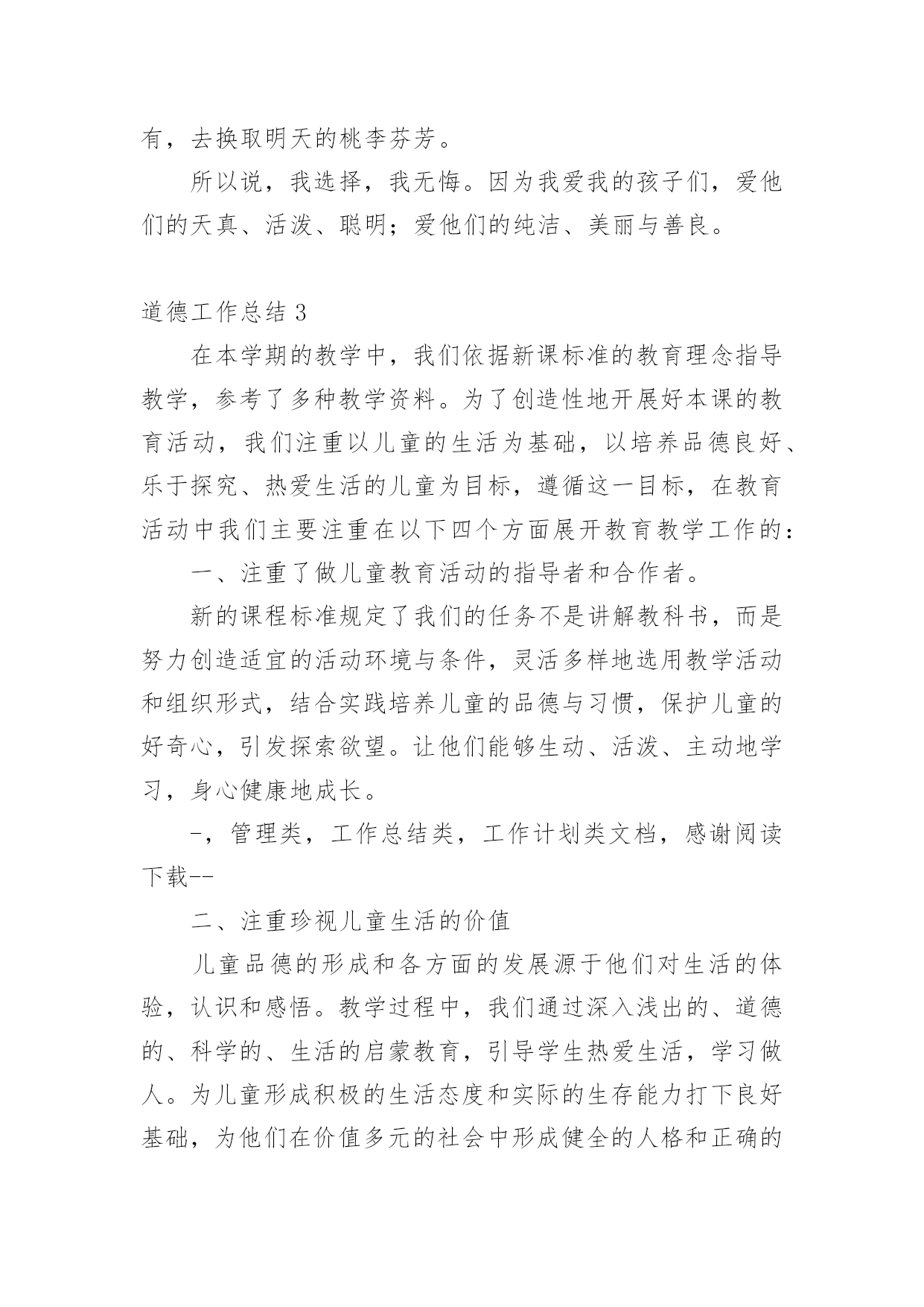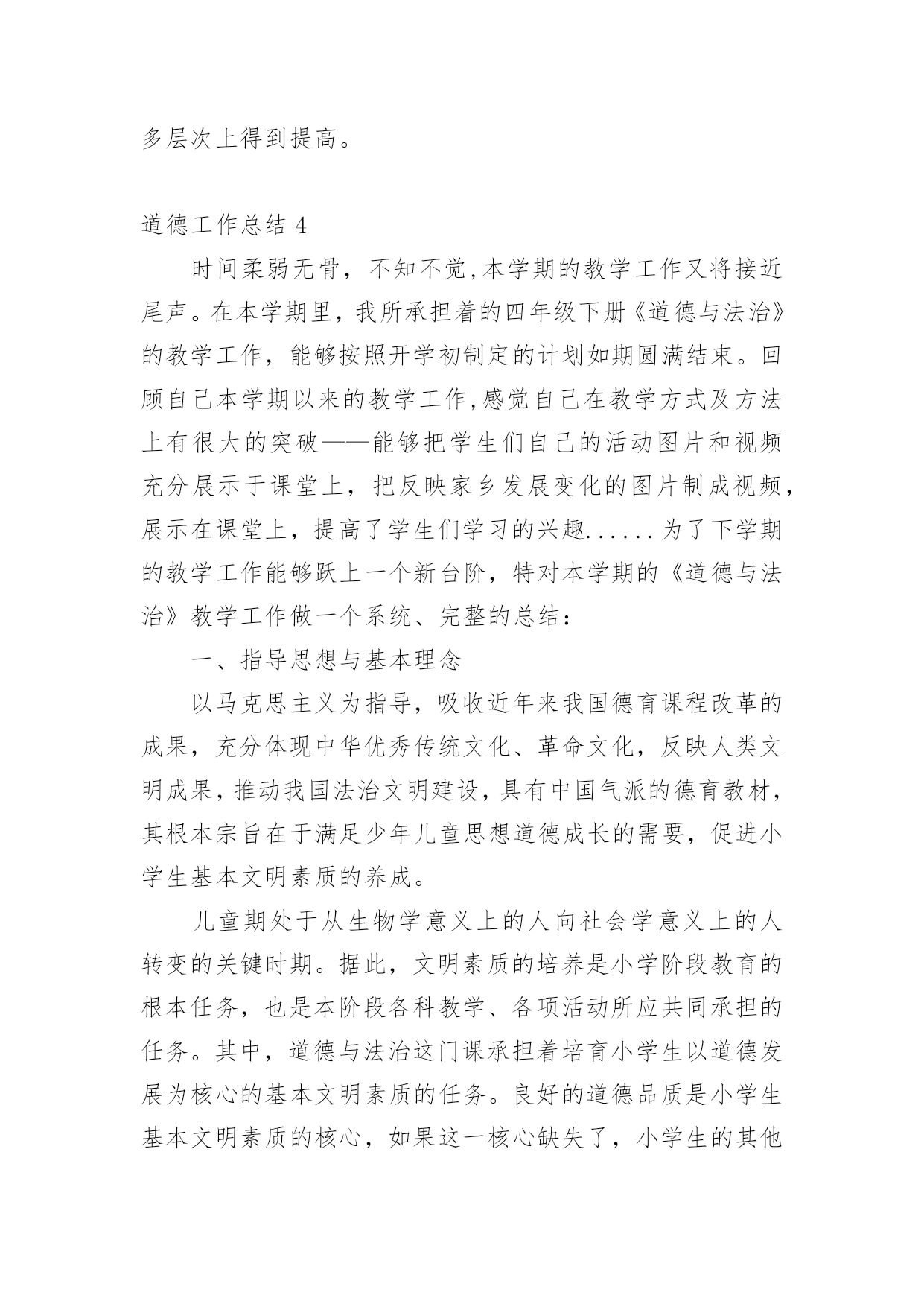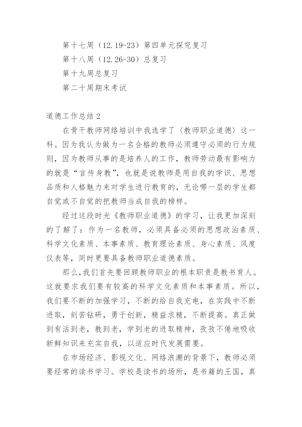 道德工作总结总结是在某一时期、某一项目或某些工作告一段落或者全部完成后进行回顾检查、分析评价,从而得出教训和一些规律性认识的一种书面材料,它可以明确下一步的工作方向,少走弯路,少犯错误,提高工作效益,因此我们需要回头归纳,写一份总结了。总结怎么写才不会流于形式呢?以下是小编整理的道德工作总结,欢迎大家分享。道德工作总结1本学期根据学校工作安排,本人承担七年级的思想品德课教学工作,为完成新学期的教学任务,现将本学期思想品德教育课的教育教学工作安排如下:一、教学目标:课程标准明确规定:“道德与法治课是一门综合课程,教材体现了综合性、过程性、实践性特点。”据此,以初中学生生活经验为依据,以青春生命在与他人、与集体、与社会、与国家以及全球关系中的自我发展为线索,以培养社会主义合格公民为中心,遵循生活逻辑,整合道德、心理、法律及国情方面的知识领域,凝练三年六册教材各个单元的学习主题,统筹安排各年级教育。二、教材分析:第一单元:第一单元作为对初中生活开端的理性阐述,具有统领全套教材的意义,既是学生整个初中道德与法治课程的学习起点,也是全套教材建构的逻辑起点。对于刚刚步入中学校门的学生而言,中学时代是一个全新的人生阶段的开始。面对生活和学习的变化,学生会有各种感受,也可能有各种困惑和问题。教材不是让学生被动去适应这些变化,而是把变化看成是生命成长馈赠给自己的礼物,认识到新的阶段意味着新的机会和可能,接纳变化,在积极面对中学学习、自我探索等课题中中成长。本单元以“成长的节拍”为主题,体现了学生初中生活的'基调,映射出全套教材的青春文化底色。第二单元:学会交往,处理交友中的问题既是学生道德和心理发展在本阶段的核心任务,也是初中生活逐步展开后学生实际的需要,在学生生命成长中具在重要的意义。20xx年2月,《中国学生发展核心素养(征求意见稿)》出台,“积极交往,有效互动,建立和维持良好的人际关系”被作为中国学生发展应具备的核心素养提出。青少年期的同伴关系,不仅活动范围进一步扩大,朋友之间亲密感也进一步增加。这一方面提高了中学生友谊的质量,另一方面,也对学生的交友态度和能力提出了更高的要求。第三单元:过富有情趣的生活。承接上一单元学会与同伴交往,本单元则是帮助学生正确处理师生关系、亲子关系和家庭关系,是人际交往的继续与延伸。师长是中学生成长中的“重要他人”,学生和师长的关系如何,直接影响到学习和生活质量。到了青春期以后,随着青少年自我意识的凸显,他们要求摆脱依赖、走向独立的愿望和行动增强,有时会和师长产生冲突。教材不回避青少年成长可能带来的各种冲突与矛盾,在尊重学生的独立愿望、成长需要的基础上,引导他们走近师长,看到冲突背后“爱”的流动,通过主动对话和交流达成相互理解。第四单元:过健康、安全的生活。本单元内容在七上教材体系中居于核心地位,既是本册书前三个单元的价值升华,也为学生一生的健康成长打好生命的底色。虽然课程设置上只是作为一个单元内容来呈现,但对生命教育的关切贯穿整套教材始终。三、教学措施1、不断学习,提升自我,超越自我,丰富自身知识,与时俱进,以适应思想品德的教学。2、根据学生的实际情况创设与之适应的教学方案,备好每一节课。3、多样化教学,强调学生的主动积极参与,更多地进行讨论、分析、探究活动和主题班会等形式的教学,提高学生的学习兴趣,达到一定的效果。4、教学中多举与学生生活贴近的实例,鼓励和引导学生从自身学习生活中发现问题,分析问题,解决问题,注重学生能力的培养。5、上课过程中通过日常生活中的例子引导学生更好地掌握该课内容。鼓励学生大胆发言,结合自身实际发表观点。6、结合课文内容布置相应的练习、作业并要求学生按时完成,独立完成。四、《道德与法治》进度表周次教学内容第一周(9.1-2)第一课中学序曲第二周(9.5-9)第一课少年有梦第二课学习伴成长第三周(9.12-16)第三课认识自己第三课做更好的自己第二课享受学习第四周(9.19-23)第一单元探究复习第五周(9.26-30)深深浅浅话友谊第四课和朋友在一起;第六周(10.1-7)国庆节第七周(10.10-14)第五课让友谊之树常青;网上交友新时空第八周(10.17-21)第二单元探究复习第九周(10.24-28)第一二单元复习第十周(10.31-11.4)期中考试第十一周(11.7-11)第六课走进老师师生交往第十二周(11.14-18)第七课家的意味爱在家人间第十三周(11.21-25)第七课让家更美好第三单元探究复习第十四周(11.28-12.2)第八课生命可以永恒吗第八课敬畏生命第十五周(12.5-9)第九课守护生命第九课增强生命的韧性第十六周(12.12-16)第十课感受生命的意义活出生命的精彩第十七周(12.19-23)第四单元探究复习第十八周(12.26-30)总复习第十