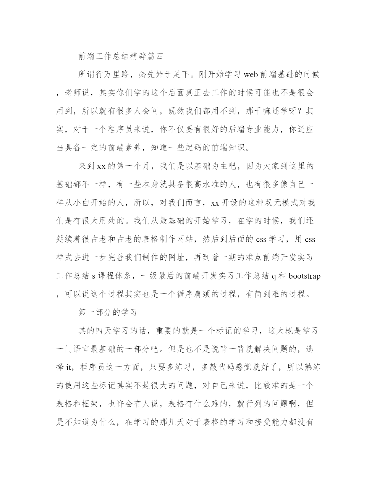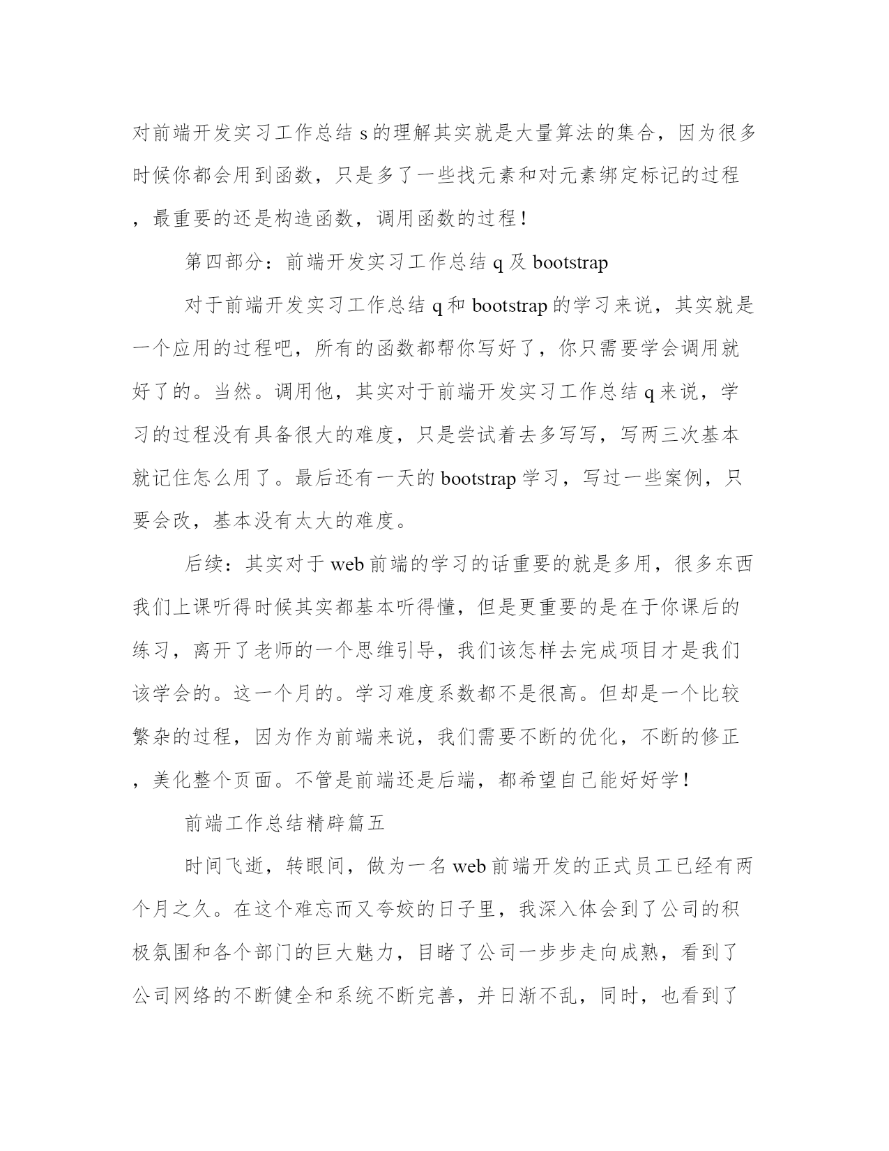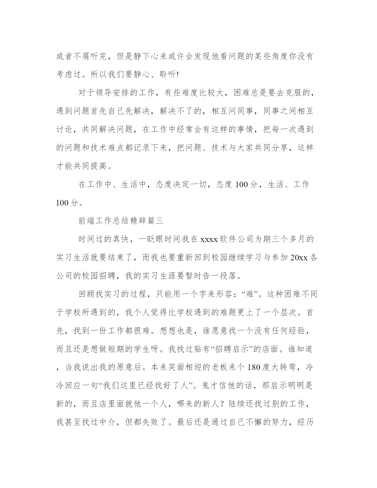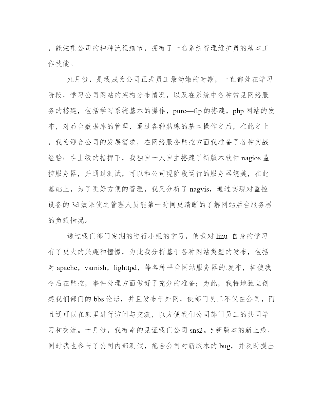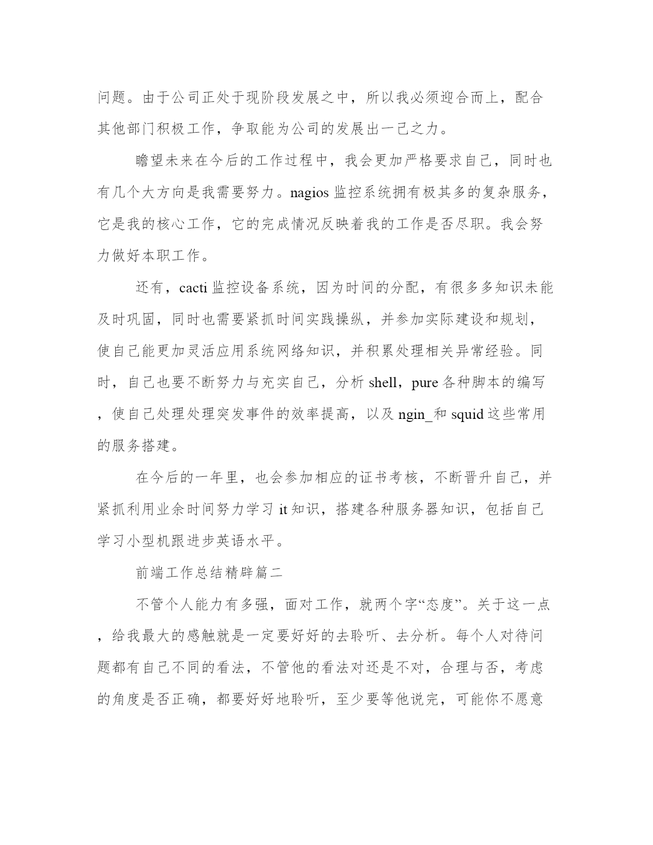 最新前端工作总结精辟前端工作总结(优秀10篇)总结是对前段社会实践活动进行全面回顾、检查的文种,这决定了总结有很强的客观性特征。那么我们该如何写一篇较为完美的总结呢?以下是小编收集整理的工作总结书范文,仅供参考,希望能够帮助到大家。前端工作总结精辟篇一时间飞逝,转眼间,作为一名web前端开发的正式员工已经有两个月之久。在这个难忘而又夸姣的日子里,我深入体会到了公司的积极氛围和各个部门的巨大魅力,目睹了公司一步步走向成熟,看到了公司网络的不断健全和系统不断完善,并日渐不乱,同时,也看到了运维中心给于系统管理职员带下世人向往的学习的平台和和无穷的机遇与挑战,所以,我在此对于过去的工作做下总结。在运维中心工作期间,我工作认真,具有较强的责任心和进取心,极富工作热情,确实完成上级交付的工作,善于与他人沟通,和公司部门同事之间能够通力合作,关系相处融洽而辑穆,配合各部分负责人成功的完成各项工作,具有很强的团队合作精神。注重自己的个人发展,不断努力学习系统、网站架构知识。所以我现在已经能够纯熟维护公司的系统服务和监控网站架构,包括前段节点,源站各个站点服务的流量信息等,能及时查看并报警所引起的网络服务相关故障,能注重公司的种种流程细节,拥有了一名系统管理维护员的基本工作技能。九月份,是我成为公司正式员工最幼嫩的时期,一直都处在学习阶段,学习公司网站的架构分布情况,以及在系统中各种常见网络服务的搭建,包括学习系统基本的操作,pure—ftp的搭建,php网站的发布,对后台数据库的管理,通过各种熟练的基本操作之后,在此之上,我为迎合公司的发展需求,在网络服务监控方面我准备了各种实战经验;在上级的指挥下,我独自一人自主搭建了新版本软件nagios监控服务器,并通过测试,可以和公司现阶段运行的服务器媲美,在此基础上,为了更好方便的管理,我又分析了nagvis,通过实现对监控设备的3d效果使之管理人员能第一时间更清晰的了解网站后台服务器的负载情况。通过我们部门定期的进行小组的学习,使我对linu_自身的学习有了更大的兴趣和憧憬,为此我分析基于各种网站类型的发布,包括对apache,varnish,lighttpd,等各种平台网站服务器的.发布,样使我今后在监控,事件处理方面做好了充分的准备;为此,我特地独立创建我们部门的bbs论坛,并且发布于外网,使部门员工不仅在公司,而且还可以在家里进行访问与交流,以方便我们公司部门员工的共同学习和交流。十月份,我有幸的见证我们公司sns2。5新版本的新上线,同时我也参与了公司内部测试,配合公司对新版本的bug,并及时提出问题。由于公司正处于现阶段发展之中,所以我必须迎合而上,配合其他部门积极工作,争取能为公司的发展出一己之力。瞻望未来在今后的工作过程中,我会更加严格要求自己,同时也有几个大方向是我需要努力。nagios监控系统拥有极其多的复杂服务,它是我的核心工作,它的完成情况反映着我的工作是否尽职。我会努力做好本职工作。还有,cacti监控设备系统,因为时间的分配,有很多多知识未能及时巩固,同时也需要紧抓时间实践操纵,并参加实际建设和规划,使自己能更加灵活应用系统网络知识,并积累处理相关异常经验。同时,自己也要不断努力与充实自己,分析shell,pure各种脚本的编写,使自己处理处理突发事件的效率提高,以及ngin_和squid这些常用的服务搭建。在今后的一年里,也会参加相应的证书考核,不断晋升自己,并紧抓利用业余时间努力学习it知识,搭建各种服务器知识,包括自己学习小型机跟进步英语水平。前端工作总结精辟篇二不管个人能力有多强,面对工作,就两个字“态度”。关于这一点,给我最大的感触就是一定要好好的去聆听、去分析。每个人对待问题都有自己不同的看法,不管他的看法对还是不对,合理与否,考虑的角度是否正确,都要好好地聆听,至少要等他说完,可能你不愿意或者不屑听完,但是静下心来或许会发现他看问题的某些角度你没有考虑过。所以我们要静心、聆听!对于领导安排的工作,有些难度比较大,困难总是要去克服的,遇到问题首先自己先解决,解决不了的,相互问同事,同事之间相互讨论,共同解决问题,在工作中经常会有这样的事情,把每一次遇到的问题和技术难点都记录下来,把问题、技术与大家共同分享,这样才能共同提高。在工作中、生活中,态度决定一切,态度100分,生活、工作100分。前端工作总结精辟篇三时间过的真快,一眨眼时间我在xxxx软件公司为期三个多月的实习生活就要结束了,而我也要重新回到校园继续学习与参加20xx各公司的校园招聘,我的实习生涯要暂时告一段落。回顾找实习的过程,只能用一个字来形容:“难”。这种困难不同于学校所遇到的,我个人觉得比学校遇到的难题更上了一个层次。首先,找到一份工作都很难。想想也是,谁愿
