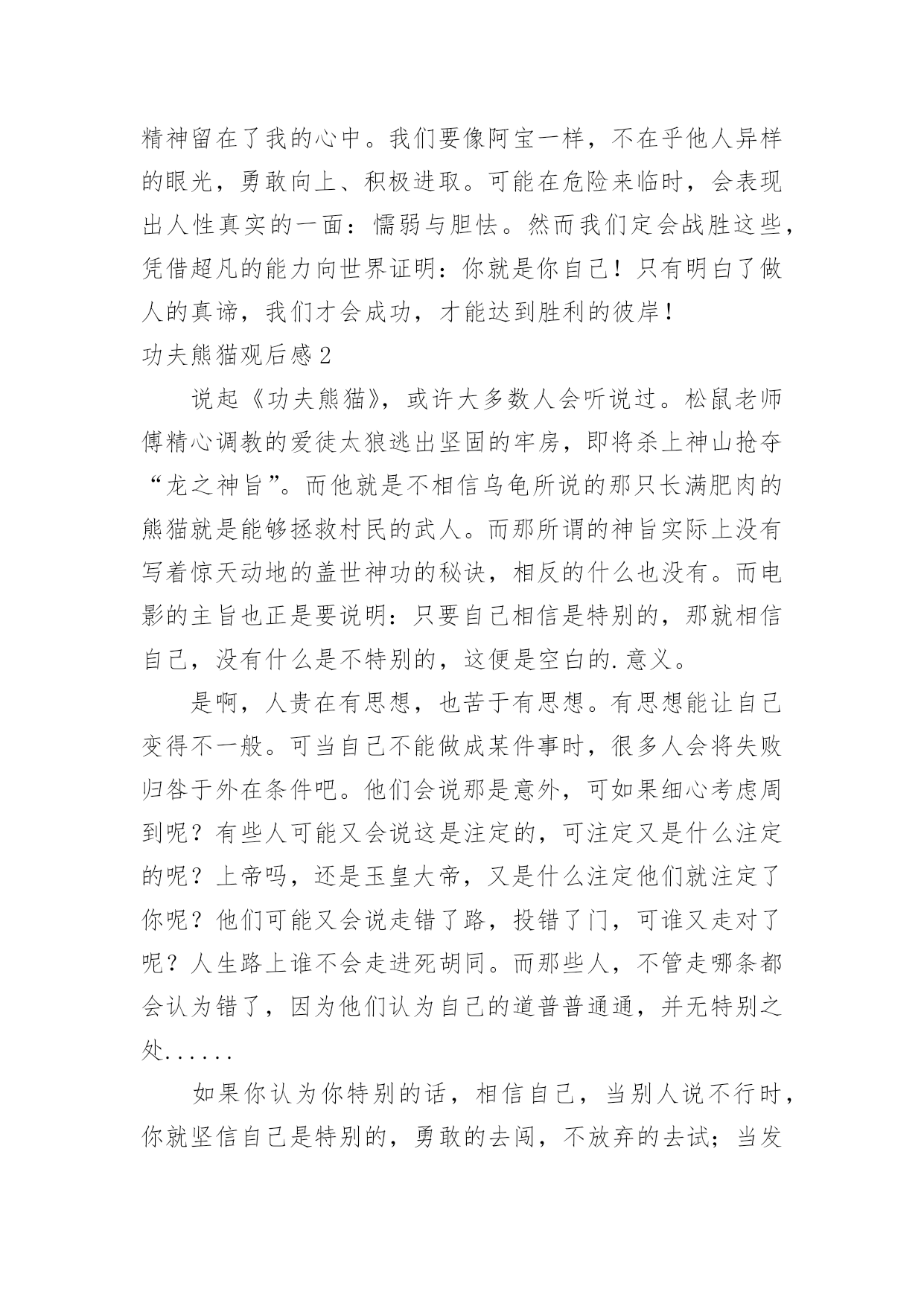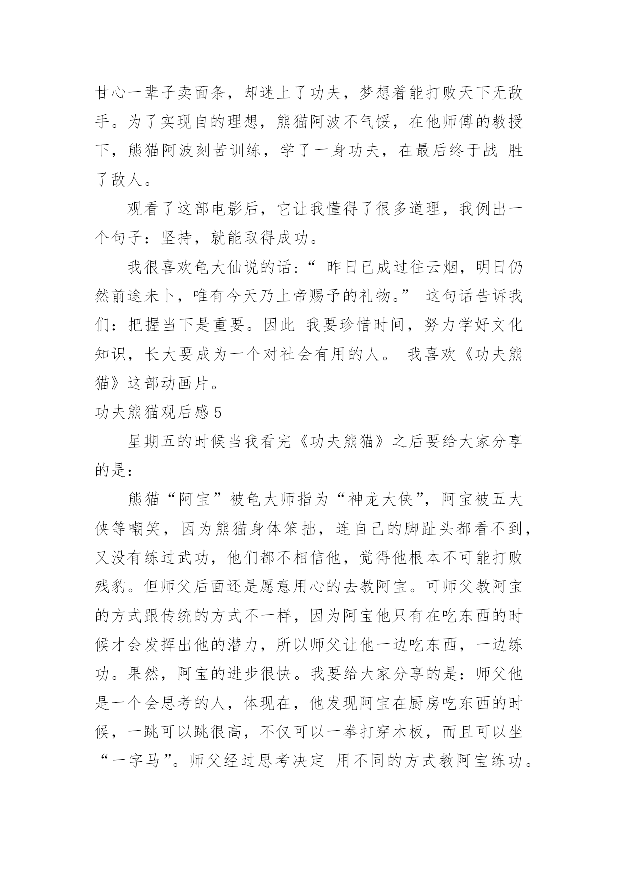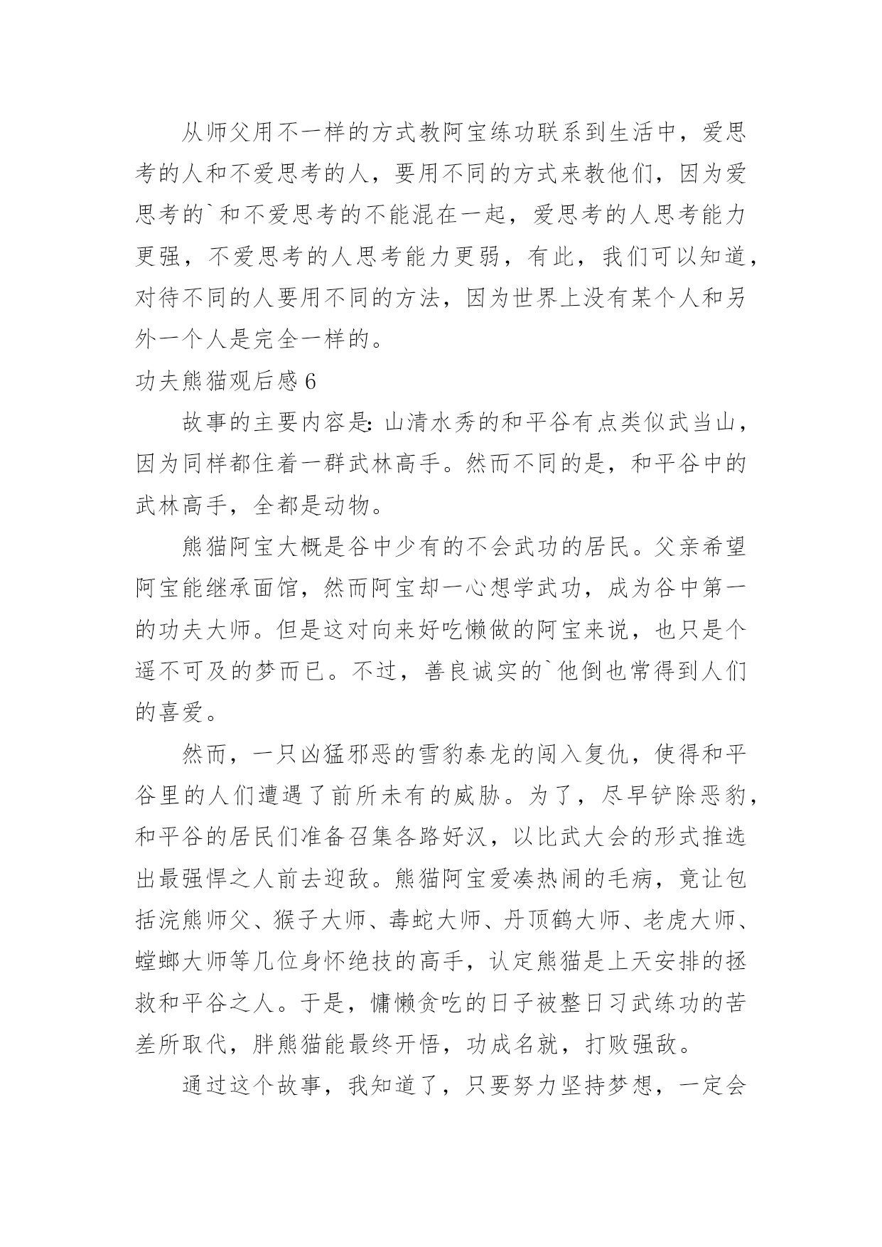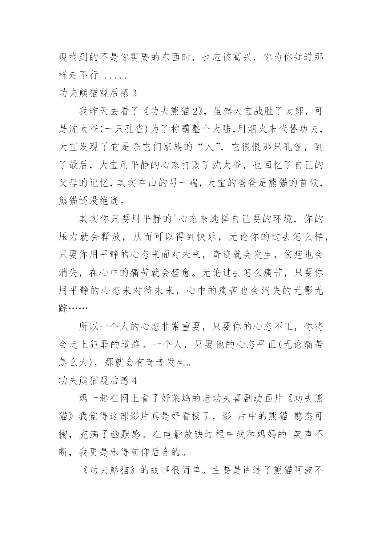 功夫熊猫观后感功夫熊猫观后感看完一部作品后,你有什么总结呢?现在就让我们写一篇走心的观后感吧。千万不能认为观后感随便应付就可以,下面是小编整理的功夫熊猫观后感,欢迎阅读与收藏。功夫熊猫观后感1周六,我看了一部电影,名叫《功夫熊猫3》,这部电影让我明白了很多的道理。在一座山上,住着浣熊、阿宝、胶虎等乌龟大师的徒子徒孙,已羽化登仙的乌龟大师选中了一个人当“神龙大侠”,他就是阿宝。阿宝在浣熊的要求下当师傅,但他无法领略那句“你就是你自己”,师傅当得一塌糊涂。阿宝的亲生父亲收到了乌龟大师的讯息,找到了自己的儿子。一个名叫“天煞”的大坏蛋出现了,他每杀死一个会武功的人,就会夺走他们的“气”,让自己变得强大无比。乌龟大师、浣熊和猴子等都未能逃出魔掌,只有气功大师才能打败“天煞”。重逢的父子二人一起来到了一片不为人知的熊猫乐土。阿宝迎难而上,把那些热衷享乐、笨手笨脚的.熊猫村民训练成一班所向披靡的功夫熊猫,他也明白了“你就是你自己”这句话所蕴含的道理!虽然电影看完了,但电影中熊猫的这种不屈不挠的奋斗精神留在了我的心中。我们要像阿宝一样,不在乎他人异样的眼光,勇敢向上、积极进取。可能在危险来临时,会表现出人性真实的一面:懦弱与胆怯。然而我们定会战胜这些,凭借超凡的能力向世界证明:你就是你自己!只有明白了做人的真谛,我们才会成功,才能达到胜利的彼岸!功夫熊猫观后感2说起《功夫熊猫》,或许大多数人会听说过。松鼠老师傅精心调教的爱徒太狼逃出坚固的牢房,即将杀上神山抢夺“龙之神旨”。而他就是不相信乌龟所说的那只长满肥肉的熊猫就是能够拯救村民的武人。而那所谓的神旨实际上没有写着惊天动地的盖世神功的秘诀,相反的什么也没有。而电影的主旨也正是要说明:只要自己相信是特别的,那就相信自己,没有什么是不特别的,这便是空白的.意义。是啊,人贵在有思想,也苦于有思想。有思想能让自己变得不一般。可当自己不能做成某件事时,很多人会将失败归咎于外在条件吧。他们会说那是意外,可如果细心考虑周到呢?有些人可能又会说这是注定的,可注定又是什么注定的呢?上帝吗,还是玉皇大帝,又是什么注定他们就注定了你呢?他们可能又会说走错了路,投错了门,可谁又走对了呢?人生路上谁不会走进死胡同。而那些人,不管走哪条都会认为错了,因为他们认为自己的道普普通通,并无特别之处......如果你认为你特别的话,相信自己,当别人说不行时,你就坚信自己是特别的,勇敢的去闯,不放弃的去试;当发现找到的不是你需要的东西时,也应该高兴,你为你知道那样走不行......功夫熊猫观后感3我昨天去看了《功夫熊猫2》,虽然大宝战胜了太郎,可是沈太爷(一只孔雀)为了称霸整个大陆,用烟火来代替功夫,大宝发现了它是杀它们家族的“人”,它很恨那只孔雀,到了最后,大宝用平静的心态打败了沈太爷,也回忆了自己的父母的记忆,其实在山的另一端,大宝的爸爸是熊猫的首领,熊猫还没绝迹。其实你只要用平静的'心态来选择自己要的环境,你的压力就会释放,从而可以得到快乐,无论你的过去怎么样,只要你用平静的心态来面对未来,奇迹就会发生,伤疤也会消失,在心中的痛苦就会痊愈。无论过去怎么痛苦,只要你用平静的心态来对待未来,心中的痛苦也会消失的无影无踪……所以一个人的心态非常重要,只要你的心态不正,你将会走上犯罪的道路。一个人,只要他的心态平正(无论痛苦怎么大),那就会有奇迹发生。功夫熊猫观后感4妈一起在网上看了好莱坞的老功夫喜剧动画片《功夫熊猫》我觉得这部影片真是好看极了,影片中的熊猫憨态可掬,充满了幽默感。在电影放映过程中我和妈妈的`笑声不断,我更是乐得前仰后合的。《功夫熊猫》的故事很简单。主要是讲述了熊猫阿波不甘心一辈子卖面条,却迷上了功夫,梦想着能打败天下无敌手。为了实现自的理想,熊猫阿波不气馁,在他师傅的教授下,熊猫阿波刻苦训练,学了一身功夫,在最后终于战胜了敌人。观看了这部电影后,它让我懂得了很多道理,我例出一个句子:坚持,就能取得成功。我很喜欢龟大仙说的话:“昨日已成过往云烟,明日仍然前途未卜,唯有今天乃上帝赐予的礼物。”这句话告诉我们:把握当下是重要。因此我要珍惜时间,努力学好文化知识,长大要成为一个对社会有用的人。我喜欢《功夫熊猫》这部动画片。功夫熊猫观后感5星期五的时候当我看完《功夫熊猫》之后要给大家分享的是:熊猫“阿宝”被龟大师指为“神龙大侠”,阿宝被五大侠等嘲笑,因为熊猫身体笨拙,连自己的脚趾头都看不到,又没有练过武功,他们都不相信他,觉得他根本不可能打败残豹。但师父后面还是愿意用心的去教阿宝。可师父教阿宝的方式跟传统的方式不一样,因为阿宝他只有在吃东西的时候才会发挥出他的潜力,所以师父让他一边吃东西,一边练功。果然,阿宝的进步很快。我要给大家分享的是:师父他是一个会思考的人,体现在,他发现阿宝在厨房吃东西的时候,一跳可以跳很高,