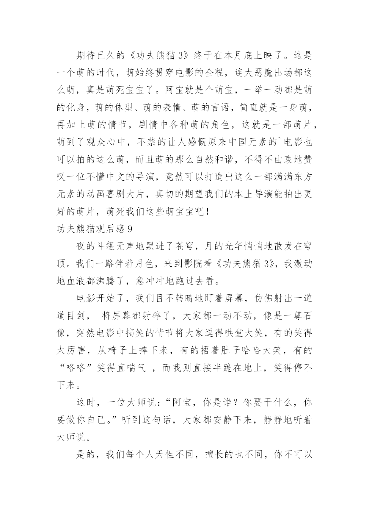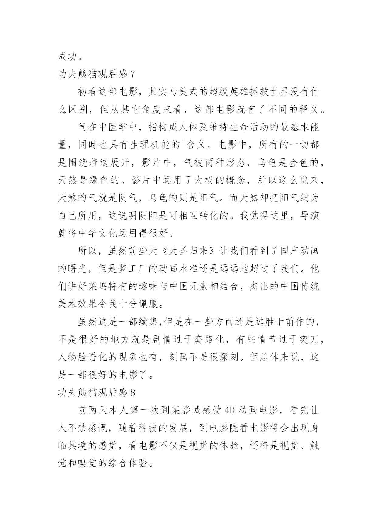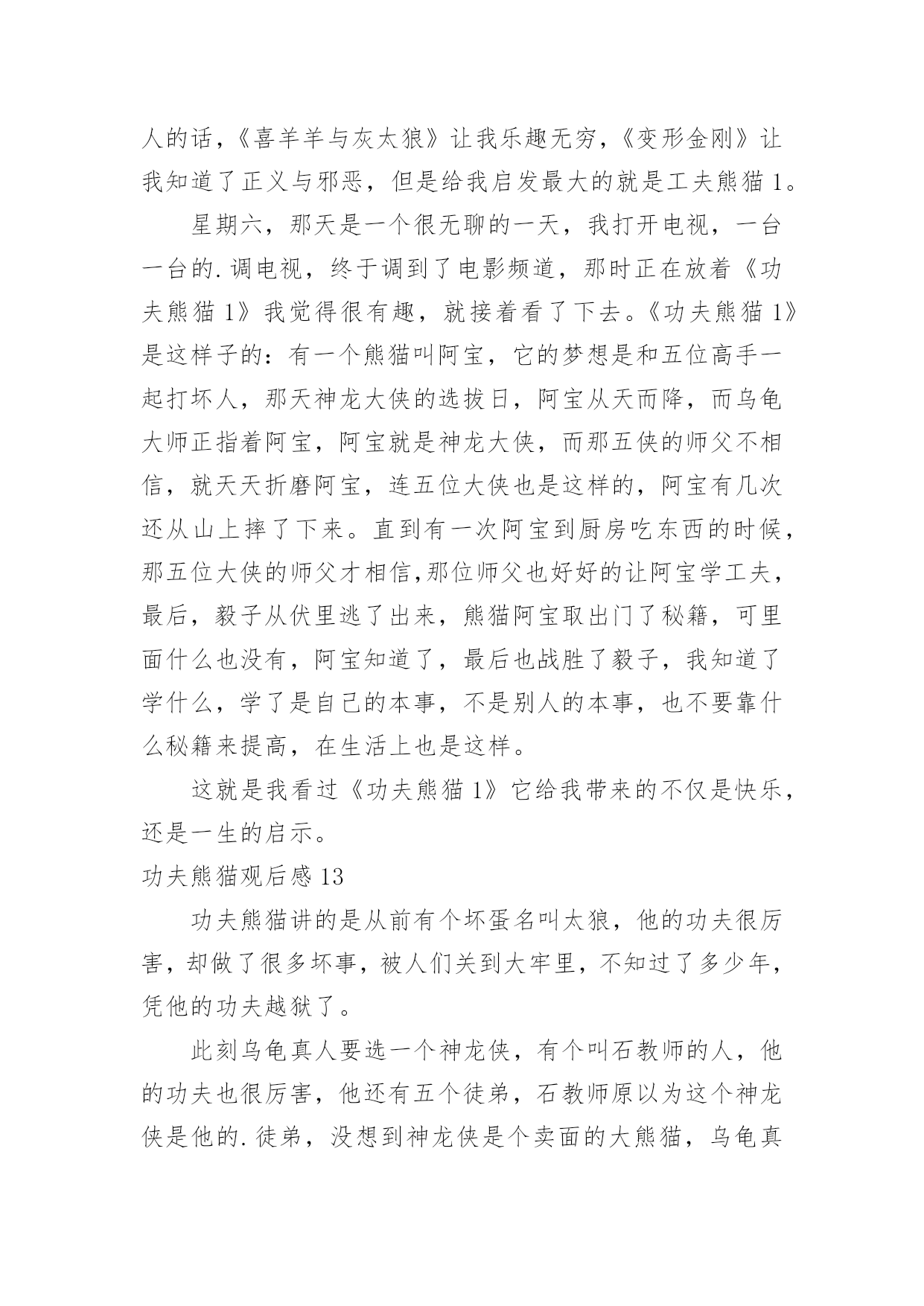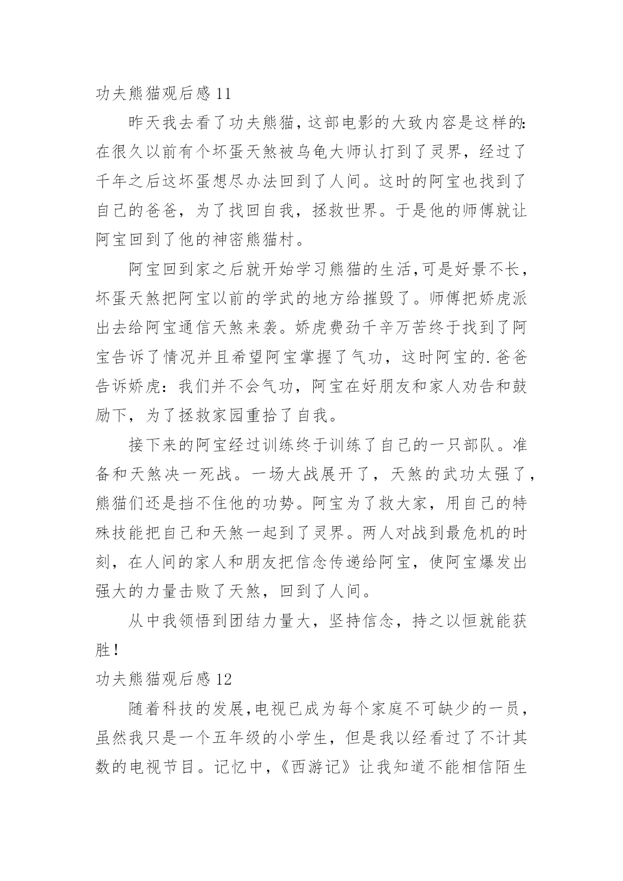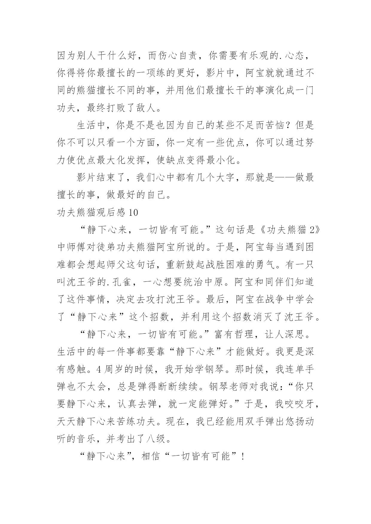功夫熊猫观后感功夫熊猫观后感看完一部作品后,你有什么总结呢?现在就让我们写一篇走心的观后感吧。千万不能认为观后感随便应付就可以,下面是小编整理的功夫熊猫观后感,欢迎阅读与收藏。功夫熊猫观后感1周六,我看了一部电影,名叫《功夫熊猫3》,这部电影让我明白了很多的道理。在一座山上,住着浣熊、阿宝、胶虎等乌龟大师的徒子徒孙,已羽化登仙的乌龟大师选中了一个人当“神龙大侠”,他就是阿宝。阿宝在浣熊的要求下当师傅,但他无法领略那句“你就是你自己”,师傅当得一塌糊涂。阿宝的亲生父亲收到了乌龟大师的讯息,找到了自己的儿子。一个名叫“天煞”的大坏蛋出现了,他每杀死一个会武功的人,就会夺走他们的“气”,让自己变得强大无比。乌龟大师、浣熊和猴子等都未能逃出魔掌,只有气功大师才能打败“天煞”。重逢的父子二人一起来到了一片不为人知的熊猫乐土。阿宝迎难而上,把那些热衷享乐、笨手笨脚的.熊猫村民训练成一班所向披靡的功夫熊猫,他也明白了“你就是你自己”这句话所蕴含的道理!虽然电影看完了,但电影中熊猫的这种不屈不挠的奋斗精神留在了我的心中。我们要像阿宝一样,不在乎他人异样的眼光,勇敢向上、积极进取。可能在危险来临时,会表现出人性真实的一面:懦弱与胆怯。然而我们定会战胜这些,凭借超凡的能力向世界证明:你就是你自己!只有明白了做人的真谛,我们才会成功,才能达到胜利的彼岸!功夫熊猫观后感2说起《功夫熊猫》,或许大多数人会听说过。松鼠老师傅精心调教的爱徒太狼逃出坚固的牢房,即将杀上神山抢夺“龙之神旨”。而他就是不相信乌龟所说的那只长满肥肉的熊猫就是能够拯救村民的武人。而那所谓的神旨实际上没有写着惊天动地的盖世神功的秘诀,相反的什么也没有。而电影的主旨也正是要说明:只要自己相信是特别的,那就相信自己,没有什么是不特别的,这便是空白的.意义。是啊,人贵在有思想,也苦于有思想。有思想能让自己变得不一般。可当自己不能做成某件事时,很多人会将失败归咎于外在条件吧。他们会说那是意外,可如果细心考虑周到呢?有些人可能又会说这是注定的,可注定又是什么注定的呢?上帝吗,还是玉皇大帝,又是什么注定他们就注定了你呢?他们可能又会说走错了路,投错了门,可谁又走对了呢?人生路上谁不会走进死胡同。而那些人,不管走哪条都会认为错了,因为他们认为自己的道普普通通,并无特别之处......如果你认为你特别的话,相信自己,当别人说不行时,你就坚信自己是特别的,勇敢的去闯,不放弃的去试;当发现找到的不是你需要的东西时,也应该高兴,你为你知道那样走不行......功夫熊猫观后感3我昨天去看了《功夫熊猫2》,虽然大宝战胜了太郎,可是沈太爷(一只孔雀)为了称霸整个大陆,用烟火来代替功夫,大宝发现了它是杀它们家族的“人”,它很恨那只孔雀,到了最后,大宝用平静的心态打败了沈太爷,也回忆了自己的父母的记忆,其实在山的另一端,大宝的爸爸是熊猫的首领,熊猫还没绝迹。其实你只要用平静的'心态来选择自己要的环境,你的压力就会释放,从而可以得到快乐,无论你的过去怎么样,只要你用平静的心态来面对未来,奇迹就会发生,伤疤也会消失,在心中的痛苦就会痊愈。无论过去怎么痛苦,只要你用平静的心态来对待未来,心中的痛苦也会消失的无影无踪……所以一个人的心态非常重要,只要你的心态不正,你将会走上犯罪的道路。一个人,只要他的心态平正(无论痛苦怎么大),那就会有奇迹发生。功夫熊猫观后感4妈一起在网上看了好莱坞的老功夫喜剧动画片《功夫熊猫》我觉得这部影片真是好看极了,影片中的熊猫憨态可掬,充满了幽默感。在电影放映过程中我和妈妈的`笑声不断,我更是乐得前仰后合的。《功夫熊猫》的故事很简单。主要是讲述了熊猫阿波不甘心一辈子卖面条,却迷上了功夫,梦想着能打败天下无敌手。为了实现自的理想,熊猫阿波不气馁,在他师傅的教授下,熊猫阿波刻苦训练,学了一身功夫,在最后终于战胜了敌人。观看了这部电影后,它让我懂得了很多道理,我例出一个句子:坚持,就能取得成功。我很喜欢龟大仙说的话:“昨日已成过往云烟,明日仍然前途未卜,唯有今天乃上帝赐予的礼物。”这句话告诉我们:把握当下是重要。因此我要珍惜时间,努力学好文化知识,长大要成为一个对社会有用的人。我喜欢《功夫熊猫》这部动画片。功夫熊猫观后感5星期五的时候当我看完《功夫熊猫》之后要给大家分享的是:熊猫“阿宝”被龟大师指为“神龙大侠”,阿宝被五大侠等嘲笑,因为熊猫身体笨拙,连自己的脚趾头都看不到,又没有练过武功,他们都不相信他,觉得他根本不可能打败残豹。但师父后面还是愿意用心的去教阿宝。可师父教阿宝的方式跟传统的方式不一样,因为阿宝他只有在吃东西的时候才会发挥出他的潜力,所以师父让他一边吃东西,一边练功。果然,阿宝的进步很快。我要给大家分享的是:师父他是一个会思考的人,体现在,他发现阿宝在厨房吃东西的时候,一跳可以跳很高,