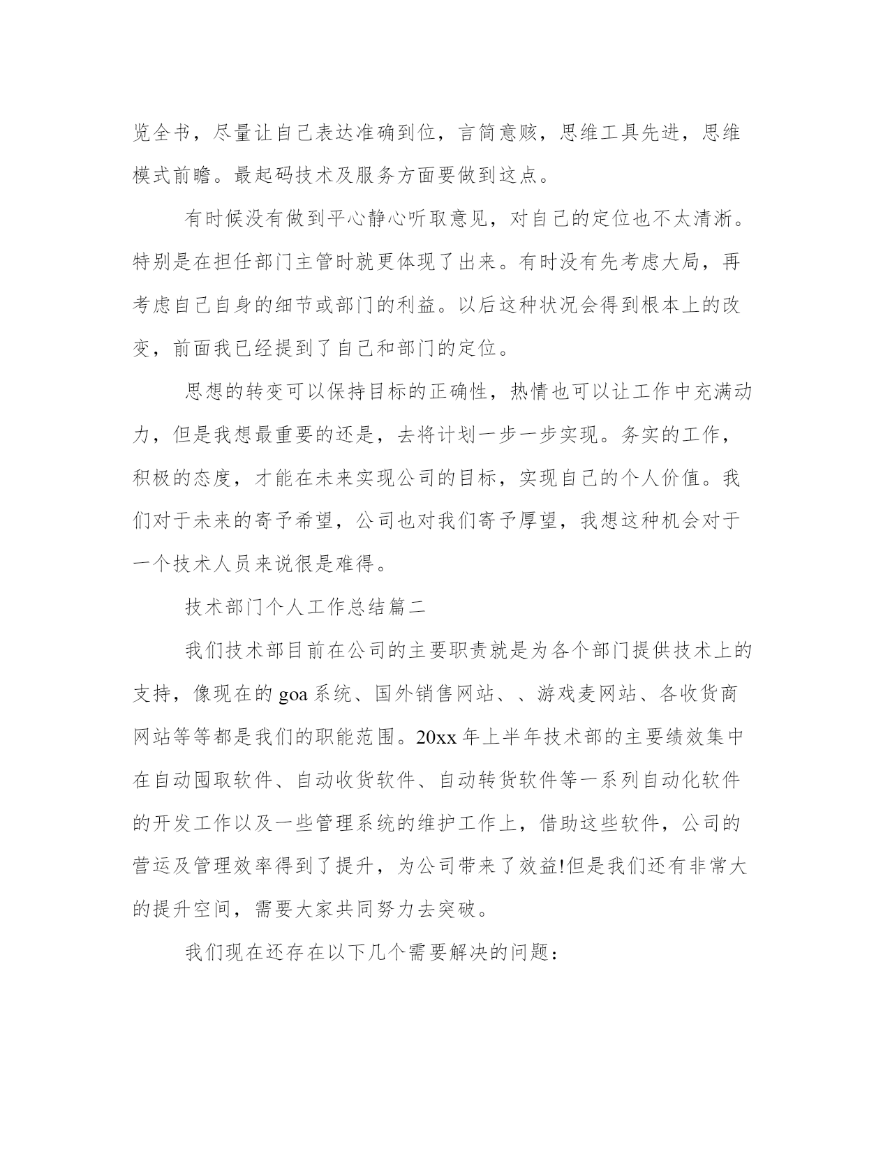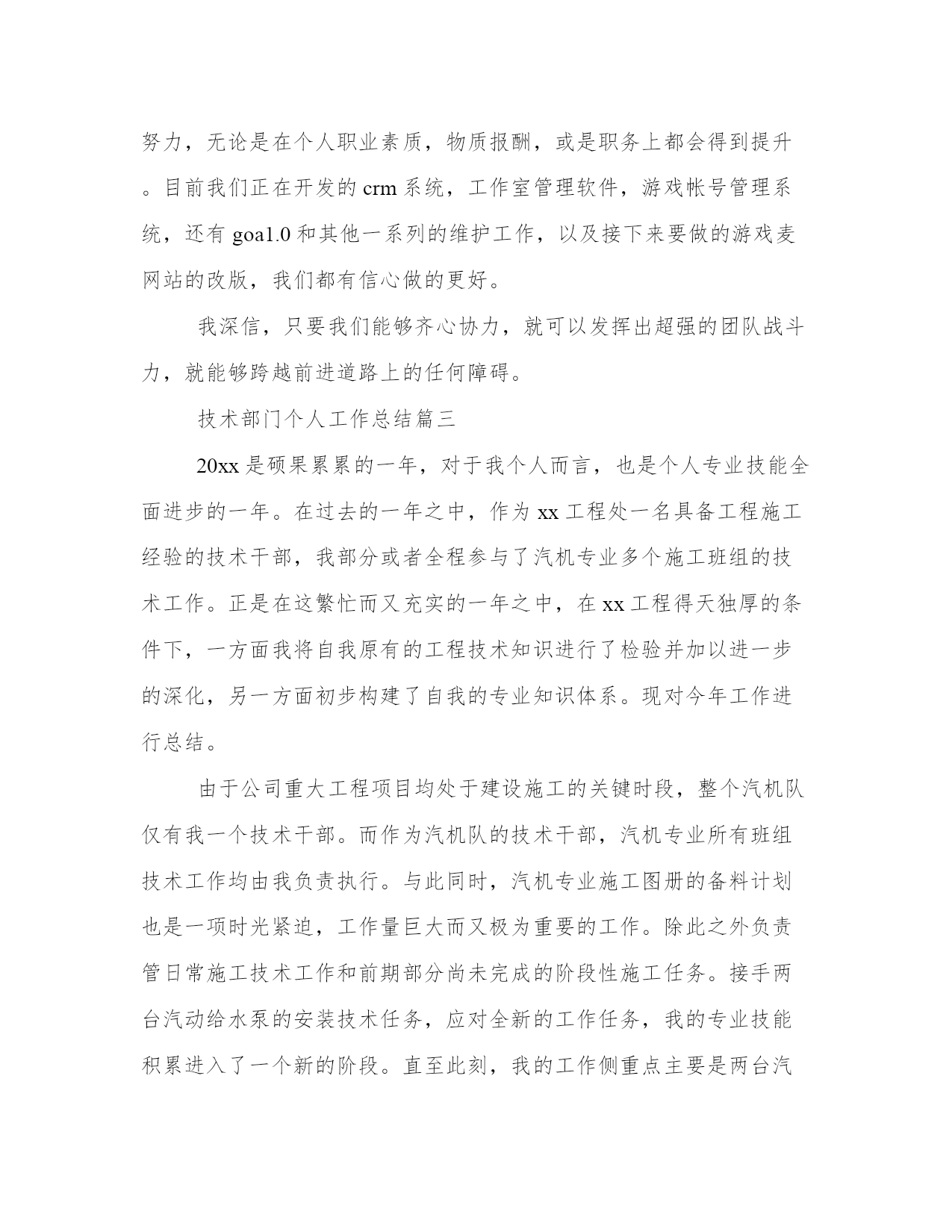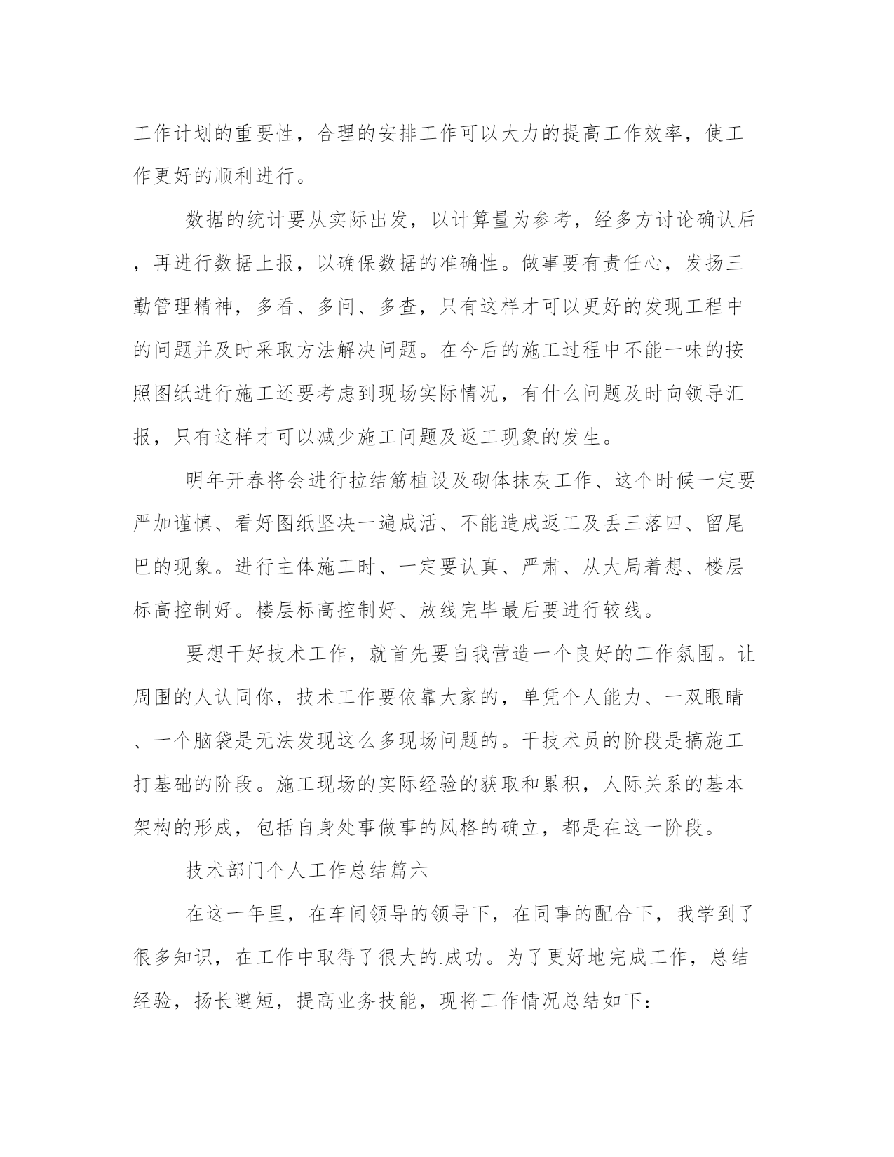 技术部门个人工作总结(模板8篇)总结是在一段时间内对学习和工作生活等表现加以总结和概括的一种书面材料,它可以促使我们思考,我想我们需要写一份总结了吧。那么我们该如何写一篇较为完美的总结呢?下面是小编为大家带来的总结书优秀范文,希望大家可以喜欢。技术部门个人工作总结篇一时光荏苒,忙碌而又硕果累累的2020年就要过去了,值此辞旧迎新之际,将技术部门在2020年的工作做一个回顾,以便弥补不足,现将2020年工作情况做如下总结。制定了技术部门的基本章程,较去年有较明显的改观,落实的较好,一举端掉了技术部门脏乱差,缺乏组织性和纪律性的帽子。但是回访机制在今年年底才开始由销售部和技术不配合初步落实了了下来,未见成效;员工考核只落实了销售部,技术部门未落实;销售服务质量监控、抱怨处理及预防完全没有实施。这直接关系到公司的口碑和效益,需要全年不间断重点落实,关系到技术人员的根本利益,根本出发点,公司的技术部门的绩效和效率,用户的口碑,需尽快落实。进行了一些工业区的相关工作,非常的感谢公司经理对我的信任和支持、以及对我的培养,给了我一个很大的空间去尝试和提升自己,更多的是宽阔了我的视野,增长了见识。但是出于种种的内在的、外在的因素,故适时转变工作重心,落实售后工作,以谋再次出力,更好的配合各部门的工作的实施,为公司带来效益。落实售后工作,培养并执行技术部门的“精准好”的服务风格,间断的做了4次重要的技术培训,还利用闲暇时间,通过谈心的方式,穿插了各种技术经验和维修技能,做人做事的准则,使技术员得到了应有的提高。今后本人将继续贯彻“精准好”的服务风格,配合朱林凡技术主管,建设一支专业的,人性化的,快捷高效的技术人才队伍。技术部门,常人看来应该是一个缺乏热情,激情,甚至挑战的枯燥无味的部门。但我凭借多年来积累的经验,虚心与人交流的作风,不自觉的分享经验和成果,让我感觉自己在技术部是热情高涨的,乐于共享的,我相信我给我们部门的这种感受,甚至扩散到其他部门都有这样的感觉。我部门对于未来有个很前瞻的目标,我们相信我们所作的事能够给公司带来效益上的稳定与突破,能够帮助我们的客户实现利益,我们也相信个人价值也能得到实现。有了这样的一个信念,那么工作起来自然和以前有所不同。做事的时候过于专注性,作为技术主管,统领大局当是首任之重,但是我的这个既是优点又是缺点作风导致了我的工作没有完全做好。另外这种思维过于活跃还表现在想很多问题的时候,将原本问题扩大化了。然后把精力放在解决被自己扩大化的问题之上,这会很浪费时间。口头表达能力尚可,但是与专家比思维观念落后。我会继续博览全书,尽量让自己表达准确到位,言简意赅,思维工具先进,思维模式前瞻。最起码技术及服务方面要做到这点。有时候没有做到平心静心听取意见,对自己的定位也不太清淅。特别是在担任部门主管时就更体现了出来。有时没有先考虑大局,再考虑自己自身的细节或部门的利益。以后这种状况会得到根本上的改变,前面我已经提到了自己和部门的定位。思想的转变可以保持目标的正确性,热情也可以让工作中充满动力,但是我想最重要的还是,去将计划一步一步实现。务实的工作,积极的态度,才能在未来实现公司的目标,实现自己的个人价值。我们对于未来的寄予希望,公司也对我们寄予厚望,我想这种机会对于一个技术人员来说很是难得。技术部门个人工作总结篇二我们技术部目前在公司的主要职责就是为各个部门提供技术上的支持,像现在的goa系统、国外销售网站、、游戏麦网站、各收货商网站等等都是我们的职能范围。20xx年上半年技术部的主要绩效集中在自动囤取软件、自动收货软件、自动转货软件等一系列自动化软件的开发工作以及一些管理系统的维护工作上,借助这些软件,公司的营运及管理效率得到了提升,为公司带来了效益!但是我们还有非常大的提升空间,需要大家共同努力去突破。我们现在还存在以下几个需要解决的问题:第一点:部门人力配置不足,分工无法细化。一些岗位有经验的技术人员难招聘,是导致这个问题的主要原因。由于公司所在的地区为县级市,导致很多大城市有经验的技术人员不愿意来这边。我们以后可以从身边的同事和朋友方面着手拓展技术人员招聘这块,也希望在座的兄弟姐妹们一起帮帮忙,挖掘身边的合适资源。第二点:部分同事在处理一些相对繁琐的工作任务地时候,主动性和积极性方面有所欠缺,工作效率比较低。对于这点,接下来我们会借助绩效考核等管理工具,让那些能够为公司创造价值,付诸自身努力的同事,无论从物质上还是精神上都能够获取更大的利益。更重要的一点,就是沟通和合作也是创造效率必不可少的条件。第三点:一些项目型系统开发的延期,暴露出了我们缺乏项目管理方面的经验。接下来的工作我们需要有清晰的工作流程、责任更加明确、有序地去运作,还需要制定并逐步完善一些相关的开发规范。现在我们已