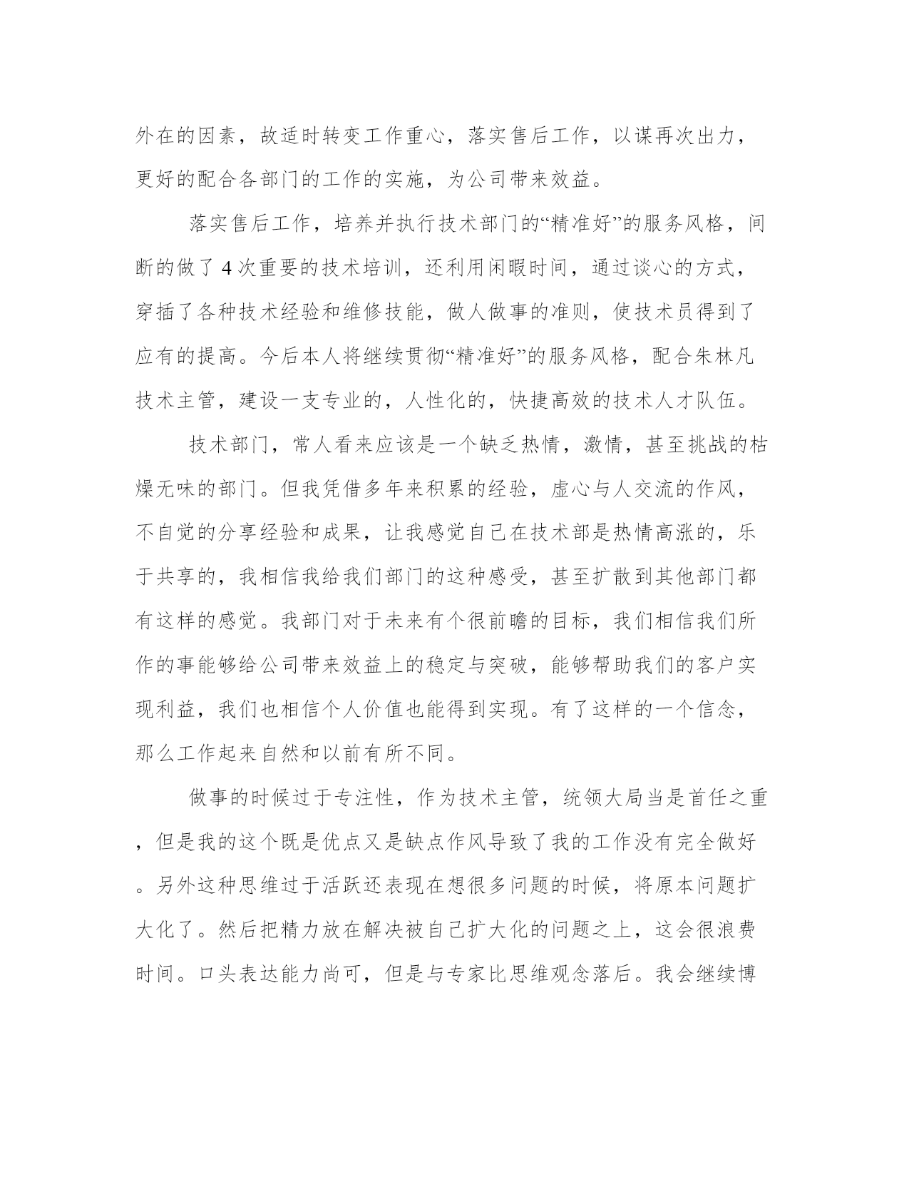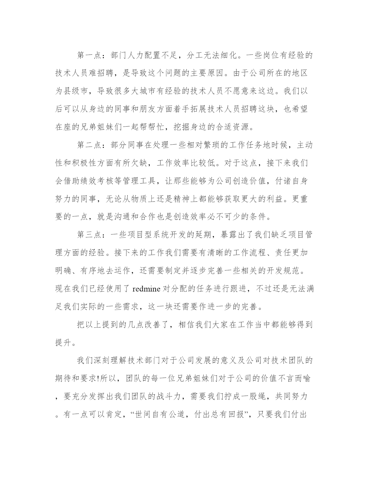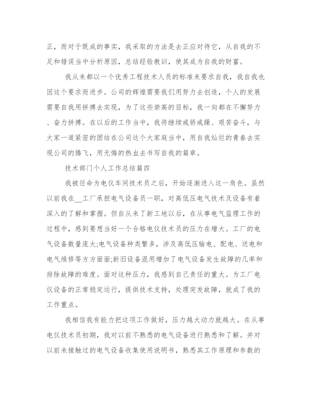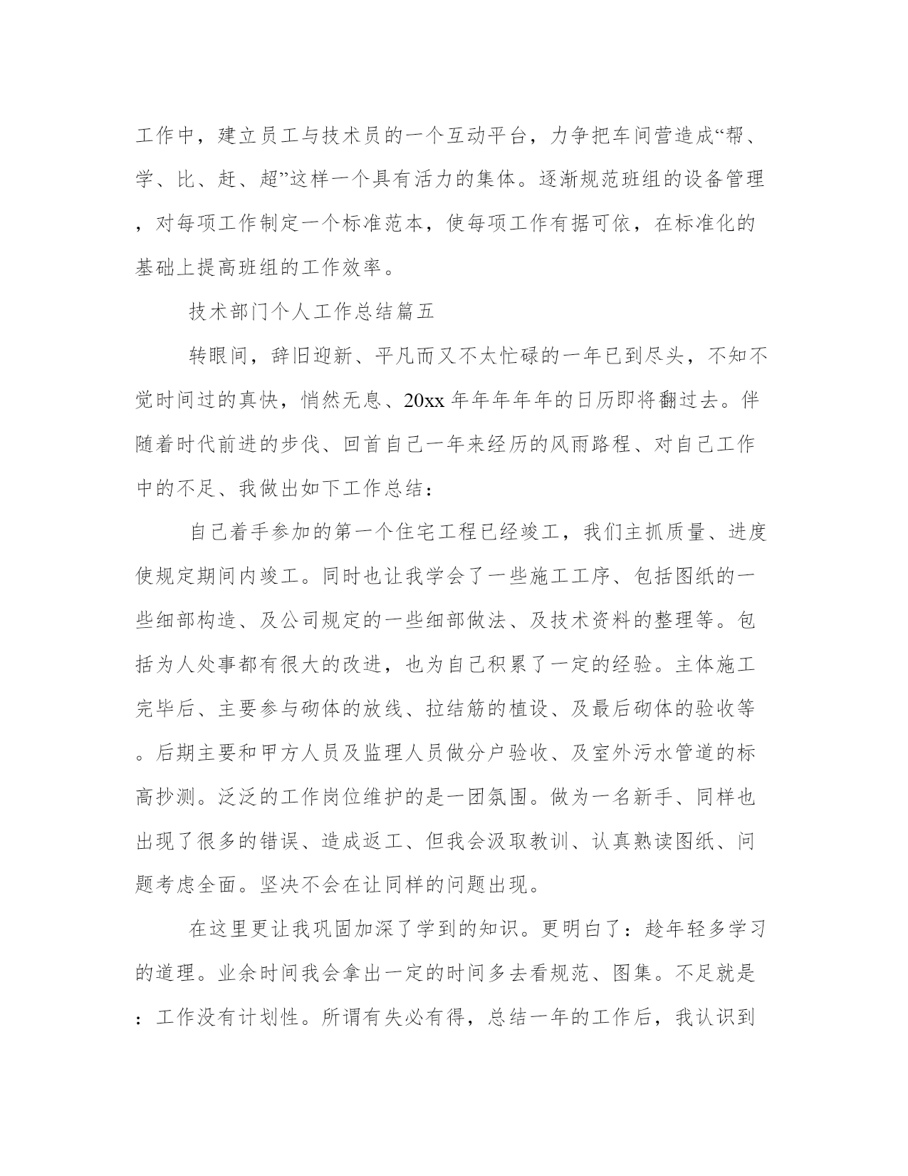 技术部门个人工作总结(模板8篇)总结是在一段时间内对学习和工作生活等表现加以总结和概括的一种书面材料,它可以促使我们思考,我想我们需要写一份总结了吧。那么我们该如何写一篇较为完美的总结呢?下面是小编为大家带来的总结书优秀范文,希望大家可以喜欢。技术部门个人工作总结篇一时光荏苒,忙碌而又硕果累累的2020年就要过去了,值此辞旧迎新之际,将技术部门在2020年的工作做一个回顾,以便弥补不足,现将2020年工作情况做如下总结。制定了技术部门的基本章程,较去年有较明显的改观,落实的较好,一举端掉了技术部门脏乱差,缺乏组织性和纪律性的帽子。但是回访机制在今年年底才开始由销售部和技术不配合初步落实了了下来,未见成效;员工考核只落实了销售部,技术部门未落实;销售服务质量监控、抱怨处理及预防完全没有实施。这直接关系到公司的口碑和效益,需要全年不间断重点落实,关系到技术人员的根本利益,根本出发点,公司的技术部门的绩效和效率,用户的口碑,需尽快落实。进行了一些工业区的相关工作,非常的感谢公司经理对我的信任和支持、以及对我的培养,给了我一个很大的空间去尝试和提升自己,更多的是宽阔了我的视野,增长了见识。但是出于种种的内在的、外在的因素,故适时转变工作重心,落实售后工作,以谋再次出力,更好的配合各部门的工作的实施,为公司带来效益。落实售后工作,培养并执行技术部门的“精准好”的服务风格,间断的做了4次重要的技术培训,还利用闲暇时间,通过谈心的方式,穿插了各种技术经验和维修技能,做人做事的准则,使技术员得到了应有的提高。今后本人将继续贯彻“精准好”的服务风格,配合朱林凡技术主管,建设一支专业的,人性化的,快捷高效的技术人才队伍。技术部门,常人看来应该是一个缺乏热情,激情,甚至挑战的枯燥无味的部门。但我凭借多年来积累的经验,虚心与人交流的作风,不自觉的分享经验和成果,让我感觉自己在技术部是热情高涨的,乐于共享的,我相信我给我们部门的这种感受,甚至扩散到其他部门都有这样的感觉。我部门对于未来有个很前瞻的目标,我们相信我们所作的事能够给公司带来效益上的稳定与突破,能够帮助我们的客户实现利益,我们也相信个人价值也能得到实现。有了这样的一个信念,那么工作起来自然和以前有所不同。做事的时候过于专注性,作为技术主管,统领大局当是首任之重,但是我的这个既是优点又是缺点作风导致了我的工作没有完全做好。另外这种思维过于活跃还表现在想很多问题的时候,将原本问题扩大化了。然后把精力放在解决被自己扩大化的问题之上,这会很浪费时间。口头表达能力尚可,但是与专家比思维观念落后。我会继续博览全书,尽量让自己表达准确到位,言简意赅,思维工具先进,思维模式前瞻。最起码技术及服务方面要做到这点。有时候没有做到平心静心听取意见,对自己的定位也不太清淅。特别是在担任部门主管时就更体现了出来。有时没有先考虑大局,再考虑自己自身的细节或部门的利益。以后这种状况会得到根本上的改变,前面我已经提到了自己和部门的定位。思想的转变可以保持目标的正确性,热情也可以让工作中充满动力,但是我想最重要的还是,去将计划一步一步实现。务实的工作,积极的态度,才能在未来实现公司的目标,实现自己的个人价值。我们对于未来的寄予希望,公司也对我们寄予厚望,我想这种机会对于一个技术人员来说很是难得。技术部门个人工作总结篇二我们技术部目前在公司的主要职责就是为各个部门提供技术上的支持,像现在的goa系统、国外销售网站、、游戏麦网站、各收货商网站等等都是我们的职能范围。20xx年上半年技术部的主要绩效集中在自动囤取软件、自动收货软件、自动转货软件等一系列自动化软件的开发工作以及一些管理系统的维护工作上,借助这些软件,公司的营运及管理效率得到了提升,为公司带来了效益!但是我们还有非常大的提升空间,需要大家共同努力去突破。我们现在还存在以下几个需要解决的问题:第一点:部门人力配置不足,分工无法细化。一些岗位有经验的技术人员难招聘,是导致这个问题的主要原因。由于公司所在的地区为县级市,导致很多大城市有经验的技术人员不愿意来这边。我们以后可以从身边的同事和朋友方面着手拓展技术人员招聘这块,也希望在座的兄弟姐妹们一起帮帮忙,挖掘身边的合适资源。第二点:部分同事在处理一些相对繁琐的工作任务地时候,主动性和积极性方面有所欠缺,工作效率比较低。对于这点,接下来我们会借助绩效考核等管理工具,让那些能够为公司创造价值,付诸自身努力的同事,无论从物质上还是精神上都能够获取更大的利益。更重要的一点,就是沟通和合作也是创造效率必不可少的条件。第三点:一些项目型系统开发的延期,暴露出了我们缺乏项目管理方面的经验。接下来的工作我们需要有清晰的工作流程、责任更加明确、有序地去运作,还需要制定并逐步完善一些相关的开发规范。现在我们已