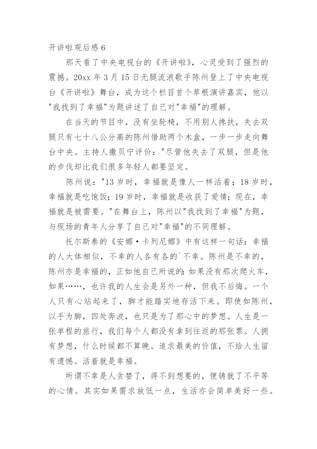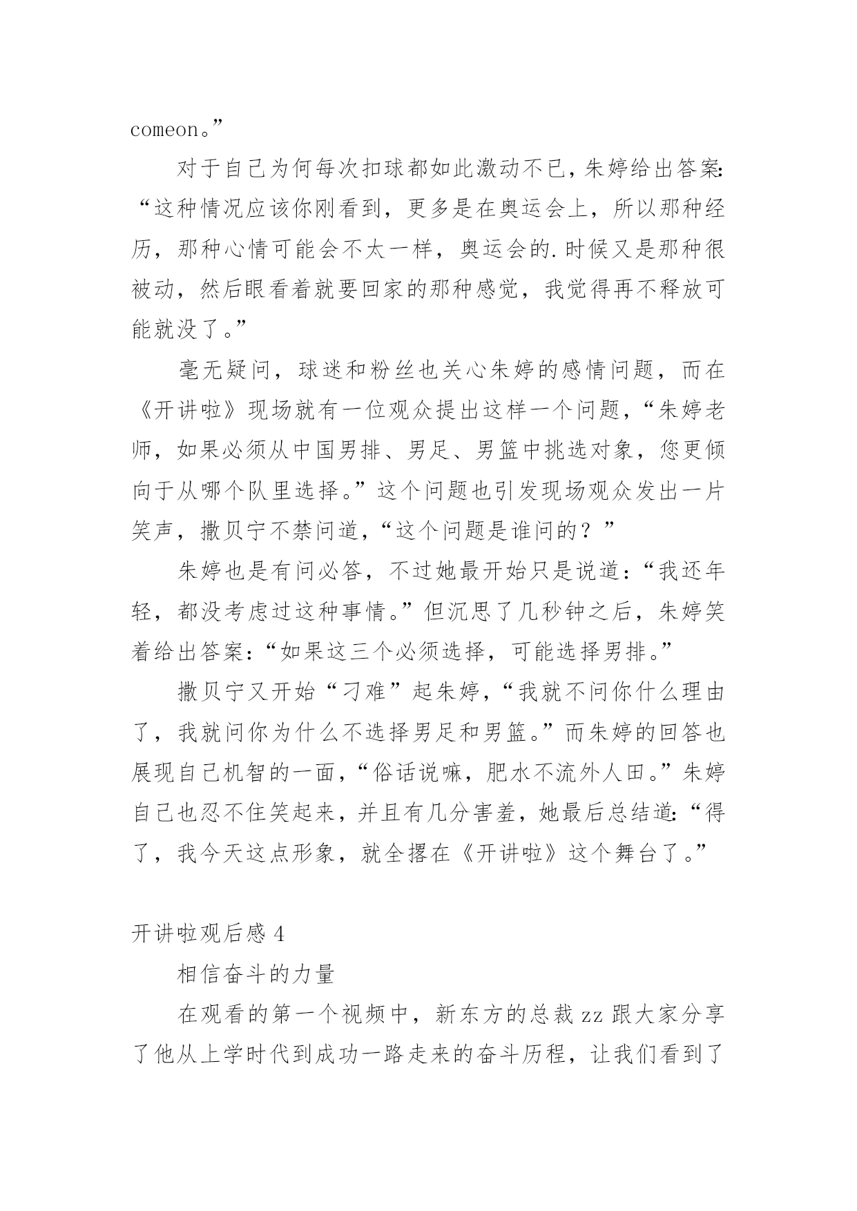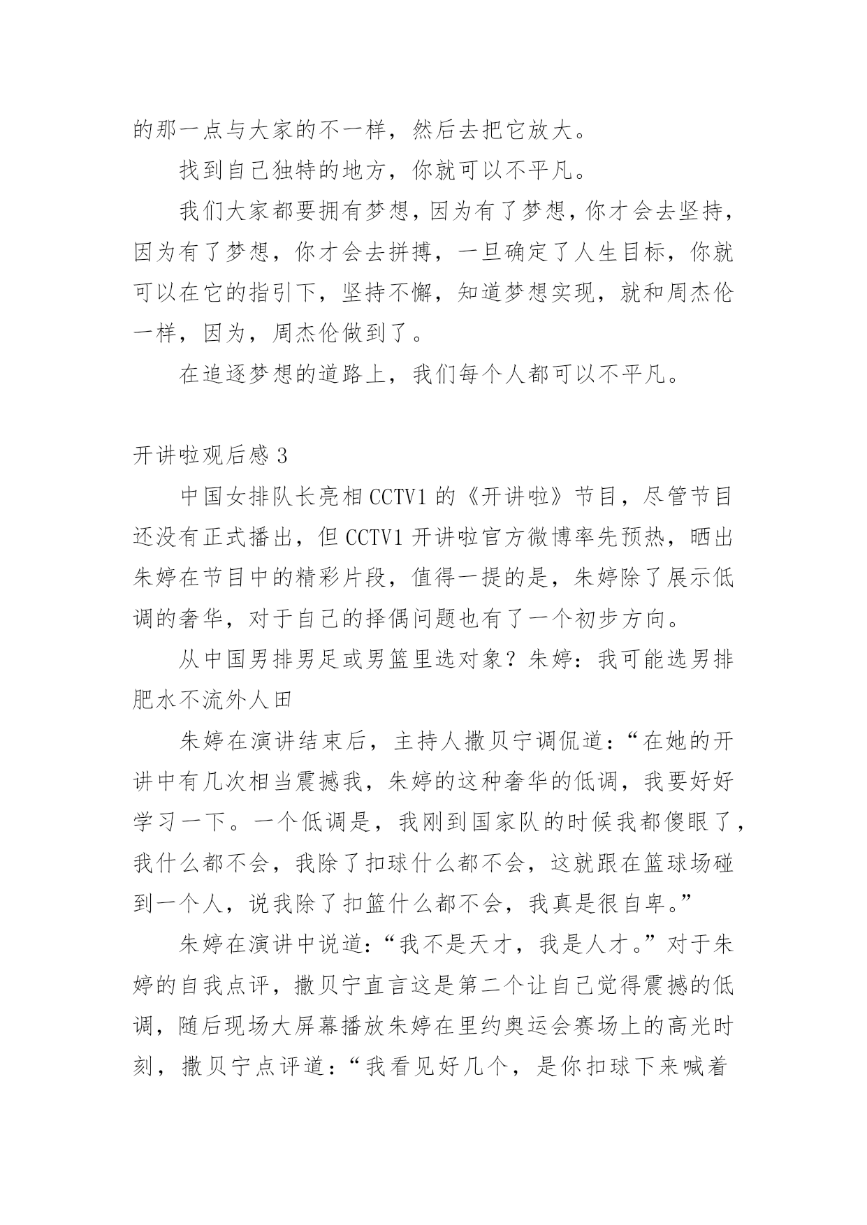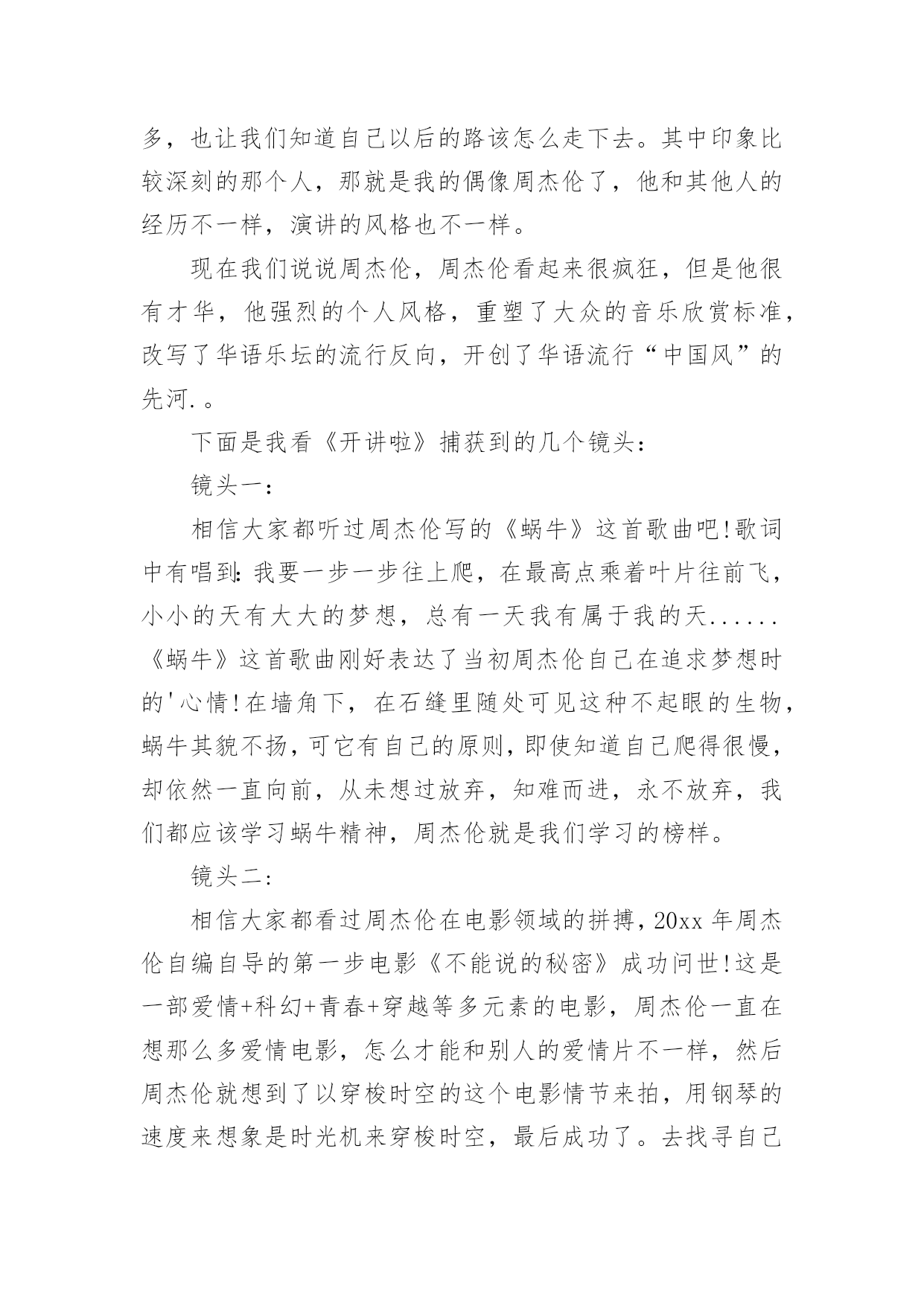 开讲啦观后感开讲啦观后感范例[14篇]当看完一部作品后,从中我们可以吸收新的思想,是时候静下心来好好写写观后感了。在写观后感之前,可以先参考范文,以下是小编收集整理的开讲啦观后感,供大家参考借鉴,希望可以帮助到有需要的朋友。开讲啦观后感1这个周末,应老师的建议,我观看了《开讲啦》这个节目,它是以中国首档青年电视公开课的形式展现给我们的。这个节目有很多期,我选择了近期的蒋昌建——在悲情中认识自己这一期。蒋昌建老师是从复旦大学毕业毕业的,他毕业后选择了留校做一民人民教师。20年后,他又逆袭主持界,成为了《最强大脑》的主持人。虽然早已年过半百,但这位老师仍然不放弃自己的人生,顽强地和命运、疾病做斗争,走上了人生的巅峰。我觉得蒋昌建老师讲的很好的一句名言是“面对苦难的生活,最好的救济方法就是幻想”。这是高尔基在《我的大学》中说的一句话。他说“面对尴尬困窘,最好的办法就是把自己陷入一种悲情。”当你觉得生活中没有什么比这更难堪的时候,你就会发奋努力。只有把生活中每一次失败当做自己最痛苦、最尴尬的时候,你才会对今后更加憧憬,更加努力。我觉得这是一种很好的办法,在初三的学习中,不可能一帆风顺。当我遇到挫折、坎坷的时候,我要告诉我自己,这是我人生中最最悲惨的时候,经过这一劫,我今后一定会站起来,一定会实现我自己的梦想。失败乃成功之母,只有失败才能体现出我当前的不足和缺失。我要把每一次失败的原由填补起来,这样面对半年后的“无硝烟的战争”,我才能游刃有余,做好最充分的准备。当一位学生问蒋昌建老师是喜欢白开水般的教师生活,还是喜欢火锅般的名人生活时,蒋老师毅然决然的选择了“白开水”般的教师生活。对于老师来说,他更加喜欢自由、舒心的生活。也许很多人都喜欢众心捧月的生活,但其实当你真正到了这个地位时,你会发现你失去了当时的自由、无拘无束。以后的.生活,也许不用非常积极地去争取第一,力争最好,只要努力做好自己,许多的东西会自然而然的找上你。看了这一期的“开讲啦”,我受益匪浅。“我们用黑白两色的眼睛,看到的是这个世界上五色斑斓的风景”。这些素质卓越的名人,有着比我们更多的人生阅历,我们要虚心去倾听,去做,才能有益于我们今后的人生。开讲啦观后感2今天抱着学习的态度看了《开讲啦》感触很深刻,不同的演讲人士,带给我们的人生经历和感触,让我们明白了很多,也让我们知道自己以后的路该怎么走下去。其中印象比较深刻的那个人,那就是我的偶像周杰伦了,他和其他人的经历不一样,演讲的风格也不一样。现在我们说说周杰伦,周杰伦看起来很疯狂,但是他很有才华,他强烈的个人风格,重塑了大众的音乐欣赏标准,改写了华语乐坛的流行反向,开创了华语流行“中国风”的先河.。下面是我看《开讲啦》捕获到的几个镜头:镜头一:相信大家都听过周杰伦写的《蜗牛》这首歌曲吧!歌词中有唱到:我要一步一步往上爬,在最高点乘着叶片往前飞,小小的天有大大的梦想,总有一天我有属于我的天......《蜗牛》这首歌曲刚好表达了当初周杰伦自己在追求梦想时的'心情!在墙角下,在石缝里随处可见这种不起眼的生物,蜗牛其貌不扬,可它有自己的原则,即使知道自己爬得很慢,却依然一直向前,从未想过放弃,知难而进,永不放弃,我们都应该学习蜗牛精神,周杰伦就是我们学习的榜样。镜头二:相信大家都看过周杰伦在电影领域的拼搏,20xx年周杰伦自编自导的第一步电影《不能说的秘密》成功问世!这是一部爱情+科幻+青春+穿越等多元素的电影,周杰伦一直在想那么多爱情电影,怎么才能和别人的爱情片不一样,然后周杰伦就想到了以穿梭时空的这个电影情节来拍,用钢琴的速度来想象是时光机来穿梭时空,最后成功了。去找寻自己的那一点与大家的不一样,然后去把它放大。找到自己独特的地方,你就可以不平凡。我们大家都要拥有梦想,因为有了梦想,你才会去坚持,因为有了梦想,你才会去拼搏,一旦确定了人生目标,你就可以在它的指引下,坚持不懈,知道梦想实现,就和周杰伦一样,因为,周杰伦做到了。在追逐梦想的道路上,我们每个人都可以不平凡。开讲啦观后感3中国女排队长亮相CCTV1的《开讲啦》节目,尽管节目还没有正式播出,但CCTV1开讲啦官方微博率先预热,晒出朱婷在节目中的精彩片段,值得一提的是,朱婷除了展示低调的奢华,对于自己的择偶问题也有了一个初步方向。从中国男排男足或男篮里选对象?朱婷:我可能选男排肥水不流外人田朱婷在演讲结束后,主持人撒贝宁调侃道:“在她的开讲中有几次相当震撼我,朱婷的这种奢华的低调,我要好好学习一下。一个低调是,我刚到国家队的时候我都傻眼了,我什么都不会,我除了扣球什么都不会,这就跟在篮球场碰到一个人,说我除了扣篮什么都不会,我真是很自卑。”朱婷在演讲中说道:“我不是天才,我是人才。”对于朱婷的自我点评,撒贝宁直言这是第二个让自己觉得震撼的低调,随后现场大屏幕播放朱婷在里
