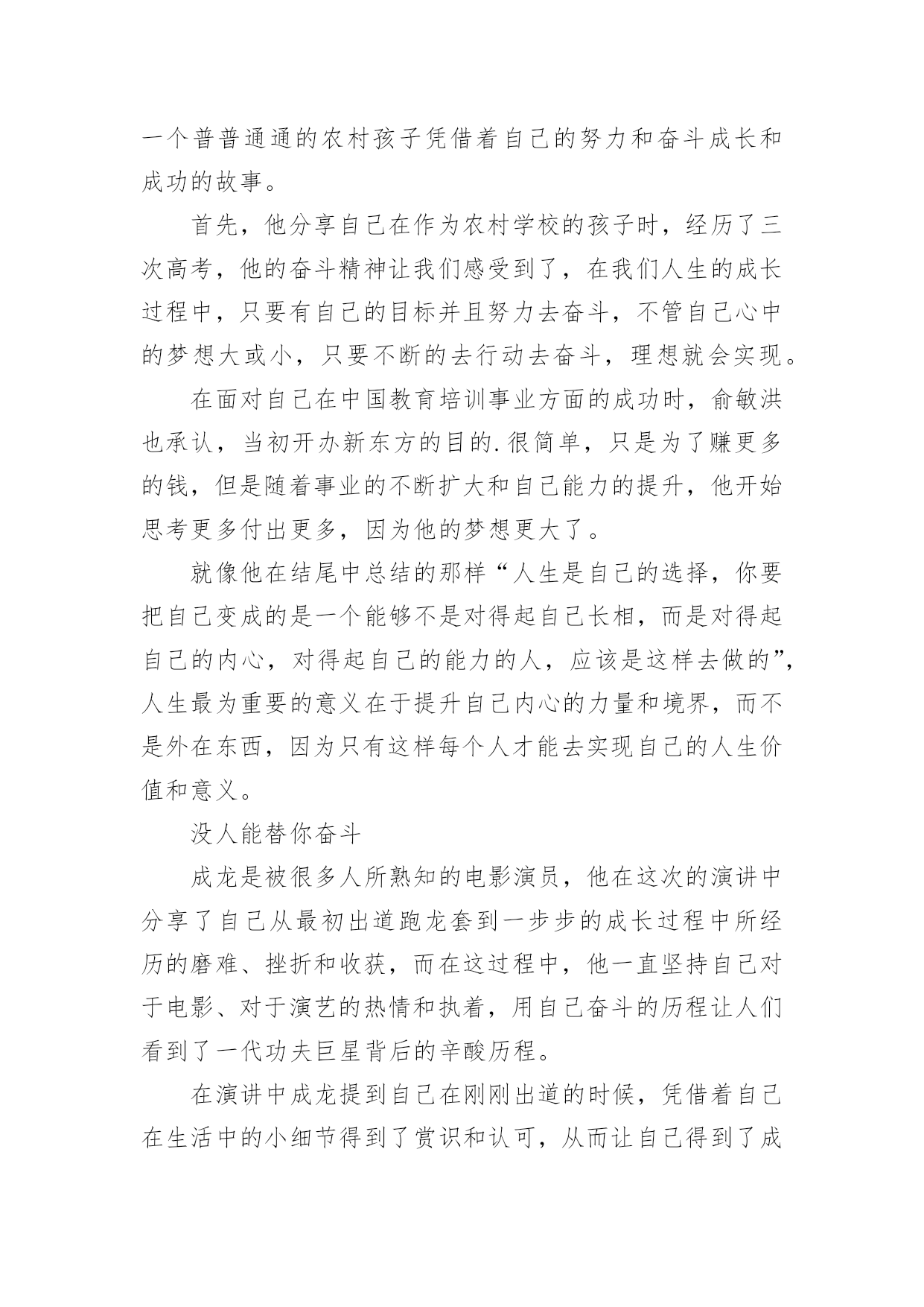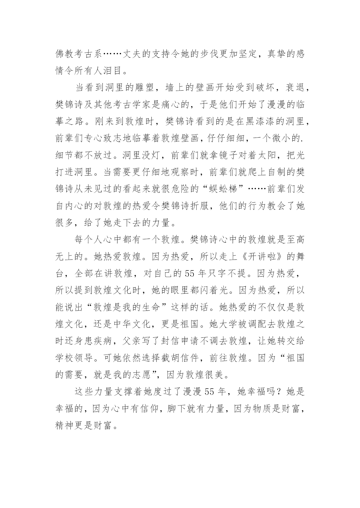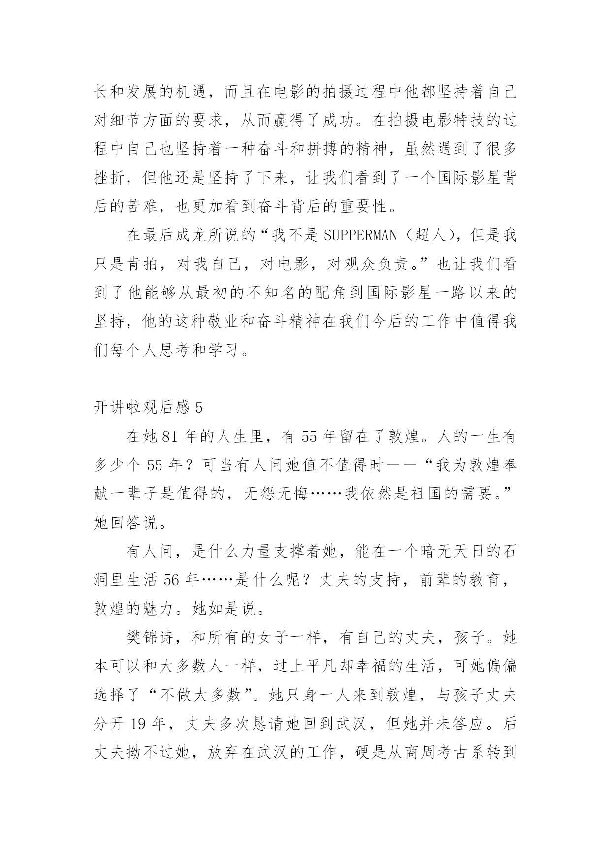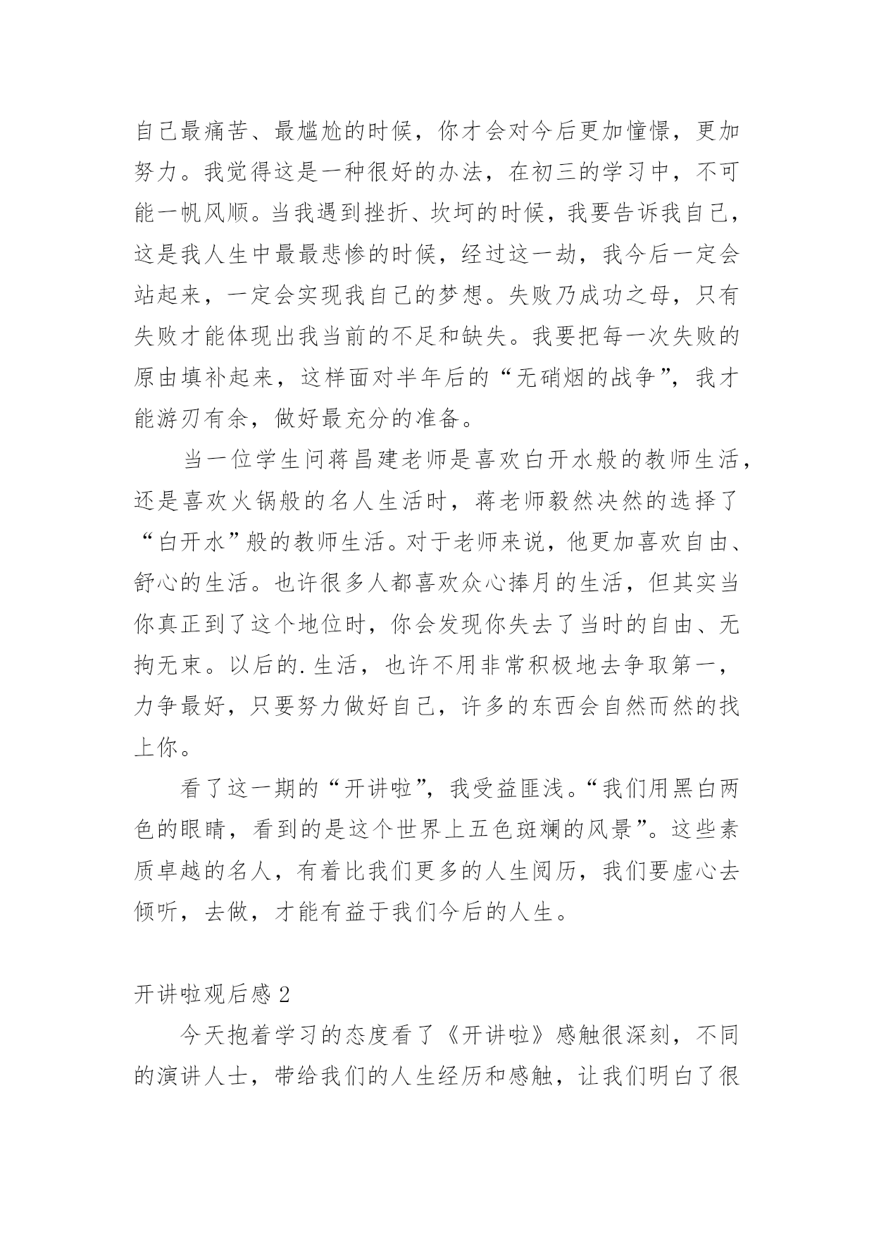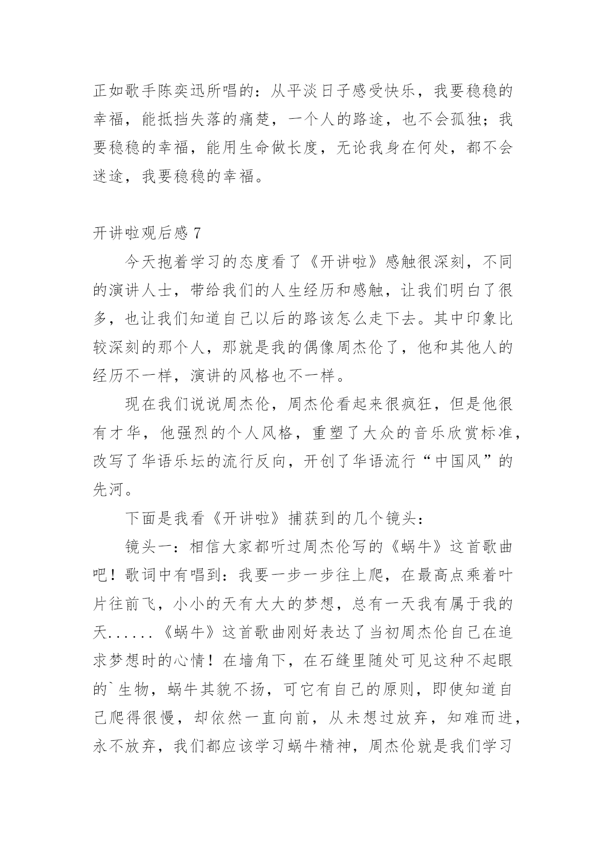 开讲啦观后感开讲啦观后感范例[14篇]当看完一部作品后,从中我们可以吸收新的思想,是时候静下心来好好写写观后感了。在写观后感之前,可以先参考范文,以下是小编收集整理的开讲啦观后感,供大家参考借鉴,希望可以帮助到有需要的朋友。开讲啦观后感1这个周末,应老师的建议,我观看了《开讲啦》这个节目,它是以中国首档青年电视公开课的形式展现给我们的。这个节目有很多期,我选择了近期的蒋昌建——在悲情中认识自己这一期。蒋昌建老师是从复旦大学毕业毕业的,他毕业后选择了留校做一民人民教师。20年后,他又逆袭主持界,成为了《最强大脑》的主持人。虽然早已年过半百,但这位老师仍然不放弃自己的人生,顽强地和命运、疾病做斗争,走上了人生的巅峰。我觉得蒋昌建老师讲的很好的一句名言是“面对苦难的生活,最好的救济方法就是幻想”。这是高尔基在《我的大学》中说的一句话。他说“面对尴尬困窘,最好的办法就是把自己陷入一种悲情。”当你觉得生活中没有什么比这更难堪的时候,你就会发奋努力。只有把生活中每一次失败当做自己最痛苦、最尴尬的时候,你才会对今后更加憧憬,更加努力。我觉得这是一种很好的办法,在初三的学习中,不可能一帆风顺。当我遇到挫折、坎坷的时候,我要告诉我自己,这是我人生中最最悲惨的时候,经过这一劫,我今后一定会站起来,一定会实现我自己的梦想。失败乃成功之母,只有失败才能体现出我当前的不足和缺失。我要把每一次失败的原由填补起来,这样面对半年后的“无硝烟的战争”,我才能游刃有余,做好最充分的准备。当一位学生问蒋昌建老师是喜欢白开水般的教师生活,还是喜欢火锅般的名人生活时,蒋老师毅然决然的选择了“白开水”般的教师生活。对于老师来说,他更加喜欢自由、舒心的生活。也许很多人都喜欢众心捧月的生活,但其实当你真正到了这个地位时,你会发现你失去了当时的自由、无拘无束。以后的.生活,也许不用非常积极地去争取第一,力争最好,只要努力做好自己,许多的东西会自然而然的找上你。看了这一期的“开讲啦”,我受益匪浅。“我们用黑白两色的眼睛,看到的是这个世界上五色斑斓的风景”。这些素质卓越的名人,有着比我们更多的人生阅历,我们要虚心去倾听,去做,才能有益于我们今后的人生。开讲啦观后感2今天抱着学习的态度看了《开讲啦》感触很深刻,不同的演讲人士,带给我们的人生经历和感触,让我们明白了很多,也让我们知道自己以后的路该怎么走下去。其中印象比较深刻的那个人,那就是我的偶像周杰伦了,他和其他人的经历不一样,演讲的风格也不一样。现在我们说说周杰伦,周杰伦看起来很疯狂,但是他很有才华,他强烈的个人风格,重塑了大众的音乐欣赏标准,改写了华语乐坛的流行反向,开创了华语流行“中国风”的先河.。下面是我看《开讲啦》捕获到的几个镜头:镜头一:相信大家都听过周杰伦写的《蜗牛》这首歌曲吧!歌词中有唱到:我要一步一步往上爬,在最高点乘着叶片往前飞,小小的天有大大的梦想,总有一天我有属于我的天......《蜗牛》这首歌曲刚好表达了当初周杰伦自己在追求梦想时的'心情!在墙角下,在石缝里随处可见这种不起眼的生物,蜗牛其貌不扬,可它有自己的原则,即使知道自己爬得很慢,却依然一直向前,从未想过放弃,知难而进,永不放弃,我们都应该学习蜗牛精神,周杰伦就是我们学习的榜样。镜头二:相信大家都看过周杰伦在电影领域的拼搏,20xx年周杰伦自编自导的第一步电影《不能说的秘密》成功问世!这是一部爱情+科幻+青春+穿越等多元素的电影,周杰伦一直在想那么多爱情电影,怎么才能和别人的爱情片不一样,然后周杰伦就想到了以穿梭时空的这个电影情节来拍,用钢琴的速度来想象是时光机来穿梭时空,最后成功了。去找寻自己的那一点与大家的不一样,然后去把它放大。找到自己独特的地方,你就可以不平凡。我们大家都要拥有梦想,因为有了梦想,你才会去坚持,因为有了梦想,你才会去拼搏,一旦确定了人生目标,你就可以在它的指引下,坚持不懈,知道梦想实现,就和周杰伦一样,因为,周杰伦做到了。在追逐梦想的道路上,我们每个人都可以不平凡。开讲啦观后感3中国女排队长亮相CCTV1的《开讲啦》节目,尽管节目还没有正式播出,但CCTV1开讲啦官方微博率先预热,晒出朱婷在节目中的精彩片段,值得一提的是,朱婷除了展示低调的奢华,对于自己的择偶问题也有了一个初步方向。从中国男排男足或男篮里选对象?朱婷:我可能选男排肥水不流外人田朱婷在演讲结束后,主持人撒贝宁调侃道:“在她的开讲中有几次相当震撼我,朱婷的这种奢华的低调,我要好好学习一下。一个低调是,我刚到国家队的时候我都傻眼了,我什么都不会,我除了扣球什么都不会,这就跟在篮球场碰到一个人,说我除了扣篮什么都不会,我真是很自卑。”朱婷在演讲中说道:“我不是天才,我是人才。”对于朱婷的自我点评,撒贝宁直言这是第二个让自己觉得震撼的低调,随后现场大屏幕播放朱婷在里