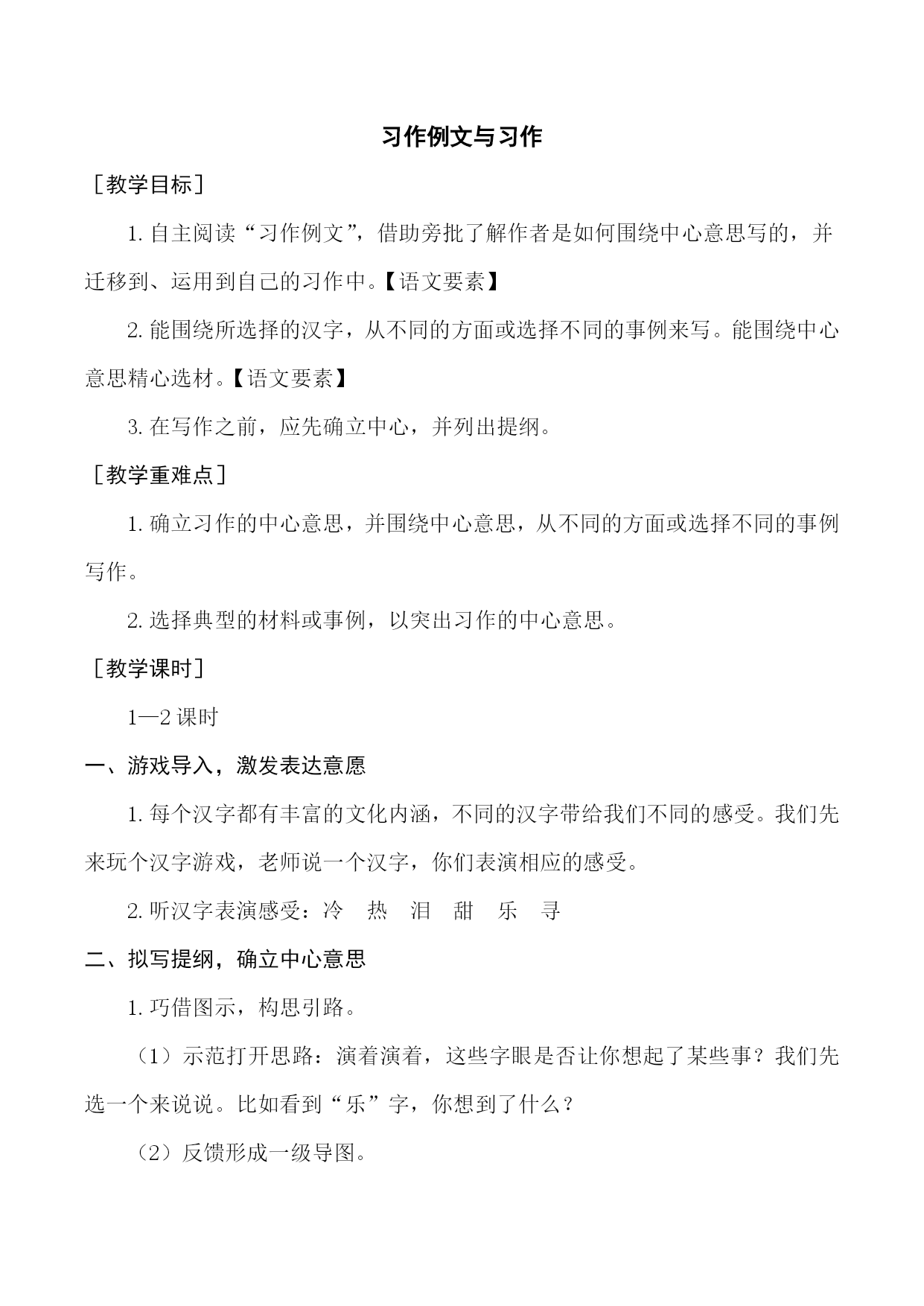 习作例文与习作[教学目标]1.自主阅读“习作例文”,借助旁批了解作者是如何围绕中心意思写的,并迁移到、运用到自己的习作中。【语文要素】2.能围绕所选择的汉字,从不同的方面或选择不同的事例来写。能围绕中心意思精心选材。【语文要素】3.在写作之前,应先确立中心,并列出提纲。[教学重难点]1.确立习作的中心意思,并围绕中心意思,从不同的方面或选择不同的事例写作。2.选择典型的材料或事例,以突出习作的中心意思。[教学课时]1—2课时一、游戏导入,激发表达意愿1.每个汉字都有丰富的文化内涵,不同的汉字带给我们不同的