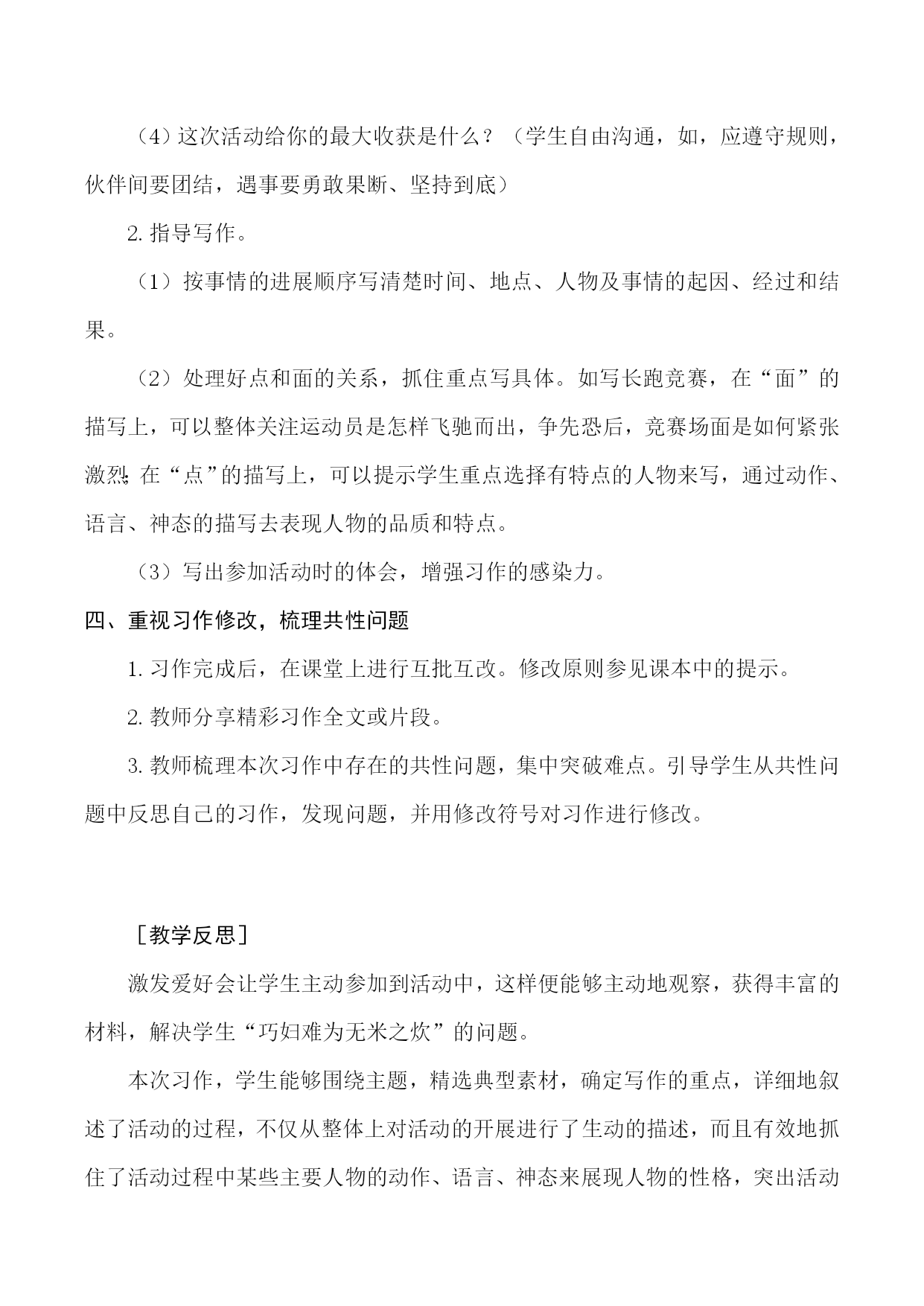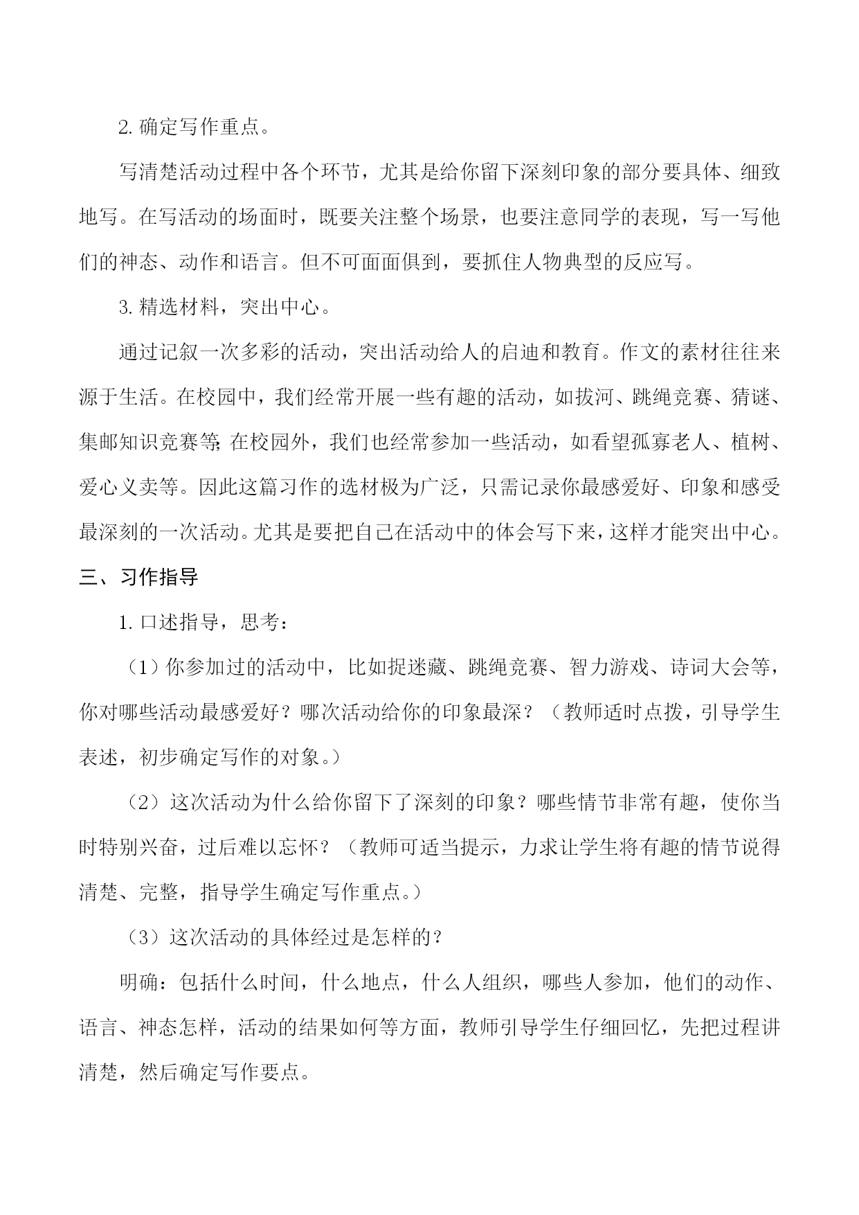 1.确定中心,围绕中心选材。2.让学生感受活动的快乐,并在活动中学会写作,激发学生对习作的兴趣。3.学会观察,培养学生的观察能力。能够抓住重点,把活动过程写清楚。4.尝试运用点面结合的写法写一次活动。“祖国在我心中”朗诵会、学校运动会、“六一”儿童节演出,植树、端午节看赛龙舟、看望孤寡老人……这些校内外活动,你参加过哪些?选一次活动写下来,和同学分享你的经历。除此之外,我们在写活动时,还要注意什么呢?通过记叙一次多彩的活动,突出活动给人的启迪和教育。作文的素材往往来源于生活。在校园中,我们经常开展一些有趣