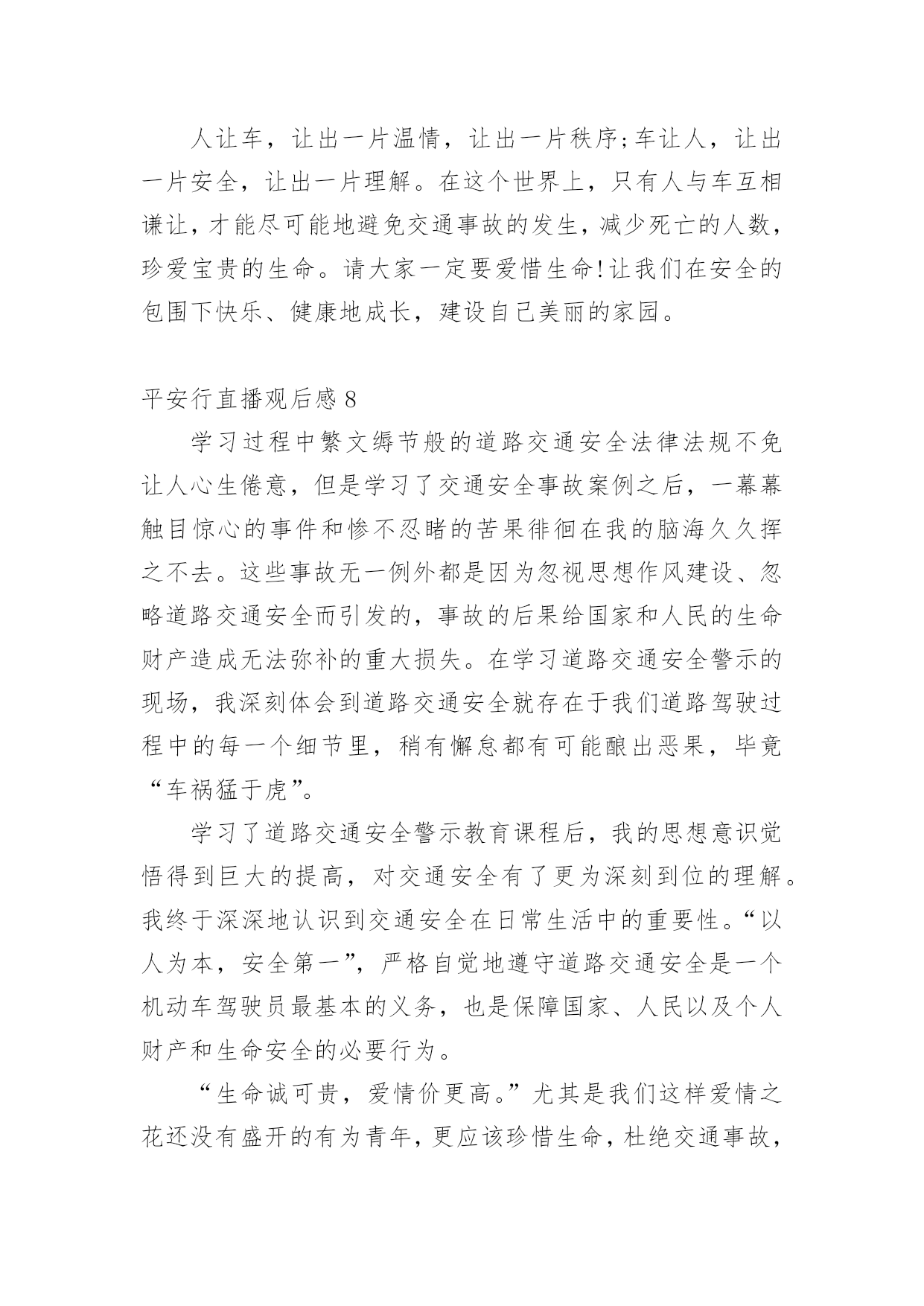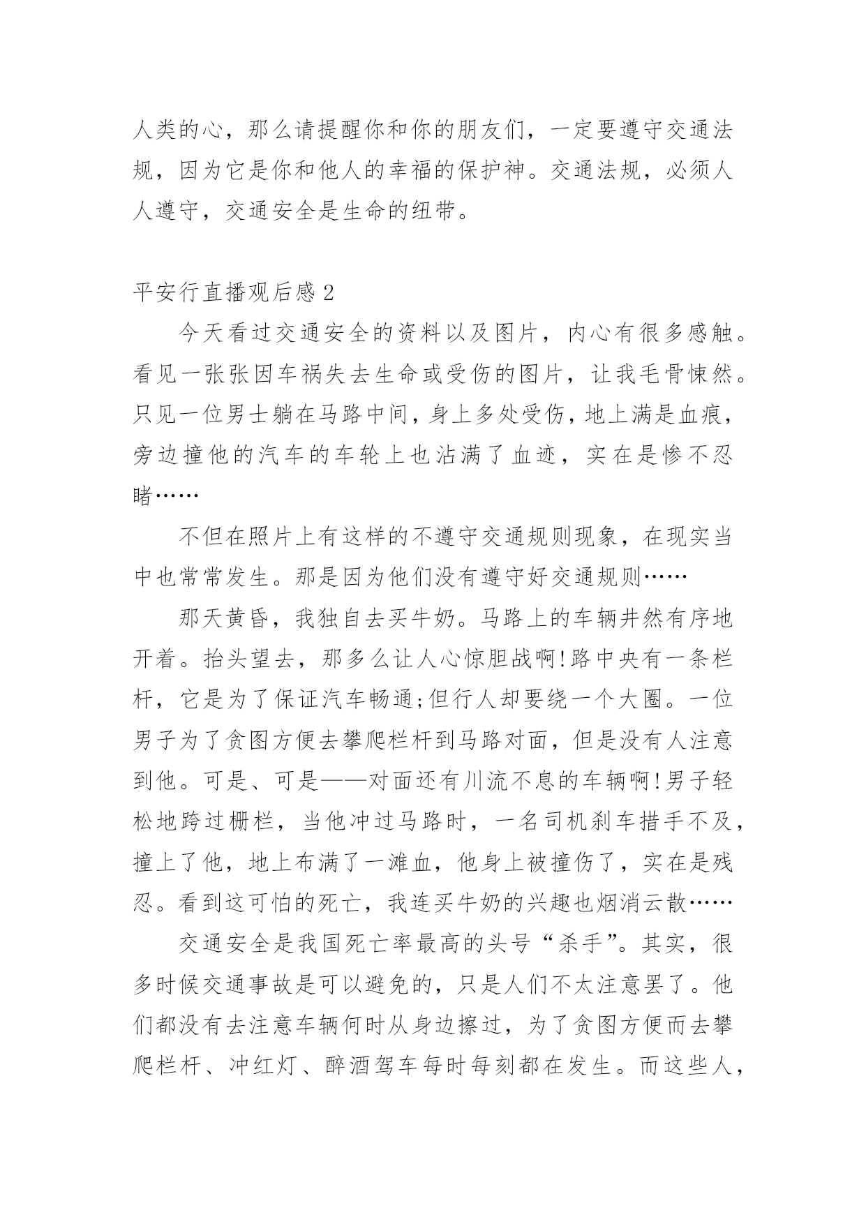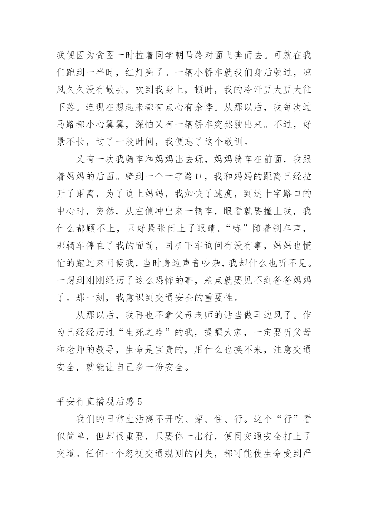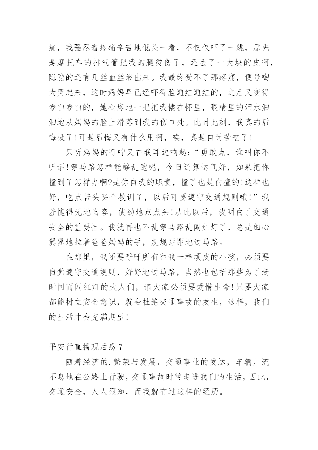 平安行直播观后感平安行2022直播观后感(精选13篇)看完一部经典作品以后,相信大家一定领会了不少东西,此时需要认真地做好记录,写写观后感了。为了让您不再为写观后感头疼,下面是小编整理的平安行2022直播观后感(精选13篇),欢迎大家借鉴与参考,希望对大家有所帮助。平安行直播观后感1说到“交通”这个词,大家总会把它与安全连在一起,因为它与我们的生命息息相关,随着社会的发展,交通事业为社会生产和人们生活提供了便利条件,与此同时,无休止的“马路战争”也时时处处威胁着我们的生命和财产安全,交通事故已成为社会的重大问题之一。由于一些人的交通安全意识不强,平坦的马路上演出了一场场人间悲剧,响起了一曲曲人生悲歌。朋友,当你看到无辜的生灵惨死在车轮下,听到失去亲人时催人心碎的哭声时,有谁不感到痛心?他们带走的是和谐,幸福,欢乐,留下的是灾难,痛苦,思念。这血的教训,生命的代价,难道还换不回我们遵守交通法规,时刻注意安全的自觉性吗?人生苦短,哪能半途而废?从小树立安全第一的思想,才能实现我们辉煌的梦想,幸福和欢乐才能永远半随着我们。亲爱的朋友们,当你沐浴着清晨的第一缕阳光,当你与亲人一起游玩,当你走在回家的路上,当你正为着理想而冲刺,你可曾意识到生命的可贵?如果你拥有一颗爱生命,爱人类的心,那么请提醒你和你的朋友们,一定要遵守交通法规,因为它是你和他人的幸福的保护神。交通法规,必须人人遵守,交通安全是生命的纽带。平安行直播观后感2今天看过交通安全的资料以及图片,内心有很多感触。看见一张张因车祸失去生命或受伤的图片,让我毛骨悚然。只见一位男士躺在马路中间,身上多处受伤,地上满是血痕,旁边撞他的汽车的车轮上也沾满了血迹,实在是惨不忍睹……不但在照片上有这样的不遵守交通规则现象,在现实当中也常常发生。那是因为他们没有遵守好交通规则……那天黄昏,我独自去买牛奶。马路上的车辆井然有序地开着。抬头望去,那多么让人心惊胆战啊!路中央有一条栏杆,它是为了保证汽车畅通;但行人却要绕一个大圈。一位男子为了贪图方便去攀爬栏杆到马路对面,但是没有人注意到他。可是、可是——对面还有川流不息的车辆啊!男子轻松地跨过栅栏,当他冲过马路时,一名司机刹车措手不及,撞上了他,地上布满了一滩血,他身上被撞伤了,实在是残忍。看到这可怕的死亡,我连买牛奶的兴趣也烟消云散……交通安全是我国死亡率最高的头号“杀手”。其实,很多时候交通事故是可以避免的,只是人们不太注意罢了。他们都没有去注意车辆何时从身边擦过,为了贪图方便而去攀爬栏杆、冲红灯、醉酒驾车每时每刻都在发生。而这些人,每时每刻都做着死亡的准备。生命不是一场游戏,生命只有一次,生命是珍贵的,无价的……你又怎能拿无价之宝来做方便的筹码呢?我知道了以后过马路要走斑马线,人行天桥,人行隧道……汽车的发明是给大家带来方便,而不是用方便换取生命,那值得吗?如果你今天遵守交通规则,你就能创造一个美好明天!平安行直播观后感3我们家楼下有一条马路,十分繁忙,每天傍晚,都会被密密匝匝的小汽车塞得水泄不通,红彤彤的汽车尾灯染红了整个街道。这都是那些在路边乱停汽车的叔叔、阿姨造成的结果。不知怎的,爸爸也“犯病”了。有一次,我上完了舞蹈课,爸爸妈妈开车来接我。刚从舞蹈学校车库出去,一辆面包车停在了车库道路连接公路的路口,所有出车库的车走得慢吞吞的,像树懒一样。爸爸费尽力气把车挤出门口,气愤地对面包车司机吼道:“你的车挡住了所有的车,难道你不知道在这里停车是违反规定的吗?”我觉得爸爸说得很正确,正要为他的勇气点赞时,妈妈却对爸爸说:“你这是‘路怒症’,得治治!”我问妈妈“路怒症”是什么,妈妈耐心地给我解释说:“‘路怒症’就是开车时爱发脾气,会影响交通安全的!”看着我似乎还没有听明白,妈妈进一步解释道,“司机在开车时应该相互礼让,即使对方违法规则,也要尽量文明礼貌地予以指出或劝说。”我朝爸爸笑了笑:“爸爸,你可不能有‘路怒症’哦!”过了几天,爸爸开车到学校来接我,我还没有出学校大门,就看到了他停在路边的白色车。当我走到车旁时,我才发现车后面就是不准停车的提示牌,这正是爸爸上学期教我认识的。上车之后,我心里犹豫了:“要不要提醒爸爸把车停在了不能停的地方呢?”最后,我大胆地指着交通提示牌批评道:“爸爸,你违反交通规则了,这里不能停车!”爸爸先是一惊,然后摸着头笑嘻嘻地说:“嘿嘿,尊敬的小警官,你批评得对!下次我再不敢乱停车了。”说完后,我和他都开心地笑了。今后,我还要继续帮爸爸“治病”,继续监督爸爸遵守交通规则。我也希望同学们的爸爸妈妈都遵守交通规则,那我们学校的周围和我们的城市将会变得更加平安,更加美丽!平安行直播观后感4从小我对交通安全方面的知识很薄弱,只知道红灯停,绿灯行,过马路要走斑马线这些连三岁小孩都懂的事。虽然交通安全父母和老师经常会提起,但我每