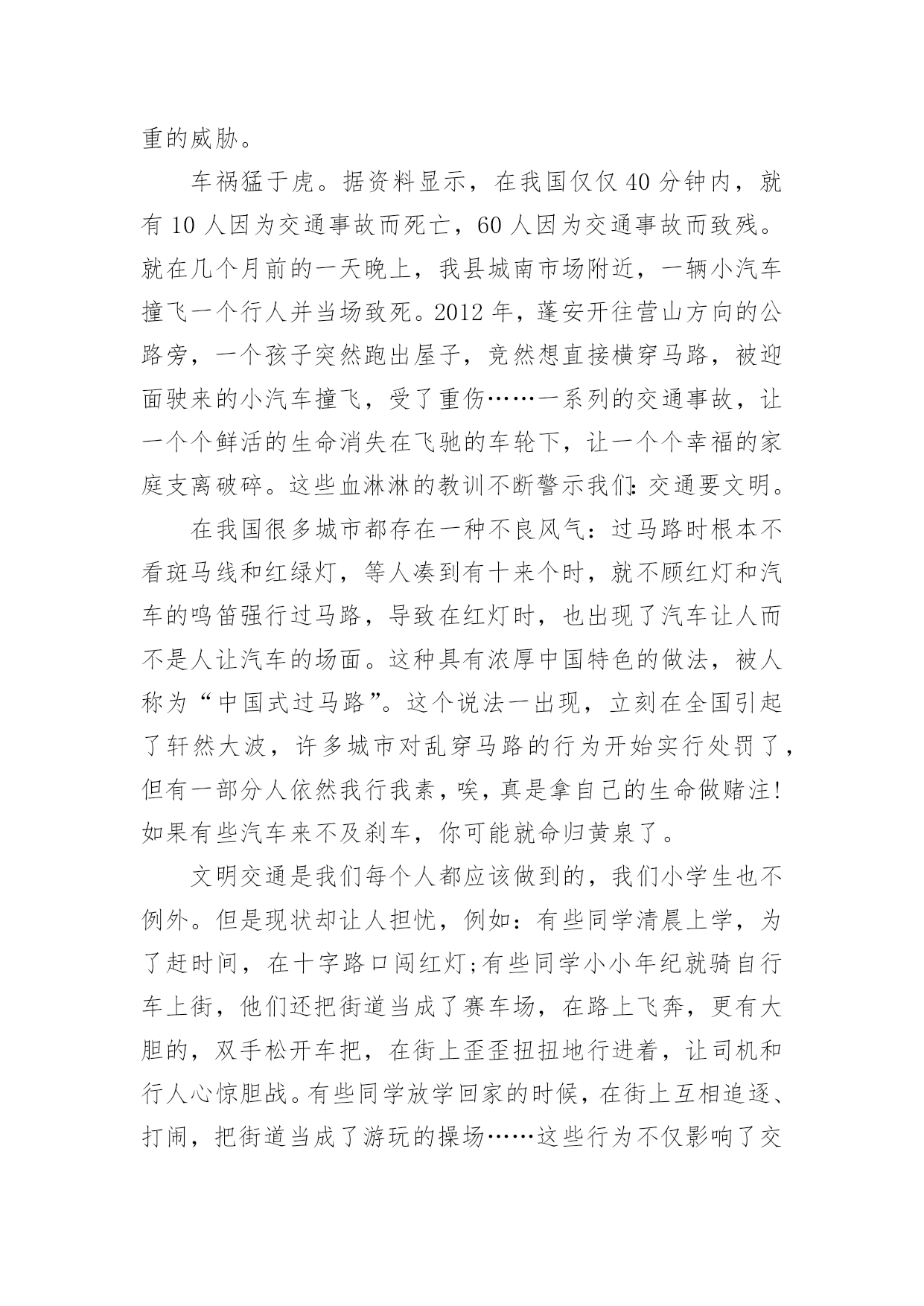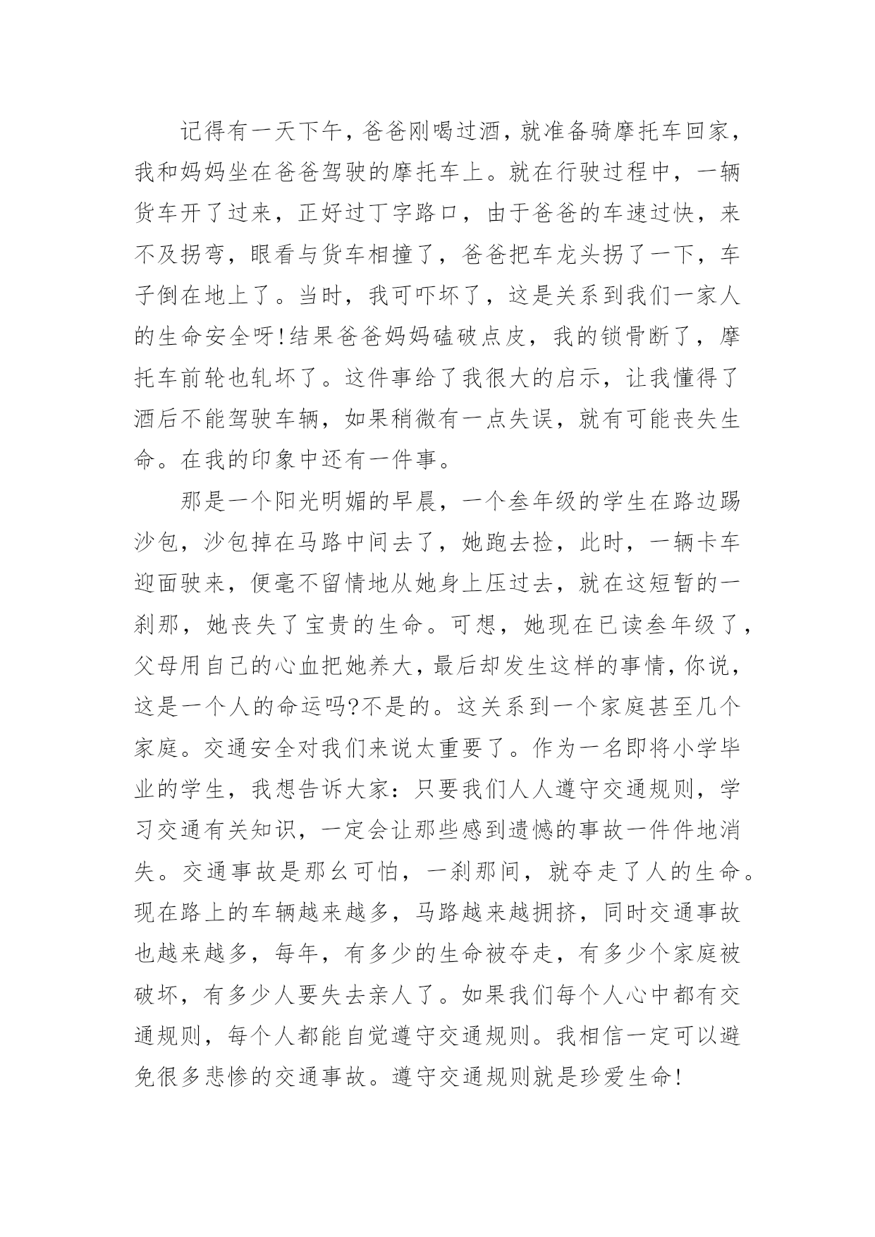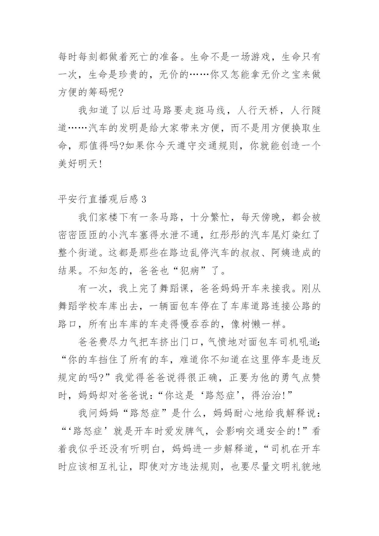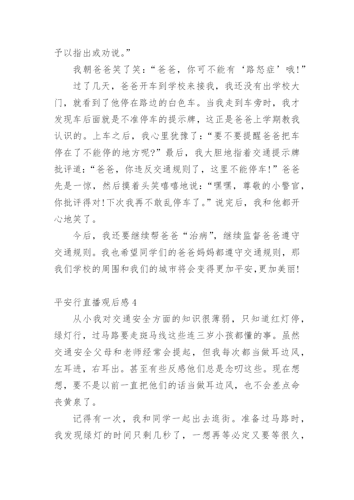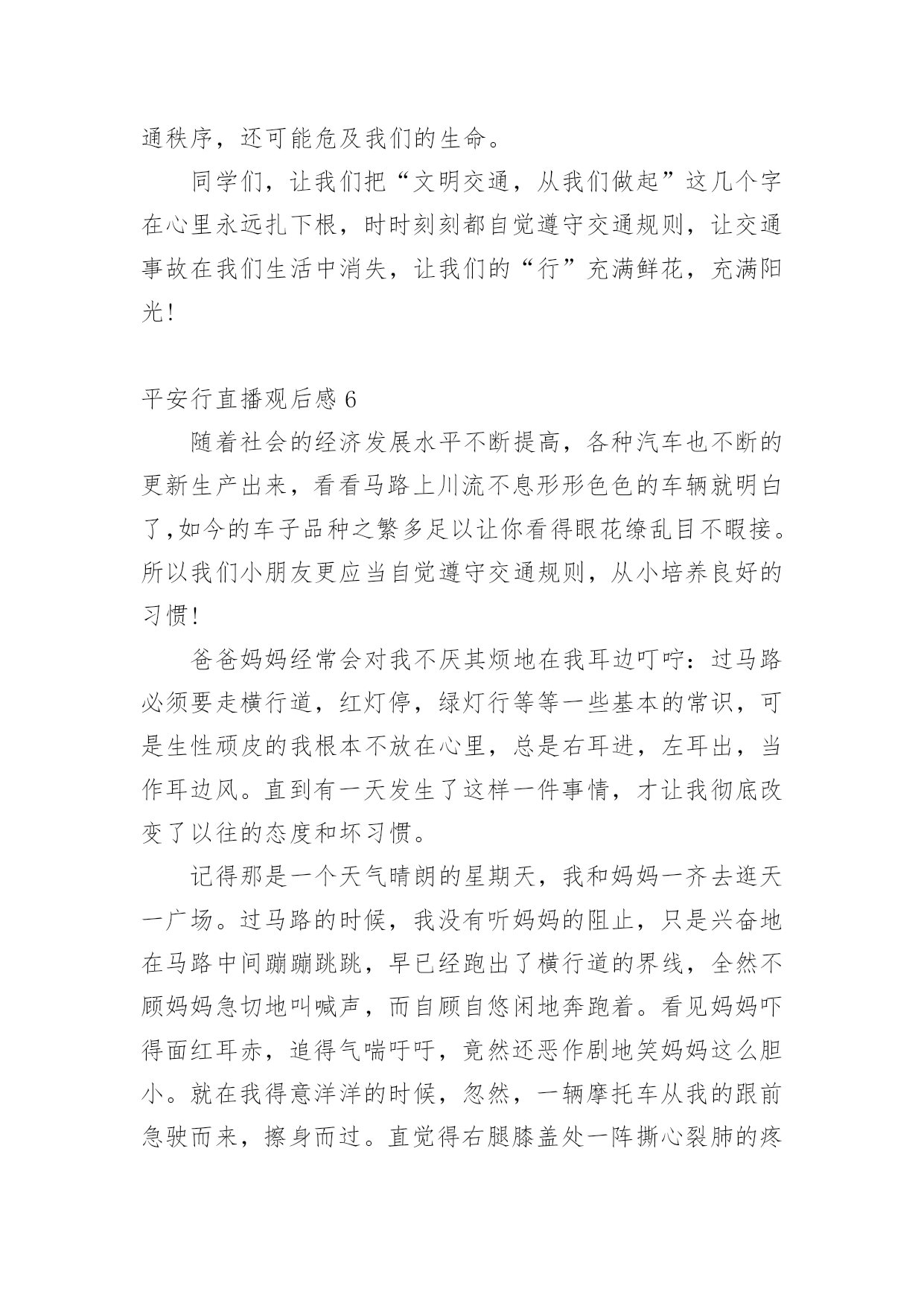 平安行直播观后感平安行2022直播观后感(精选13篇)看完一部经典作品以后,相信大家一定领会了不少东西,此时需要认真地做好记录,写写观后感了。为了让您不再为写观后感头疼,下面是小编整理的平安行2022直播观后感(精选13篇),欢迎大家借鉴与参考,希望对大家有所帮助。平安行直播观后感1说到“交通”这个词,大家总会把它与安全连在一起,因为它与我们的生命息息相关,随着社会的发展,交通事业为社会生产和人们生活提供了便利条件,与此同时,无休止的“马路战争”也时时处处威胁着我们的生命和财产安全,交通事故已成为社会的重大问题之一。由于一些人的交通安全意识不强,平坦的马路上演出了一场场人间悲剧,响起了一曲曲人生悲歌。朋友,当你看到无辜的生灵惨死在车轮下,听到失去亲人时催人心碎的哭声时,有谁不感到痛心?他们带走的是和谐,幸福,欢乐,留下的是灾难,痛苦,思念。这血的教训,生命的代价,难道还换不回我们遵守交通法规,时刻注意安全的自觉性吗?人生苦短,哪能半途而废?从小树立安全第一的思想,才能实现我们辉煌的梦想,幸福和欢乐才能永远半随着我们。亲爱的朋友们,当你沐浴着清晨的第一缕阳光,当你与亲人一起游玩,当你走在回家的路上,当你正为着理想而冲刺,你可曾意识到生命的可贵?如果你拥有一颗爱生命,爱人类的心,那么请提醒你和你的朋友们,一定要遵守交通法规,因为它是你和他人的幸福的保护神。交通法规,必须人人遵守,交通安全是生命的纽带。平安行直播观后感2今天看过交通安全的资料以及图片,内心有很多感触。看见一张张因车祸失去生命或受伤的图片,让我毛骨悚然。只见一位男士躺在马路中间,身上多处受伤,地上满是血痕,旁边撞他的汽车的车轮上也沾满了血迹,实在是惨不忍睹……不但在照片上有这样的不遵守交通规则现象,在现实当中也常常发生。那是因为他们没有遵守好交通规则……那天黄昏,我独自去买牛奶。马路上的车辆井然有序地开着。抬头望去,那多么让人心惊胆战啊!路中央有一条栏杆,它是为了保证汽车畅通;但行人却要绕一个大圈。一位男子为了贪图方便去攀爬栏杆到马路对面,但是没有人注意到他。可是、可是——对面还有川流不息的车辆啊!男子轻松地跨过栅栏,当他冲过马路时,一名司机刹车措手不及,撞上了他,地上布满了一滩血,他身上被撞伤了,实在是残忍。看到这可怕的死亡,我连买牛奶的兴趣也烟消云散……交通安全是我国死亡率最高的头号“杀手”。其实,很多时候交通事故是可以避免的,只是人们不太注意罢了。他们都没有去注意车辆何时从身边擦过,为了贪图方便而去攀爬栏杆、冲红灯、醉酒驾车每时每刻都在发生。而这些人,每时每刻都做着死亡的准备。生命不是一场游戏,生命只有一次,生命是珍贵的,无价的……你又怎能拿无价之宝来做方便的筹码呢?我知道了以后过马路要走斑马线,人行天桥,人行隧道……汽车的发明是给大家带来方便,而不是用方便换取生命,那值得吗?如果你今天遵守交通规则,你就能创造一个美好明天!平安行直播观后感3我们家楼下有一条马路,十分繁忙,每天傍晚,都会被密密匝匝的小汽车塞得水泄不通,红彤彤的汽车尾灯染红了整个街道。这都是那些在路边乱停汽车的叔叔、阿姨造成的结果。不知怎的,爸爸也“犯病”了。有一次,我上完了舞蹈课,爸爸妈妈开车来接我。刚从舞蹈学校车库出去,一辆面包车停在了车库道路连接公路的路口,所有出车库的车走得慢吞吞的,像树懒一样。爸爸费尽力气把车挤出门口,气愤地对面包车司机吼道:“你的车挡住了所有的车,难道你不知道在这里停车是违反规定的吗?”我觉得爸爸说得很正确,正要为他的勇气点赞时,妈妈却对爸爸说:“你这是‘路怒症’,得治治!”我问妈妈“路怒症”是什么,妈妈耐心地给我解释说:“‘路怒症’就是开车时爱发脾气,会影响交通安全的!”看着我似乎还没有听明白,妈妈进一步解释道,“司机在开车时应该相互礼让,即使对方违法规则,也要尽量文明礼貌地予以指出或劝说。”我朝爸爸笑了笑:“爸爸,你可不能有‘路怒症’哦!”过了几天,爸爸开车到学校来接我,我还没有出学校大门,就看到了他停在路边的白色车。当我走到车旁时,我才发现车后面就是不准停车的提示牌,这正是爸爸上学期教我认识的。上车之后,我心里犹豫了:“要不要提醒爸爸把车停在了不能停的地方呢?”最后,我大胆地指着交通提示牌批评道:“爸爸,你违反交通规则了,这里不能停车!”爸爸先是一惊,然后摸着头笑嘻嘻地说:“嘿嘿,尊敬的小警官,你批评得对!下次我再不敢乱停车了。”说完后,我和他都开心地笑了。今后,我还要继续帮爸爸“治病”,继续监督爸爸遵守交通规则。我也希望同学们的爸爸妈妈都遵守交通规则,那我们学校的周围和我们的城市将会变得更加平安,更加美丽!平安行直播观后感4从小我对交通安全方面的知识很薄弱,只知道红灯停,绿灯行,过马路要走斑马线这些连三岁小孩都懂的事。虽然交通安全父母和老师经常会提起,但我每