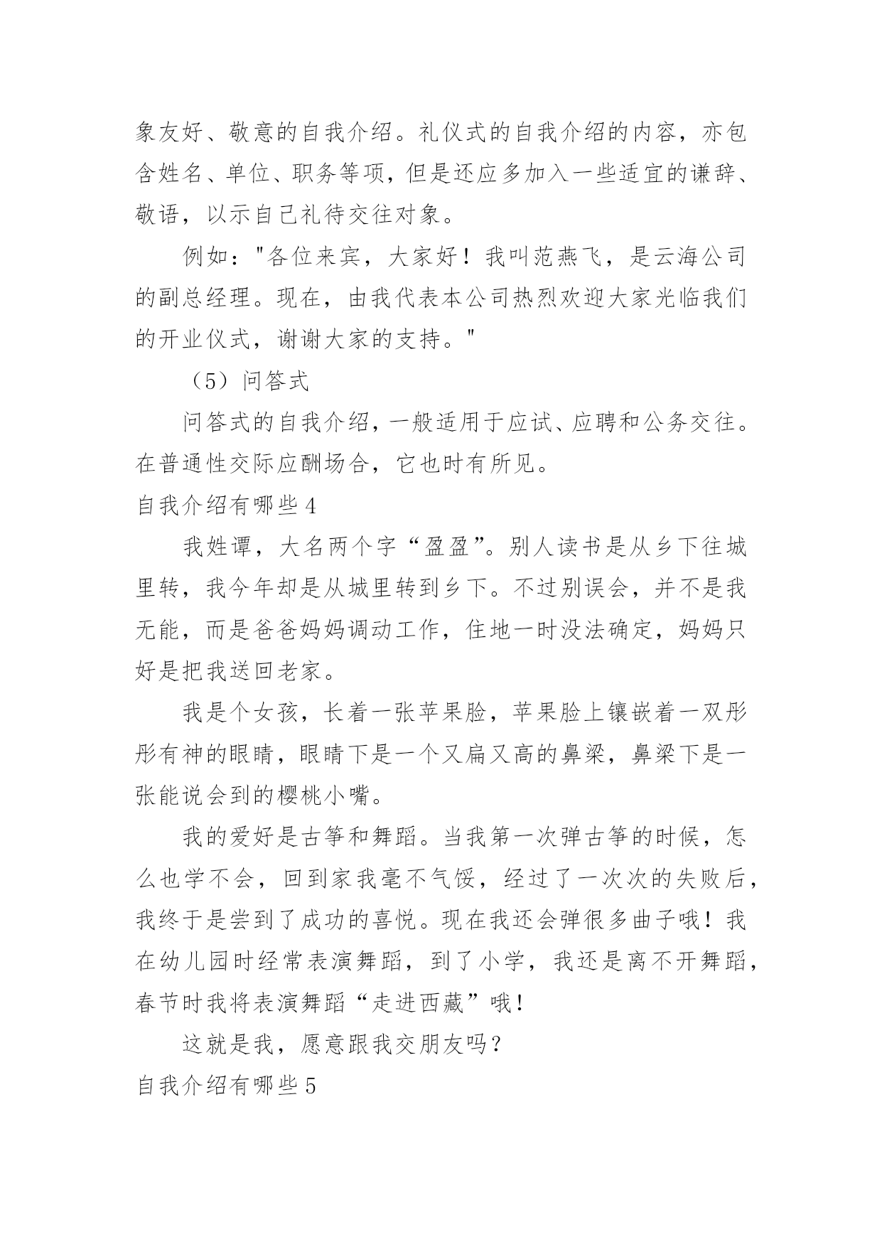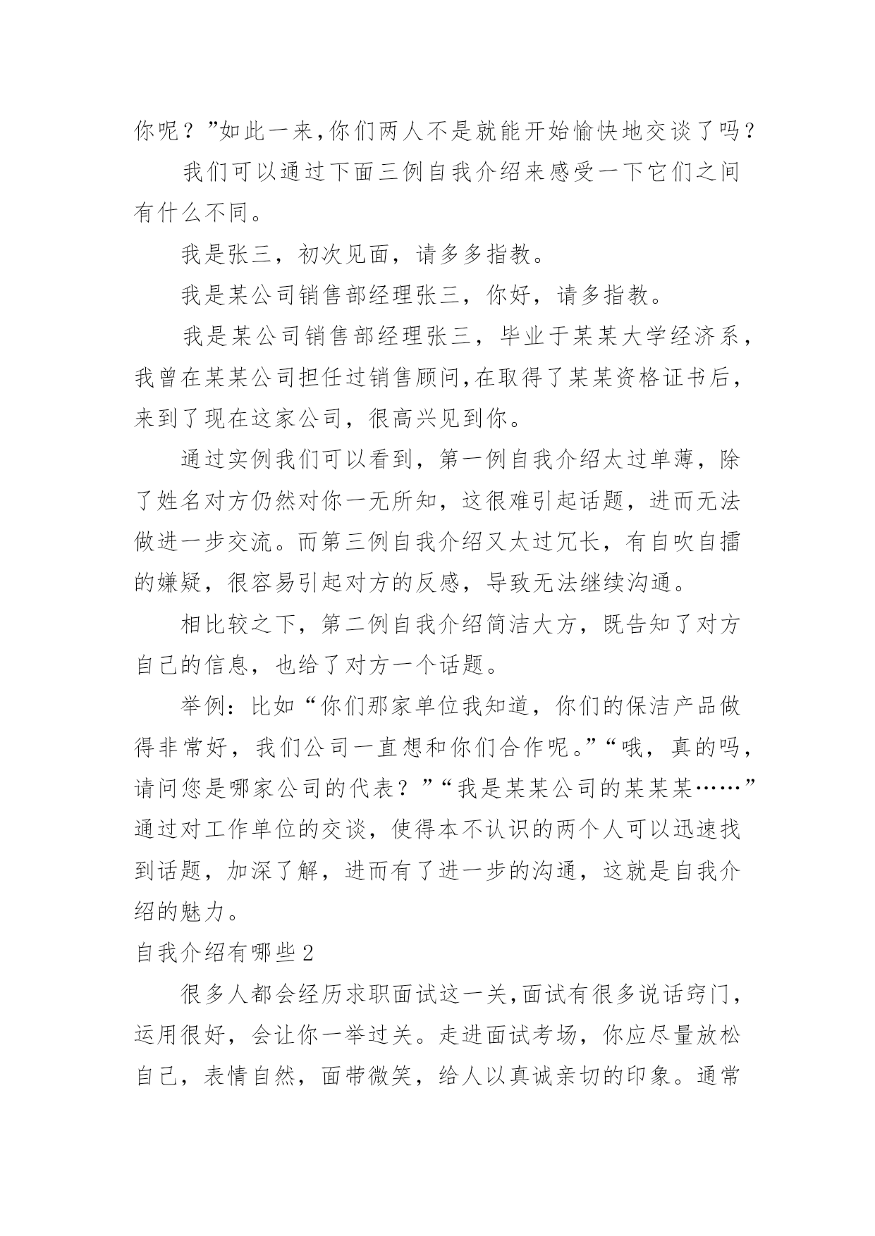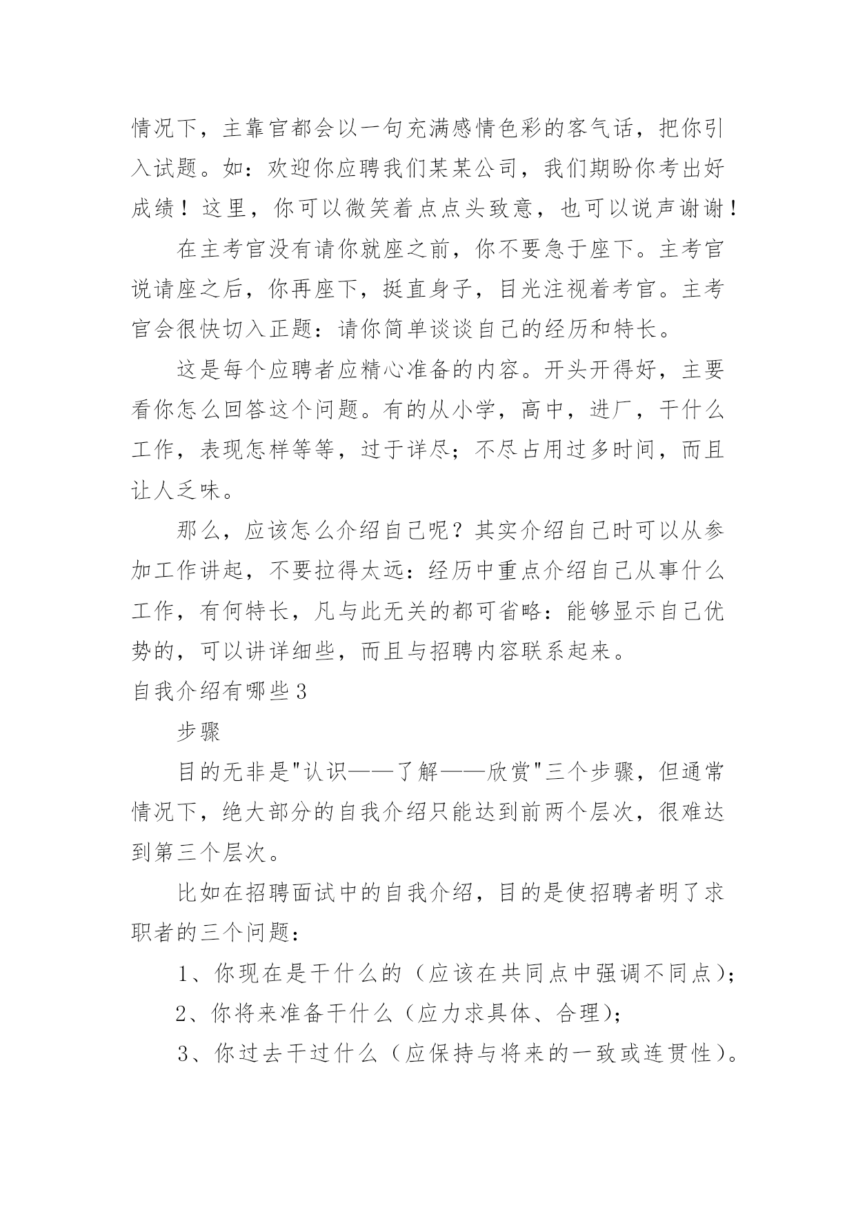 自我介绍有哪些自我介绍有哪些当进入一个新环境,我们总归要向他人介绍自己,自我介绍是结识新朋友的重要手段。你所见过的自我介绍是什么样的呢?下面是小编精心整理的自我介绍有哪些,欢迎大家借鉴与参考,希望对大家有所帮助。自我介绍有哪些1中山卡耐基口才学校小编举例:“我是某某学院学生张宇,我将用3个关键词来介绍自己。”张宇这个别致的自我介绍立刻让面试官抬起头,坐正身子认真听起来。张宇的3个关键词分别是“社团”“比赛”“实习”,随后他分别举了几个例子证明他的领导力、沟通力、团队合作能力很强,面试官听得频频点头。如果我们在自我介绍时只告诉对方自己的名字,那并不能帮助对方对我们有全方位的认识,我们传递的信息太少,也就使得对方对我们无从了解。所以,当我们介绍完自己的姓名后,可以简单补充一些个人经历、爱好和见识,使对方能更进一步了解你。举例:比如当你补充说明:“我喜欢听音乐。”对方也许十分高兴地问你:“真的吗?我也很喜欢。那你都喜欢听哪种类型的音乐呢?”只要你接着回答:“流行乐和摇滚,那你呢?”如此一来,你们两人不是就能开始愉快地交谈了吗?我们可以通过下面三例自我介绍来感受一下它们之间有什么不同。我是张三,初次见面,请多多指教。我是某公司销售部经理张三,你好,请多指教。我是某公司销售部经理张三,毕业于某某大学经济系,我曾在某某公司担任过销售顾问,在取得了某某资格证书后,来到了现在这家公司,很高兴见到你。通过实例我们可以看到,第一例自我介绍太过单薄,除了姓名对方仍然对你一无所知,这很难引起话题,进而无法做进一步交流。而第三例自我介绍又太过冗长,有自吹自擂的嫌疑,很容易引起对方的反感,导致无法继续沟通。相比较之下,第二例自我介绍简洁大方,既告知了对方自己的信息,也给了对方一个话题。举例:比如“你们那家单位我知道,你们的保洁产品做得非常好,我们公司一直想和你们合作呢。”“哦,真的吗,请问您是哪家公司的代表?”“我是某某公司的某某某……”通过对工作单位的交谈,使得本不认识的两个人可以迅速找到话题,加深了解,进而有了进一步的沟通,这就是自我介绍的魅力。自我介绍有哪些2很多人都会经历求职面试这一关,面试有很多说话窍门,运用很好,会让你一举过关。走进面试考场,你应尽量放松自己,表情自然,面带微笑,给人以真诚亲切的印象。通常情况下,主靠官都会以一句充满感情色彩的客气话,把你引入试题。如:欢迎你应聘我们某某公司,我们期盼你考出好成绩!这里,你可以微笑着点点头致意,也可以说声谢谢!在主考官没有请你就座之前,你不要急于座下。主考官说请座之后,你再座下,挺直身子,目光注视着考官。主考官会很快切入正题:请你简单谈谈自己的经历和特长。这是每个应聘者应精心准备的内容。开头开得好,主要看你怎么回答这个问题。有的从小学,高中,进厂,干什么工作,表现怎样等等,过于详尽;不尽占用过多时间,而且让人乏味。那么,应该怎么介绍自己呢?其实介绍自己时可以从参加工作讲起,不要拉得太远:经历中重点介绍自己从事什么工作,有何特长,凡与此无关的都可省略:能够显示自己优势的,可以讲详细些,而且与招聘内容联系起来。自我介绍有哪些3步骤目的无非是"认识——了解——欣赏"三个步骤,但通常情况下,绝大部分的自我介绍只能达到前两个层次,很难达到第三个层次。比如在招聘面试中的自我介绍,目的是使招聘者明了求职者的三个问题:1、你现在是干什么的(应该在共同点中强调不同点);2、你将来准备干什么(应力求具体、合理);3、你过去干过什么(应保持与将来的一致或连贯性)。表现形式鉴于需要进行自我介绍的时机多有不同,因而进行自我介绍时的表达方法便有所不同。自我介绍的内容是指自我介绍时所表述的主体部分,即在自我介绍时表述的具体形式。确定自我介绍的具体内容,应兼顾实际需要、所处场景,并应具有鲜明的针对性,切不可"千人一面",一概而论。依照自我介绍时表述的内容的不同,自我介绍可以分为下述五种具体形式:(1)应酬式应酬式的自我介绍,适用于某些公共场合和一般性的社交场合,如旅行途中、宴会厅里、舞场之上、通电话时。它的对象,主要是进行一般接触的交往对象。对介绍者而言,对方属于泛泛之交,或者早已熟悉,进行自我介绍只不过是为了确认身份而已,故此种自我介绍内容要少而精。应酬式的自我介绍内容最为简洁,往往只包括姓名一项即可。例如:"您好!我的名字叫张路"。"我是雍纹岩"。(2)工作式工作式的自我介绍,主要适用于工作之中。它是以工作为自我介绍的中心;因工作而交际,因工作而交友。有时,它也叫公务式的自我介绍。工作式的自我介绍的内容,应当包括本人姓名、供职的单位及其部门、担负的职务或从事的具体工作等三项。他们叫作工作式自我介绍内容的三要素,通常缺一不可。其中,第一项姓名,应当一口报出,不可有姓无名,或有名无姓。第二项供职的单位及其部门,有可能最好全