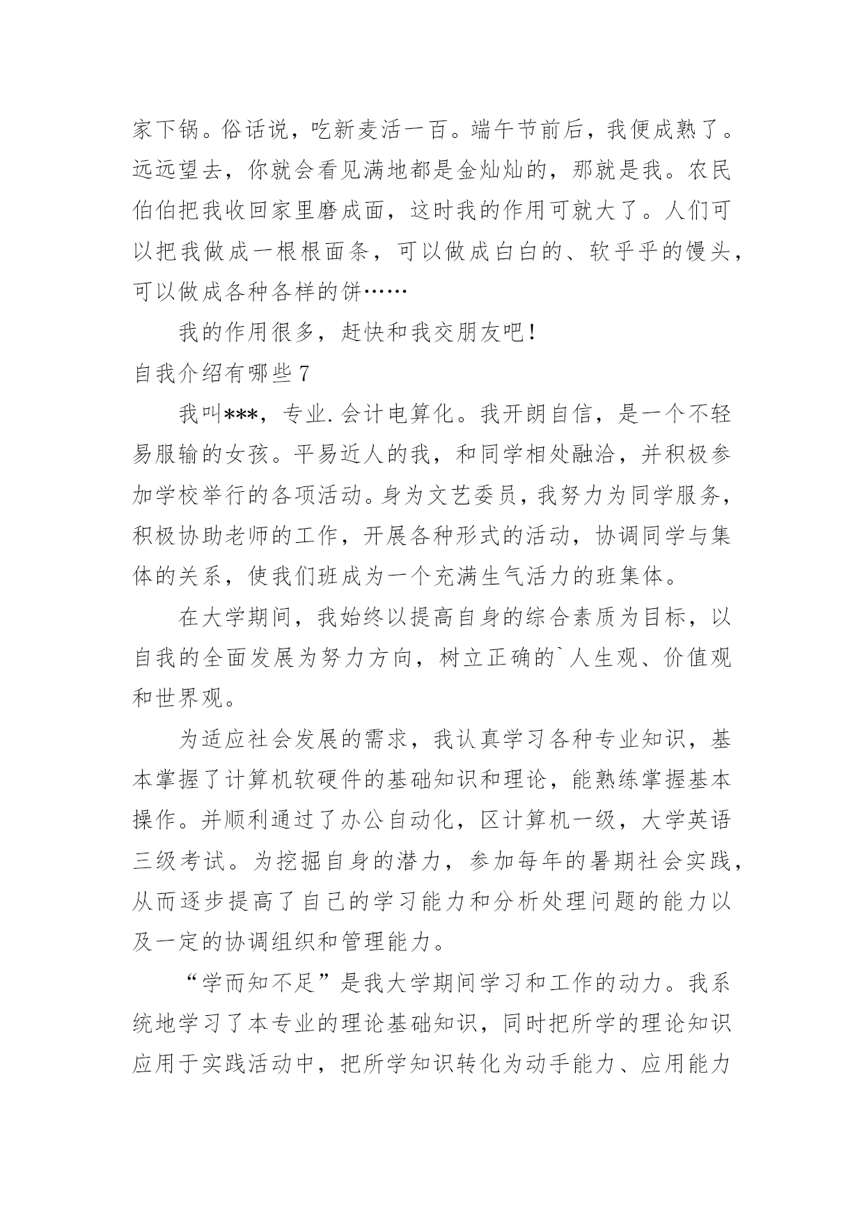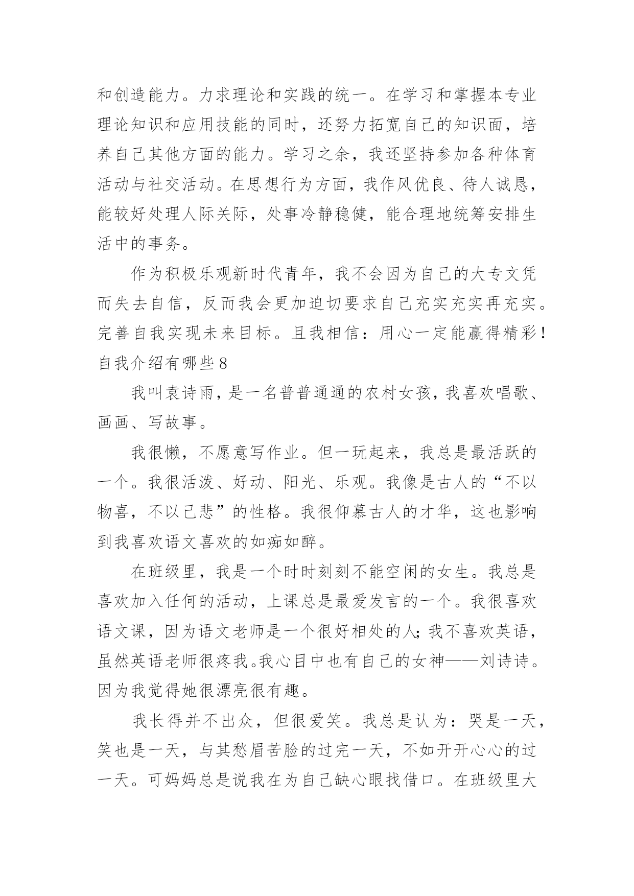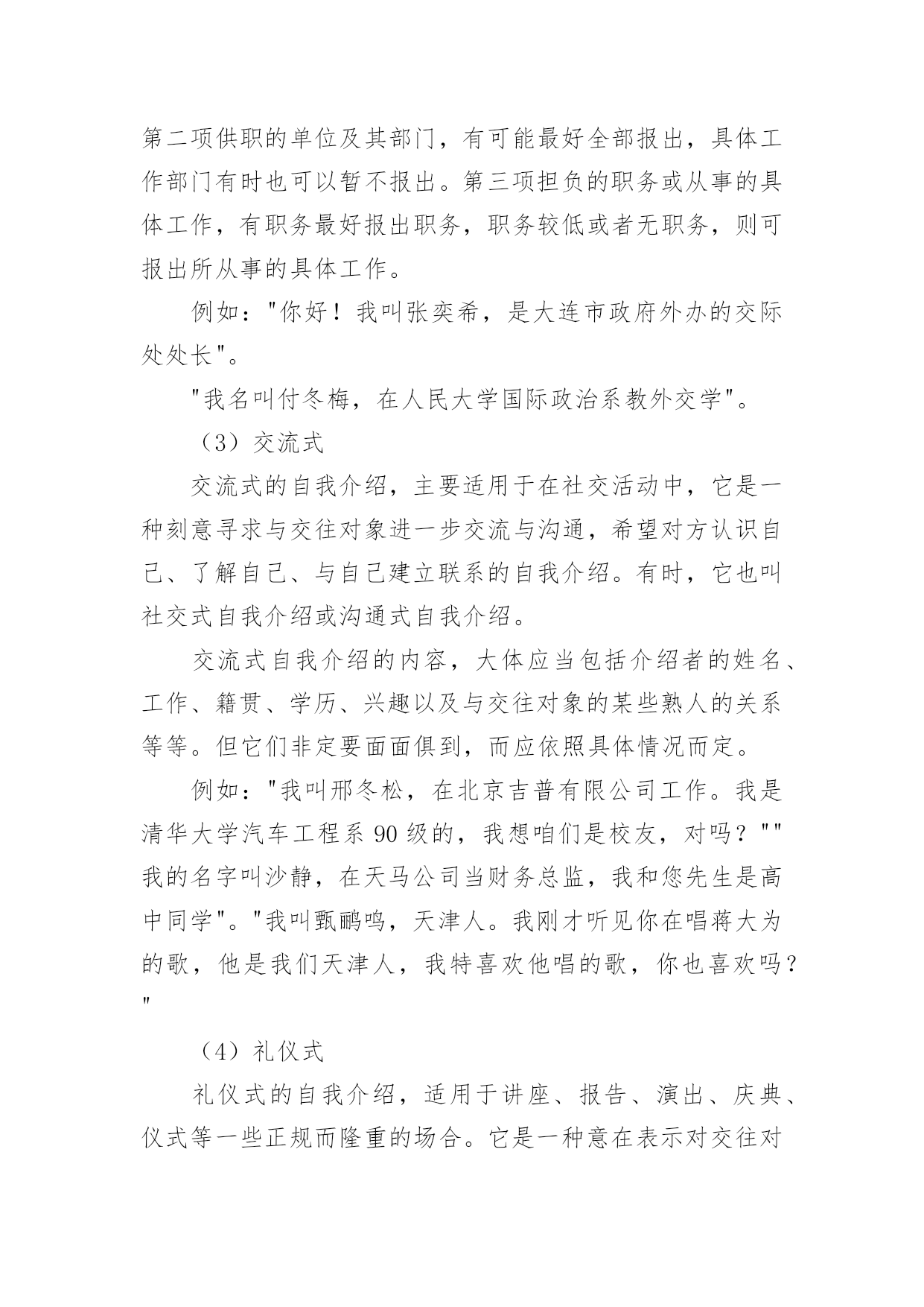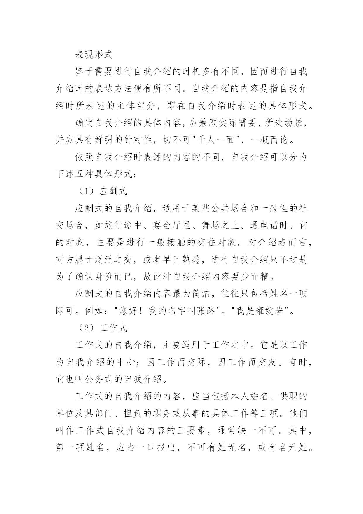 自我介绍有哪些自我介绍有哪些当进入一个新环境,我们总归要向他人介绍自己,自我介绍是结识新朋友的重要手段。你所见过的自我介绍是什么样的呢?下面是小编精心整理的自我介绍有哪些,欢迎大家借鉴与参考,希望对大家有所帮助。自我介绍有哪些1中山卡耐基口才学校小编举例:“我是某某学院学生张宇,我将用3个关键词来介绍自己。”张宇这个别致的自我介绍立刻让面试官抬起头,坐正身子认真听起来。张宇的3个关键词分别是“社团”“比赛”“实习”,随后他分别举了几个例子证明他的领导力、沟通力、团队合作能力很强,面试官听得频频点头。如果我们在自我介绍时只告诉对方自己的名字,那并不能帮助对方对我们有全方位的认识,我们传递的信息太少,也就使得对方对我们无从了解。所以,当我们介绍完自己的姓名后,可以简单补充一些个人经历、爱好和见识,使对方能更进一步了解你。举例:比如当你补充说明:“我喜欢听音乐。”对方也许十分高兴地问你:“真的吗?我也很喜欢。那你都喜欢听哪种类型的音乐呢?”只要你接着回答:“流行乐和摇滚,那你呢?”如此一来,你们两人不是就能开始愉快地交谈了吗?我们可以通过下面三例自我介绍来感受一下它们之间有什么不同。我是张三,初次见面,请多多指教。我是某公司销售部经理张三,你好,请多指教。我是某公司销售部经理张三,毕业于某某大学经济系,我曾在某某公司担任过销售顾问,在取得了某某资格证书后,来到了现在这家公司,很高兴见到你。通过实例我们可以看到,第一例自我介绍太过单薄,除了姓名对方仍然对你一无所知,这很难引起话题,进而无法做进一步交流。而第三例自我介绍又太过冗长,有自吹自擂的嫌疑,很容易引起对方的反感,导致无法继续沟通。相比较之下,第二例自我介绍简洁大方,既告知了对方自己的信息,也给了对方一个话题。举例:比如“你们那家单位我知道,你们的保洁产品做得非常好,我们公司一直想和你们合作呢。”“哦,真的吗,请问您是哪家公司的代表?”“我是某某公司的某某某……”通过对工作单位的交谈,使得本不认识的两个人可以迅速找到话题,加深了解,进而有了进一步的沟通,这就是自我介绍的魅力。自我介绍有哪些2很多人都会经历求职面试这一关,面试有很多说话窍门,运用很好,会让你一举过关。走进面试考场,你应尽量放松自己,表情自然,面带微笑,给人以真诚亲切的印象。通常情况下,主靠官都会以一句充满感情色彩的客气话,把你引入试题。如:欢迎你应聘我们某某公司,我们期盼你考出好成绩!这里,你可以微笑着点点头致意,也可以说声谢谢!在主考官没有请你就座之前,你不要急于座下。主考官说请座之后,你再座下,挺直身子,目光注视着考官。主考官会很快切入正题:请你简单谈谈自己的经历和特长。这是每个应聘者应精心准备的内容。开头开得好,主要看你怎么回答这个问题。有的从小学,高中,进厂,干什么工作,表现怎样等等,过于详尽;不尽占用过多时间,而且让人乏味。那么,应该怎么介绍自己呢?其实介绍自己时可以从参加工作讲起,不要拉得太远:经历中重点介绍自己从事什么工作,有何特长,凡与此无关的都可省略:能够显示自己优势的,可以讲详细些,而且与招聘内容联系起来。自我介绍有哪些3步骤目的无非是"认识——了解——欣赏"三个步骤,但通常情况下,绝大部分的自我介绍只能达到前两个层次,很难达到第三个层次。比如在招聘面试中的自我介绍,目的是使招聘者明了求职者的三个问题:1、你现在是干什么的(应该在共同点中强调不同点);2、你将来准备干什么(应力求具体、合理);3、你过去干过什么(应保持与将来的一致或连贯性)。表现形式鉴于需要进行自我介绍的时机多有不同,因而进行自我介绍时的表达方法便有所不同。自我介绍的内容是指自我介绍时所表述的主体部分,即在自我介绍时表述的具体形式。确定自我介绍的具体内容,应兼顾实际需要、所处场景,并应具有鲜明的针对性,切不可"千人一面",一概而论。依照自我介绍时表述的内容的不同,自我介绍可以分为下述五种具体形式:(1)应酬式应酬式的自我介绍,适用于某些公共场合和一般性的社交场合,如旅行途中、宴会厅里、舞场之上、通电话时。它的对象,主要是进行一般接触的交往对象。对介绍者而言,对方属于泛泛之交,或者早已熟悉,进行自我介绍只不过是为了确认身份而已,故此种自我介绍内容要少而精。应酬式的自我介绍内容最为简洁,往往只包括姓名一项即可。例如:"您好!我的名字叫张路"。"我是雍纹岩"。(2)工作式工作式的自我介绍,主要适用于工作之中。它是以工作为自我介绍的中心;因工作而交际,因工作而交友。有时,它也叫公务式的自我介绍。工作式的自我介绍的内容,应当包括本人姓名、供职的单位及其部门、担负的职务或从事的具体工作等三项。他们叫作工作式自我介绍内容的三要素,通常缺一不可。其中,第一项姓名,应当一口报出,不可有姓无名,或有名无姓。第二项供职的单位及其部门,有可能最好全
