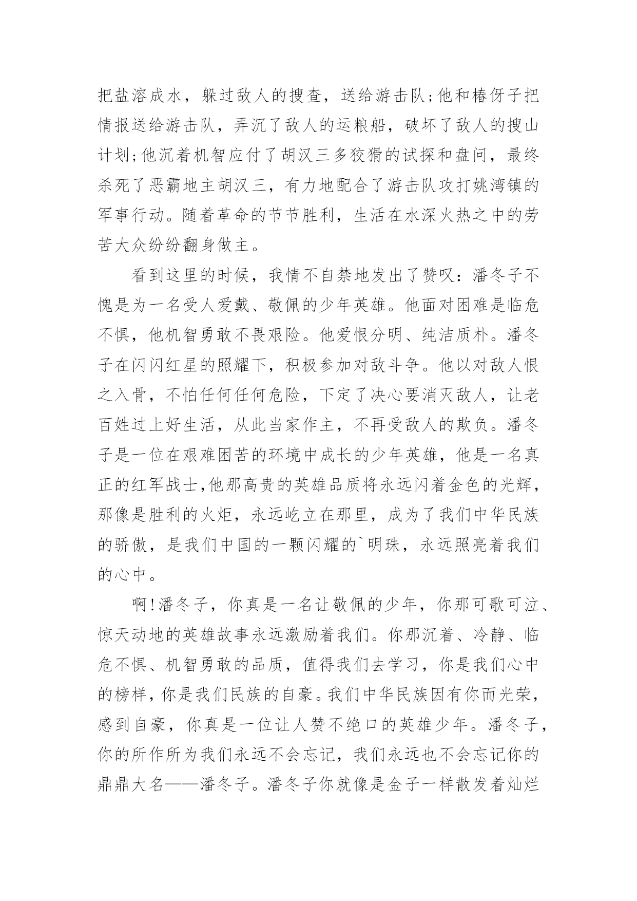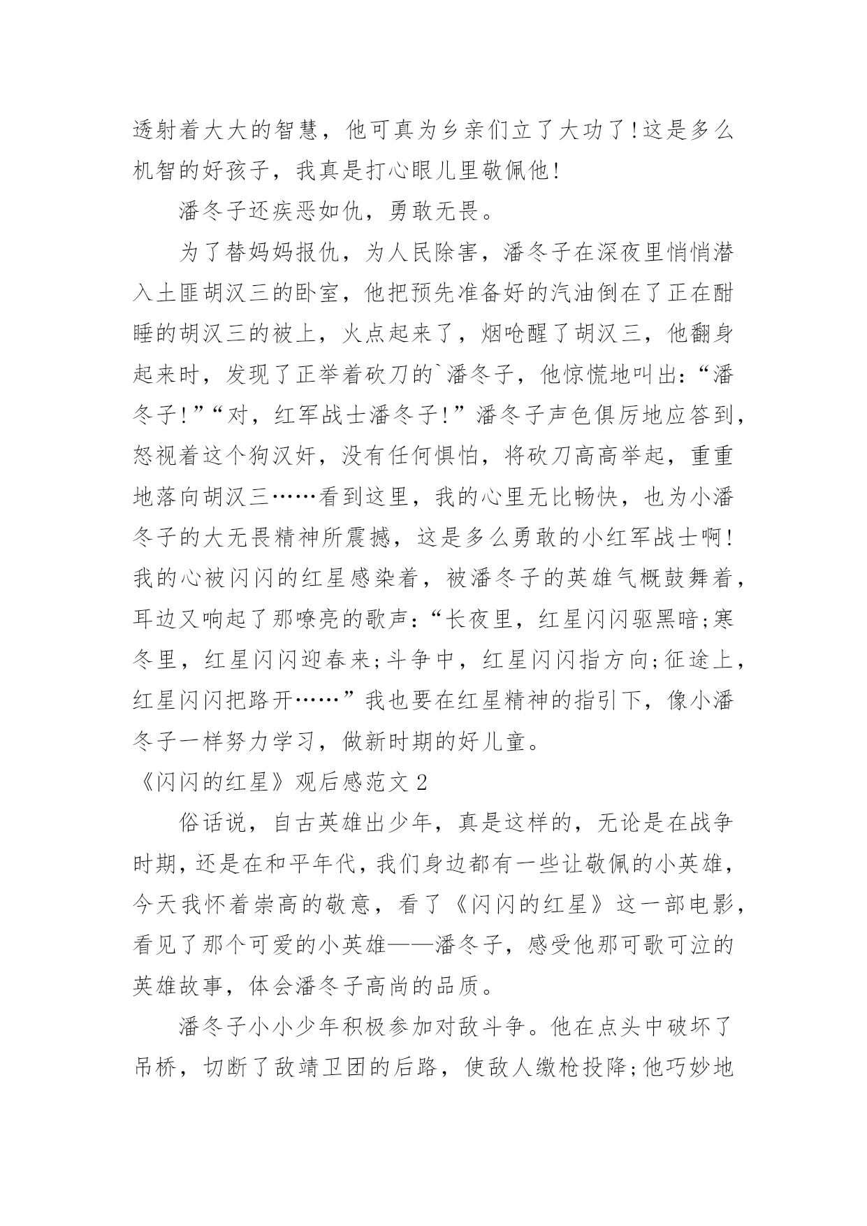 《闪闪的红星》观后感《闪闪的红星》观后感范文当观看完一部作品后,相信你一定有很多值得分享的收获,这时候,最关键的观后感怎么能落下!可是观后感怎么写才合适呢?以下是小编为大家整理的《闪闪的红星》观后感范文,仅供参考,希望能够帮助到大家。《闪闪的红星》观后感范文1看完了影片《闪闪的红星》,我的心激动不已。那催人奋进的歌声依然在我的耳边萦绕:“红星闪闪,放光彩,红星灿灿,暖胸怀,红星是咱工农的心,党的光辉照万代……”是啊,是那红星的闪闪光芒照耀着小潘冬子快乐地成长,是那红星的战斗精神激励着小潘冬子成了一名真正的红军战士。影片中最感染我的是小潘冬子的机智和勇敢。坏蛋胡汉三的米店里储藏着许多大米,可他故意挂出招牌“今日无米”,以此来抬高米价,并且粮食运送出去赚钱。潘冬子把农民们的疾苦看在眼里,记在心上,他连夜将情报送了出去,并将牌子上的“无”字改了“售”字,这样乡亲们全都集聚在胡汉三的店外,敲门的敲门,喊叫的喊叫,可他们就是不卖米,激起了民愤,大家冲向江边,一拥而上,将还没运走的两万斤粮食一抢而空。看到这里,同学们都情不自禁地呐喊起来,拍起掌来,为的是潘冬子那小小的人却透射着大大的智慧,他可真为乡亲们立了大功了!这是多么机智的好孩子,我真是打心眼儿里敬佩他!潘冬子还疾恶如仇,勇敢无畏。为了替妈妈报仇,为人民除害,潘冬子在深夜里悄悄潜入土匪胡汉三的卧室,他把预先准备好的汽油倒在了正在酣睡的胡汉三的被上,火点起来了,烟呛醒了胡汉三,他翻身起来时,发现了正举着砍刀的`潘冬子,他惊慌地叫出:“潘冬子!”“对,红军战士潘冬子!”潘冬子声色俱厉地应答到,怒视着这个狗汉奸,没有任何惧怕,将砍刀高高举起,重重地落向胡汉三……看到这里,我的心里无比畅快,也为小潘冬子的大无畏精神所震撼,这是多么勇敢的小红军战士啊!我的心被闪闪的红星感染着,被潘冬子的英雄气概鼓舞着,耳边又响起了那嘹亮的歌声:“长夜里,红星闪闪驱黑暗;寒冬里,红星闪闪迎春来;斗争中,红星闪闪指方向;征途上,红星闪闪把路开……”我也要在红星精神的指引下,像小潘冬子一样努力学习,做新时期的好儿童。《闪闪的红星》观后感范文2俗话说,自古英雄出少年,真是这样的,无论是在战争时期,还是在和平年代,我们身边都有一些让敬佩的小英雄,今天我怀着崇高的敬意,看了《闪闪的红星》这一部电影,看见了那个可爱的小英雄——潘冬子,感受他那可歌可泣的英雄故事,体会潘冬子高尚的品质。潘冬子小小少年积极参加对敌斗争。他在点头中破坏了吊桥,切断了敌靖卫团的后路,使敌人缴枪投降;他巧妙地把盐溶成水,躲过敌人的搜查,送给游击队;他和椿伢子把情报送给游击队,弄沉了敌人的运粮船,破坏了敌人的搜山计划;他沉着机智应付了胡汉三多狡猾的试探和盘问,最终杀死了恶霸地主胡汉三,有力地配合了游击队攻打姚湾镇的军事行动。随着革命的节节胜利,生活在水深火热之中的劳苦大众纷纷翻身做主。看到这里的时候,我情不自禁地发出了赞叹:潘冬子不愧是为一名受人爱戴、敬佩的少年英雄。他面对困难是临危不惧,他机智勇敢不畏艰险。他爱恨分明、纯洁质朴。潘冬子在闪闪红星的照耀下,积极参加对敌斗争。他以对敌人恨之入骨,不怕任何任何危险,下定了决心要消灭敌人,让老百姓过上好生活,从此当家作主,不再受敌人的欺负。潘冬子是一位在艰难困苦的环境中成长的少年英雄,他是一名真正的红军战士,他那高贵的英雄品质将永远闪着金色的光辉,那像是胜利的火炬,永远屹立在那里,成为了我们中华民族的骄傲,是我们中国的一颗闪耀的`明珠,永远照亮着我们的心中。啊!潘冬子,你真是一名让敬佩的少年,你那可歌可泣、惊天动地的英雄故事永远激励着我们。你那沉着、冷静、临危不惧、机智勇敢的品质,值得我们去学习,你是我们心中的榜样,你是我们民族的自豪。我们中华民族因有你而光荣,感到自豪,你真是一位让人赞不绝口的英雄少年。潘冬子,你的所作所为我们永远不会忘记,我们永远也不会忘记你的鼎鼎大名——潘冬子。潘冬子你就像是金子一样散发着灿烂的光芒,永远闪烁着。