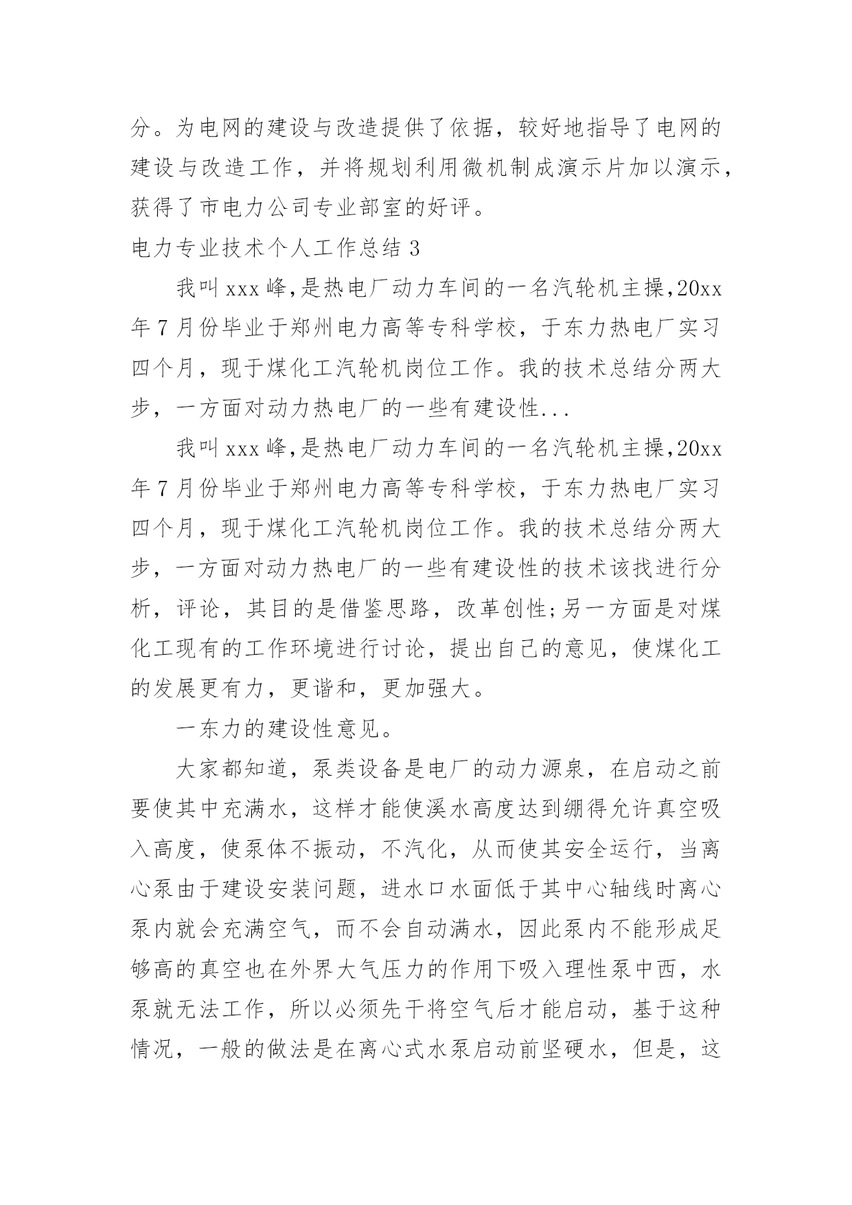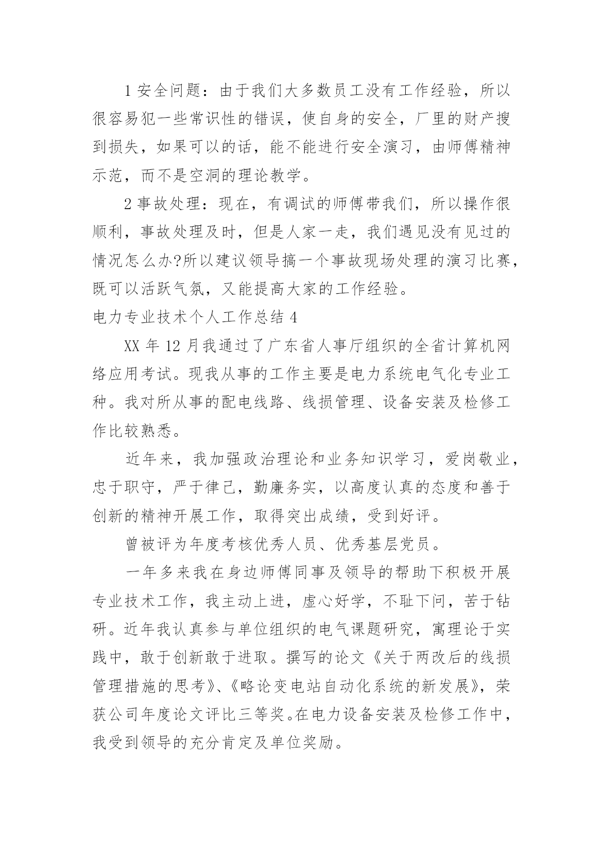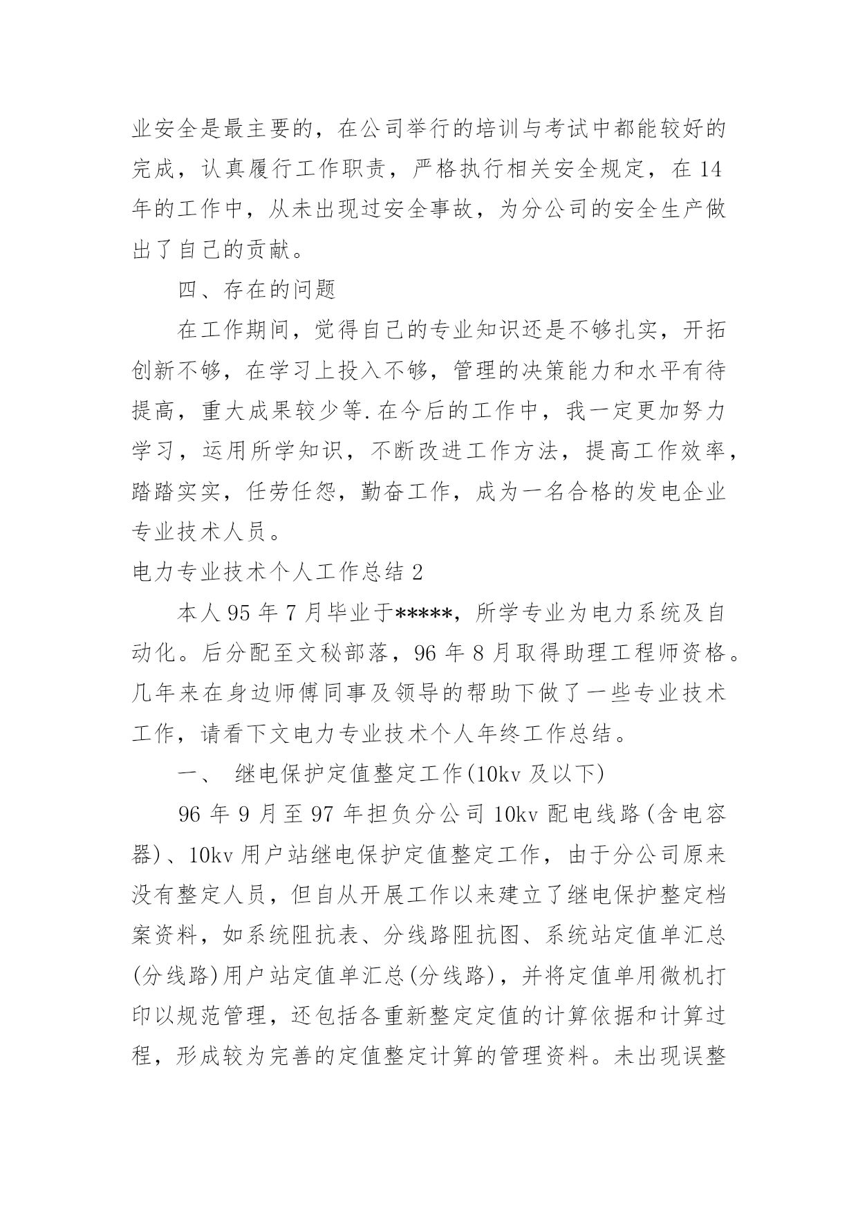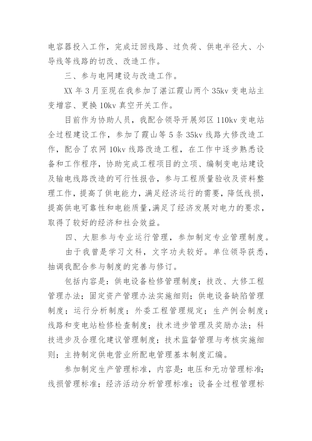 电力专业技术个人工作总结电力专业技术个人工作总结(15篇)总结是事后对某一阶段的学习或工作情况作加以回顾检查并分析评价的书面材料,它能帮我们理顺知识结构,突出重点,突破难点,不如立即行动起来写一份总结吧。总结一般是怎么写的呢?下面是小编帮大家整理的电力专业技术个人工作总结,欢迎阅读,希望大家能够喜欢。电力专业技术个人工作总结1在实际工作中,我能严格按照省公司和本公司领导在安全生产上的要求去做,把安全生产放在第一位,因为发电企业安全是最主要的,在公司举行的培训与考试中都能较好的完成,认真履行工作职责,严格执行相关安全规定,在14年的工作中,从未出现过安全事故,为分公司的安全生产做出了自己的贡献。本人于20xx年6月毕业于东北电力大学计算机与应用专业。20xx年8月进入大唐吉林风力发电股份有限公司工作,就职于运行班组。从20xx年10月至现在,就职于检修班组。参加工作以来,遵守公司的各项规章制度,积极服从领导的工作安排,圆满完成工作任务。维护集体荣誉,思想上要求进步,积极响应号召,认真贯彻执行文件及会议精神。工作积极努力,任劳任怨,认真学习相关业务知识,不断充实完善自己,做到思想行动统一。做到工作认真严谨、实事求是,不放过工作中的每一个细节步骤。电力行业,是一门影响国计民生的行业。工作需时刻谨记,安全放在第一位。技术监督工作就是安全把关的重要一环。在工作中认真贯彻标准化准则,公司的各项方针政策;认真执行好岗位的各项标准和规定,做到所做的每项工作都有章可循。遵守规章制度。下面就从专业技术角度,对我这工作做如下总结:一、积极学习专业知识,提高岗位技能。工作中积极参加公司举办的各项技术培训和技术交流。在业余时间加努力学习本专业的理论知识和专业技能,重视不断提高自己的业务水平,提高自己的岗位技能,在同事的帮助下,通过自己的努力,现在的我在风机检修工作的能力得到了较大幅度的提高,为更好的完成各项工作任务奠定了坚实的基础。二、组织协调方面在实际工作中,努力学会运用马克思主义的立场、观点和方法去分析、研究、解决问题,有一定的组织协调能力和决策水平,注意学习现代科研知识。作为一名检修班班长,能协助场长做好班组职工的思想政治工作,为风电场工作的有效开展提供了保障。三、安全生产方面在实际工作中,我能严格按照省公司和本公司领导在安全生产上的要求去做,把安全生产放在第一位,因为发电企业安全是最主要的,在公司举行的培训与考试中都能较好的完成,认真履行工作职责,严格执行相关安全规定,在14年的工作中,从未出现过安全事故,为分公司的安全生产做出了自己的贡献。四、存在的问题在工作期间,觉得自己的专业知识还是不够扎实,开拓创新不够,在学习上投入不够,管理的决策能力和水平有待提高,重大成果较少等.在今后的工作中,我一定更加努力学习,运用所学知识,不断改进工作方法,提高工作效率,踏踏实实,任劳任怨,勤奋工作,成为一名合格的发电企业专业技术人员。电力专业技术个人工作总结2本人95年7月毕业于*****,所学专业为电力系统及自动化。后分配至文秘部落,96年8月取得助理工程师资格。几年来在身边师傅同事及领导的帮助下做了一些专业技术工作,请看下文电力专业技术个人年终工作总结。一、继电保护定值整定工作(10kv及以下)96年9月至97年担负分公司10kv配电线路(含电容器)、10kv用户站继电保护定值整定工作,由于分公司原来没有整定人员,但自从开展工作以来建立了继电保护整定档案资料,如系统阻抗表、分线路阻抗图、系统站定值单汇总(分线路)用户站定值单汇总(分线路),并将定值单用微机打印以规范管理,还包括各重新整定定值的计算依据和计算过程,形成较为完善的定值整定计算的管理资料。未出现误整定现象,且通过对系统短路容量的计算为配电线路开关等设备的选择提供了依据。97年底由于机构设置变化,指导初级技术人员开展定值整定工作并顺利完成工作交接。二、线损专业管理工作96年至98年9月,作为分公司线损专责人主要开展了以下工作:完成了线损统计计算的微机化工作,应用线损计算统计程序输入表码,自动生成线损报表,并对母线平衡加以分析,主持完成理论线损计算工作,利用理论线损计算程序,准备线损参数图,编制线损拓补网络节点,输入微机,完成35kv、10kv线路理论线损计算工作,为线损分析、降损技术措施的采用提供了理论依据,编制“xx”降损规划,96-98各年度降损实施计划,月度、季度、年度的线损分析,积极采取技术措施降低线损,完成贯庄、大毕庄等35kv站10kv电容器投入工作,完成迂回线路、过负荷、供电半径大、小导线等线路的切改、改造工作,98年关于无功降损节电的论文获市电力企协论文三等奖,荣获市电力公司线损管理工作第二名。三、电网规划的编制工作98年3月至98年11月,作为专业负责人,参与编制《东丽区1
