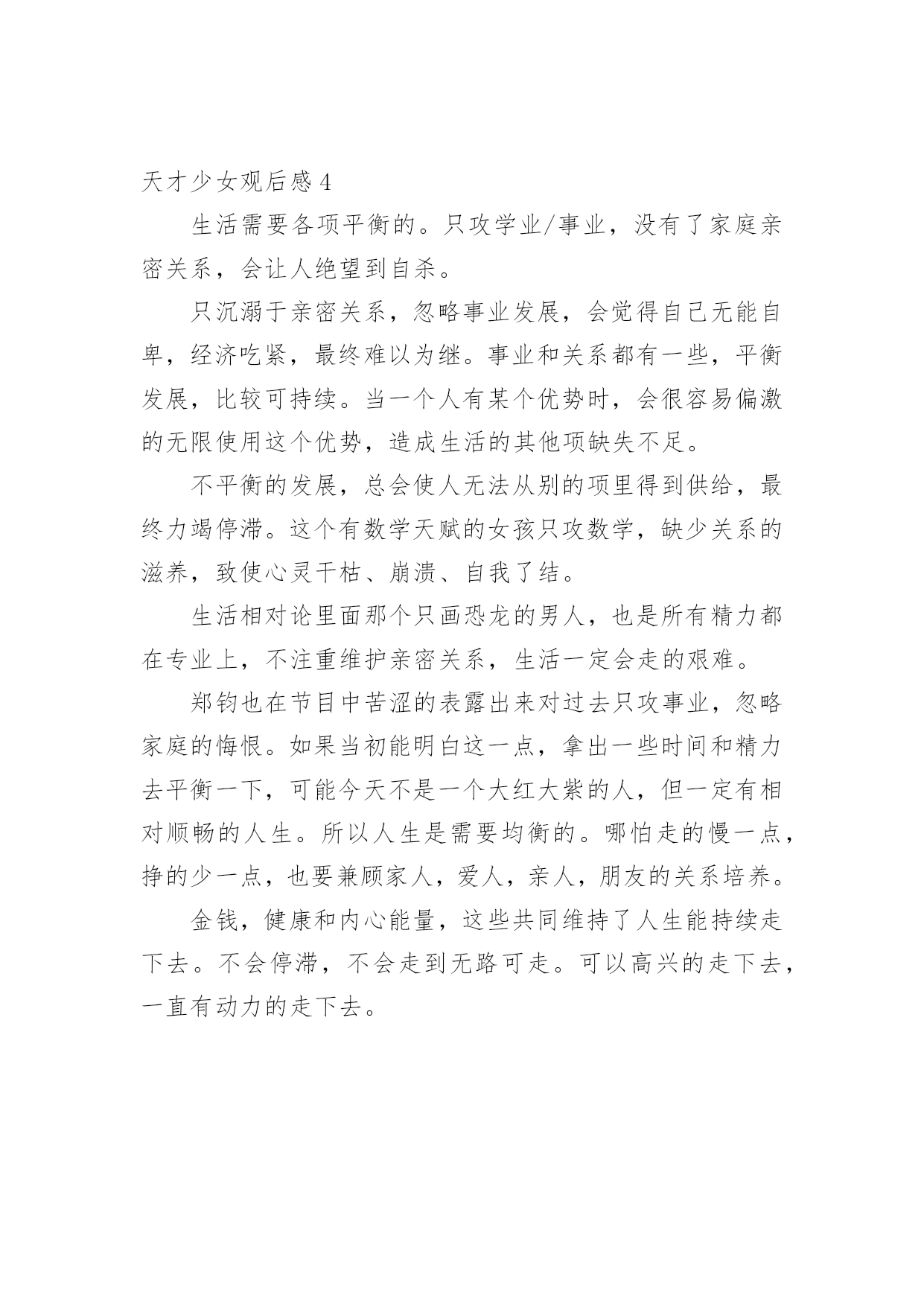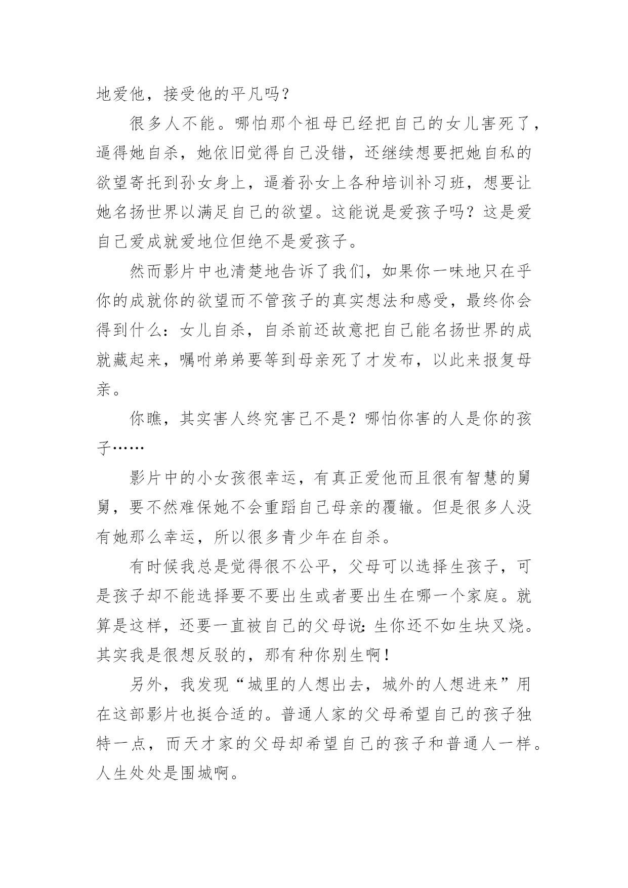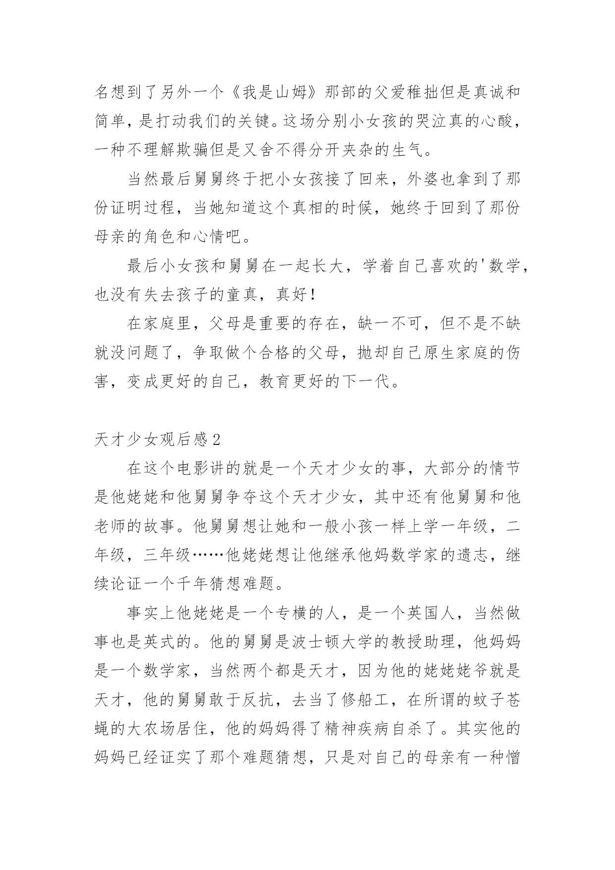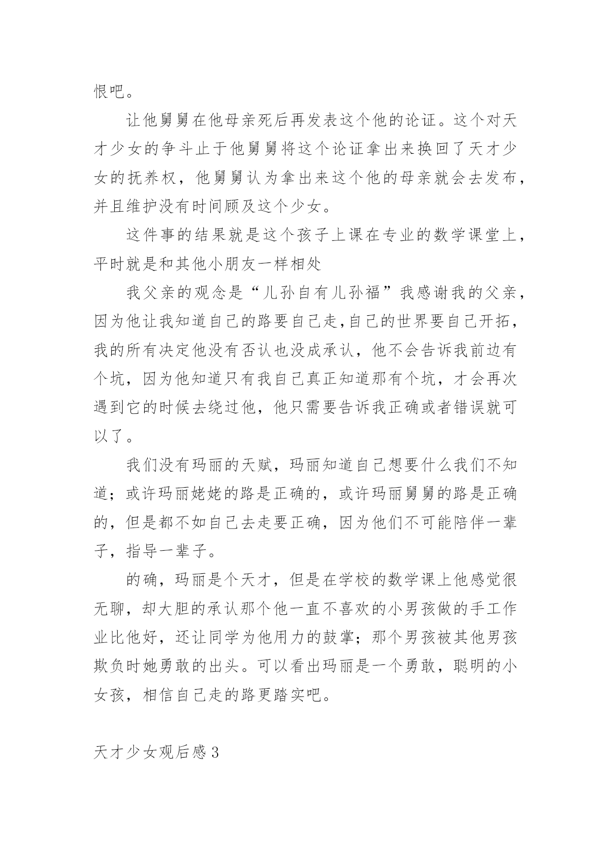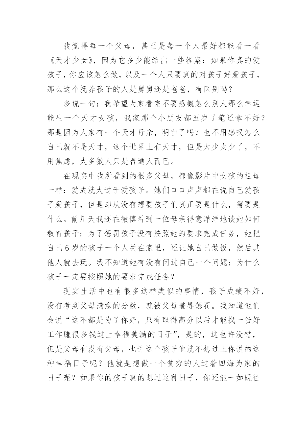 天才少女观后感天才少女观后感范文看完某一作品后,一定有不少感悟吧,这时候,最关键的观后感怎么能落下!那么我们该怎么去写观后感呢?下面是小编为大家整理的天才少女观后感范文,欢迎阅读与收藏。天才少女观后感1小女孩玛丽从开始就展现了她数学的天赋,和跟其他同龄小朋友的格格不入,这是感觉周围都是的厌烦感,可是我赞同舅舅的做法,虽然她的知识已经超过同龄人甚至成年人,但是她只有7岁而已,需要去学会相处,解决人际关系的问题,她可以为弱小挺身而出,打了欺负小孩的大男孩,也坦白了自己的真心话,接受了原来这群自己厌烦的小孩,他们身上也有闪光的地方,比如承认的那个小孩做的动物是最棒的。可以看出小女孩在开头会让人感觉冷漠没有耐心,但是舅舅用女孩在乎的猫猫成为女孩的榜样,希望女孩想猫猫一样不会伤害那些鸟。在争夺抚养权的过程中,女孩对于亲生父亲对自己不闻不问很伤心,舅舅没有过多言语的安慰,而是去医院让她自己见证自己的出生时,亲是像他们一样开心兴奋的,而不是作为拖油瓶嫌弃的存在。在把小女孩寄养到别人家,和舅舅分别的那段,让我莫名想到了另外一个《我是山姆》那部的父爱稚拙但是真诚和简单,是打动我们的关键。这场分别小女孩的哭泣真的心酸,一种不理解欺骗但是又舍不得分开夹杂的生气。当然最后舅舅终于把小女孩接了回来,外婆也拿到了那份证明过程,当她知道这个真相的时候,她终于回到了那份母亲的角色和心情吧。最后小女孩和舅舅在一起长大,学着自己喜欢的'数学,也没有失去孩子的童真,真好!在家庭里,父母是重要的存在,缺一不可,但不是不缺就没问题了,争取做个合格的父母,抛却自己原生家庭的伤害,变成更好的自己,教育更好的下一代。天才少女观后感2在这个电影讲的就是一个天才少女的事,大部分的情节是他姥姥和他舅舅争夺这个天才少女,其中还有他舅舅和他老师的故事。他舅舅想让她和一般小孩一样上学一年级,二年级,三年级……他姥姥想让他继承他妈数学家的遗志,继续论证一个千年猜想难题。事实上他姥姥是一个专横的人,是一个英国人,当然做事也是英式的。他的舅舅是波士顿大学的教授助理,他妈妈是一个数学家,当然两个都是天才,因为他的姥姥姥爷就是天才,他的舅舅敢于反抗,去当了修船工,在所谓的蚊子苍蝇的大农场居住,他的妈妈得了精神疾病自杀了。其实他的妈妈已经证实了那个难题猜想,只是对自己的母亲有一种憎恨吧。让他舅舅在他母亲死后再发表这个他的论证。这个对天才少女的争斗止于他舅舅将这个论证拿出来换回了天才少女的抚养权,他舅舅认为拿出来这个他的母亲就会去发布,并且维护没有时间顾及这个少女。这件事的结果就是这个孩子上课在专业的数学课堂上,平时就是和其他小朋友一样相处我父亲的观念是“儿孙自有儿孙福”我感谢我的父亲,因为他让我知道自己的路要自己走,自己的世界要自己开拓,我的所有决定他没有否认也没成承认,他不会告诉我前边有个坑,因为他知道只有我自己真正知道那有个坑,才会再次遇到它的时候去绕过他,他只需要告诉我正确或者错误就可以了。我们没有玛丽的天赋,玛丽知道自己想要什么我们不知道;或许玛丽姥姥的路是正确的,或许玛丽舅舅的路是正确的,但是都不如自己去走要正确,因为他们不可能陪伴一辈子,指导一辈子。的确,玛丽是个天才,但是在学校的数学课上他感觉很无聊,却大胆的承认那个他一直不喜欢的小男孩做的手工作业比他好,还让同学为他用力的鼓掌;那个男孩被其他男孩欺负时她勇敢的出头。可以看出玛丽是一个勇敢,聪明的小女孩,相信自己走的路更踏实吧。天才少女观后感3我觉得每一个父母,甚至是每一个人最好都能看一看《天才少女》,因为它多少能给出一些答案:如果你真的爱孩子,你应该怎么做,以及一个人只要真的对孩子好爱孩子,那么这个抚养孩子的人是舅舅还是爸爸,有区别吗?多说一句:我希望大家看完不要感概怎么别人那么幸运能生一个天才女孩,我家那个小朋友都五岁了笔还拿不好?那是因为人家有一个天才母亲,明白了吗?也不用感叹怎么自己就不是天才,这个世界上有天才,但是太少太少了,不用焦虑,大多数人只是普通人而已。在现实中我所看到的很多父母,都像影片中女孩的祖母一样:爱成就大过于爱孩子。她们口口声声都在说自己爱孩子爱孩子,但是却从没有想要孩子们真正要是什么,需要是什么。前几天我还在微博看到一位母亲得意洋洋地谈她如何教育孩子:为了惩罚孩子没有按照她的要求完成任务,她把自己6岁的孩子一个人关在家里,还让她自己做饭,然后其他人就去玩。我不知道她有没有问过自己一个问题:为什么孩子一定要按照她的要求完成任务?现实生活中也有很多这样类似的事情,孩子成绩不好,没有考到父母满意的分数,就被父母羞辱惩罚。我知道他们会说“这不都是为了你好,只有取得高分以后才能找一份好工作赚很多钱过上幸福美满的日子”,是的,这也许没错,但是父母有没有父母,也许这个孩子他就不想过上你说的这种幸福日子呢?他就是想做一