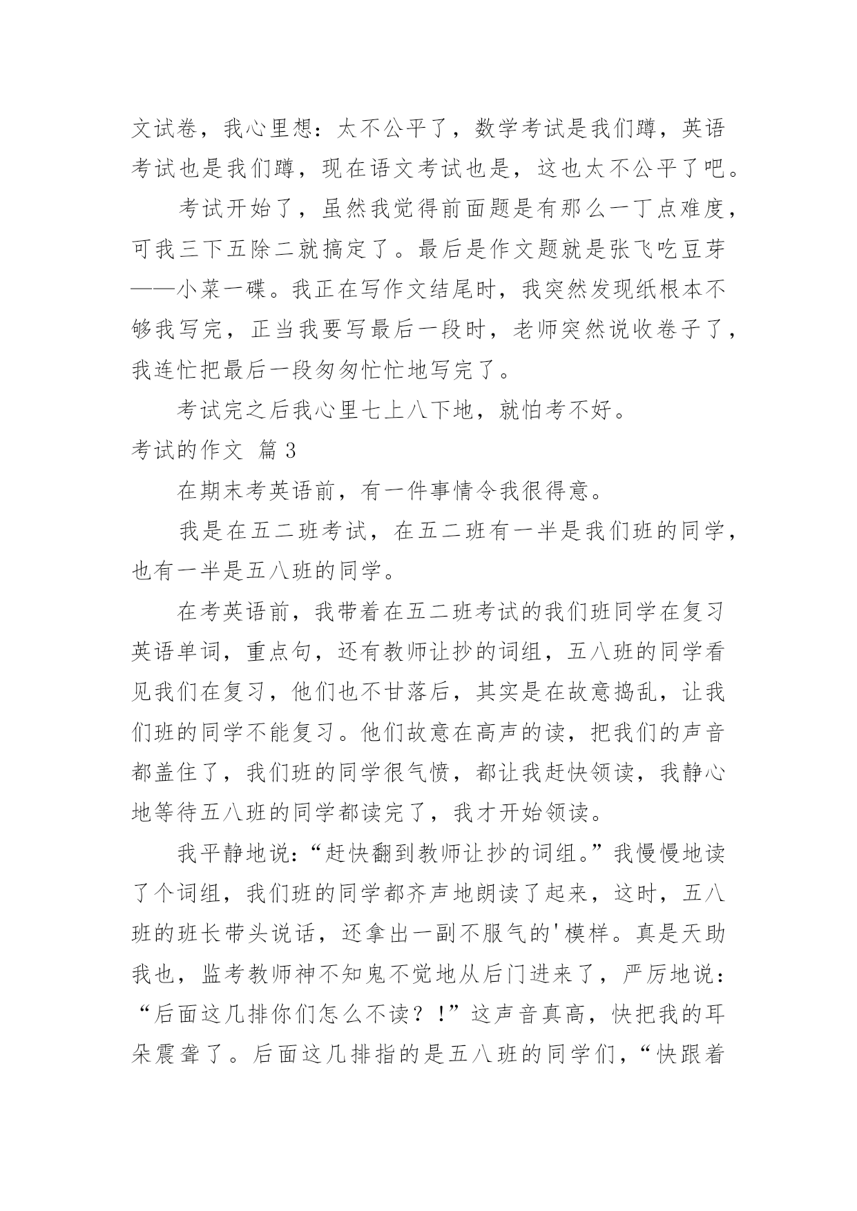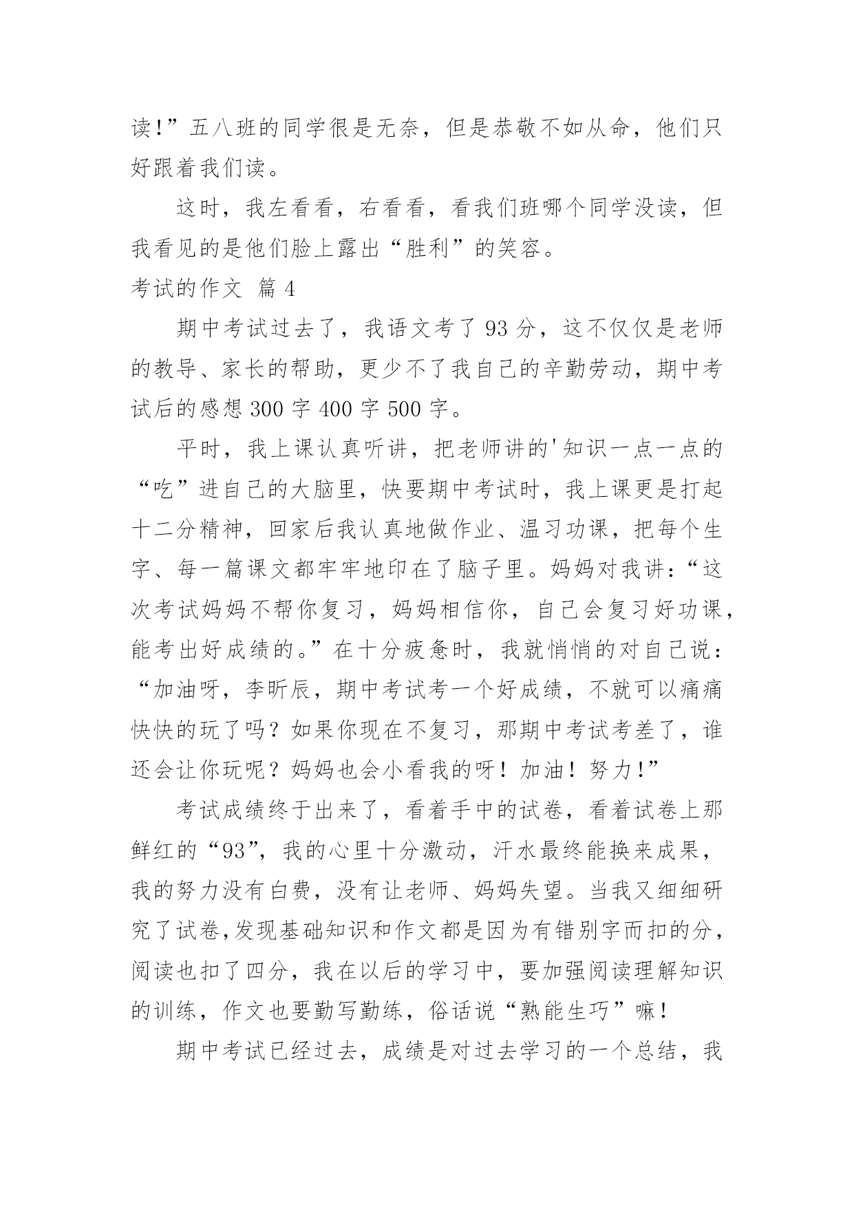 考试的作文考试的作文在日常学习、工作或生活中,大家或多或少都会接触过作文吧,写作文可以锻炼我们的独处习惯,让自己的心静下来,思考自己未来的方向。你所见过的作文是什么样的呢?以下是小编帮大家整理的考试的作文5篇,希望能够帮助到大家。考试的作文篇1通过这次期末考试我觉得我考得很不理想,妈妈也不满意。但是妈妈没有批评我。妈妈让我总结经验。知道我这次考得不好的原因是什么,我觉得还是太粗心太荒唐了,没认真审题,没仔细检查的.原因。尤其是英语没考好还是因为平时基础没打好,听力和写单词都可以,认单词认得不行。考试时有些单词还是不理解。但是我在这个暑假一定会加倍努力学习,为以后打好基础。考试的作文篇2叮铃铃,叮铃铃……”上课了,今天教室里静的如一根针掉在地下就会听到,不像往日一般一上课就叽叽喳喳说个不停。为什么呢?因为今天是大大大大考试!谭老师一进教室就开始给我们发试卷,此时同学们有开启了“说话模式”了,当老师发完试卷时同学们又关闭了“说话模式”,老师又安排我们第4排和第2排人蹲下做语文试卷,我心里想:太不公平了,数学考试是我们蹲,英语考试也是我们蹲,现在语文考试也是,这也太不公平了吧。考试开始了,虽然我觉得前面题是有那么一丁点难度,可我三下五除二就搞定了。最后是作文题就是张飞吃豆芽——小菜一碟。我正在写作文结尾时,我突然发现纸根本不够我写完,正当我要写最后一段时,老师突然说收卷子了,我连忙把最后一段匆匆忙忙地写完了。考试完之后我心里七上八下地,就怕考不好。考试的作文篇3在期末考英语前,有一件事情令我很得意。我是在五二班考试,在五二班有一半是我们班的同学,也有一半是五八班的同学。在考英语前,我带着在五二班考试的我们班同学在复习英语单词,重点句,还有教师让抄的词组,五八班的同学看见我们在复习,他们也不甘落后,其实是在故意捣乱,让我们班的同学不能复习。他们故意在高声的读,把我们的声音都盖住了,我们班的同学很气愤,都让我赶快领读,我静心地等待五八班的同学都读完了,我才开始领读。我平静地说:“赶快翻到教师让抄的词组。”我慢慢地读了个词组,我们班的同学都齐声地朗读了起来,这时,五八班的班长带头说话,还拿出一副不服气的'模样。真是天助我也,监考教师神不知鬼不觉地从后门进来了,严厉地说:“后面这几排你们怎么不读?!”这声音真高,快把我的耳朵震聋了。后面这几排指的是五八班的同学们,“快跟着读!”五八班的同学很是无奈,但是恭敬不如从命,他们只好跟着我们读。这时,我左看看,右看看,看我们班哪个同学没读,但我看见的是他们脸上露出“胜利”的笑容。考试的作文篇4期中考试过去了,我语文考了93分,这不仅仅是老师的教导、家长的帮助,更少不了我自己的辛勤劳动,期中考试后的感想300字400字500字。平时,我上课认真听讲,把老师讲的'知识一点一点的“吃”进自己的大脑里,快要期中考试时,我上课更是打起十二分精神,回家后我认真地做作业、温习功课,把每个生字、每一篇课文都牢牢地印在了脑子里。妈妈对我讲:“这次考试妈妈不帮你复习,妈妈相信你,自己会复习好功课,能考出好成绩的。”在十分疲惫时,我就悄悄的对自己说:“加油呀,李昕辰,期中考试考一个好成绩,不就可以痛痛快快的玩了吗?如果你现在不复习,那期中考试考差了,谁还会让你玩呢?妈妈也会小看我的呀!加油!努力!”考试成绩终于出来了,看着手中的试卷,看着试卷上那鲜红的“93”,我的心里十分激动,汗水最终能换来成果,我的努力没有白费,没有让老师、妈妈失望。当我又细细研究了试卷,发现基础知识和作文都是因为有错别字而扣的分,阅读也扣了四分,我在以后的学习中,要加强阅读理解知识的训练,作文也要勤写勤练,俗话说“熟能生巧”嘛!期中考试已经过去,成绩是对过去学习的一个总结,我以后要继续努力,争取考出更优异的成绩!考试的作文篇5分数的高低对我来说是不重要的,重要的是我的成绩提高了吗?进歩了吗?超过目标了吗?但这次考试后退了,我鼓励自己:我一定能行,下一次我要超过前五名!我也明白了一个道理,共有三点:1、不必聪明比勤奋;2、不比基础比进步;3、不比阔气比志气。俗话说:“有志不在年高”“不必聪明比勤奋”,首先我要做到这一点。虽然我很聪明,但老不勤奋,成绩便会降低,所以我要更加努力勤奋,向班长学习勤奋的精神。如果我要把成绩搞上去,就不能半途而废,要坚持勤奋的精神!“不比基础比进步”,也要做好这一点。我不能光顾着打好基础,而不向前进。我要不断的超过我的目标,更上一层楼。我也要踏踏实实的'走好每一个步伐,那样我才会进步。最后我要记住:“不比阔气比志气”阔气是指:好胜心强的人,花钱大手大脚的人。我要有志气,有志气才有学习的精神。不能比你有钱的多少,要比你的志气有多大!这三句话会永远地刻在我心上的。我的目标,我的成绩,我的名次,我要向你们前进!