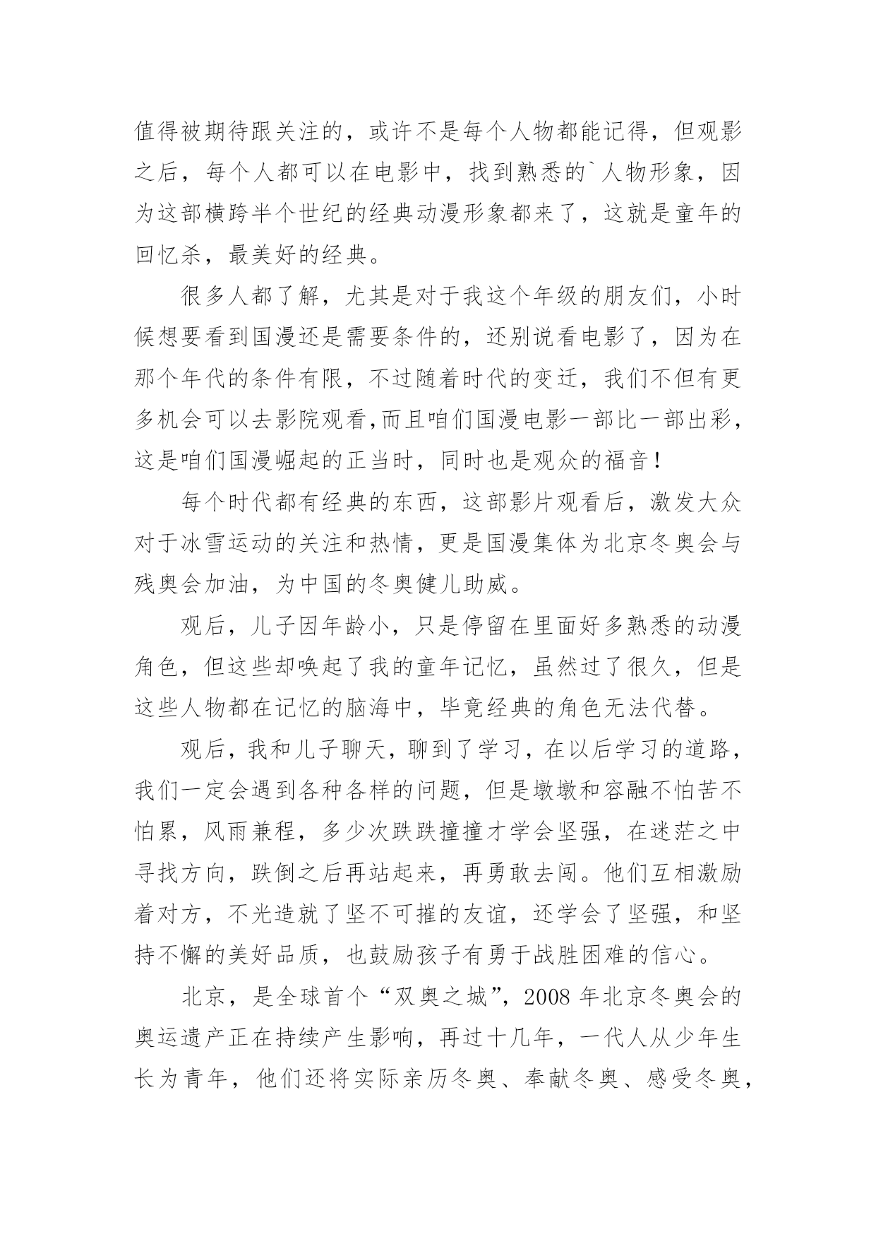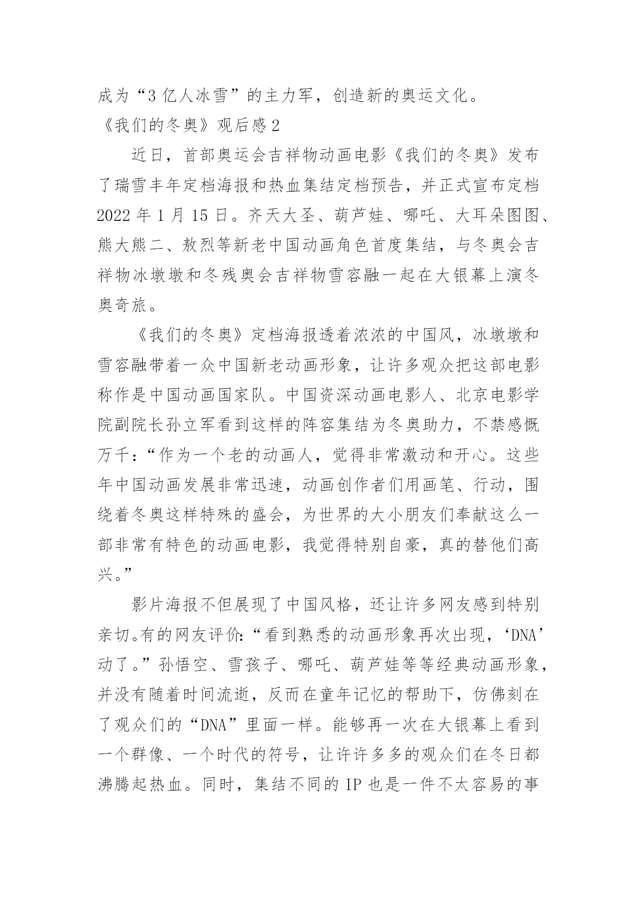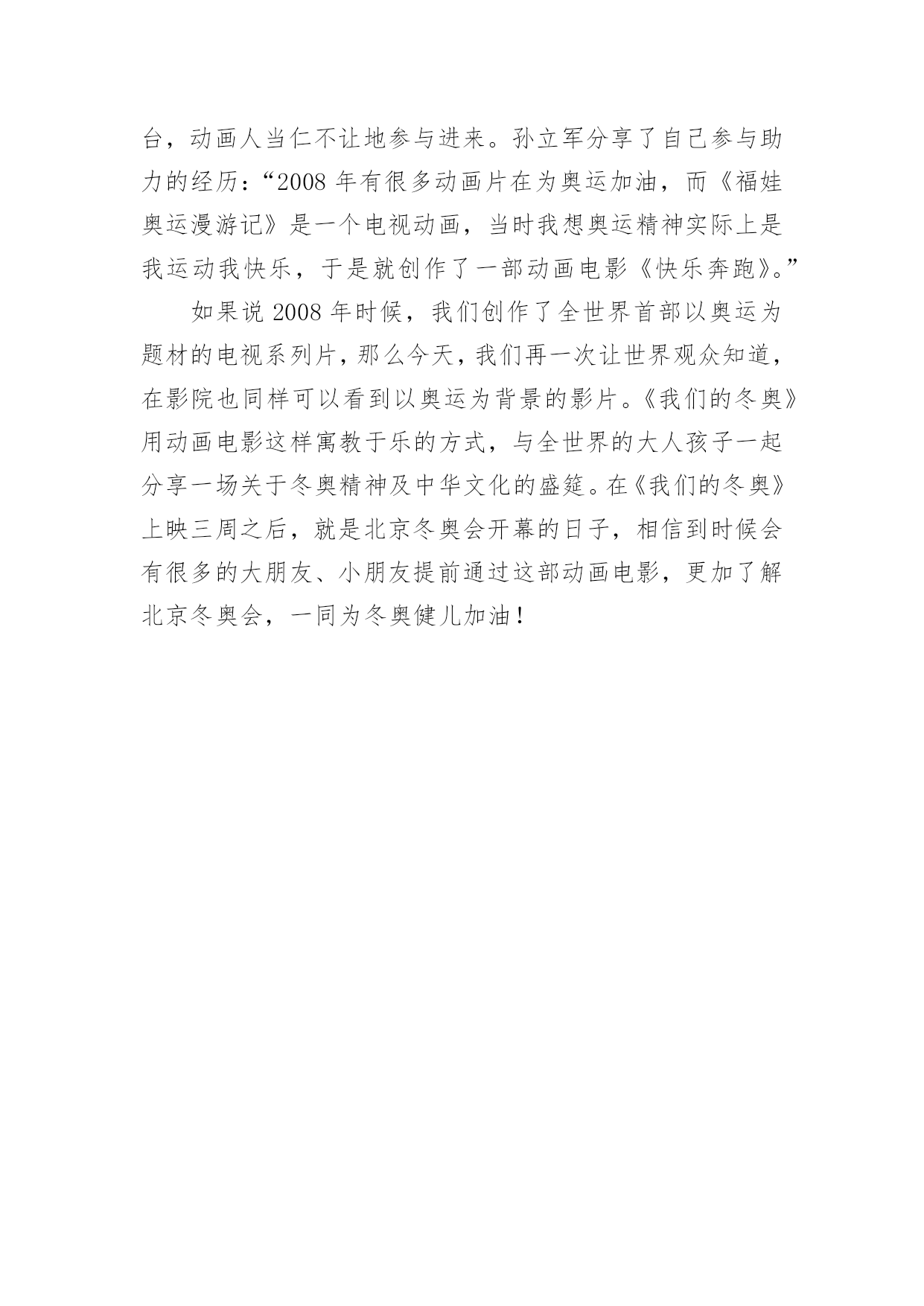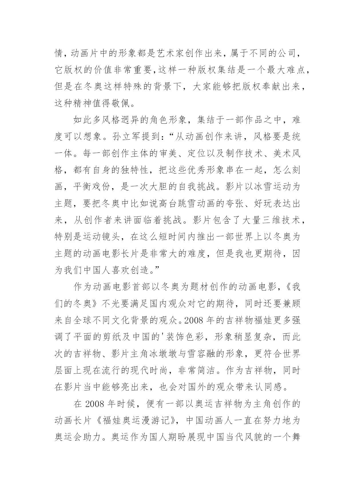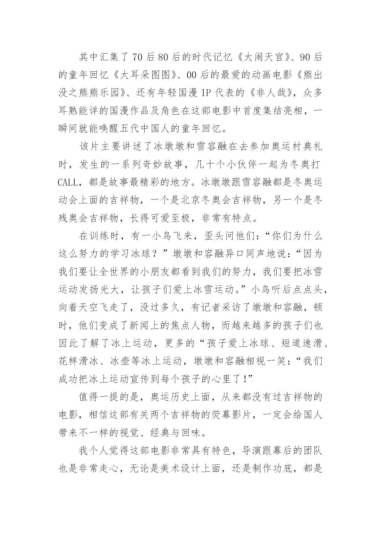 《我们的冬奥》观后感《我们的冬奥》观后感认真品味一部作品后,大家一定收获不少吧,观后感的表达方式灵活多样,基本属于议论范畴,但写法不同于一般议论文,因为它必须是在观看后的基础上发感想。那么观后感到底应该怎么写呢?以下是小编为大家整理的《我们的冬奥》观后感,供大家参考借鉴,希望可以帮助到有需要的朋友。《我们的冬奥》观后感1正值北京24届冬奥会召开之际,国产动画片《我们的冬奥》2月19日在张家口上映,和6岁的儿子一起走进影院,第一时间去观影。《我们的冬奥》这部动画电影是专门为北京2022年冬奥会和冬残奥会所打造的,该片讲述了众多中国经典动画角色与北京冬奥会吉祥物冰墩墩和冬残奥会吉祥物雪容融,围绕冬奥村开村仪式展开的一个因为相遇而产生关于团结、梦想、勇气和拼搏的多篇章故事。影片中出的动画覆盖了各个年龄段,除了冰墩墩和雪容融,还出现了超30个国人熟悉的经典动漫人物,齐天大圣孙悟空、大耳朵图图、熊大熊二、九月、哪吒、黑猫警长、葫芦娃等齐齐聚首。其中汇集了70后80后的时代记忆《大闹天宫》、90后的童年回忆《大耳朵图图》、00后的最爱的动画电影《熊出没之熊熊乐园》、还有年轻国漫IP代表的《非人哉》,众多耳熟能详的国漫作品及角色在这部电影中首度集结亮相,一瞬间就能唤醒五代中国人的童年回忆。该片主要讲述了冰墩墩和雪容融在去参加奥运村典礼时,发生的一系列奇妙故事,几十个小伙伴一起为冬奥打CALL,都是故事最精彩的地方。冰墩墩跟雪容融都是冬奥运动会上面的吉祥物,一个是北京冬奥会吉祥物,另一个是冬残奥会吉祥物,长得可爱至极,非常有特点。在训练时,有一小鸟飞来,歪头问他们:“你们为什么这么努力的学习冰球?”墩墩和容融异口同声地说:“因为我们要让全世界的小朋友都看到我们的努力,我们要把冰雪运动发扬光大,让孩子们爱上冰雪运动。”小鸟听后点点头,向着天空飞走了,没过多久,有记者采访了墩墩和容融,顿时,他们变成了新闻上的焦点人物,而越来越多的孩子们也因此了解了冰上运动,更多的“孩子爱上冰球、短道速滑、花样滑冰、冰壶等冰上运动,墩墩和容融相视一笑:“我们成功把冰上运动宣传到每个孩子的心里了!”值得一提的是,奥运历史上面,从来都没有过吉祥物的电影,相信这部有关两个吉祥物的荧幕影片,一定会给国人带来不一样的视觉、经典与回味。我个人觉得这部电影非常具有特色,导演跟幕后的团队也是非常走心,无论是美术设计上面,还是制作功底,都是值得被期待跟关注的,或许不是每个人物都能记得,但观影之后,每个人都可以在电影中,找到熟悉的`人物形象,因为这部横跨半个世纪的经典动漫形象都来了,这就是童年的回忆杀,最美好的经典。很多人都了解,尤其是对于我这个年级的朋友们,小时候想要看到国漫还是需要条件的,还别说看电影了,因为在那个年代的条件有限,不过随着时代的变迁,我们不但有更多机会可以去影院观看,而且咱们国漫电影一部比一部出彩,这是咱们国漫崛起的正当时,同时也是观众的福音!每个时代都有经典的东西,这部影片观看后,激发大众对于冰雪运动的关注和热情,更是国漫集体为北京冬奥会与残奥会加油,为中国的冬奥健儿助威。观后,儿子因年龄小,只是停留在里面好多熟悉的动漫角色,但这些却唤起了我的童年记忆,虽然过了很久,但是这些人物都在记忆的脑海中,毕竟经典的角色无法代替。观后,我和儿子聊天,聊到了学习,在以后学习的道路,我们一定会遇到各种各样的问题,但是墩墩和容融不怕苦不怕累,风雨兼程,多少次跌跌撞撞才学会坚强,在迷茫之中寻找方向,跌倒之后再站起来,再勇敢去闯。他们互相激励着对方,不光造就了坚不可摧的友谊,还学会了坚强,和坚持不懈的美好品质,也鼓励孩子有勇于战胜困难的信心。北京,是全球首个“双奥之城”,2008年北京冬奥会的奥运遗产正在持续产生影响,再过十几年,一代人从少年生长为青年,他们还将实际亲历冬奥、奉献冬奥、感受冬奥,成为“3亿人冰雪”的主力军,创造新的奥运文化。《我们的冬奥》观后感2近日,首部奥运会吉祥物动画电影《我们的冬奥》发布了瑞雪丰年定档海报和热血集结定档预告,并正式宣布定档2022年1月15日。齐天大圣、葫芦娃、哪吒、大耳朵图图、熊大熊二、敖烈等新老中国动画角色首度集结,与冬奥会吉祥物冰墩墩和冬残奥会吉祥物雪容融一起在大银幕上演冬奥奇旅。《我们的冬奥》定档海报透着浓浓的中国风,冰墩墩和雪容融带着一众中国新老动画形象,让许多观众把这部电影称作是中国动画国家队。中国资深动画电影人、北京电影学院副院长孙立军看到这样的阵容集结为冬奥助力,不禁感慨万千:“作为一个老的动画人,觉得非常激动和开心。这些年中国动画发展非常迅速,动画创作者们用画笔、行动,围绕着冬奥这样特殊的盛会,为世界的大小朋友们奉献这么一部非常有特色的动画电影,我觉得特别自豪,真的替他们高兴。”影片海报不但展现了中国风格,还让许多网友感到