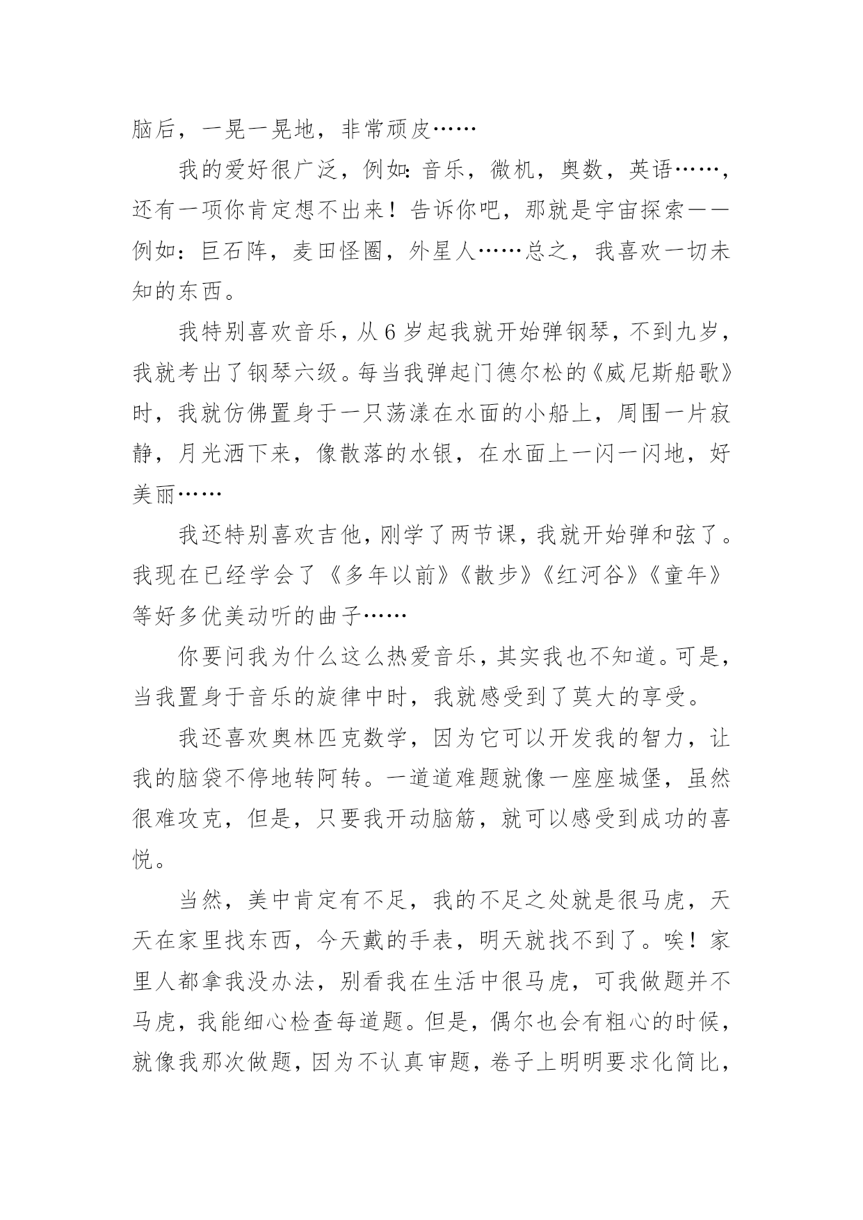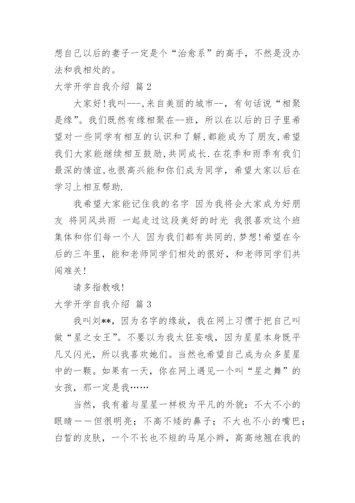 大学开学自我介绍【精选】大学开学自我介绍3篇当来到一个陌生的地方时,时常要进行自我介绍,通过自我介绍可以得到他人的认可。那么自我介绍应该包括什么内容呢?以下是小编为大家整理的大学开学自我介绍4篇,供大家参考借鉴,希望可以帮助到有需要的朋友。大学开学自我介绍篇1大家好,我是×××,怎么说呢,我是一个不太勤快的男孩,有些猫咪的慵懒。常常是把一大堆衣服积攒到一起洗,一个人的时候不会去做饭,总是找些替代的食物,虽然我做饭很好吃。这对于一个男孩来说,算是一个比较大的缺点吧。不勤快代表着不上进,得过且过,我想没有女孩子会喜欢这样的男孩。毕竟大家还是要提高生活质量的。其实我觉得自己也算是蛮有品位的,只是兜里的钱少点儿。否则我也会选择高质量的生活,但无奈经济萧条。不过就算我有了钱也留不住,对我来说,它们留着没意义,花出去才有价值。再说了,那么多人摸过的纸,想想就恶心。所以,不买东西,坚决不装钱。我是一个很情绪化的男孩,常常莫名其妙地喜欢某些事物。或是人,或是非人类,或是某人的某个动作、某个表情,都是会突然很喜欢的。有时会生气,却不会去憎恨。只是敏感得像个女孩子,这样的男孩是很容易让女孩子厌倦的。我想自己以后的妻子一定是个“治愈系”的高手,不然是没办法和我相处的。大学开学自我介绍篇2大家好!我叫---,来自美丽的城市--,有句话说“相聚是缘”。我们既然有缘相聚在--班,所以在以后的日子里希望对一些同学有相互的认识和了解,都能成为了朋友,希望我们大家能继续相互鼓励,共同成长.在花季和雨季有我们最深的情谊,也很高兴能和你们成为同学,希望大家以后在学习上相互帮助.我希望大家能记住我的名字因为我将会大家成为好朋友将同风共雨一起走过这段美好的时光我很喜欢这个班集体和你们每一个人因为我们都有共同的.梦想!希望在今后的三年里,能和老师同学们相处的很好,和老师同学们共闯难关!请多指教哦!大学开学自我介绍篇3我叫刘**,因为名字的缘故,我在网上习惯于把自己叫做“星之女王”。不要以为我太狂妄哦,因为星星本身既平凡又闪光,所以我喜欢她们。当然也希望自己成为众多星星中的一颗。如果有一天,你在网上遇见一个叫“星之舞”的女孩,那一定是我……当然,我有着与星星一样极为平凡的外貌:不大不小的眼睛――但很明亮;不高不矮的鼻子;不大也不小的嘴巴;白皙的皮肤,一个不长也不短的马尾小辫,高高地翘在我的脑后,一晃一晃地,非常顽皮……我的爱好很广泛,例如:音乐,微机,奥数,英语……,还有一项你肯定想不出来!告诉你吧,那就是宇宙探索――例如:巨石阵,麦田怪圈,外星人……总之,我喜欢一切未知的东西。我特别喜欢音乐,从6岁起我就开始弹钢琴,不到九岁,我就考出了钢琴六级。每当我弹起门德尔松的《威尼斯船歌》时,我就仿佛置身于一只荡漾在水面的小船上,周围一片寂静,月光洒下来,像散落的水银,在水面上一闪一闪地,好美丽……我还特别喜欢吉他,刚学了两节课,我就开始弹和弦了。我现在已经学会了《多年以前》《散步》《红河谷》《童年》等好多优美动听的曲子……你要问我为什么这么热爱音乐,其实我也不知道。可是,当我置身于音乐的旋律中时,我就感受到了莫大的享受。我还喜欢奥林匹克数学,因为它可以开发我的智力,让我的脑袋不停地转阿转。一道道难题就像一座座城堡,虽然很难攻克,但是,只要我开动脑筋,就可以感受到成功的喜悦。当然,美中肯定有不足,我的不足之处就是很马虎,天天在家里找东西,今天戴的手表,明天就找不到了。唉!家里人都拿我没办法,别看我在生活中很马虎,可我做题并不马虎,我能细心检查每道题。但是,偶尔也会有粗心的时候,就像我那次做题,因为不认真审题,卷子上明明要求化简比,我却做成求比值了!惨阿,就因为这个,老师给我扣了4分。经过这好几次的教训,我今后一定要改正马虎这个坏习惯,相信我吧!希望在今后的三年里,能和老师同学们相处的很好,和老师同学们共闯难关,大家一起加油!