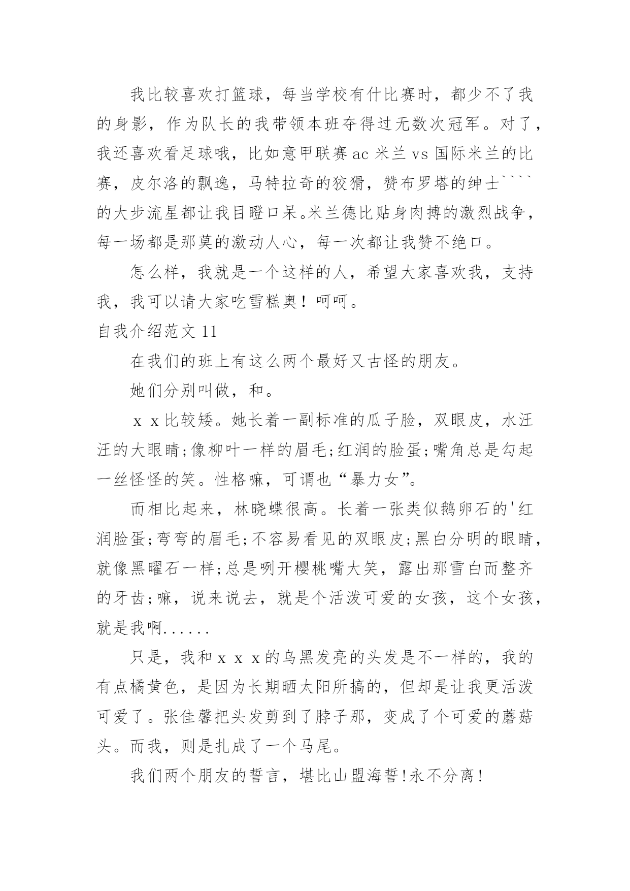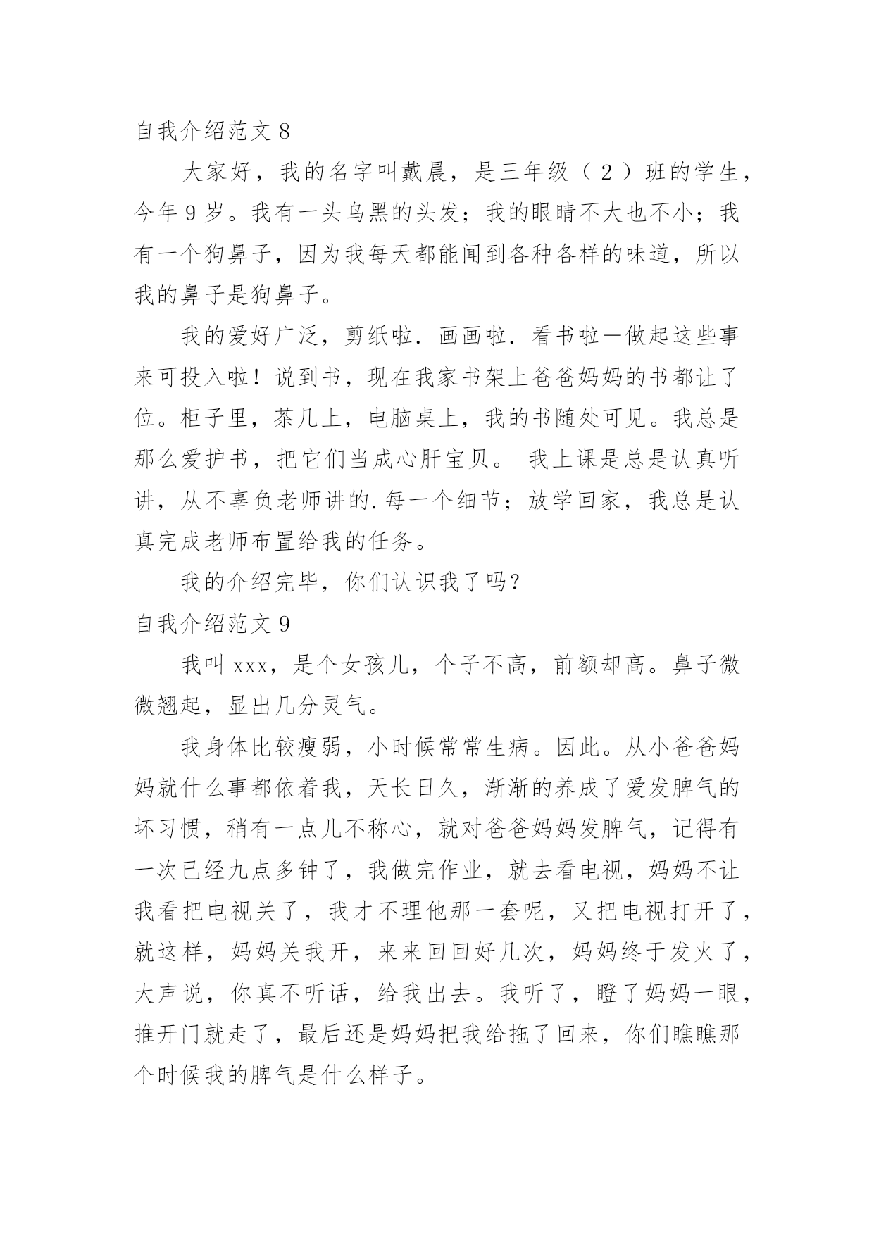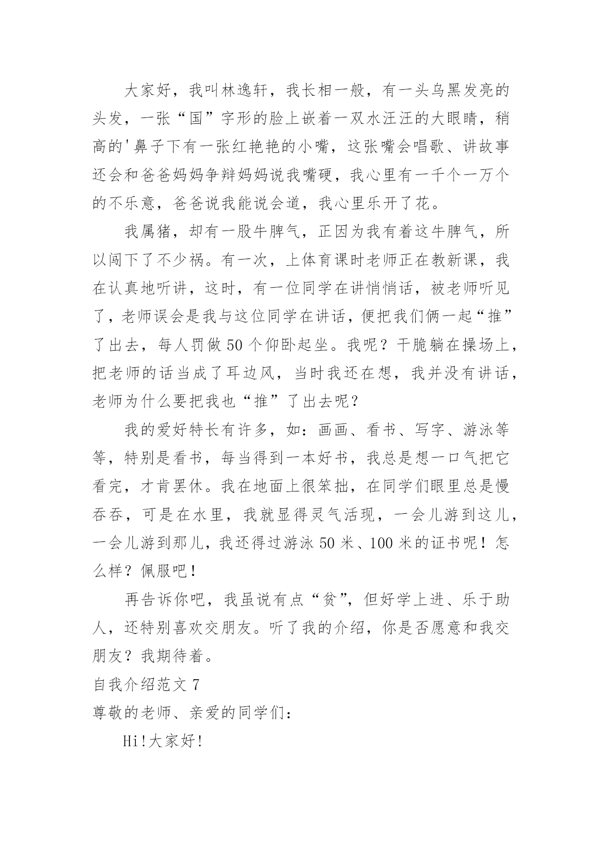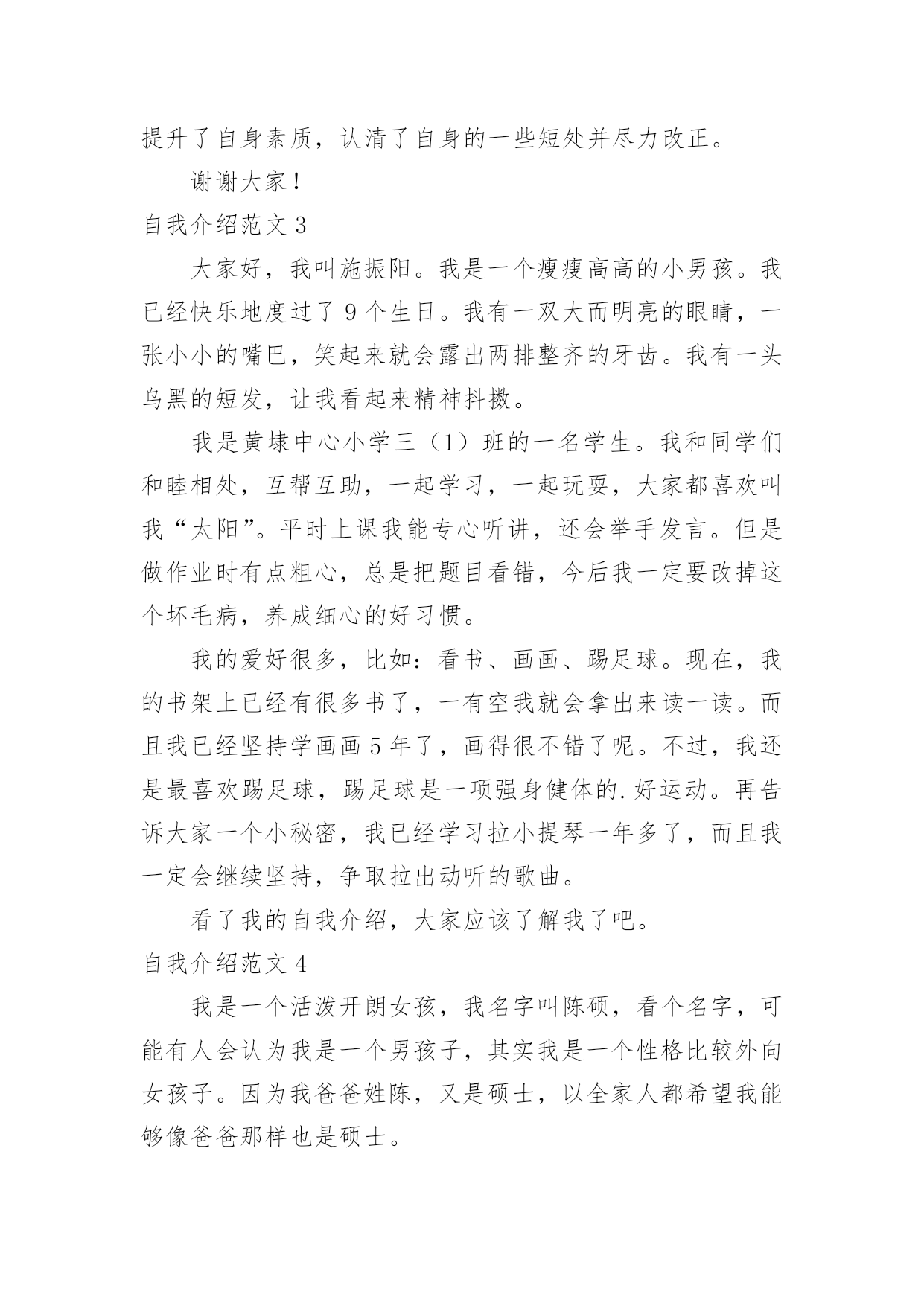 自我介绍自我介绍范文来到一个完全陌生的环境,我们有必要对自己进行适当的介绍,自我介绍是一展示自己的手段。那么自我介绍应该包括什么内容呢?以下是小编精心整理的自我介绍范文,欢迎阅读,希望大家能够喜欢。自我介绍范文1我今年10岁,是我们班的中队长,同学们都叫我班头,而我呢,也常常以“头”自居。实话实说,不怕同学们笑话,我是一个既让人喜欢有惹人生气的愣小子。在学习中,老师说我有股不服输的犟劲,爱动脑筋,兴趣广泛;但是我有一个最大的缺点——贪玩。我的学习成绩在班里一直名列前茅,大考小考经常拿第一,令班里的'其他同学眼红。在其他方面我也不甘落后,去年,在我校举行的各项比赛中,我一人夺得了数学、语文、古诗三个奖,奖品发了一大包,真让不少同学眼馋手痒,羡慕得不得了。在班里我是中队长,体育委员、卫生监督员、课代表……“。官帽”一大堆。我虽然年年被评为“三好学生”,但我心里有数,咱自己做的还不行,缺点还很多。我是个不安分喜欢运动的孩子,有时也真让大人操心,惹爸妈生气。我对下雨、下雪情有独钟,恨不得在雪地里打滚,在雨中奔跑。有时一天换几身衣服,爸爸给我总结了几句话说我“在学校算是捣蛋的,放学路上像是掏碳的,到了家像个要饭的,帮助别人是个好样的,只要能上体育课可以不要命的,”还真是这么回事。同学们,这就是我,一个小小的我,你们愿意和我交朋友吗?今后,我一定改掉贪玩的毛病,如果您有医治贪玩的“灵丹妙药”请和我联系好吗?愿咱们一起努力,多学知识,将来为国家出力争光。自我介绍范文2我叫xxx,毕业于xx校,专业学习照顾护士。非常荣幸有机会向您展示我的简历中的自我介绍。卫校的学习不像初中那样是填鸭式的,而是教员把课讲完,然后本身去看,去理解。这个时候自习能力和自制能力是很重要的。长期自习以来我知道了要想学好只埋头苦学是不行的',要学会”方法”,做事情的方法。我个人认为本身的缺点就是喜欢一心两用甚至多用。急功近利,喜欢一口气学许多东西,但是贪多嚼不烂,即使最后都能学会,也已经弄得本身很疲劳。如今想想,其实并不好,正所谓贵在精而不在广。如果我一段时期内专注于一种学问,不求博但求精,相信一定能更深刻的理解并掌握这门知识。自从我发现本身有这个缺点和需要解答的题目后,我常常警戒自己,步入社会后也不能一心两用。通过三年的卫校生活,我学到了很多知识,更重要的是掌握了护士操作技术。思想变成熟了许多,性格更坚毅了。认识了许多同学和教员,建立起友情,并在与他们的交往中提升了自身素质,认清了自身的一些短处并尽力改正。谢谢大家!自我介绍范文3大家好,我叫施振阳。我是一个瘦瘦高高的小男孩。我已经快乐地度过了9个生日。我有一双大而明亮的眼睛,一张小小的嘴巴,笑起来就会露出两排整齐的牙齿。我有一头乌黑的短发,让我看起来精神抖擞。我是黄埭中心小学三(1)班的一名学生。我和同学们和睦相处,互帮互助,一起学习,一起玩耍,大家都喜欢叫我“太阳”。平时上课我能专心听讲,还会举手发言。但是做作业时有点粗心,总是把题目看错,今后我一定要改掉这个坏毛病,养成细心的好习惯。我的爱好很多,比如:看书、画画、踢足球。现在,我的书架上已经有很多书了,一有空我就会拿出来读一读。而且我已经坚持学画画5年了,画得很不错了呢。不过,我还是最喜欢踢足球,踢足球是一项强身健体的.好运动。再告诉大家一个小秘密,我已经学习拉小提琴一年多了,而且我一定会继续坚持,争取拉出动听的歌曲。看了我的自我介绍,大家应该了解我了吧。自我介绍范文4我是一个活泼开朗女孩,我名字叫陈硕,看个名字,可能有人会认为我是一个男孩子,其实我是一个性格比较外向女孩子。因为我爸爸姓陈,又是硕士,以全家人都希望我能够像爸爸那样也是硕士。我有一头乌黑发亮头发,喜欢梳一把马尾巴。我有一个椭圆形脸蛋,像一小鸡蛋,在那椭圆形脸上,长着一双又大又灵眼睛,眼睛里黑眼珠,像一个黑葡萄我鼻子高高,嘴红红,一说起话来就没完没,我真喜欢妈妈给我这张脸。我今年十二岁,是家里独生子,也是家里“掌上明珠”,爸爸、妈妈平时都爱宠着我。我在班上学习虽然谈不上数一数二,却是小有名气,我人缘也很好,班上有一大半同学都是我好朋友其中还有我“知心朋友”。我不仅朋友多,而且兴趣爱好也多不得,有:“画画、玩电脑、游泳、弹钢琴、看书……我最喜欢看书。我很小时候,爸爸就给我买许多识字手册,经常给我读一些故事书,可说,我童年就是在书海中度过。随着我年龄增长,我家书也越来越多,现在我家就象一座小图书馆,到处都是书,我自己书更是多得数不胜数,整整放两个柜子。虽然我平时一向很节约,但是对买书却毫不吝啬,只要是我喜欢实用书,而且不是很贵,我一定会马上买下来。有时候我遇到一本好书,又因为价格太贵而不能买,我一定会翻来覆去地看好几遍才甘心,所以每次我一进书店,都要看上大半天。高尔基曾经说过:”书是人类进步阶梯“。
