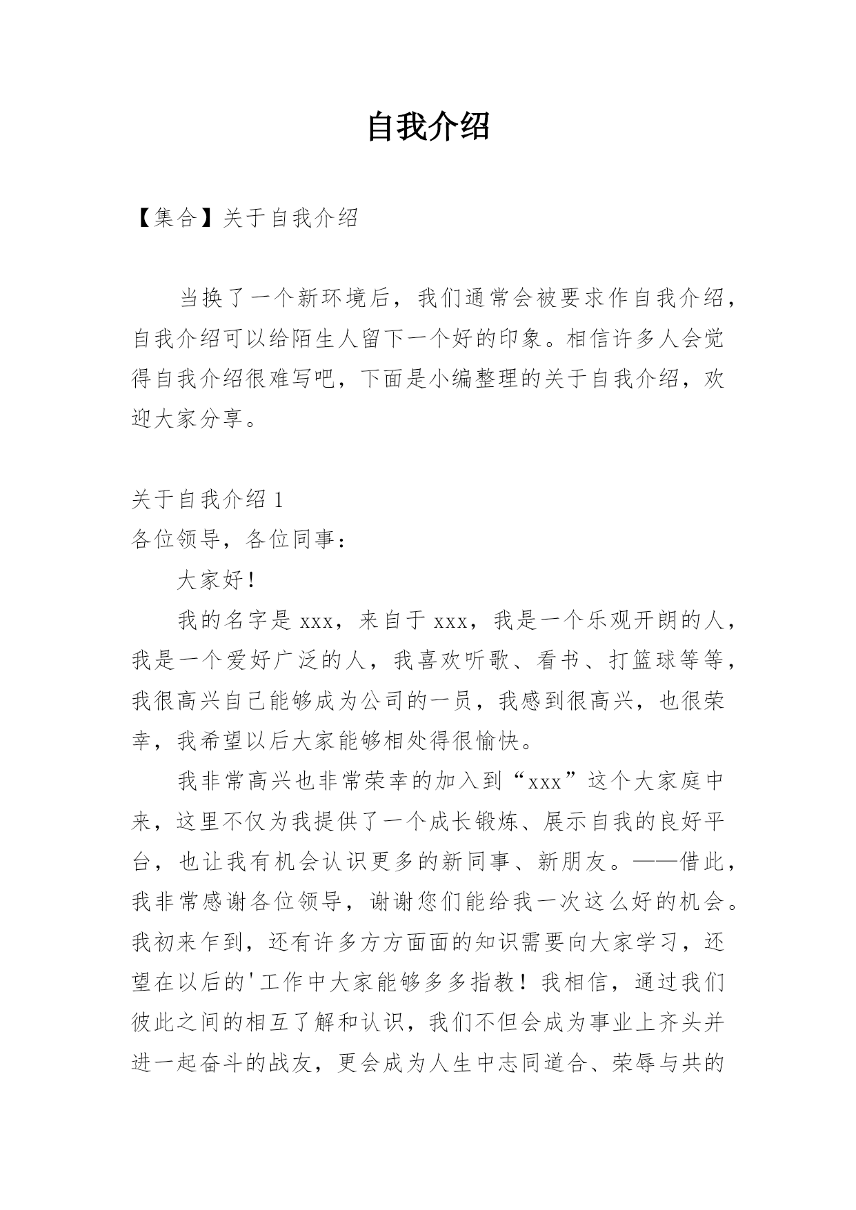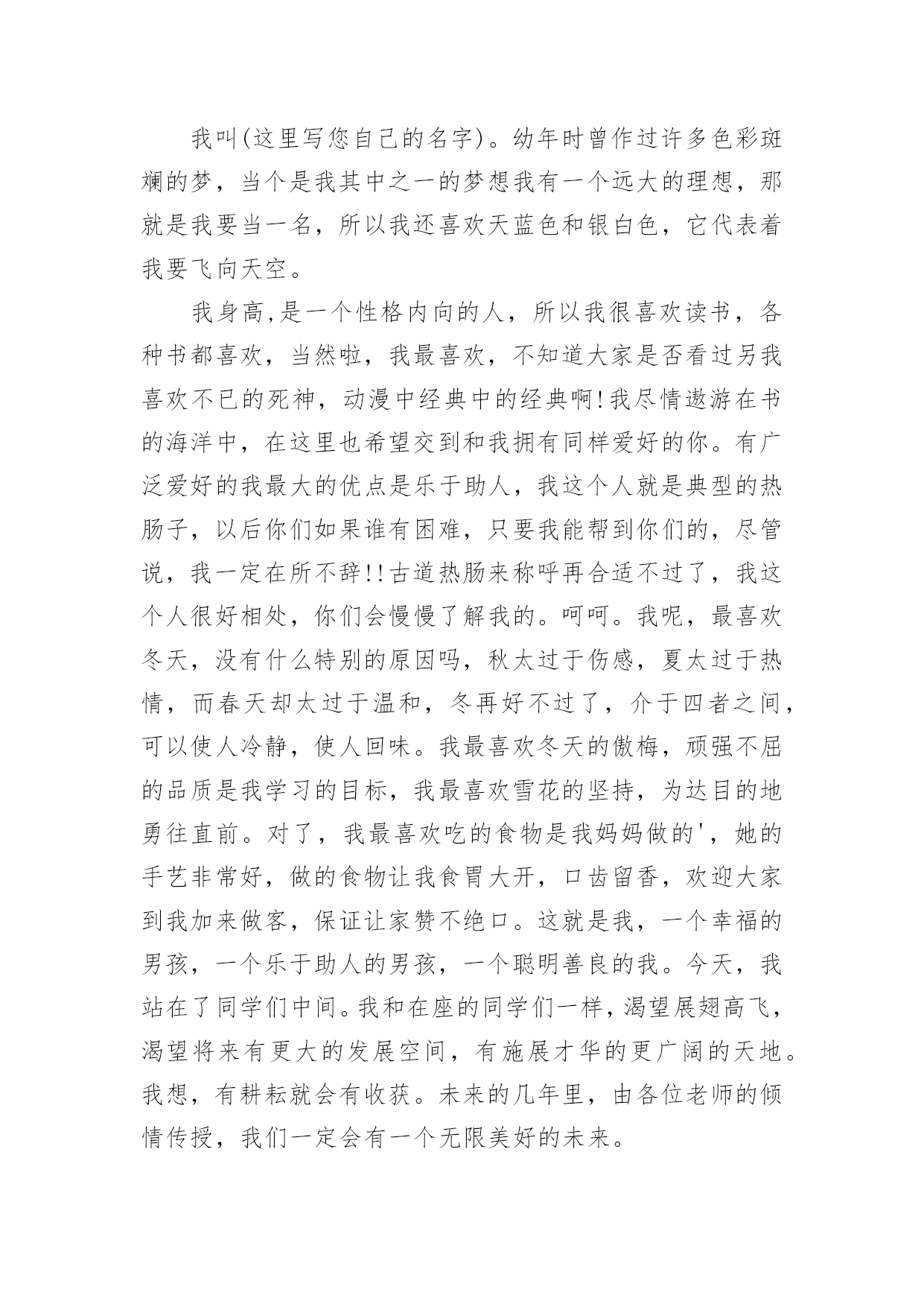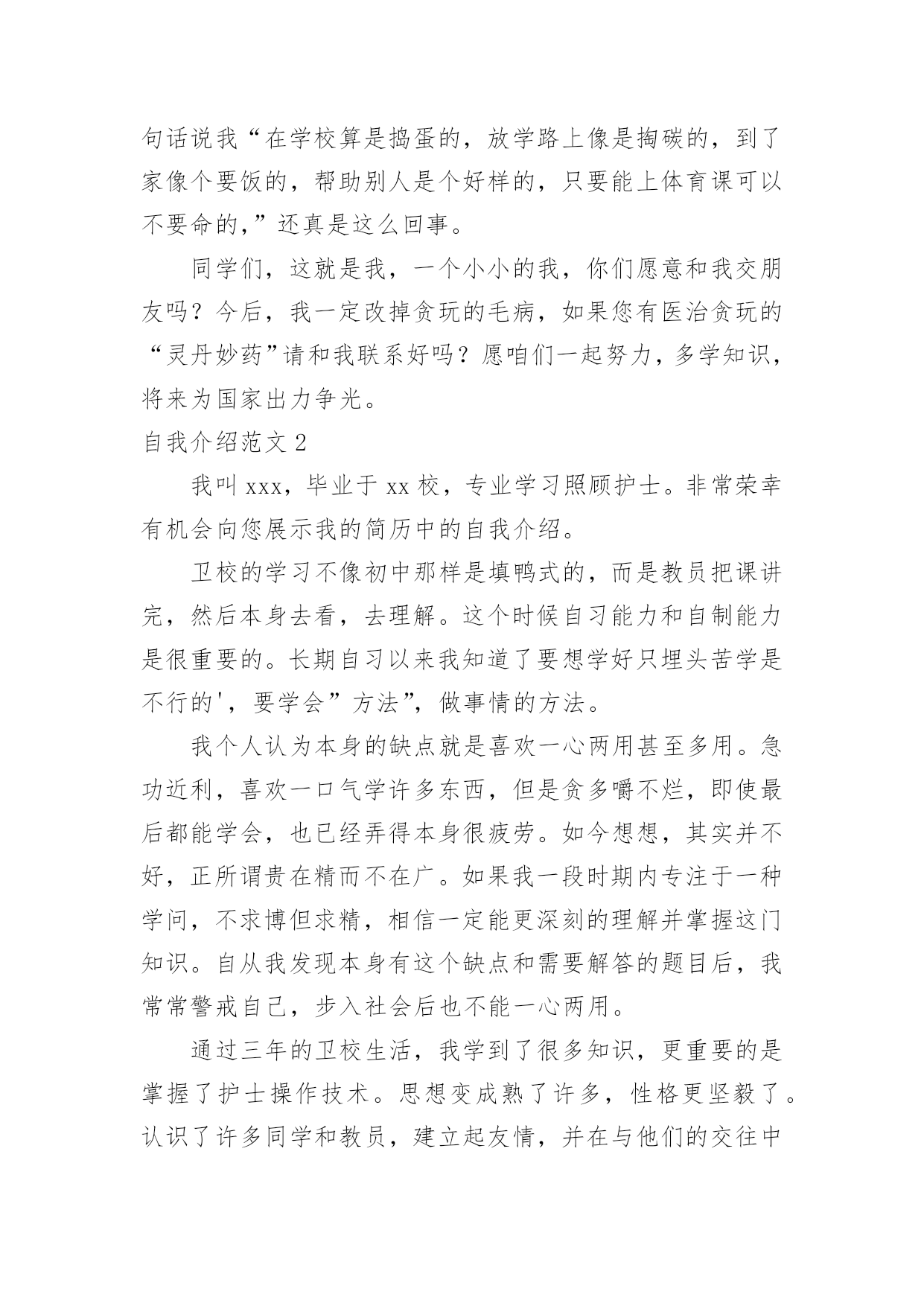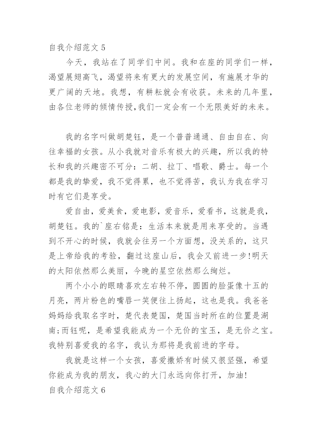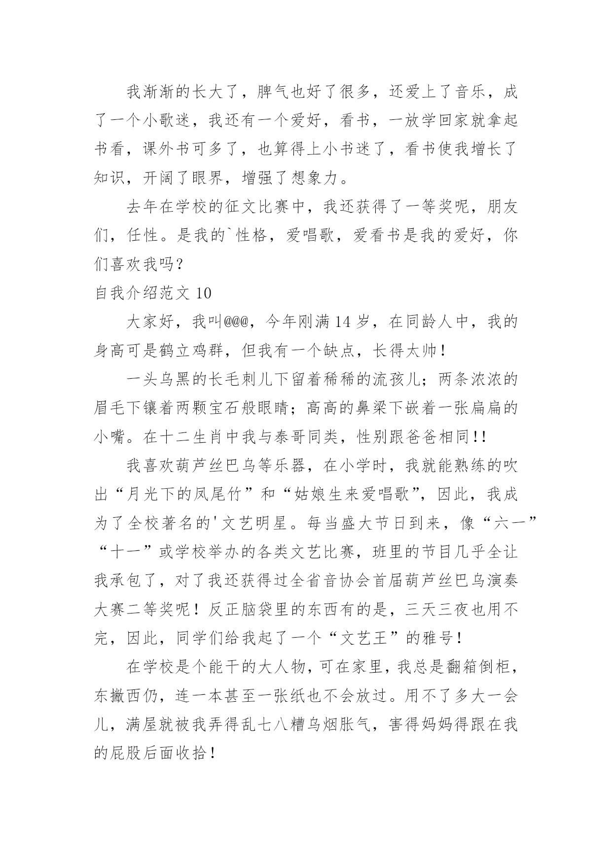 自我介绍自我介绍范文来到一个完全陌生的环境,我们有必要对自己进行适当的介绍,自我介绍是一展示自己的手段。那么自我介绍应该包括什么内容呢?以下是小编精心整理的自我介绍范文,欢迎阅读,希望大家能够喜欢。自我介绍范文1我今年10岁,是我们班的中队长,同学们都叫我班头,而我呢,也常常以“头”自居。实话实说,不怕同学们笑话,我是一个既让人喜欢有惹人生气的愣小子。在学习中,老师说我有股不服输的犟劲,爱动脑筋,兴趣广泛;但是我有一个最大的缺点——贪玩。我的学习成绩在班里一直名列前茅,大考小考经常拿第一,令班里的'其他同学眼红。在其他方面我也不甘落后,去年,在我校举行的各项比赛中,我一人夺得了数学、语文、古诗三个奖,奖品发了一大包,真让不少同学眼馋手痒,羡慕得不得了。在班里我是中队长,体育委员、卫生监督员、课代表……“。官帽”一大堆。我虽然年年被评为“三好学生”,但我心里有数,咱自己做的还不行,缺点还很多。我是个不安分喜欢运动的孩子,有时也真让大人操心,惹爸妈生气。我对下雨、下雪情有独钟,恨不得在雪地里打滚,在雨中奔跑。有时一天换几身衣服,爸爸给我总结了几句话说我“在学校算是捣蛋的,放学路上像是掏碳的,到了家像个要饭的,帮助别人是个好样的,只要能上体育课可以不要命的,”还真是这么回事。同学们,这就是我,一个小小的我,你们愿意和我交朋友吗?今后,我一定改掉贪玩的毛病,如果您有医治贪玩的“灵丹妙药”请和我联系好吗?愿咱们一起努力,多学知识,将来为国家出力争光。自我介绍范文2我叫xxx,毕业于xx校,专业学习照顾护士。非常荣幸有机会向您展示我的简历中的自我介绍。卫校的学习不像初中那样是填鸭式的,而是教员把课讲完,然后本身去看,去理解。这个时候自习能力和自制能力是很重要的。长期自习以来我知道了要想学好只埋头苦学是不行的',要学会”方法”,做事情的方法。我个人认为本身的缺点就是喜欢一心两用甚至多用。急功近利,喜欢一口气学许多东西,但是贪多嚼不烂,即使最后都能学会,也已经弄得本身很疲劳。如今想想,其实并不好,正所谓贵在精而不在广。如果我一段时期内专注于一种学问,不求博但求精,相信一定能更深刻的理解并掌握这门知识。自从我发现本身有这个缺点和需要解答的题目后,我常常警戒自己,步入社会后也不能一心两用。通过三年的卫校生活,我学到了很多知识,更重要的是掌握了护士操作技术。思想变成熟了许多,性格更坚毅了。认识了许多同学和教员,建立起友情,并在与他们的交往中提升了自身素质,认清了自身的一些短处并尽力改正。谢谢大家!自我介绍范文3大家好,我叫施振阳。我是一个瘦瘦高高的小男孩。我已经快乐地度过了9个生日。我有一双大而明亮的眼睛,一张小小的嘴巴,笑起来就会露出两排整齐的牙齿。我有一头乌黑的短发,让我看起来精神抖擞。我是黄埭中心小学三(1)班的一名学生。我和同学们和睦相处,互帮互助,一起学习,一起玩耍,大家都喜欢叫我“太阳”。平时上课我能专心听讲,还会举手发言。但是做作业时有点粗心,总是把题目看错,今后我一定要改掉这个坏毛病,养成细心的好习惯。我的爱好很多,比如:看书、画画、踢足球。现在,我的书架上已经有很多书了,一有空我就会拿出来读一读。而且我已经坚持学画画5年了,画得很不错了呢。不过,我还是最喜欢踢足球,踢足球是一项强身健体的.好运动。再告诉大家一个小秘密,我已经学习拉小提琴一年多了,而且我一定会继续坚持,争取拉出动听的歌曲。看了我的自我介绍,大家应该了解我了吧。自我介绍范文4我是一个活泼开朗女孩,我名字叫陈硕,看个名字,可能有人会认为我是一个男孩子,其实我是一个性格比较外向女孩子。因为我爸爸姓陈,又是硕士,以全家人都希望我能够像爸爸那样也是硕士。我有一头乌黑发亮头发,喜欢梳一把马尾巴。我有一个椭圆形脸蛋,像一小鸡蛋,在那椭圆形脸上,长着一双又大又灵眼睛,眼睛里黑眼珠,像一个黑葡萄我鼻子高高,嘴红红,一说起话来就没完没,我真喜欢妈妈给我这张脸。我今年十二岁,是家里独生子,也是家里“掌上明珠”,爸爸、妈妈平时都爱宠着我。我在班上学习虽然谈不上数一数二,却是小有名气,我人缘也很好,班上有一大半同学都是我好朋友其中还有我“知心朋友”。我不仅朋友多,而且兴趣爱好也多不得,有:“画画、玩电脑、游泳、弹钢琴、看书……我最喜欢看书。我很小时候,爸爸就给我买许多识字手册,经常给我读一些故事书,可说,我童年就是在书海中度过。随着我年龄增长,我家书也越来越多,现在我家就象一座小图书馆,到处都是书,我自己书更是多得数不胜数,整整放两个柜子。虽然我平时一向很节约,但是对买书却毫不吝啬,只要是我喜欢实用书,而且不是很贵,我一定会马上买下来。有时候我遇到一本好书,又因为价格太贵而不能买,我一定会翻来覆去地看好几遍才甘心,所以每次我一进书店,都要看上大半天。高尔基曾经说过:”书是人类进步阶梯“。