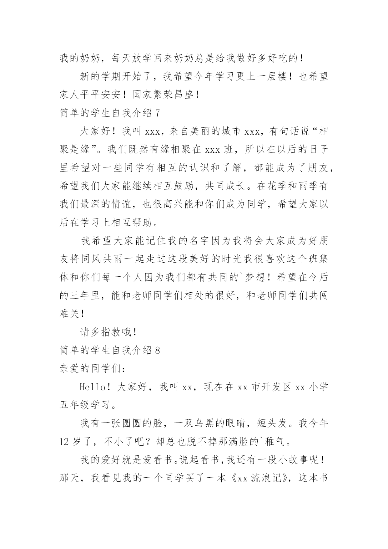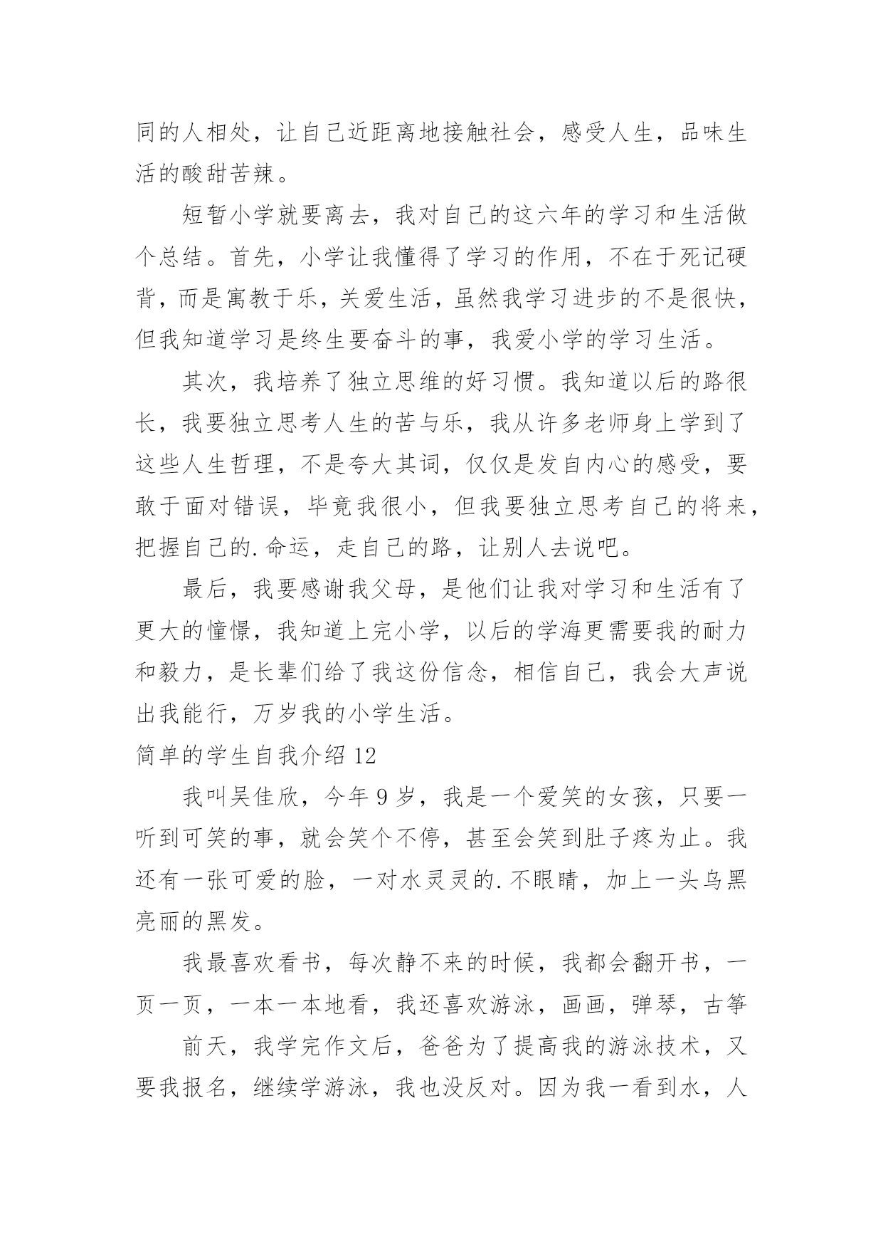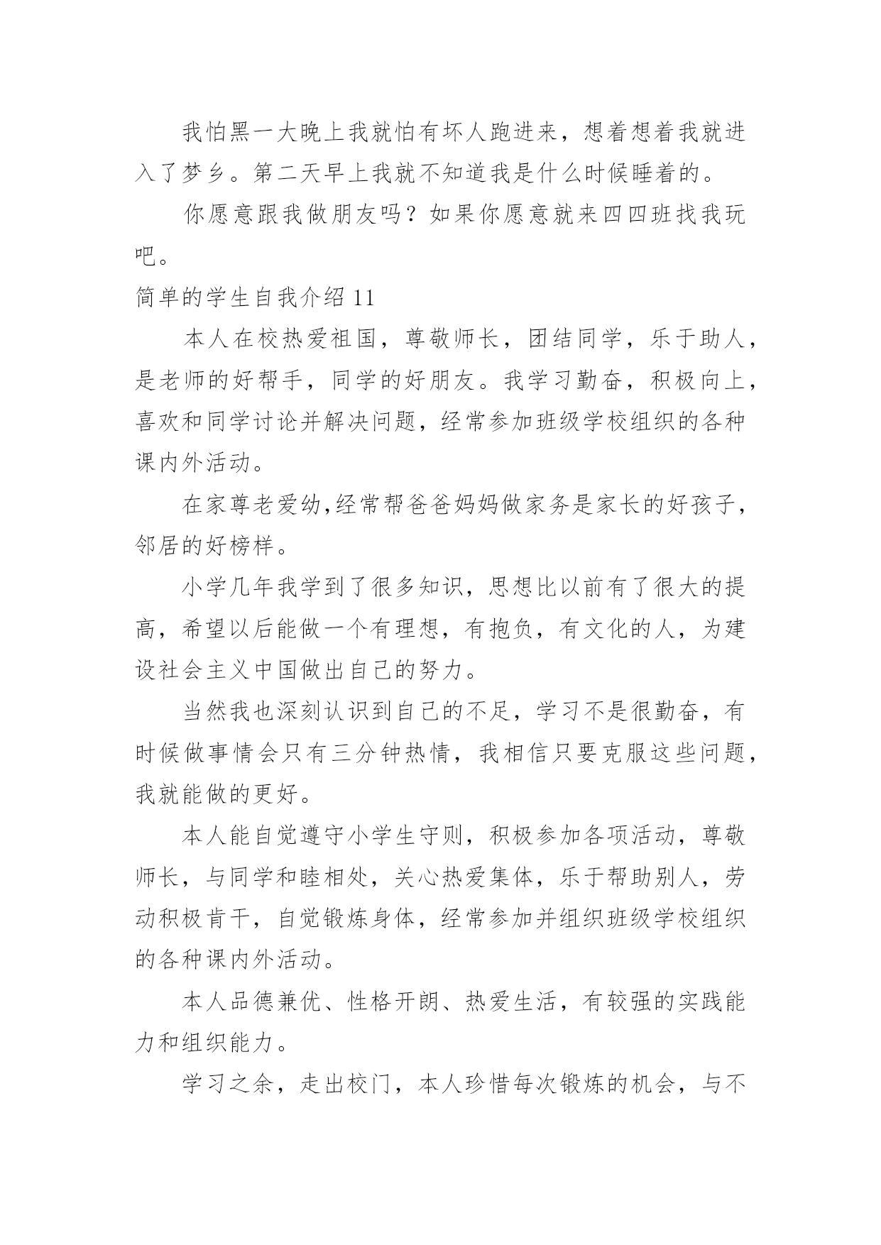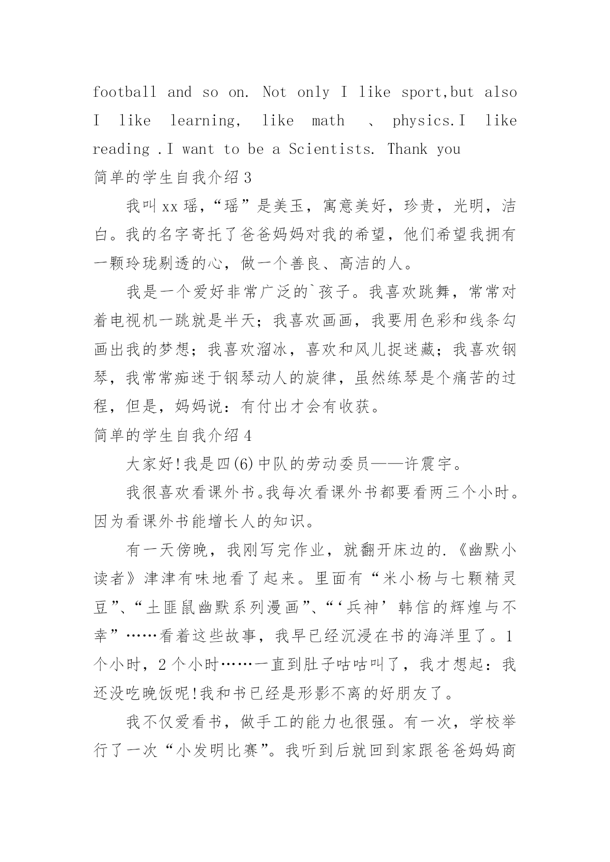 简单的学生自我介绍简单的学生自我介绍处在一个陌生场合时,我们总少不了要向他人介绍自己,自我介绍是一种认识自我的手段。那么你真的会写自我介绍吗?以下是小编整理的简单的学生自我介绍,仅供参考,欢迎大家阅读。简单的学生自我介绍1大家好,我叫冉卓宸,20xx年9月8日出生的。我的身高1米3,体重是26千克。我是家里最小的,没有弟弟或妹妹,但是有一个姐姐,我姐姐上高二了,在学校里住。我家在东风路华科尚城小区。爸爸和妈妈每次都说我很瘦,每次都让我多吃些饭,我已经上XXX年级了。我的心愿是当一名画家,因为我喜欢画画,我认为当一名画家可以每天无忧无虑的,想画什么就画什么,画出我们的大好河山。我希望春节的'时候,全家可以团团圆圆的,新学期我要好好学习。简单的学生自我介绍2Hello,everyone!Nicetomeetyou!MynameisXX,Iamfifteenyearsold.Iaminclass197,XXXschool.Asyousee,Iamaboy(haha),Iamnotsotallandnotsostrong.ButIlikeverysport,forexample,Ilikeplayingbing-bongball、basketball、footballandsoon.NotonlyIlikesport,butalsoIlikelearning,likemath、physics.Ilikereading.IwanttobeaScientists.Thankyou简单的学生自我介绍3我叫xx瑶,“瑶”是美玉,寓意美好,珍贵,光明,洁白。我的名字寄托了爸爸妈妈对我的希望,他们希望我拥有一颗玲珑剔透的心,做一个善良、高洁的人。我是一个爱好非常广泛的`孩子。我喜欢跳舞,常常对着电视机一跳就是半天;我喜欢画画,我要用色彩和线条勾画出我的梦想;我喜欢溜冰,喜欢和风儿捉迷藏;我喜欢钢琴,我常常痴迷于钢琴动人的旋律,虽然练琴是个痛苦的过程,但是,妈妈说:有付出才会有收获。简单的学生自我介绍4大家好!我是四(6)中队的劳动委员——许震宇。我很喜欢看课外书。我每次看课外书都要看两三个小时。因为看课外书能增长人的知识。有一天傍晚,我刚写完作业,就翻开床边的.《幽默小读者》津津有味地看了起来。里面有“米小杨与七颗精灵豆”、“土匪鼠幽默系列漫画”、“‘兵神’韩信的辉煌与不幸”……看着这些故事,我早已经沉浸在书的海洋里了。1个小时,2个小时……一直到肚子咕咕叫了,我才想起:我还没吃晚饭呢!我和书已经是形影不离的好朋友了。我不仅爱看书,做手工的能力也很强。有一次,学校举行了一次“小发明比赛”。我听到后就回到家跟爸爸妈妈商量,然后就做了一个纸笔筒。后来在学校里经过加工,又变成了“神舟六号”。这就是我一个既爱看书又爱做手工的男孩。简单的学生自我介绍5在生活中交朋友必不可少的就是自我介绍,我先来介绍一下我自己吧。我叫xxx家住在安徽省的xxx市,在xx小学就读一年级,我今年七岁了,我在空闲的时候比较喜欢玩拼图游戏,我现在已经拼完很多的拼图了,我对画画比较感兴趣,所以在平时我也会画一些画,然后我呢比较喜欢交朋友,所以我很高兴能和你做朋友。我觉得自我介绍不仅要介绍你的基本情况,还要介绍你的爱好,兴趣之类的,这样才能让别人更加的了解你,找到聊天的`话题。这样才能交到朋友,还有在做自我介绍时要面带微笑,这样别人才会觉得到你的真心。自我介绍讲究一个好的方法,找到那个适合你的自我介绍方法很重要。只要你有一个适合你的介绍方法,你会交到很多的朋友。简单的学生自我介绍6我叫朱欣昊,出生于20xx年,身高一米四,体重78斤,不胖不瘦刚刚好,我个人感觉还可以!我长大想当医生,我今年九岁了,我妹妹六岁半,我很喜欢我妹妹,她很懂事,佷听妈妈的话,我很爱我的爸爸和妈妈,还有我可爱的.妹妹!还有一位我最爱的人,那就是我的奶奶,每天放学回来奶奶总是给我做好多好吃的!新的学期开始了,我希望今年学习更上一层楼!也希望家人平平安安!国家繁荣昌盛!简单的学生自我介绍7大家好!我叫xxx,来自美丽的城市xxx,有句话说“相聚是缘”。我们既然有缘相聚在xxx班,所以在以后的日子里希望对一些同学有相互的认识和了解,都能成为了朋友,希望我们大家能继续相互鼓励,共同成长。在花季和雨季有我们最深的情谊,也很高兴能和你们成为同学,希望大家以后在学习上相互帮助。我希望大家能记住我的名字因为我将会大家成为好朋友将同风共雨一起走过这段美好的时光我很喜欢这个班集体和你们每一个人因为我们都有共同的`梦想!希望在今后的三年里,能和老师同学们相处的很好,和老师同学们共闯难关!请多指教哦!简单的学生自我介绍8亲爱的同学们:Hello!大家好,我叫xx,现在在xx市开发区xx小学五年级学习。我有一张圆圆的脸,一双乌黑的眼睛