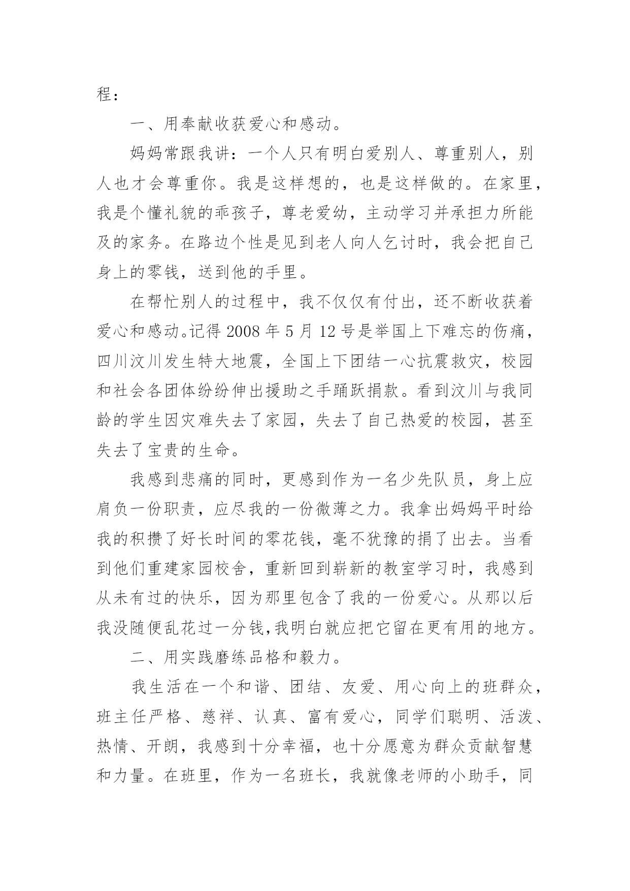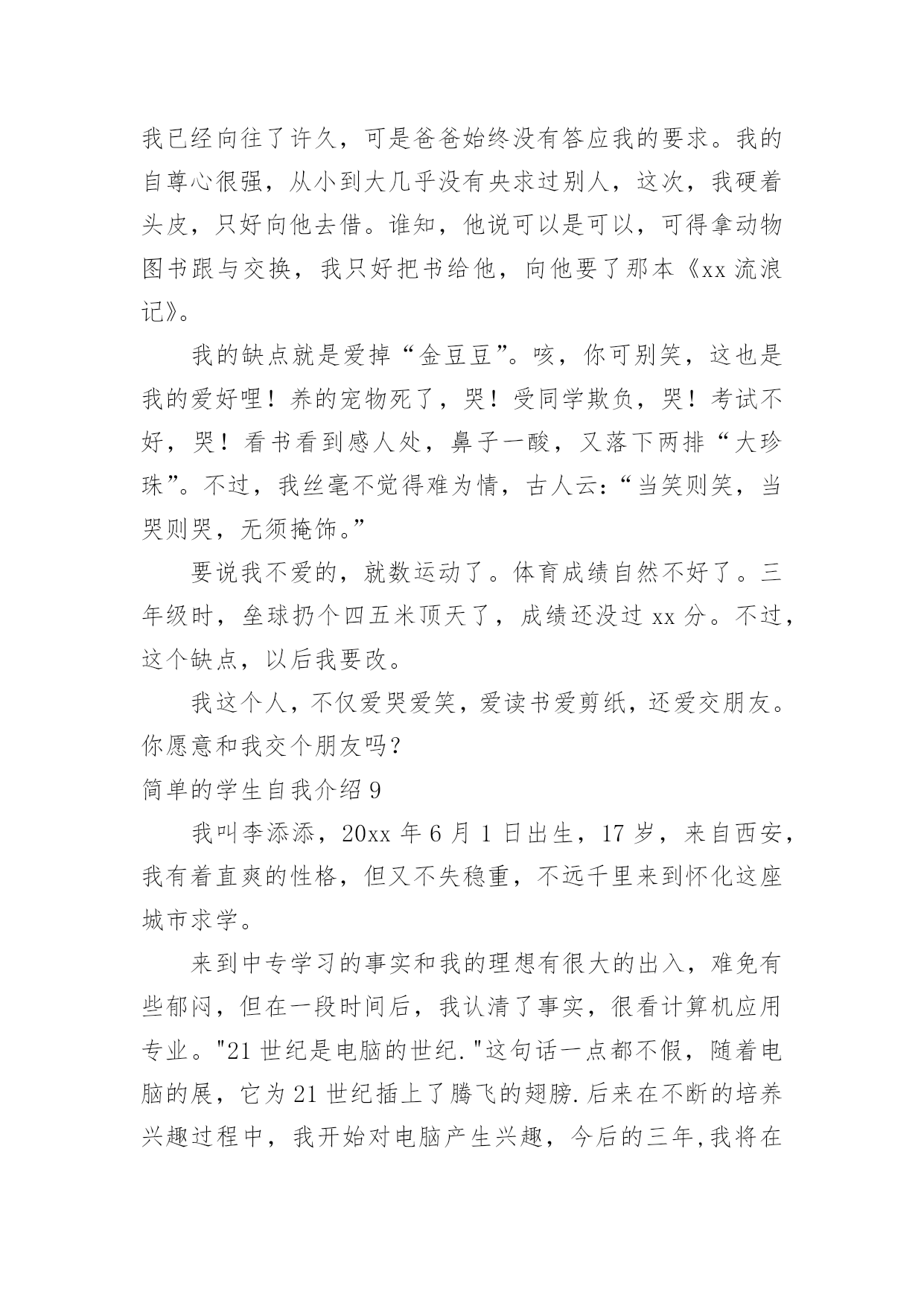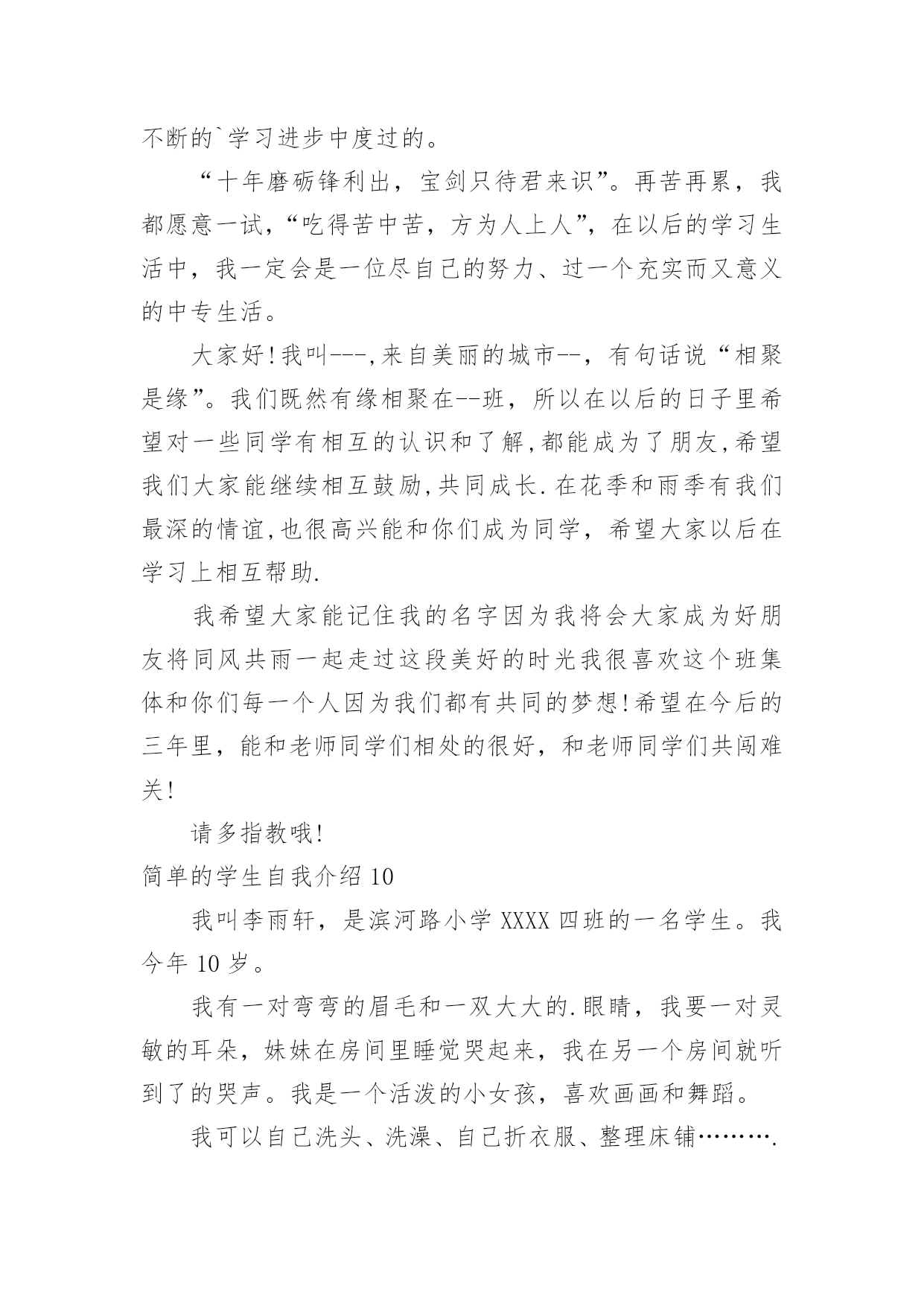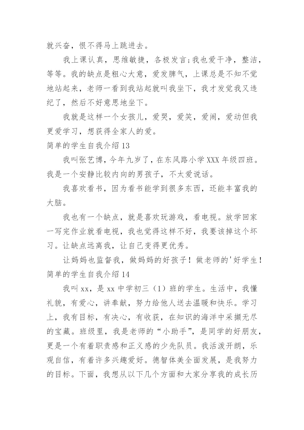 简单的学生自我介绍简单的学生自我介绍处在一个陌生场合时,我们总少不了要向他人介绍自己,自我介绍是一种认识自我的手段。那么你真的会写自我介绍吗?以下是小编整理的简单的学生自我介绍,仅供参考,欢迎大家阅读。简单的学生自我介绍1大家好,我叫冉卓宸,20xx年9月8日出生的。我的身高1米3,体重是26千克。我是家里最小的,没有弟弟或妹妹,但是有一个姐姐,我姐姐上高二了,在学校里住。我家在东风路华科尚城小区。爸爸和妈妈每次都说我很瘦,每次都让我多吃些饭,我已经上XXX年级了。我的心愿是当一名画家,因为我喜欢画画,我认为当一名画家可以每天无忧无虑的,想画什么就画什么,画出我们的大好河山。我希望春节的'时候,全家可以团团圆圆的,新学期我要好好学习。简单的学生自我介绍2Hello,everyone!Nicetomeetyou!MynameisXX,Iamfifteenyearsold.Iaminclass197,XXXschool.Asyousee,Iamaboy(haha),Iamnotsotallandnotsostrong.ButIlikeverysport,forexample,Ilikeplayingbing-bongball、basketball、footballandsoon.NotonlyIlikesport,butalsoIlikelearning,likemath、physics.Ilikereading.IwanttobeaScientists.Thankyou简单的学生自我介绍3我叫xx瑶,“瑶”是美玉,寓意美好,珍贵,光明,洁白。我的名字寄托了爸爸妈妈对我的希望,他们希望我拥有一颗玲珑剔透的心,做一个善良、高洁的人。我是一个爱好非常广泛的`孩子。我喜欢跳舞,常常对着电视机一跳就是半天;我喜欢画画,我要用色彩和线条勾画出我的梦想;我喜欢溜冰,喜欢和风儿捉迷藏;我喜欢钢琴,我常常痴迷于钢琴动人的旋律,虽然练琴是个痛苦的过程,但是,妈妈说:有付出才会有收获。简单的学生自我介绍4大家好!我是四(6)中队的劳动委员——许震宇。我很喜欢看课外书。我每次看课外书都要看两三个小时。因为看课外书能增长人的知识。有一天傍晚,我刚写完作业,就翻开床边的.《幽默小读者》津津有味地看了起来。里面有“米小杨与七颗精灵豆”、“土匪鼠幽默系列漫画”、“‘兵神’韩信的辉煌与不幸”……看着这些故事,我早已经沉浸在书的海洋里了。1个小时,2个小时……一直到肚子咕咕叫了,我才想起:我还没吃晚饭呢!我和书已经是形影不离的好朋友了。我不仅爱看书,做手工的能力也很强。有一次,学校举行了一次“小发明比赛”。我听到后就回到家跟爸爸妈妈商量,然后就做了一个纸笔筒。后来在学校里经过加工,又变成了“神舟六号”。这就是我一个既爱看书又爱做手工的男孩。简单的学生自我介绍5在生活中交朋友必不可少的就是自我介绍,我先来介绍一下我自己吧。我叫xxx家住在安徽省的xxx市,在xx小学就读一年级,我今年七岁了,我在空闲的时候比较喜欢玩拼图游戏,我现在已经拼完很多的拼图了,我对画画比较感兴趣,所以在平时我也会画一些画,然后我呢比较喜欢交朋友,所以我很高兴能和你做朋友。我觉得自我介绍不仅要介绍你的基本情况,还要介绍你的爱好,兴趣之类的,这样才能让别人更加的了解你,找到聊天的`话题。这样才能交到朋友,还有在做自我介绍时要面带微笑,这样别人才会觉得到你的真心。自我介绍讲究一个好的方法,找到那个适合你的自我介绍方法很重要。只要你有一个适合你的介绍方法,你会交到很多的朋友。简单的学生自我介绍6我叫朱欣昊,出生于20xx年,身高一米四,体重78斤,不胖不瘦刚刚好,我个人感觉还可以!我长大想当医生,我今年九岁了,我妹妹六岁半,我很喜欢我妹妹,她很懂事,佷听妈妈的话,我很爱我的爸爸和妈妈,还有我可爱的.妹妹!还有一位我最爱的人,那就是我的奶奶,每天放学回来奶奶总是给我做好多好吃的!新的学期开始了,我希望今年学习更上一层楼!也希望家人平平安安!国家繁荣昌盛!简单的学生自我介绍7大家好!我叫xxx,来自美丽的城市xxx,有句话说“相聚是缘”。我们既然有缘相聚在xxx班,所以在以后的日子里希望对一些同学有相互的认识和了解,都能成为了朋友,希望我们大家能继续相互鼓励,共同成长。在花季和雨季有我们最深的情谊,也很高兴能和你们成为同学,希望大家以后在学习上相互帮助。我希望大家能记住我的名字因为我将会大家成为好朋友将同风共雨一起走过这段美好的时光我很喜欢这个班集体和你们每一个人因为我们都有共同的`梦想!希望在今后的三年里,能和老师同学们相处的很好,和老师同学们共闯难关!请多指教哦!简单的学生自我介绍8亲爱的同学们:Hello!大家好,我叫xx,现在在xx市开发区xx小学五年级学习。我有一张圆圆的脸,一双乌黑的眼睛