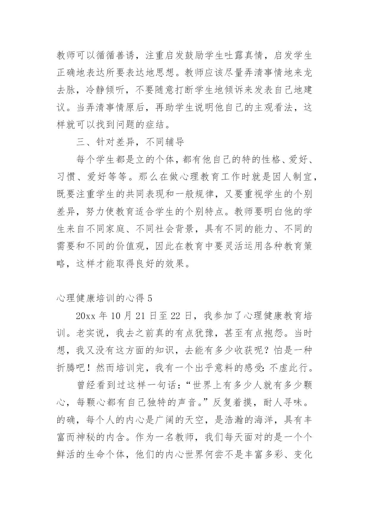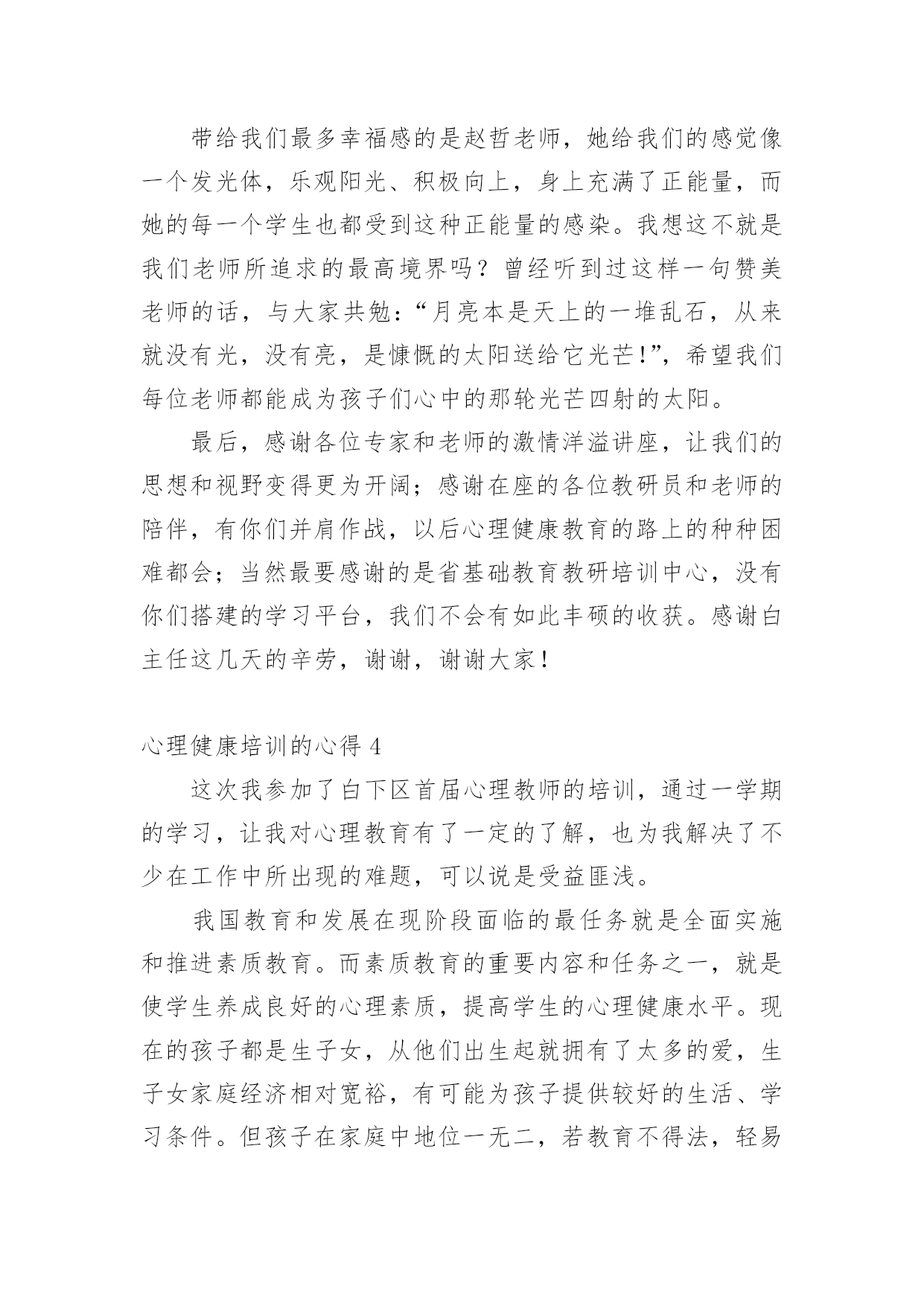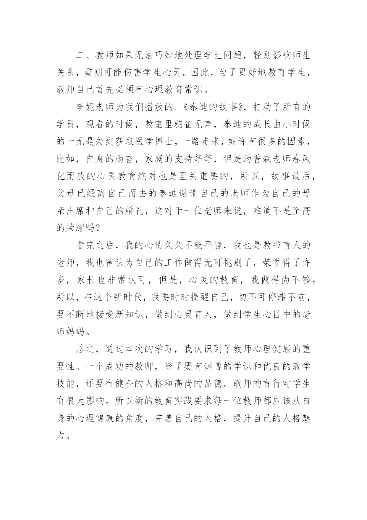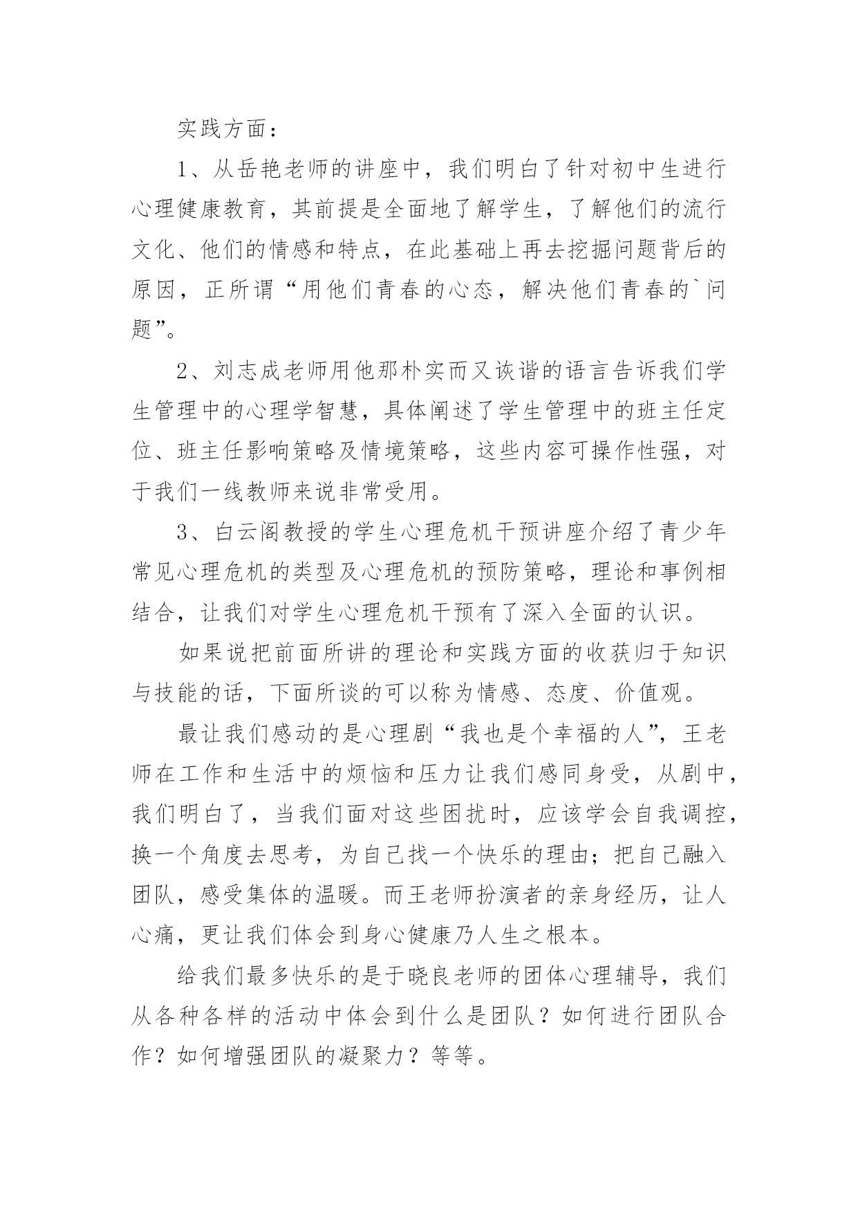 心理健康培训的心得当我们经过反思,对生活有了新的看法时,心得体会是很好的记录方式,这样有利于培养我们思考的习惯。那么写心得体会要注意的内容有什么呢?以下是小编为大家收集的心理健康培训的心得,欢迎阅读与收藏。心理健康培训的心得1心理健康教育在现代社会的教育中越来越重要。如何开展心理健康教育,开展成功与否,是学校教育的重要一环,下方就我在心理教育方面的几点心得:一、抓认识提高,明确心理健康教育的重要性。社会日新月异的急速发展和变革,各种不良思潮和矛盾使在校青少年学生受到了极大的影响。由于青少年学生正值成长发展过程中,缺乏科学的辨别潜力和社会实践经验,加上小学生的独立意识较差,所以小学生很少易发生心理行为偏差。近年来,小学生常出现妒忌、自卑、孤僻等不健康心理行为,究其原因,我们不难发现,他们存在心理偏差,是由于在学习和生活中碰到问题和困难时,缺乏解决矛盾,应对挫折和处理危机的潜力。作为教育工作者我们对此不能置之不理,不能只注重分数而不管学生是否具有健康的心理和健全的人格,我们要培养的是人才而不是废才,更不是害群之马,因此,我们全校上下构成共识:要下足功夫,正视心理健康教育,促使学生的健康发展,健全他们的人格,为21世纪培养合格的人才。二、抓学科渗透,扎实推进心理健康教育。课堂是学校进行教育活动的主要场所,课堂教学不仅仅是科学知识传授的过程,也是学生心理发展的过程。我们严格按照上级要求,开设上好心理健康课的同时,要求教师在各科备课时注意挖掘心理健康教育的教育因素。思品课,抓好心理疏导的教育;语文课,以教材中超多的优秀文字形象,从这些人物身上体会和感悟良好的心理素质;数学课中研究重点是观察、注意、思维、记忆等心理活动;英语课则要求创设宽松、和谐的课堂气氛,增强学生学习信心,使之敢于表现自我,增强学生群体交往意识,发展潜力和个性;音乐、美术等以培养学生良好的情感体验,给人以美的熏陶方面的心理健康教育。在各学科教学过程中渗透有关的知识,能够使学生处处都感受到真、善、美的教育,提高自身的心理素质,且作为教育的主体,教师不仅仅在知识上影响着学生,而且教师的人格也会在教学的师生互动过程中起潜移默化的作用,这就构成了心理健康教育的一个重要资料。三、抓课题研究,从细处着手抓好心理健康教育。探索了一系列针对小学生的关爱教育的资料及途径,探索并构成了优化学生情感体验、人格发展的一系列的方式方法。主要是在教师以身示范下,对小学生开展“关爱自我、关爱他人、关爱社会”三个方面的教育。透过开展主题活动,抓陶冶、抓体验、抓渗透等展开教育,我们明显感觉到学生的心理素质、道德情感得到不一样程度的提高、优化。在校内、班级中师生之间、同学之间互相关爱、团结帮忙蔚然成风,在各种学习活动中,学生合群,用心参与,团结协作,自尊自信,创新精神等得以充分体现。在家中,社会上,学生都能从小事做起主动关心、爱护、帮忙他人,富有同情心。多次主题队活动的开展,使学生受到教育的同时,自身的潜力不断得到提高,心理素质明显加强。四、抓家庭教育,引导学生家长关心子女的心理健康。由于学生家长与学生固有的血缘关系,感情和伦理道德上的内在联系,家庭教育直接影响着学校教育的效果,也是学校教育所不能代替的一种力量。父母在关心子女的生理健康的同时,还应关心他们的心理健康。有些父母认为孩子长得壮,不生病就是健康,这是不全面的认识。事实上,有一些青少年身上存在心理障碍,如说谎、无理取闹、妒忌、自卑、不合群等行为。然而,认识的`片面性,不少家长对于孩子的心理健康不够重视,甚至采取违背心理保健的教育方法,这是不利于他们的心理健康发展的,在发现他们心理有缺陷时我们就及时与家长联系做到及时矫正,并在学校上对家长开展如何对子女进行心理健康教育的讲座,引导家长科学地教育孩子,从而培养孩子关心社会、关心他人,培养他们的职责感、独立性和自制力,养成乐观进取的精神。总之,要使学生的心理得以健康发展,学校及教育工作者务必掌握好心理知识,遵循学生心理发展的规律,在实践中灵活运用心理教育规律,探索学生的心理发展,总结心理教育的经验,与家庭、社会紧密联系,才能取得良好的成效。心理健康培训的心得2这次心理健康培训面向即将参加本年度职称评定的教师,我是小教高级,暂时是不需要考虑这次培训了。可是,看到继续教育通知中有“心理健康”一项,我毫不犹豫地报名了,因为我知道,心理健康在当今社会真是越来越占有重要的地位了。作为教师,参加心理健康培训,无论对自身,还是对学生,都是有莫大的帮助。培训期间,老师们精彩地授课,深入浅出,通俗易懂,让我们在坐的学员受益匪浅,培训之后我也感想颇多。我想就此问题谈谈自己从这次培训中获得的体会。一、心理健康与心理不健康并没有严格的界限,所以对任何一个人来说,都有可能出现某些不够健康的心理状态,教师也不例外。尤其是现代高