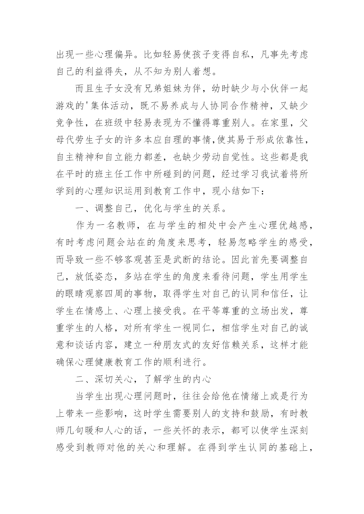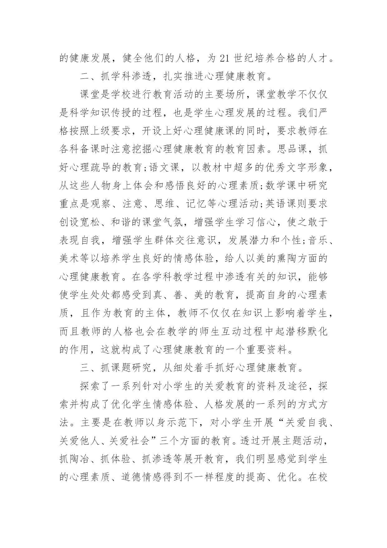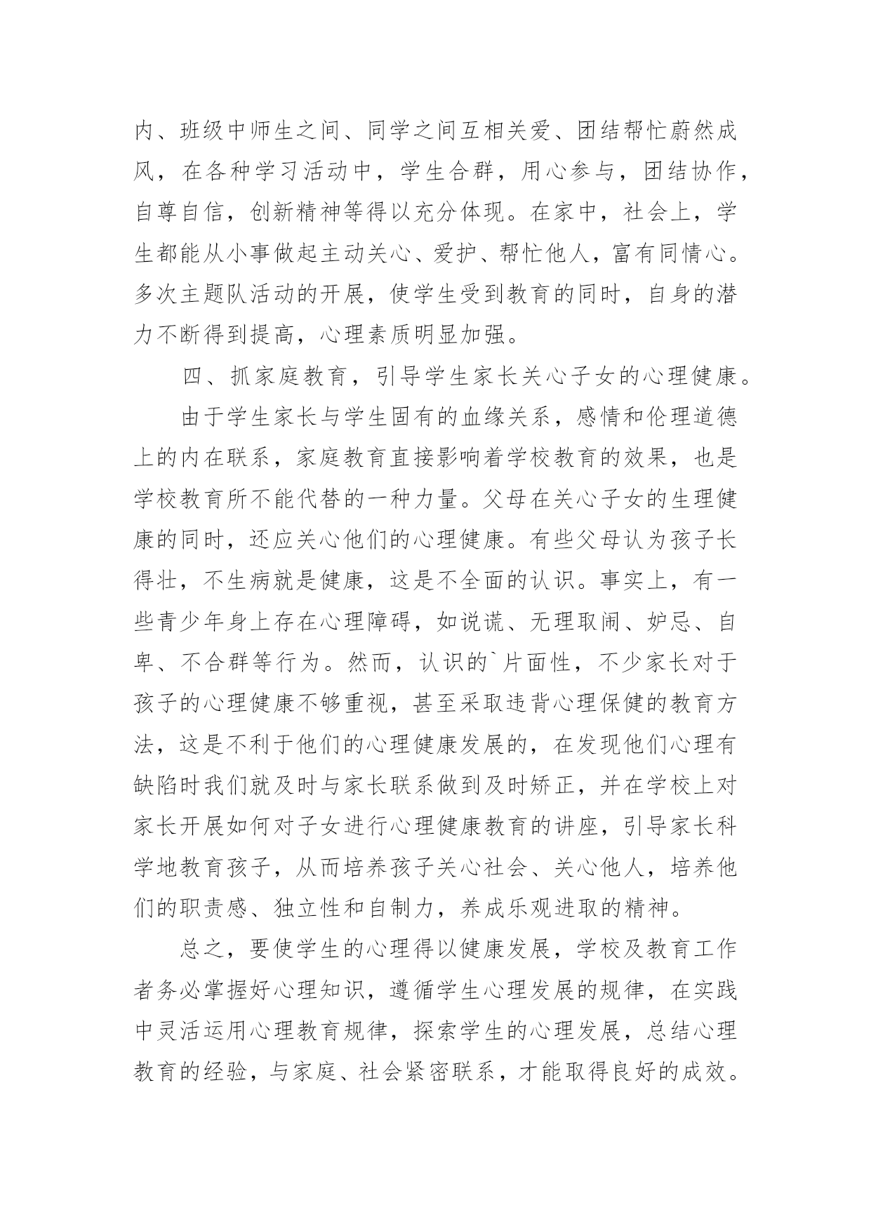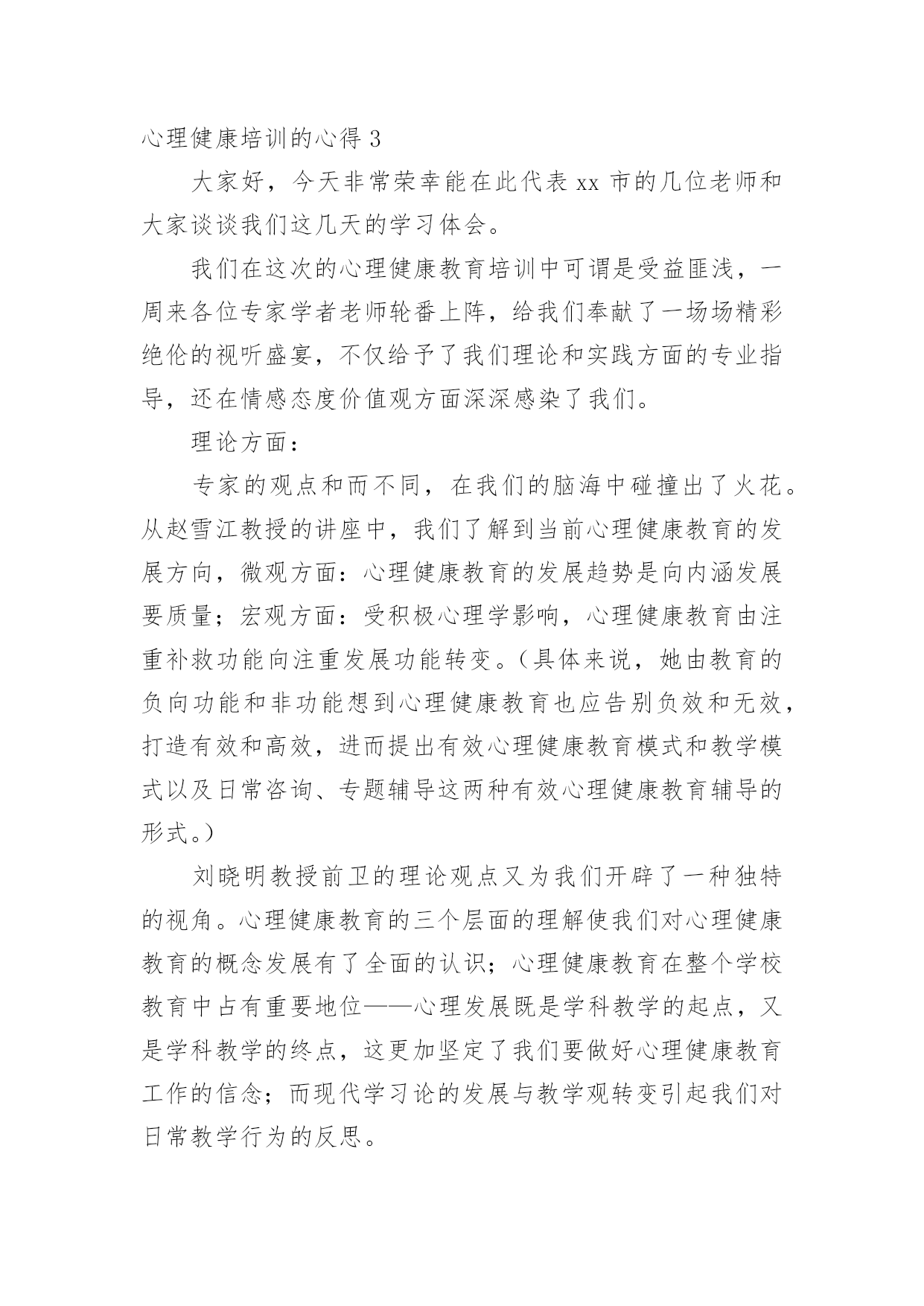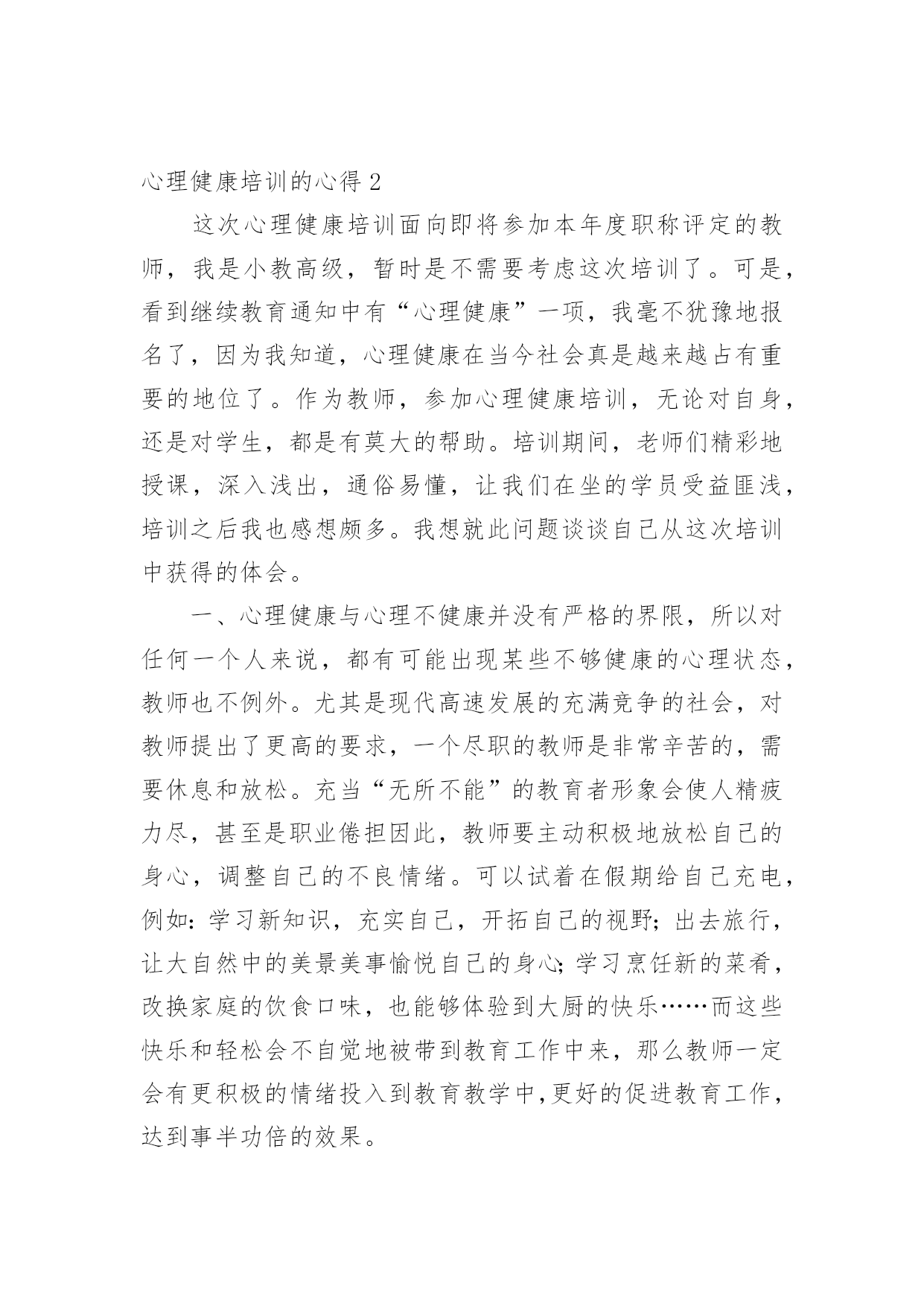 心理健康培训的心得当我们经过反思,对生活有了新的看法时,心得体会是很好的记录方式,这样有利于培养我们思考的习惯。那么写心得体会要注意的内容有什么呢?以下是小编为大家收集的心理健康培训的心得,欢迎阅读与收藏。心理健康培训的心得1心理健康教育在现代社会的教育中越来越重要。如何开展心理健康教育,开展成功与否,是学校教育的重要一环,下方就我在心理教育方面的几点心得:一、抓认识提高,明确心理健康教育的重要性。社会日新月异的急速发展和变革,各种不良思潮和矛盾使在校青少年学生受到了极大的影响。由于青少年学生正值成长发展过程中,缺乏科学的辨别潜力和社会实践经验,加上小学生的独立意识较差,所以小学生很少易发生心理行为偏差。近年来,小学生常出现妒忌、自卑、孤僻等不健康心理行为,究其原因,我们不难发现,他们存在心理偏差,是由于在学习和生活中碰到问题和困难时,缺乏解决矛盾,应对挫折和处理危机的潜力。作为教育工作者我们对此不能置之不理,不能只注重分数而不管学生是否具有健康的心理和健全的人格,我们要培养的是人才而不是废才,更不是害群之马,因此,我们全校上下构成共识:要下足功夫,正视心理健康教育,促使学生的健康发展,健全他们的人格,为21世纪培养合格的人才。二、抓学科渗透,扎实推进心理健康教育。课堂是学校进行教育活动的主要场所,课堂教学不仅仅是科学知识传授的过程,也是学生心理发展的过程。我们严格按照上级要求,开设上好心理健康课的同时,要求教师在各科备课时注意挖掘心理健康教育的教育因素。思品课,抓好心理疏导的教育;语文课,以教材中超多的优秀文字形象,从这些人物身上体会和感悟良好的心理素质;数学课中研究重点是观察、注意、思维、记忆等心理活动;英语课则要求创设宽松、和谐的课堂气氛,增强学生学习信心,使之敢于表现自我,增强学生群体交往意识,发展潜力和个性;音乐、美术等以培养学生良好的情感体验,给人以美的熏陶方面的心理健康教育。在各学科教学过程中渗透有关的知识,能够使学生处处都感受到真、善、美的教育,提高自身的心理素质,且作为教育的主体,教师不仅仅在知识上影响着学生,而且教师的人格也会在教学的师生互动过程中起潜移默化的作用,这就构成了心理健康教育的一个重要资料。三、抓课题研究,从细处着手抓好心理健康教育。探索了一系列针对小学生的关爱教育的资料及途径,探索并构成了优化学生情感体验、人格发展的一系列的方式方法。主要是在教师以身示范下,对小学生开展“关爱自我、关爱他人、关爱社会”三个方面的教育。透过开展主题活动,抓陶冶、抓体验、抓渗透等展开教育,我们明显感觉到学生的心理素质、道德情感得到不一样程度的提高、优化。在校内、班级中师生之间、同学之间互相关爱、团结帮忙蔚然成风,在各种学习活动中,学生合群,用心参与,团结协作,自尊自信,创新精神等得以充分体现。在家中,社会上,学生都能从小事做起主动关心、爱护、帮忙他人,富有同情心。多次主题队活动的开展,使学生受到教育的同时,自身的潜力不断得到提高,心理素质明显加强。四、抓家庭教育,引导学生家长关心子女的心理健康。由于学生家长与学生固有的血缘关系,感情和伦理道德上的内在联系,家庭教育直接影响着学校教育的效果,也是学校教育所不能代替的一种力量。父母在关心子女的生理健康的同时,还应关心他们的心理健康。有些父母认为孩子长得壮,不生病就是健康,这是不全面的认识。事实上,有一些青少年身上存在心理障碍,如说谎、无理取闹、妒忌、自卑、不合群等行为。然而,认识的`片面性,不少家长对于孩子的心理健康不够重视,甚至采取违背心理保健的教育方法,这是不利于他们的心理健康发展的,在发现他们心理有缺陷时我们就及时与家长联系做到及时矫正,并在学校上对家长开展如何对子女进行心理健康教育的讲座,引导家长科学地教育孩子,从而培养孩子关心社会、关心他人,培养他们的职责感、独立性和自制力,养成乐观进取的精神。总之,要使学生的心理得以健康发展,学校及教育工作者务必掌握好心理知识,遵循学生心理发展的规律,在实践中灵活运用心理教育规律,探索学生的心理发展,总结心理教育的经验,与家庭、社会紧密联系,才能取得良好的成效。心理健康培训的心得2这次心理健康培训面向即将参加本年度职称评定的教师,我是小教高级,暂时是不需要考虑这次培训了。可是,看到继续教育通知中有“心理健康”一项,我毫不犹豫地报名了,因为我知道,心理健康在当今社会真是越来越占有重要的地位了。作为教师,参加心理健康培训,无论对自身,还是对学生,都是有莫大的帮助。培训期间,老师们精彩地授课,深入浅出,通俗易懂,让我们在坐的学员受益匪浅,培训之后我也感想颇多。我想就此问题谈谈自己从这次培训中获得的体会。一、心理健康与心理不健康并没有严格的界限,所以对任何一个人来说,都有可能出现某些不够健康的心理状态,教师也不例外。尤其是现代高