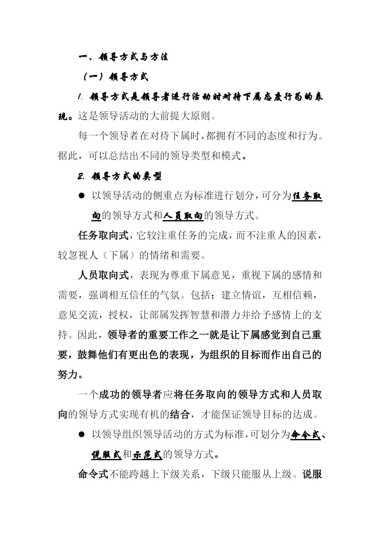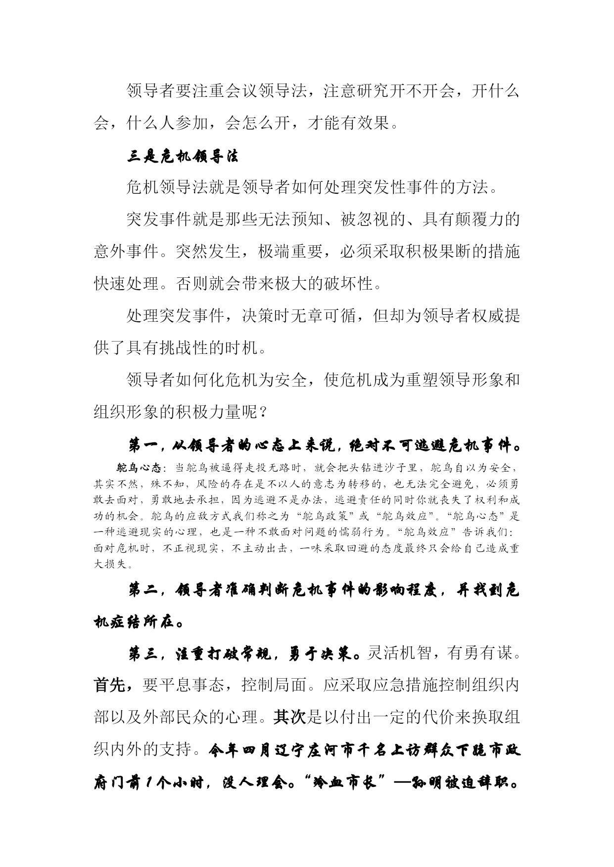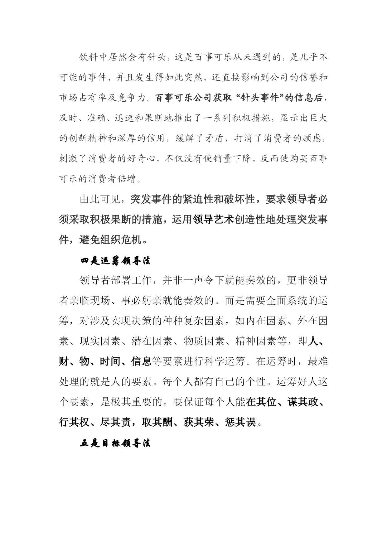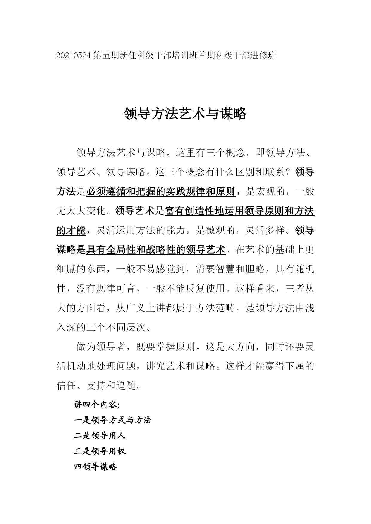 领导方法艺术与谋略(完整版)(文档可以直接使用,也可根据实际需要修改使用,可编辑欢迎下载)20210524第五期新任科级干部培训班首期科级干部进修班领导方法艺术与谋略领导方法艺术与谋略,这里有三个概念,即领导方法、领导艺术、领导谋略。这三个概念有什么区别和联系?领导方法是必须遵循和把握的实践规律和原则,是宏观的,一般无太大变化。领导艺术是富有创造性地运用领导原则和方法的才能,灵活运用方法的能力,是微观的,灵活多样。领导谋略是具有全局性和战略性的领导艺术,在艺术的基础上更细腻的东西,一般不易感觉到,需要智慧和胆略,具有随机性,没有规律可言,一般不能反复使用。这样看来,三者从大的方面看,从广义上讲都属于方法范畴。是领导方法由浅入深的三个不同层次。做为领导者,既要掌握原则,这是大方向,同时还要灵活机动地处理问题,讲究艺术和谋略。这样才能赢得下属的信任、支持和追随。讲四个内容:一是领导方式与方法二是领导用人三是领导用权四领导谋略一、领导方式与方法(一)领导方式1.领导方式是领导者进行活动时对待下属态度行为的表现。这是领导活动的大前提大原则。每一个领导者在对待下属时,都拥有不同的态度和行为。据此,可以总结出不同的领导类型和模式。2.领导方式的类型以领导活动的侧重点为标准进行划分,可分为任务取向的领导方式和人员取向的领导方式。任务取向式,它较注重任务的完成,而不注重人的因素,较忽视人(下属)的情绪和需要。人员取向式,表现为尊重下属意见,重视下属的感情和需要,强调相互信任的气氛。包括:建立情谊,互相信赖,意见交流,授权,让部属发挥智慧和潜力并给予感情上的支持。因此,领导者的重要工作之一就是让下属感觉到自己重要,鼓舞他们有更出色的表现,为组织的目标而作出自己的努力。一个成功的领导者应将任务取向的领导方式和人员取向的领导方式实现有机的结合,才能保证领导目标的达成。以领导组织领导活动的方式为标准,可划分为命令式、说服式和示范式的领导方式。命令式不能跨越上下级关系,下级只能服从上级。说服式是一种建立在领导者影响力之上的领导方式。示范式注重领导者的榜样作用。是一种较为保守的领导方式,因为它是建立在下属对领导者的主动归依和主动模仿的基础之上。以领导者与被领导者的关系为标准,可划分为自决型(独断型)、放任型与民主型(也称参与型)的领导行为模式。自决型(独断型),领导者以大权独揽的方式对下级进行领导,将决策权高度集中在自己手中,下属完全处于被动地位。他拥有完全的权力,并且承担全部责任。这种领导方式往往容易造成领导者与被领导者之间的情绪冲突。放任型回避权力和责任,让下属来建立自己的目标并解决问题。这种方式要求下属有较高的素养才能显现其效果。否则没有效果。民主型(也称参与型)的领导方式是居于以上两者之间的一种领导行为模式。较为理想的方式。领导活动是离不开社会条件的,社会在发展,领导方式也在不断地变化。国家行政学院北京大学教授刘峰总结未来领导方式有八大发展趋势:简约化、自主化、柔性化、隐性化、平民化、人性化、科学化、艺术化。简约化——领导不是越复杂越好,而越简单越好。少管事,管大事。自主化——自我管理,自己管自己,自己领导自己。领导力存在于每个人身上。柔性化——和过去的刚性领导不同,主要依靠引导和疏导,依靠非权力的影响力来达到领导的目的。用信誉领导人,使用软权力。隐性化——是被领导者“不知有之”的领导,是柔性领导的高级阶段。显性领导是人治、人领导人、人管人。隐性领导是“法治”,靠文化、情境、氛围、团队精神影响人。中国古代思想家老子把领导分为四种境界:第一种是“侮之恨之”,第二种是是“惧之敬之”,第三种是“亲之誉之”,第四种是“不知有之”。“不知有之”的领导,是领导的最高境界。无为而治。平民化——领导者平民化。民主气氛浓,为群众所接受和认同。现在领导力是分散的,不仅仅掌握在领导者手中,也分散在被领导者手中。领导者平民化,被领导者身上也就有了领导力。中国这种趋势已经出现,温总理被称为平民总理。人性化——以人为本。追求人文关怀。科学化——领导活动是有规律可循的。是共性的东西。要掌握规律,适应规律。艺术化——是个性的东西。可变化的,因人而异的。这八大趋势被刘峰教授称为“新领导力”。在领导活动中选择什么样的领导方式,要因情况而定,总而言之要达到一个最高境界和最佳效果。(二)领导方法领导方法,是领导者为达到一定领导目标,按照领导活动的规律采取的领导手段。有一定的规律性,相对稳定。1.领导方法的种类一是软硬领导法就是领导者用软、硬两种手段来处理问题。就是胡萝卜加大棒的领导方法。既靠人格魅力来来感染影响下属,又在硬性的规定中展示自身不可侵犯的权威。关键是什么事情应该采用“胡萝卜式”的领