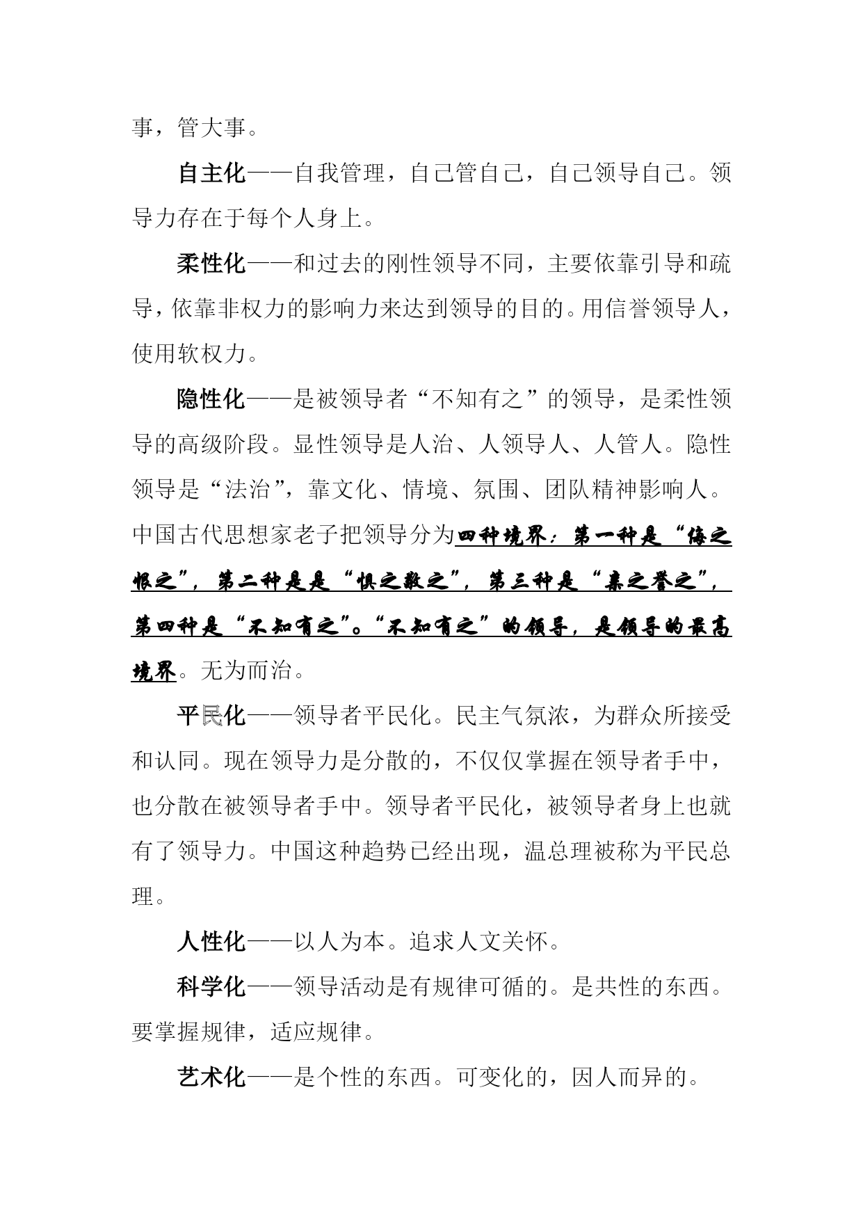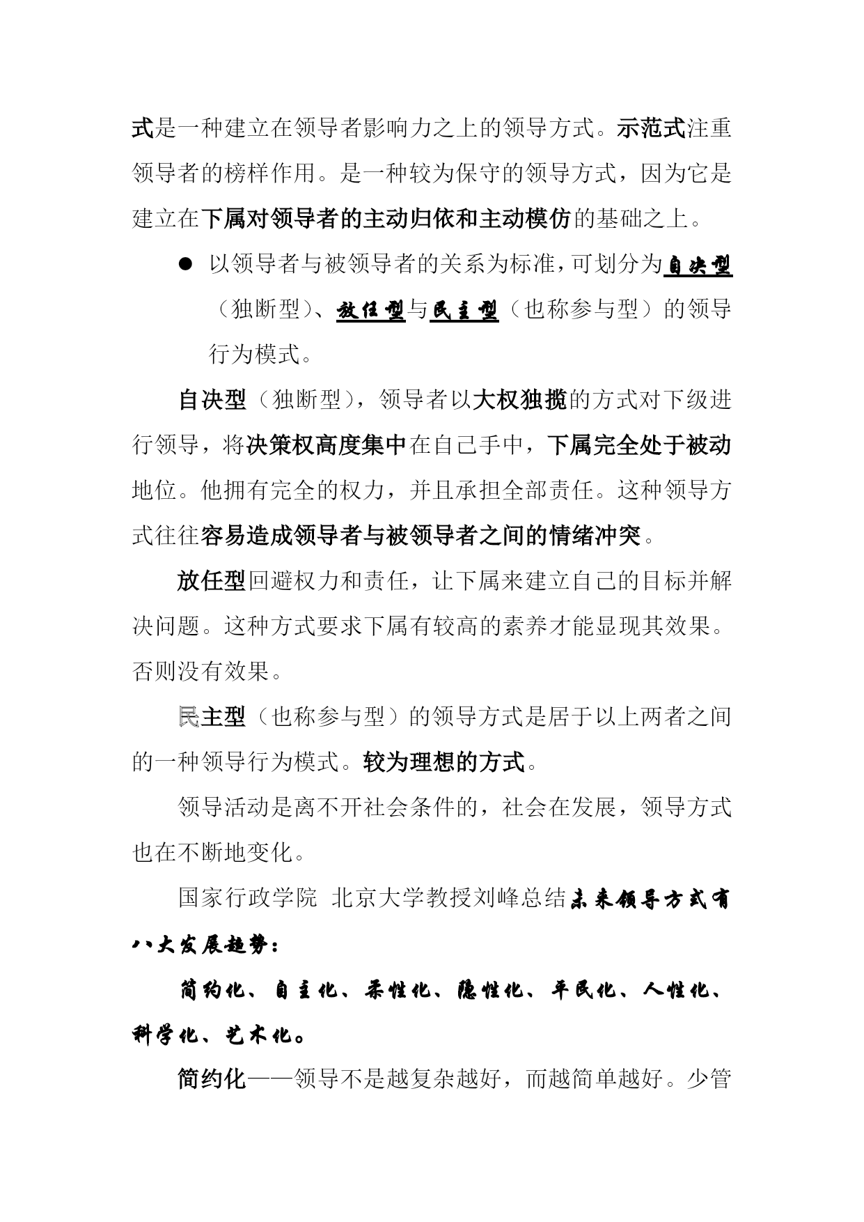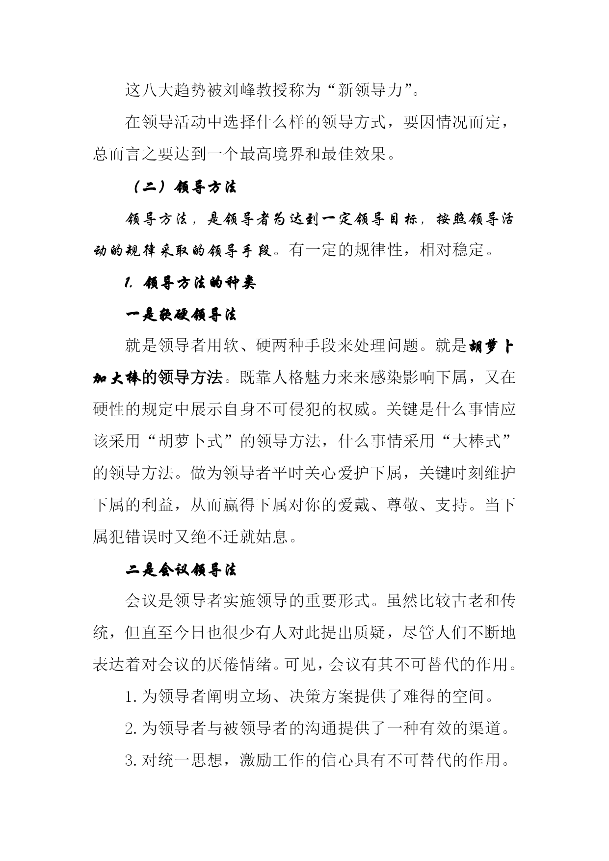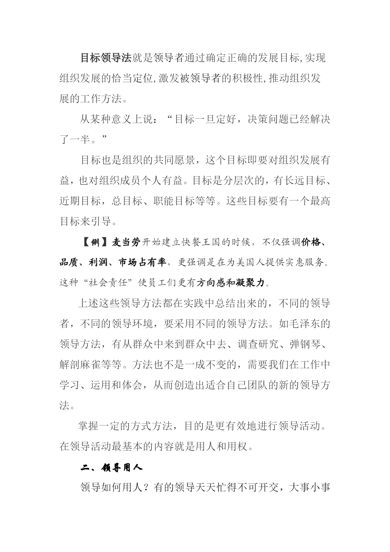 领导方法艺术与谋略(完整版)(文档可以直接使用,也可根据实际需要修改使用,可编辑欢迎下载)20210524第五期新任科级干部培训班首期科级干部进修班领导方法艺术与谋略领导方法艺术与谋略,这里有三个概念,即领导方法、领导艺术、领导谋略。这三个概念有什么区别和联系?领导方法是必须遵循和把握的实践规律和原则,是宏观的,一般无太大变化。领导艺术是富有创造性地运用领导原则和方法的才能,灵活运用方法的能力,是微观的,灵活多样。领导谋略是具有全局性和战略性的领导艺术,在艺术的基础上更细腻的东西,一般不易感觉到,需要智慧和胆略,具有随机性,没有规律可言,一般不能反复使用。这样看来,三者从大的方面看,从广义上讲都属于方法范畴。是领导方法由浅入深的三个不同层次。做为领导者,既要掌握原则,这是大方向,同时还要灵活机动地处理问题,讲究艺术和谋略。这样才能赢得下属的信任、支持和追随。讲四个内容:一是领导方式与方法二是领导用人三是领导用权四领导谋略一、领导方式与方法(一)领导方式1.领导方式是领导者进行活动时对待下属态度行为的表现。这是领导活动的大前提大原则。每一个领导者在对待下属时,都拥有不同的态度和行为。据此,可以总结出不同的领导类型和模式。2.领导方式的类型以领导活动的侧重点为标准进行划分,可分为任务取向的领导方式和人员取向的领导方式。任务取向式,它较注重任务的完成,而不注重人的因素,较忽视人(下属)的情绪和需要。人员取向式,表现为尊重下属意见,重视下属的感情和需要,强调相互信任的气氛。包括:建立情谊,互相信赖,意见交流,授权,让部属发挥智慧和潜力并给予感情上的支持。因此,领导者的重要工作之一就是让下属感觉到自己重要,鼓舞他们有更出色的表现,为组织的目标而作出自己的努力。一个成功的领导者应将任务取向的领导方式和人员取向的领导方式实现有机的结合,才能保证领导目标的达成。以领导组织领导活动的方式为标准,可划分为命令式、说服式和示范式的领导方式。命令式不能跨越上下级关系,下级只能服从上级。说服式是一种建立在领导者影响力之上的领导方式。示范式注重领导者的榜样作用。是一种较为保守的领导方式,因为它是建立在下属对领导者的主动归依和主动模仿的基础之上。以领导者与被领导者的关系为标准,可划分为自决型(独断型)、放任型与民主型(也称参与型)的领导行为模式。自决型(独断型),领导者以大权独揽的方式对下级进行领导,将决策权高度集中在自己手中,下属完全处于被动地位。他拥有完全的权力,并且承担全部责任。这种领导方式往往容易造成领导者与被领导者之间的情绪冲突。放任型回避权力和责任,让下属来建立自己的目标并解决问题。这种方式要求下属有较高的素养才能显现其效果。否则没有效果。民主型(也称参与型)的领导方式是居于以上两者之间的一种领导行为模式。较为理想的方式。领导活动是离不开社会条件的,社会在发展,领导方式也在不断地变化。国家行政学院北京大学教授刘峰总结未来领导方式有八大发展趋势:简约化、自主化、柔性化、隐性化、平民化、人性化、科学化、艺术化。简约化——领导不是越复杂越好,而越简单越好。少管事,管大事。自主化——自我管理,自己管自己,自己领导自己。领导力存在于每个人身上。柔性化——和过去的刚性领导不同,主要依靠引导和疏导,依靠非权力的影响力来达到领导的目的。用信誉领导人,使用软权力。隐性化——是被领导者“不知有之”的领导,是柔性领导的高级阶段。显性领导是人治、人领导人、人管人。隐性领导是“法治”,靠文化、情境、氛围、团队精神影响人。中国古代思想家老子把领导分为四种境界:第一种是“侮之恨之”,第二种是是“惧之敬之”,第三种是“亲之誉之”,第四种是“不知有之”。“不知有之”的领导,是领导的最高境界。无为而治。平民化——领导者平民化。民主气氛浓,为群众所接受和认同。现在领导力是分散的,不仅仅掌握在领导者手中,也分散在被领导者手中。领导者平民化,被领导者身上也就有了领导力。中国这种趋势已经出现,温总理被称为平民总理。人性化——以人为本。追求人文关怀。科学化——领导活动是有规律可循的。是共性的东西。要掌握规律,适应规律。艺术化——是个性的东西。可变化的,因人而异的。这八大趋势被刘峰教授称为“新领导力”。在领导活动中选择什么样的领导方式,要因情况而定,总而言之要达到一个最高境界和最佳效果。(二)领导方法领导方法,是领导者为达到一定领导目标,按照领导活动的规律采取的领导手段。有一定的规律性,相对稳定。1.领导方法的种类一是软硬领导法就是领导者用软、硬两种手段来处理问题。就是胡萝卜加大棒的领导方法。既靠人格魅力来来感染影响下属,又在硬性的规定中展示自身不可侵犯的权威。关键是什么事情应该采用“胡萝卜式”的领