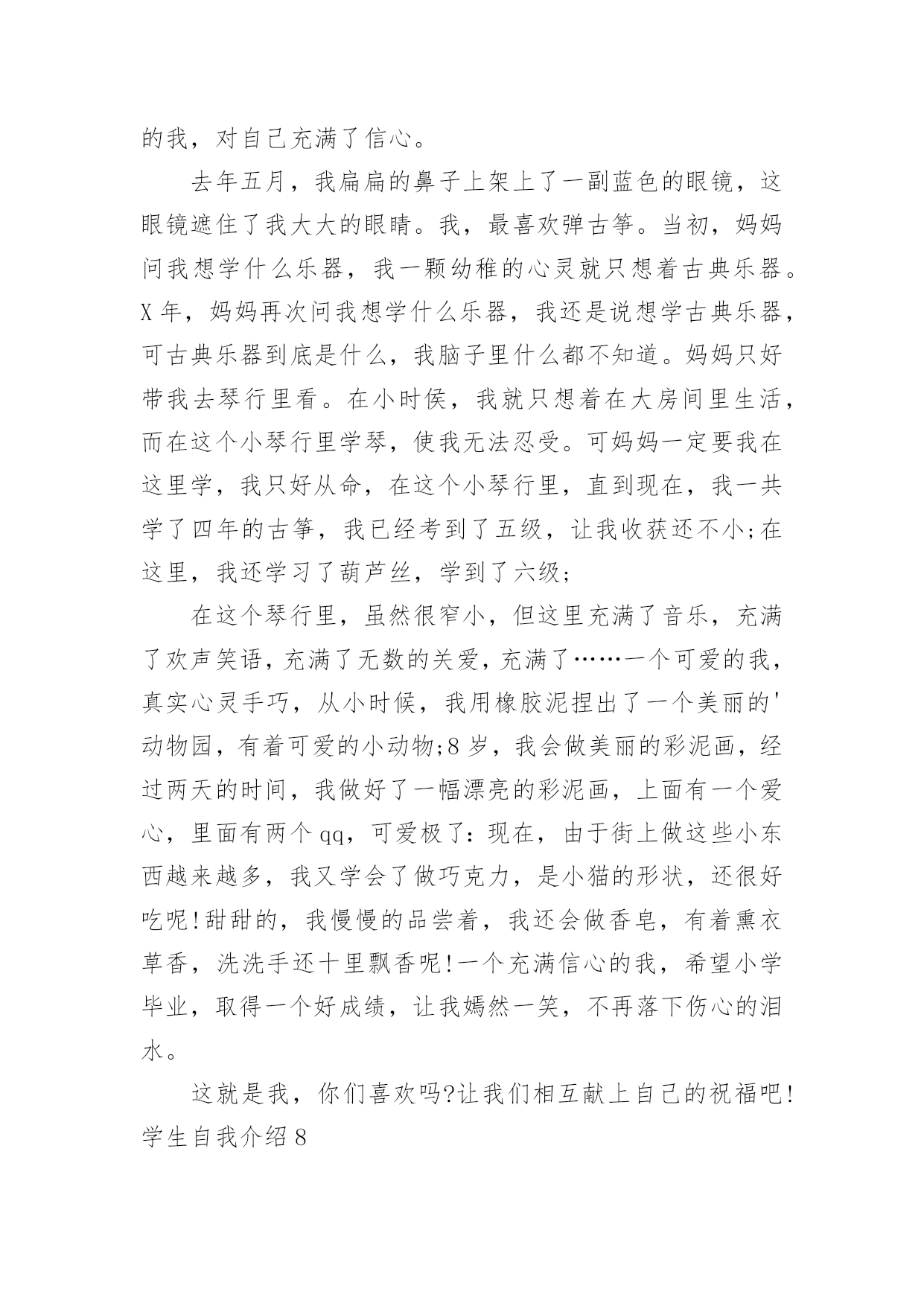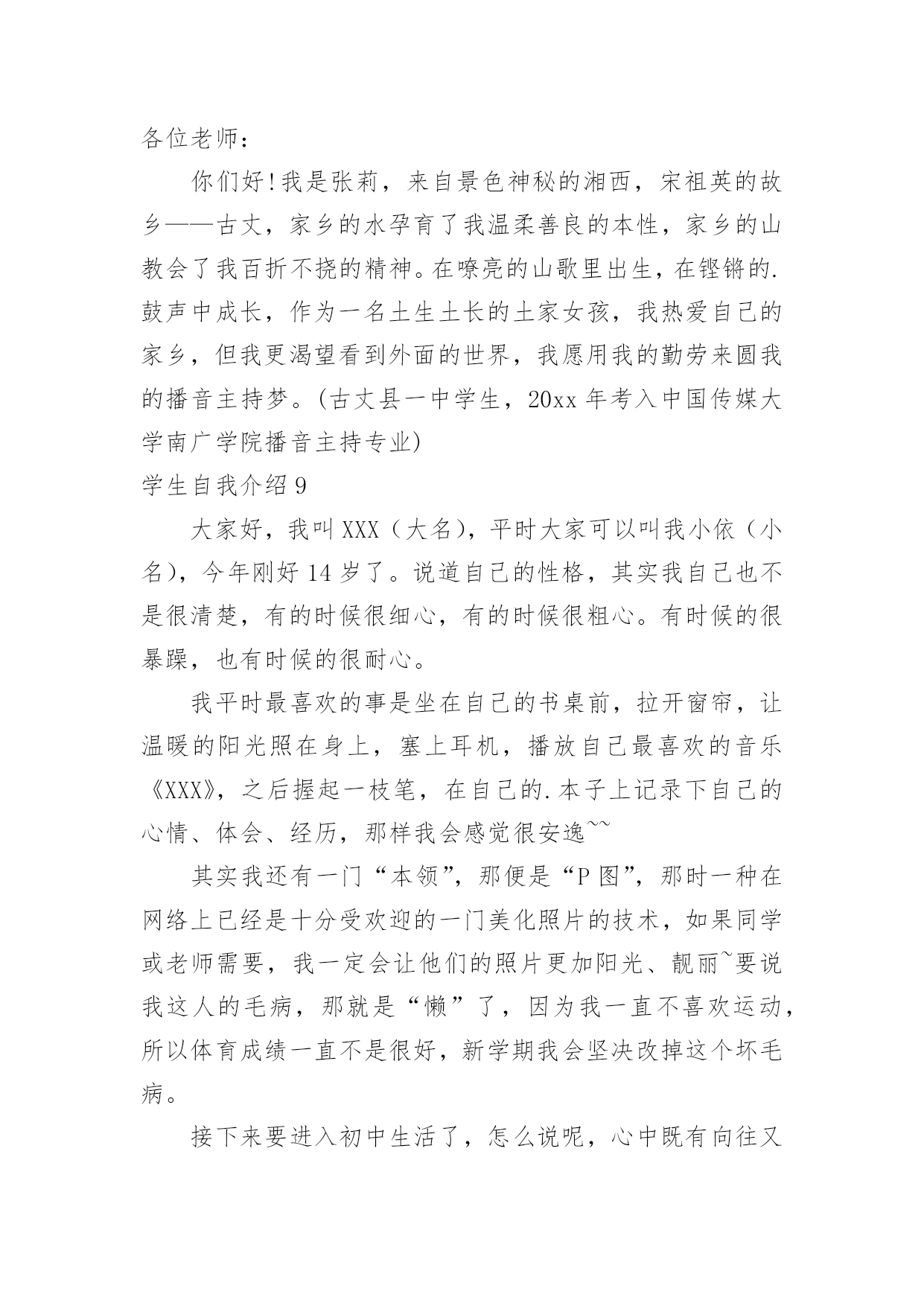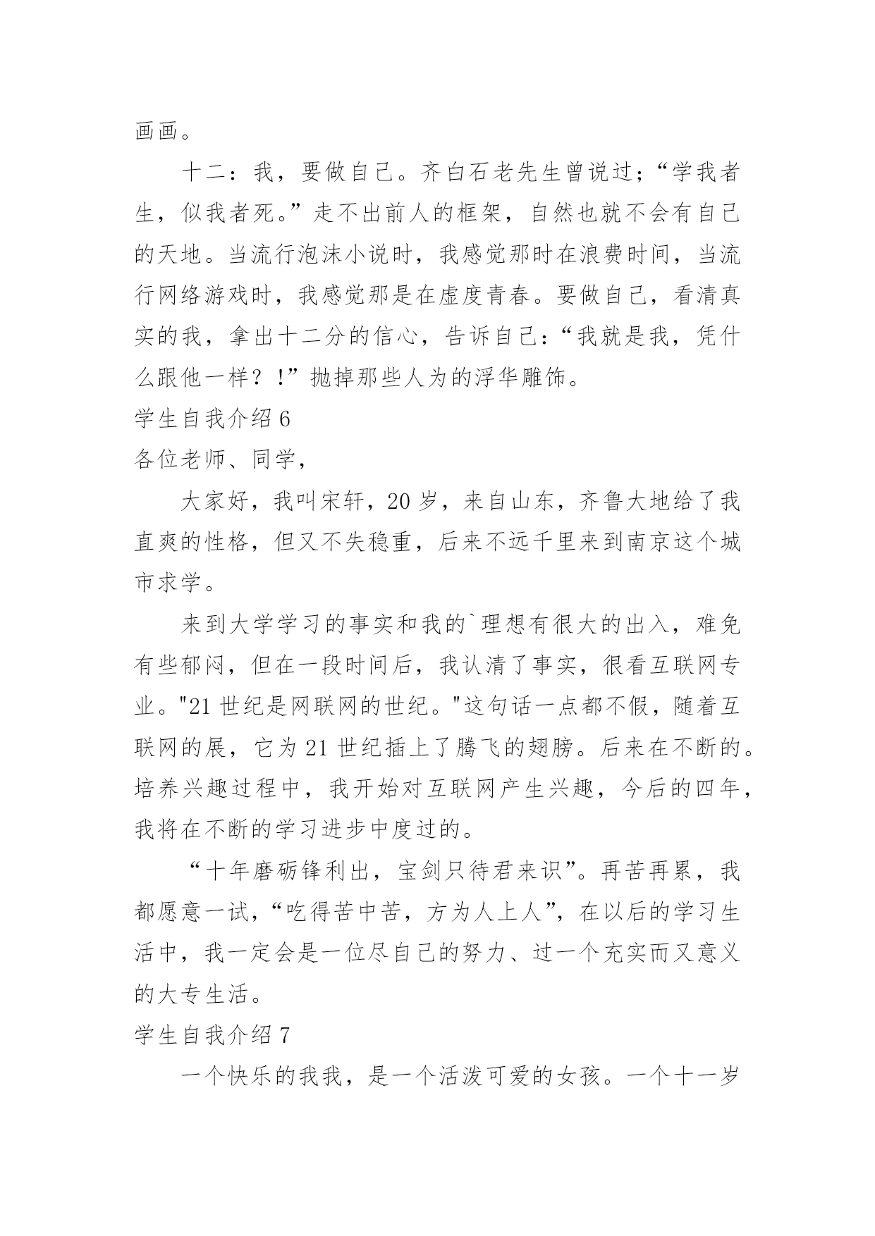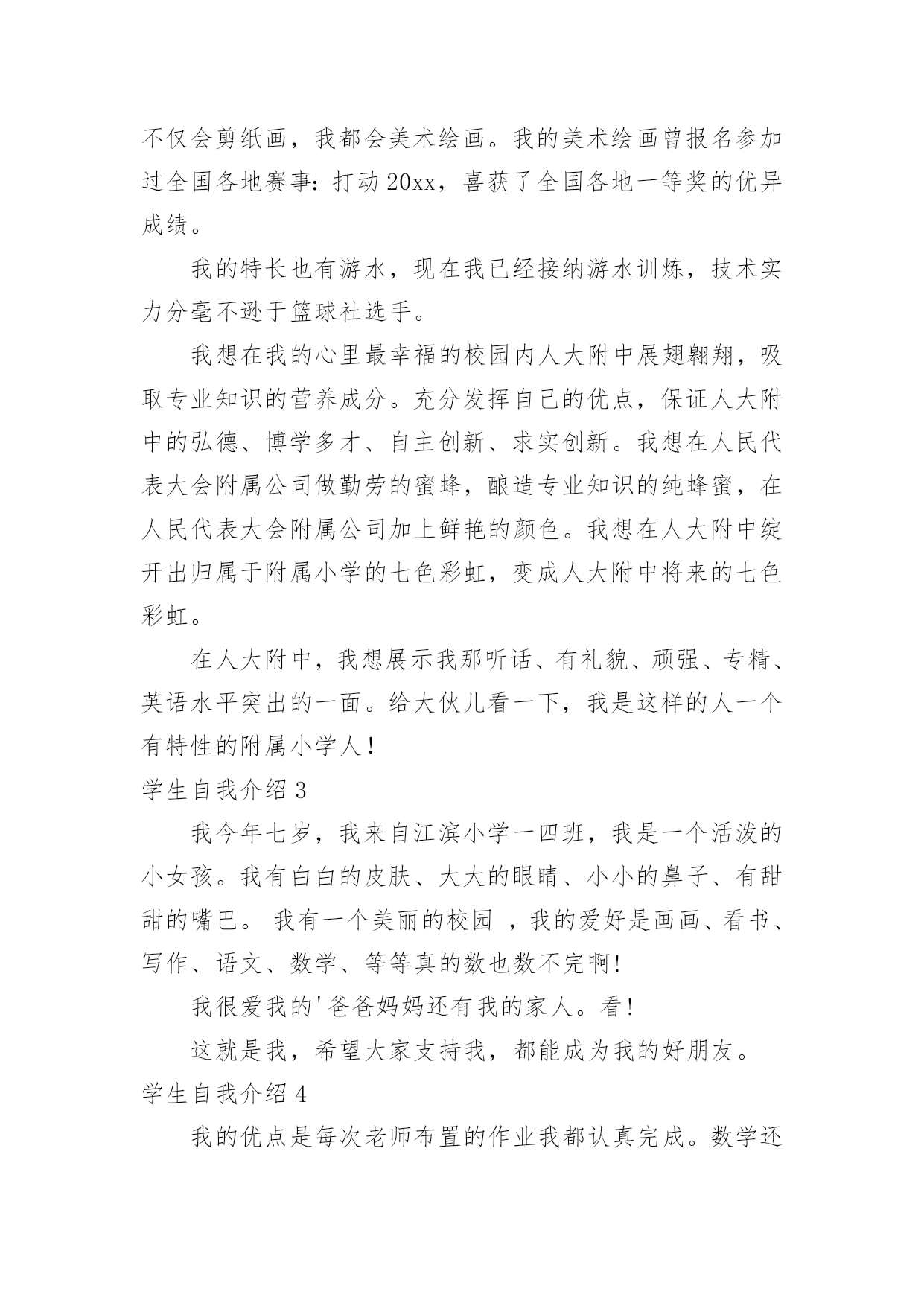 学生自我介绍学生自我介绍精品【15篇】当来到一个新环境时,我们有必要进行适当的自我介绍,通过自我介绍可以得到他人的认识。那么什么样的自我介绍才合适呢?下面是小编精心整理的学生自我介绍,希望能够帮助到大家。学生自我介绍1大家好,秋天到了,我也来了。我叫xx,今年x岁啦!非常高兴能成为xx的学生,心情激动地站在这里跟大家做个自我介绍。我好动并且很喜欢玩,我也喜欢看书,特别是有新书的时候,更是急不可待地要一睹为快!有时候因为看书影响了其他事情,总是被爸爸数落,甚至说我看书没有条理,走马观花!其实书里有些东西我看不太懂不理解,但我知道看书是一个好习惯,我会坚持下去,随着日积月累,我能变得会看书!我很愿意交朋友,因为我十分开朗,交到我这个朋友,我们会过得很愉快,赶快行动吧!谢谢!学生自我介绍2老师好!您知道吗?我是六年级十班的王安琪!我是一个听话有礼,顽强,英文层面突显,特长普遍的优秀生。我是一个听话有礼的好宝宝。我曾一度被获评考核评价全优生优育,当过大队委,而且竟选上文明行为小模范。我是一个内心强大的人,我自小在国外长大了。直至六岁归国,我那时候一点都不明白中文,立即上一年级。由于不容易中文,学习培训很费劲,也有人说我是傻子。我遭受着他人的取笑,他人一件事的指手画脚。认真学习,赶了上去。顽强促使现在我能和大家畅顺地沟通交流,变成了班级非常好的学员。我是一名在英语层面尤其突显的学员.我的英语考试成绩从一年级至如今一遥遥领先。我续任英语课代表4年(一,二年级沒有英语课代表),尽职尽责,一丝不苟,为班集体作出了极大的奉献。我都曾在北京英文风彩比赛上得奖,并数次意味着院校为来院参观考察的国外人员开展专业能力的详细介绍,还报名参加了国外院校与我院的笔友的主题活动,不仅让到访的外国人了解了我们的校园,还留下幸福的印像。学习培训帮我产生了无穷无尽快乐,我的特长一样也是。是我许多特长:美术绘画,游水,大提琴这些。我的水粉画早已被院校选号牌,报名参加院校60年校友聚会。我报名参加了院校的剪纸画社团活动,学习培训掌握在我国的非遗文化财产,我的一些剪纸作品早已遭受了中国美术馆权威专家的认同,可能校园内60年校友聚会时展览。大家也接受过央视春晚的采访,以北京之春为主题风格进行剪纸绘画的`现场采访和观看,对央视春晚的素材画面进行决策。我不仅会剪纸画,我都会美术绘画。我的美术绘画曾报名参加过全国各地赛事:打动20xx,喜获了全国各地一等奖的优异成绩。我的特长也有游水,现在我已经接纳游水训炼,技术实力分毫不逊于篮球社选手。我想在我的心里最幸福的校园内人大附中展翅翱翔,吸取专业知识的营养成分。充分发挥自己的优点,保证人大附中的弘德、博学多才、自主创新、求实创新。我想在人民代表大会附属公司做勤劳的蜜蜂,酿造专业知识的纯蜂蜜,在人民代表大会附属公司加上鲜艳的颜色。我想在人大附中绽开出归属于附属小学的七色彩虹,变成人大附中将来的七色彩虹。在人大附中,我想展示我那听话、有礼貌、顽强、专精、英语水平突出的一面。给大伙儿看一下,我是这样的人一个有特性的附属小学人!学生自我介绍3我今年七岁,我来自江滨小学一四班,我是一个活泼的小女孩。我有白白的皮肤、大大的眼睛、小小的鼻子、有甜甜的嘴巴。我有一个美丽的校园,我的爱好是画画、看书、写作、语文、数学、等等真的数也数不完啊!我很爱我的'爸爸妈妈还有我的家人。看!这就是我,希望大家支持我,都能成为我的好朋友。学生自我介绍4我的优点是每次老师布置的作业我都认真完成。数学还用草稿纸再重新验算一遍呢。因此,我的成绩还行。我的缺点是上课不敢大胆发言,考试时不仔细。就拿语文第二单元考试来说吧,我有些会写的词都写错了,作文字数少了呢。所以那次考得实在不理想。我已经在努力改掉这些缺点了,争取做个更好的学生。我特别喜欢和别人打赌。输了,嘟着嘴巴就走。要是赢了,笑得眼睛变成了一条细缝。有一次,我和同学打赌,那位同学说他身上有2000元钱,我想:“谁会有这么多钱呀,分明是吹牛的!绝对不可能!假的吧!”就让他把钱掏出来看看。果然不出我所料,他不好意思的对我说:“我今天没带来,明天带来。”我笑着说:“骗人也要打草稿的,你今天没带就骗我带了,明天一样骗我那怎么办?”那同学小声的对我说:“你给我留点面子,不要说怎么大声!我是骗你!这下行了吧!”这时,我笑着高呼:“噢耶!我赢了!我说你不可能吧!还骗人!”“小声点!”他对我说。小时候,妈妈常埋怨我:“你这个调皮鬼呀!”长大了,我常自嘲:“我这个人呀,就这样了。那又怎么样?”什么样?用同学们的话来归纳:“你这个人呀,真是个奇怪的人!”有时候,我希望自己能快点长大,做一番惊天动地的大事,让周围的人全都惊诧不已。可有时候,又希望自己永远也别长大,做父母身边的.小公主。有一次老师带我们看红军打仗,当看到影片中红军被打死在卢