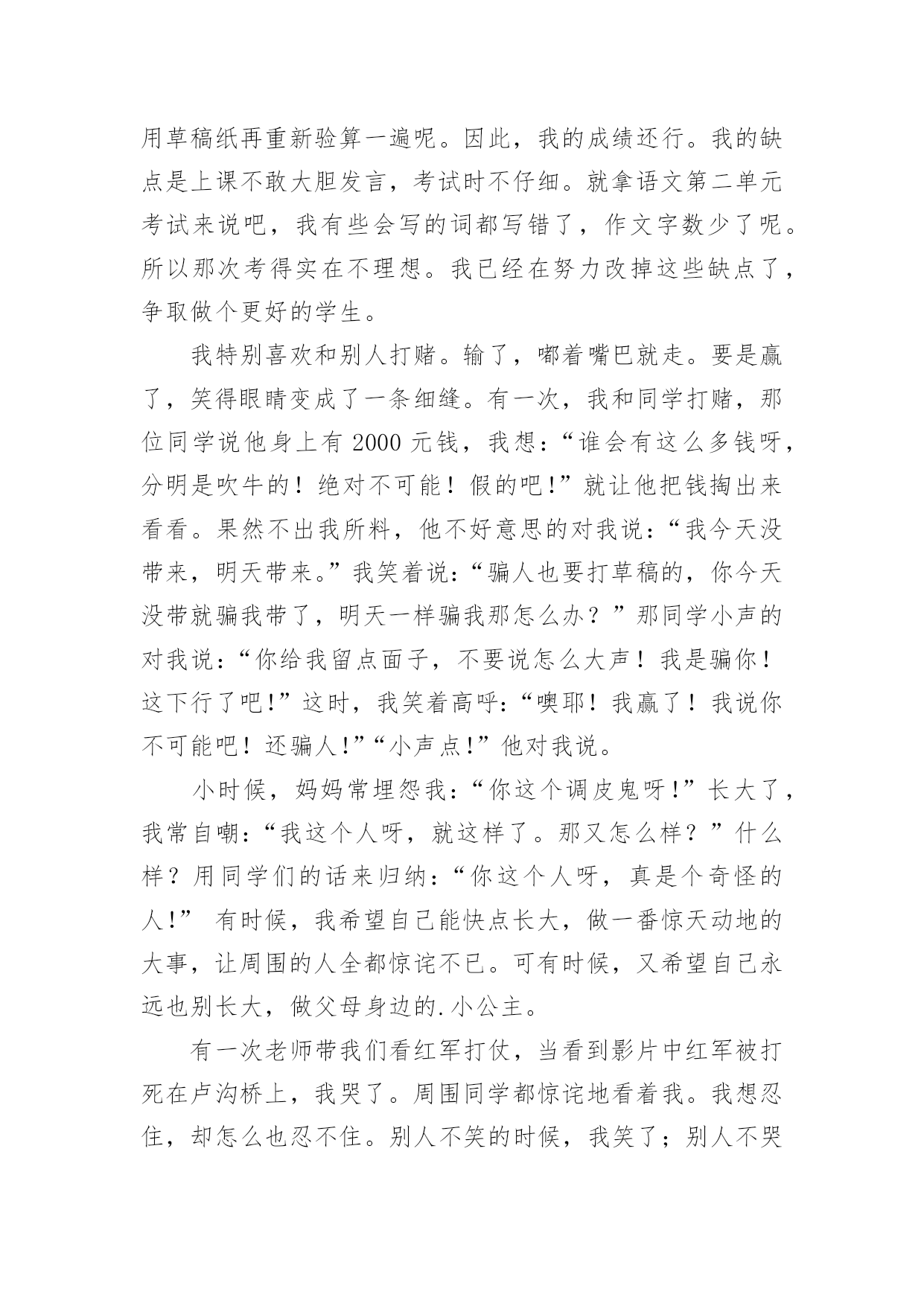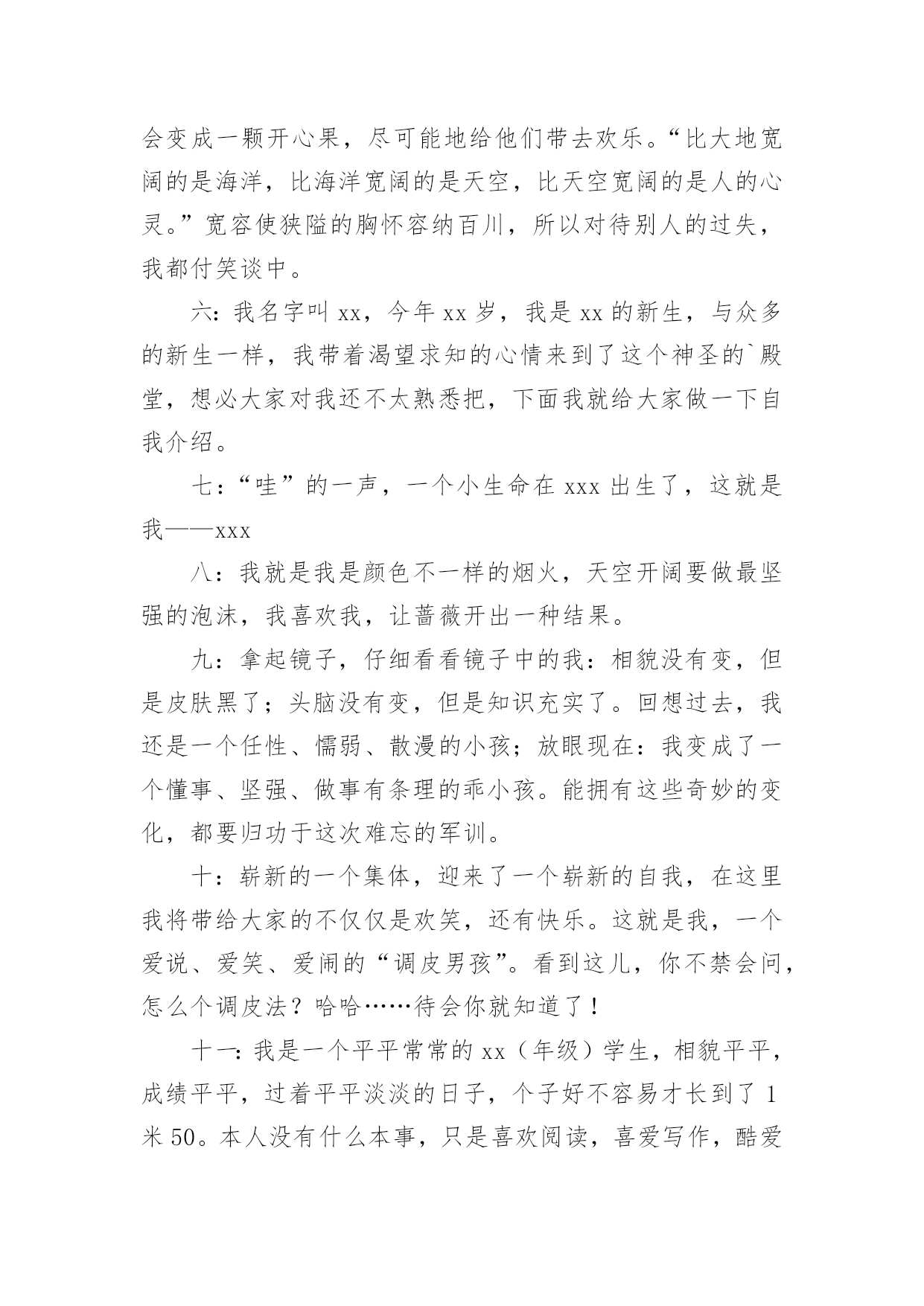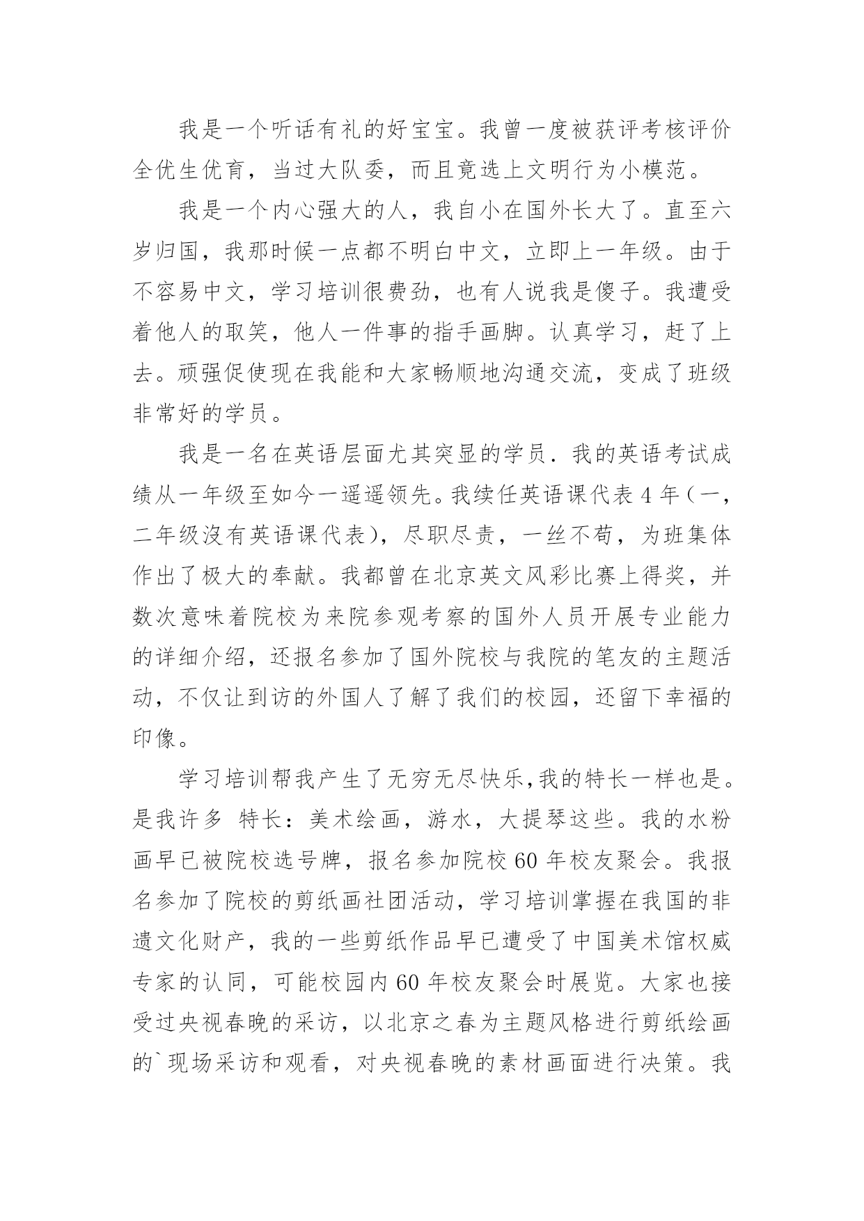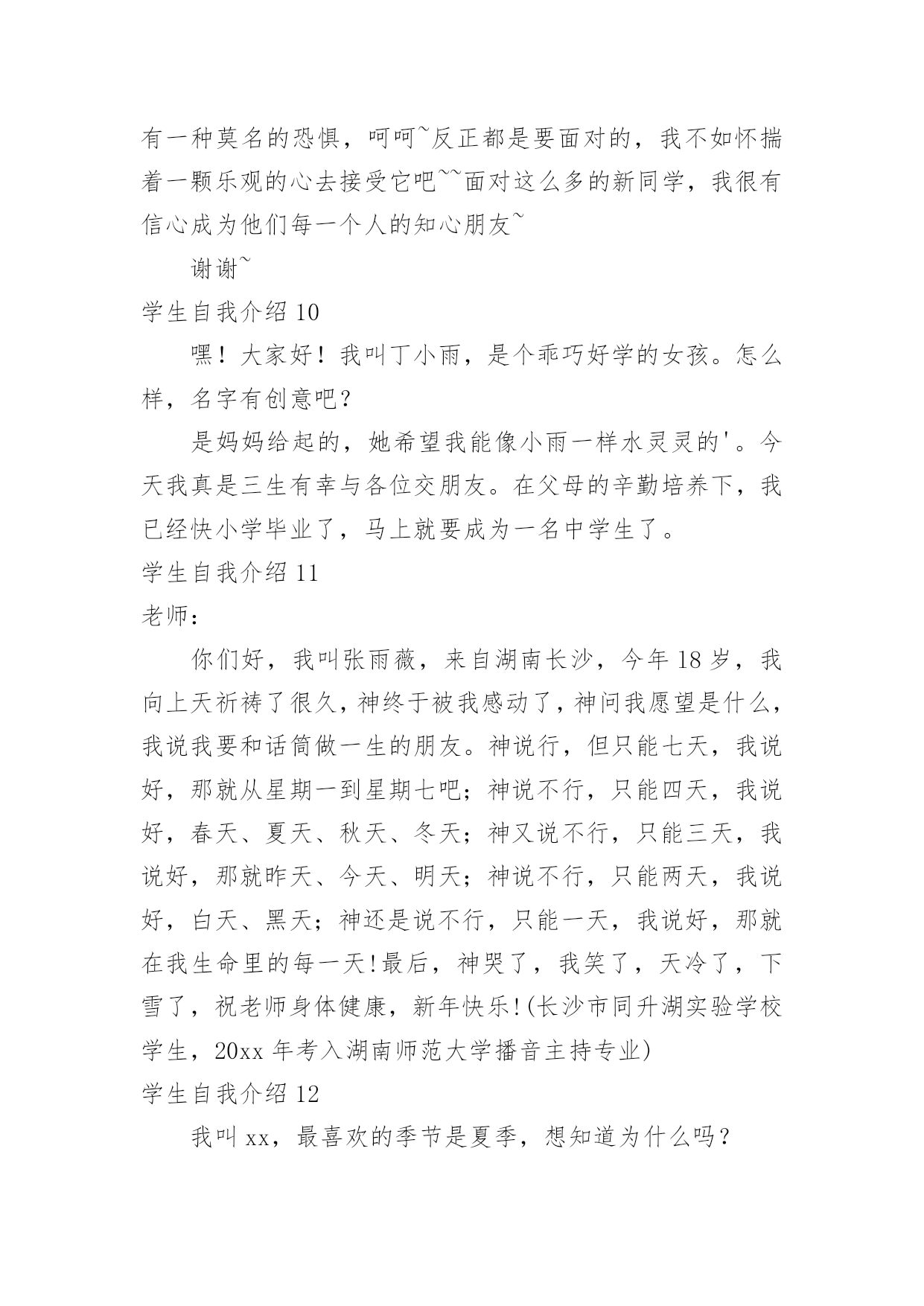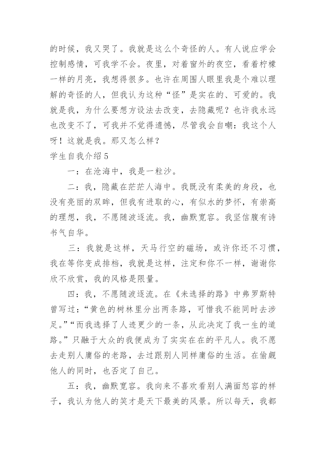 学生自我介绍学生自我介绍精品【15篇】当来到一个新环境时,我们有必要进行适当的自我介绍,通过自我介绍可以得到他人的认识。那么什么样的自我介绍才合适呢?下面是小编精心整理的学生自我介绍,希望能够帮助到大家。学生自我介绍1大家好,秋天到了,我也来了。我叫xx,今年x岁啦!非常高兴能成为xx的学生,心情激动地站在这里跟大家做个自我介绍。我好动并且很喜欢玩,我也喜欢看书,特别是有新书的时候,更是急不可待地要一睹为快!有时候因为看书影响了其他事情,总是被爸爸数落,甚至说我看书没有条理,走马观花!其实书里有些东西我看不太懂不理解,但我知道看书是一个好习惯,我会坚持下去,随着日积月累,我能变得会看书!我很愿意交朋友,因为我十分开朗,交到我这个朋友,我们会过得很愉快,赶快行动吧!谢谢!学生自我介绍2老师好!您知道吗?我是六年级十班的王安琪!我是一个听话有礼,顽强,英文层面突显,特长普遍的优秀生。我是一个听话有礼的好宝宝。我曾一度被获评考核评价全优生优育,当过大队委,而且竟选上文明行为小模范。我是一个内心强大的人,我自小在国外长大了。直至六岁归国,我那时候一点都不明白中文,立即上一年级。由于不容易中文,学习培训很费劲,也有人说我是傻子。我遭受着他人的取笑,他人一件事的指手画脚。认真学习,赶了上去。顽强促使现在我能和大家畅顺地沟通交流,变成了班级非常好的学员。我是一名在英语层面尤其突显的学员.我的英语考试成绩从一年级至如今一遥遥领先。我续任英语课代表4年(一,二年级沒有英语课代表),尽职尽责,一丝不苟,为班集体作出了极大的奉献。我都曾在北京英文风彩比赛上得奖,并数次意味着院校为来院参观考察的国外人员开展专业能力的详细介绍,还报名参加了国外院校与我院的笔友的主题活动,不仅让到访的外国人了解了我们的校园,还留下幸福的印像。学习培训帮我产生了无穷无尽快乐,我的特长一样也是。是我许多特长:美术绘画,游水,大提琴这些。我的水粉画早已被院校选号牌,报名参加院校60年校友聚会。我报名参加了院校的剪纸画社团活动,学习培训掌握在我国的非遗文化财产,我的一些剪纸作品早已遭受了中国美术馆权威专家的认同,可能校园内60年校友聚会时展览。大家也接受过央视春晚的采访,以北京之春为主题风格进行剪纸绘画的`现场采访和观看,对央视春晚的素材画面进行决策。我不仅会剪纸画,我都会美术绘画。我的美术绘画曾报名参加过全国各地赛事:打动20xx,喜获了全国各地一等奖的优异成绩。我的特长也有游水,现在我已经接纳游水训炼,技术实力分毫不逊于篮球社选手。我想在我的心里最幸福的校园内人大附中展翅翱翔,吸取专业知识的营养成分。充分发挥自己的优点,保证人大附中的弘德、博学多才、自主创新、求实创新。我想在人民代表大会附属公司做勤劳的蜜蜂,酿造专业知识的纯蜂蜜,在人民代表大会附属公司加上鲜艳的颜色。我想在人大附中绽开出归属于附属小学的七色彩虹,变成人大附中将来的七色彩虹。在人大附中,我想展示我那听话、有礼貌、顽强、专精、英语水平突出的一面。给大伙儿看一下,我是这样的人一个有特性的附属小学人!学生自我介绍3我今年七岁,我来自江滨小学一四班,我是一个活泼的小女孩。我有白白的皮肤、大大的眼睛、小小的鼻子、有甜甜的嘴巴。我有一个美丽的校园,我的爱好是画画、看书、写作、语文、数学、等等真的数也数不完啊!我很爱我的'爸爸妈妈还有我的家人。看!这就是我,希望大家支持我,都能成为我的好朋友。学生自我介绍4我的优点是每次老师布置的作业我都认真完成。数学还用草稿纸再重新验算一遍呢。因此,我的成绩还行。我的缺点是上课不敢大胆发言,考试时不仔细。就拿语文第二单元考试来说吧,我有些会写的词都写错了,作文字数少了呢。所以那次考得实在不理想。我已经在努力改掉这些缺点了,争取做个更好的学生。我特别喜欢和别人打赌。输了,嘟着嘴巴就走。要是赢了,笑得眼睛变成了一条细缝。有一次,我和同学打赌,那位同学说他身上有2000元钱,我想:“谁会有这么多钱呀,分明是吹牛的!绝对不可能!假的吧!”就让他把钱掏出来看看。果然不出我所料,他不好意思的对我说:“我今天没带来,明天带来。”我笑着说:“骗人也要打草稿的,你今天没带就骗我带了,明天一样骗我那怎么办?”那同学小声的对我说:“你给我留点面子,不要说怎么大声!我是骗你!这下行了吧!”这时,我笑着高呼:“噢耶!我赢了!我说你不可能吧!还骗人!”“小声点!”他对我说。小时候,妈妈常埋怨我:“你这个调皮鬼呀!”长大了,我常自嘲:“我这个人呀,就这样了。那又怎么样?”什么样?用同学们的话来归纳:“你这个人呀,真是个奇怪的人!”有时候,我希望自己能快点长大,做一番惊天动地的大事,让周围的人全都惊诧不已。可有时候,又希望自己永远也别长大,做父母身边的.小公主。有一次老师带我们看红军打仗,当看到影片中红军被打死在卢
