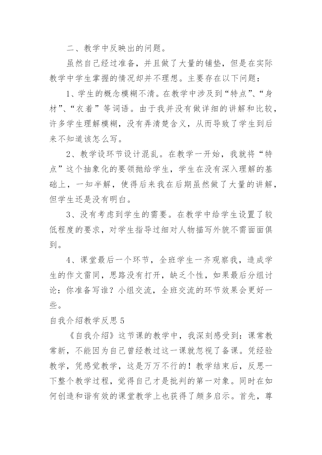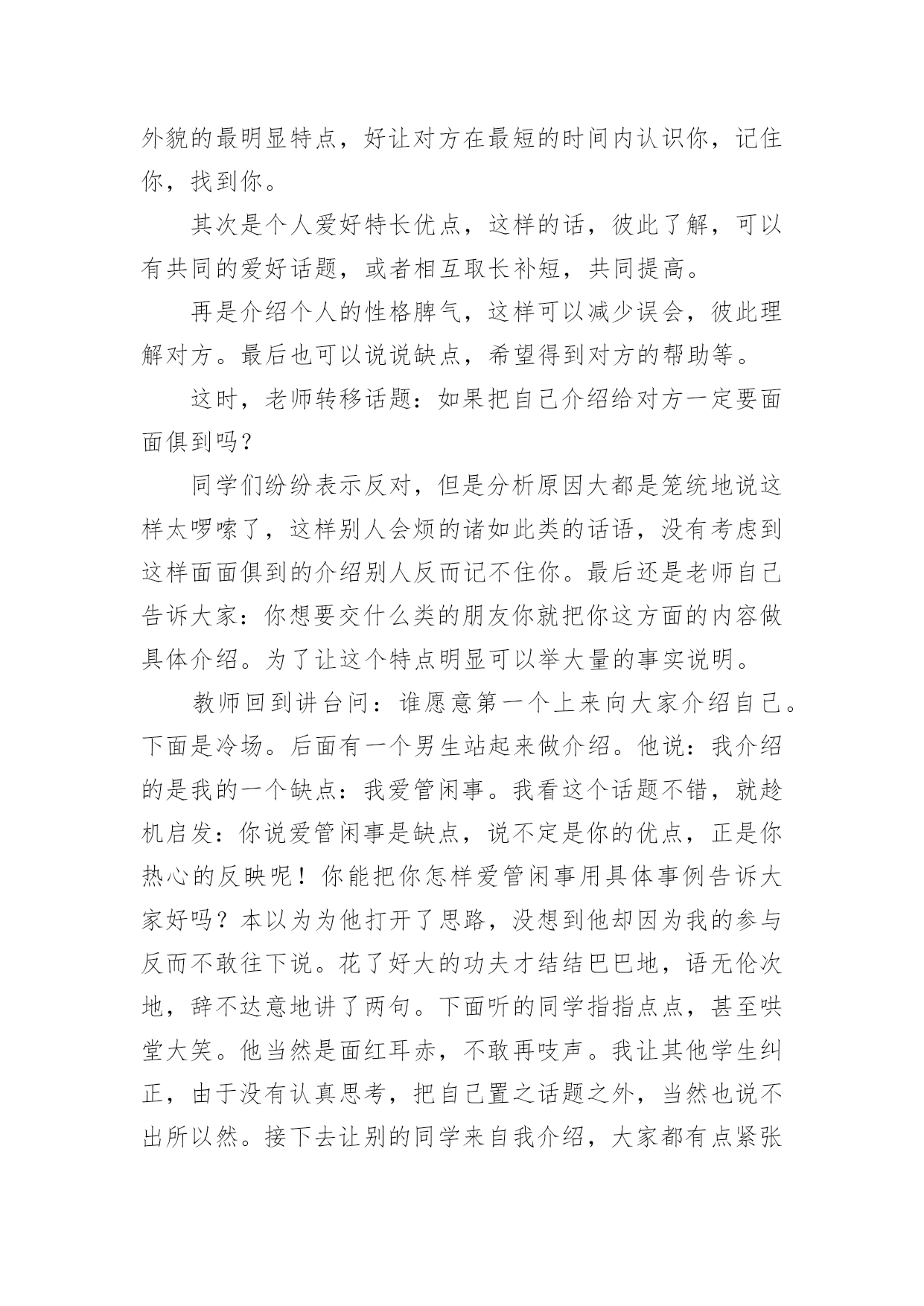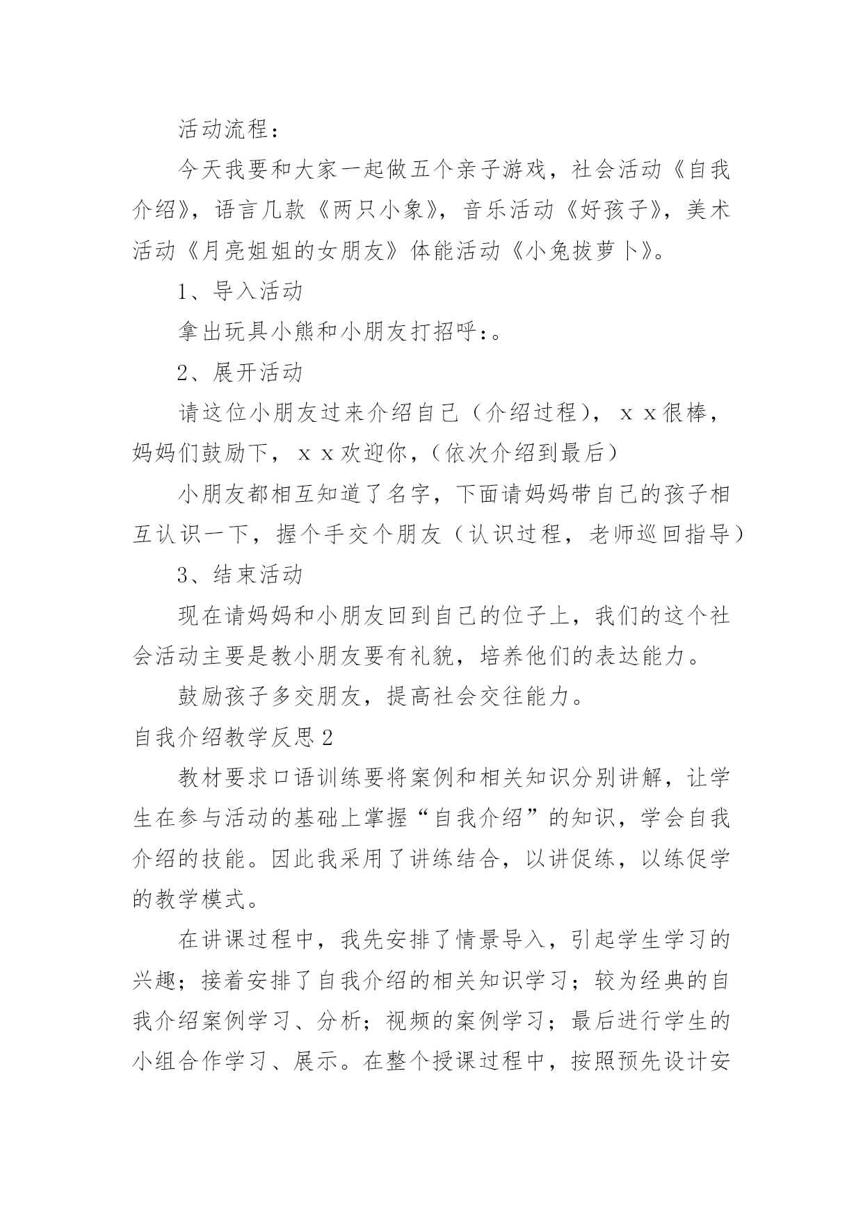 自我介绍教学反思自我介绍教学反思当来到一个陌生环境中,我们难以避免地要作出自我介绍,自我介绍可以给陌生人留下一个好的印象。写自我介绍时总是没有新意?下面是小编收集整理的自我介绍教学反思,欢迎阅读与收藏。自我介绍教学反思1语言发展既非纯粹天赋遗传,也不是后天的机械模仿所得,幼儿是在与人和环境的交互作用中创造性地学习语言的。在生活中让大家认识自己,自我介绍是向别人展示你自己的一个重要手段。幼儿阶段,是孩子发展语言的黄金阶段。提高口头表达能力,让他们灵活而富有创造性的说,是语言教学的工作重点。1、培养幼儿有礼貌的好习惯。2、培养幼儿的自我认识及口头表达能力。3、初步培养幼儿有礼貌的行为。4、让幼儿能在集体面前大胆表演、表现自己。5、培养幼儿与同伴之间的'相互配合。小熊布绒玩具一个集中活动宝宝们把你们的小手伸出来和老师一起来拍拍手。活动流程:今天我要和大家一起做五个亲子游戏,社会活动《自我介绍》,语言几款《两只小象》,音乐活动《好孩子》,美术活动《月亮姐姐的女朋友》体能活动《小兔拔萝卜》。1、导入活动拿出玩具小熊和小朋友打招呼:。2、展开活动请这位小朋友过来介绍自己(介绍过程),ⅹⅹ很棒,妈妈们鼓励下,ⅹⅹ欢迎你,(依次介绍到最后)小朋友都相互知道了名字,下面请妈妈带自己的孩子相互认识一下,握个手交个朋友(认识过程,老师巡回指导)3、结束活动现在请妈妈和小朋友回到自己的位子上,我们的这个社会活动主要是教小朋友要有礼貌,培养他们的表达能力。鼓励孩子多交朋友,提高社会交往能力。自我介绍教学反思2教材要求口语训练要将案例和相关知识分别讲解,让学生在参与活动的基础上掌握“自我介绍”的知识,学会自我介绍的技能。因此我采用了讲练结合,以讲促练,以练促学的教学模式。在讲课过程中,我先安排了情景导入,引起学生学习的兴趣;接着安排了自我介绍的相关知识学习;较为经典的自我介绍案例学习、分析;视频的案例学习;最后进行学生的小组合作学习、展示。在整个授课过程中,按照预先设计安排完成了课程内容,但还有些不足和遗憾之处,希望能够进一步改进:如:在课堂时间安排上,讲授时间所占比例小,讲授知识不够透彻、深入。没有检测学生知识的掌握情况。讲授过程中师生互动少。还应适当补充使用更具特点的'面试中得自我介绍,使知识更具广度和深度。还可以对学生的练习有具体的要求,根据学生的不同程度设计不同层次的练习,安排各个程度的学生练习。在练习中,还可设计多种场景,进行自我介绍的练习,让学生自然轻松地融入练习当中。以上是我在课后的一点思考,叶圣陶先生曾说过:教材无非是例子。那么,利用好例子教给学生学习方法之后,接下来的应该是大量的实践,只有在实践中,学生的能力才能不断巩固、提高。所以,我还会更加努力,有意识地引导学生在生活中学习语文,使孩子们深切地感受到:语文离他们很近很近。更好地提高语文口语表达能力。自我介绍教学反思3在参加了研修班的培训后,学校要求我们上一节课作为学习的汇报。原来我打算上一节语文阅读课,可是听了专家的讲学以及自己的理解我觉得要上一节一年级的语文阅读展示课还真不容易啊!是不是我真的根本没领会到其中的.思想。我想想还是上一节口语交际课吧!我还从未好好的上过这样的课呢!尝试一下吧!我自己备好课后也没跟学生打招呼,就带学生到学校的阶梯教室上课了。开始学生的学习热情还好,可是一会之后我发现孩子的兴趣就集中在我贴在黑板上掉下来的卡片了,或是觉得其他同学上来说的时候真的好好玩,在那里笑别人了。当我提示叫他们说的时候就退缩了,是怕?还是?是我引导不够?我相信这么简单的自我介绍对他们来说其实并不是一件难事啊?他们也都会做这么简单的自我介绍,且还能连起来说得很通顺了。老师们都问我是否第一次上,是的话这样是很不错的了。可我还是觉得孩子们的参与性实在是不高,我还是感到失望!我知道他们并不是不会说,而是不想说不敢说,我想继续尝试这种课,每周上一节,让孩子的语言表达能力有所提高,让孩子真正的想说敢说。一节课下来,让我感触最深的还是觉得孩子们在这样的课堂当中还没有把自己的口动起来,真正的做到想说敢说。如果孩子们连这个说都不敢,那又谈何说清楚,说通顺,说完整呢!自我介绍教学反思4根据学校的安排让学生能把说写结合起来,我特地安排了一节习作课———《自我介绍》一、教学环节的设置我把整个教学过程分为几个部分:1、游戏导入。通过和学生做游戏让学生找出是谁或是干什么的。从而告诉学生这些不同的.地方都是每个人的特点。抓住特点就能介绍清楚,从而引出课题。2、仔细观察,说不同。为了引起学生兴趣,我有意选择我自己让学生通过观察来找出不同。二、教学中反映出的问题。虽然自己经过准备,并且做了大量的铺垫,但是在实际教学中学生掌握的情况却并不理想。主要存在以下问题:1、学生的概念模糊不清。在教学中涉及到“特点”、“身材”
