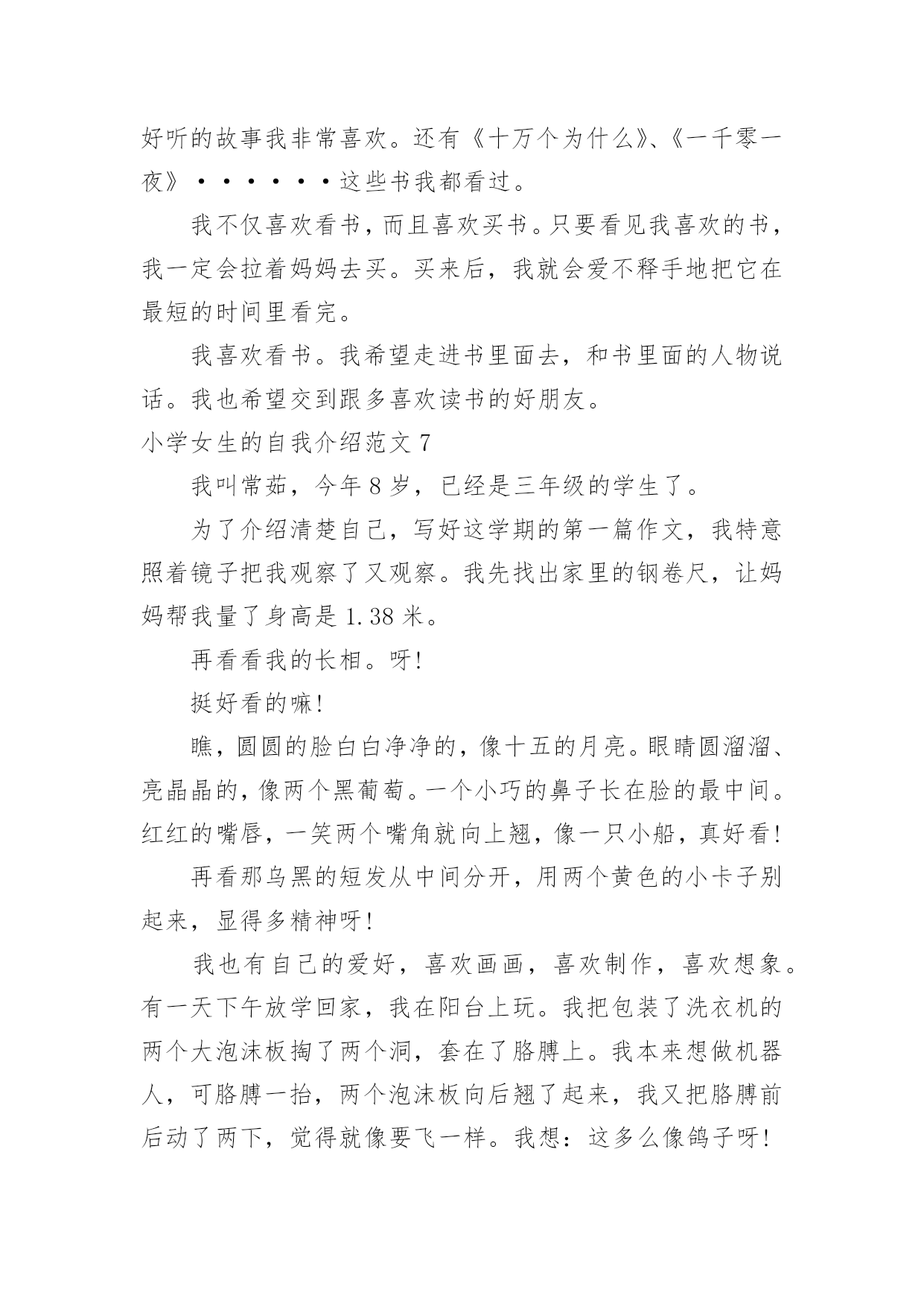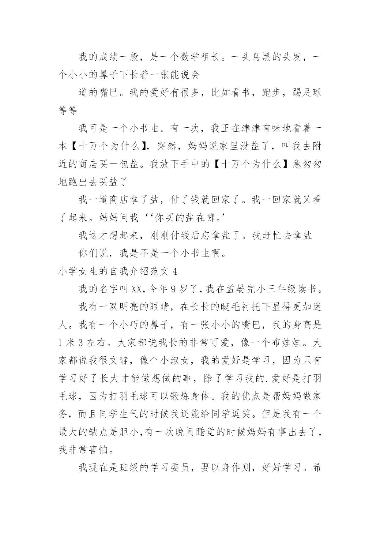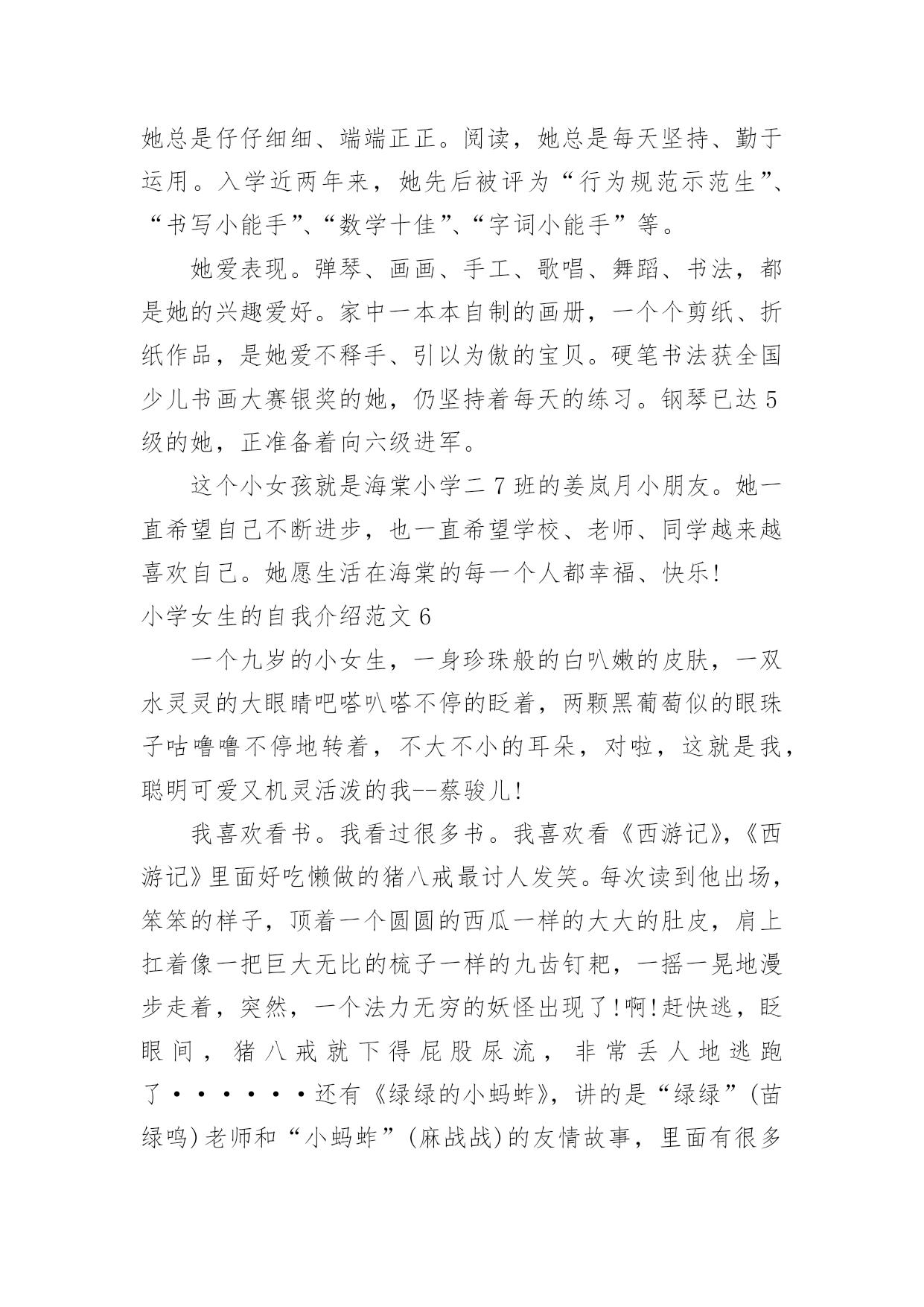 小学女生的自我介绍小学女生的自我介绍范文(集合10篇)当去到一个新环境下,我们难以避免地要作出自我介绍,通过自我介绍可以得到他人的认可。那么自我介绍有什么格式呢?下面是小编精心整理的小学女生的自我介绍范文,欢迎阅读与收藏。小学女生的自我介绍范文1大家好!我叫李可,是五年级的学生,现在十一岁,我有特别多的爱好。我弹得一手好古筝,爱唱歌,喜欢看侦探小说,看武侠片,看动画片《柯南》,爱自己动手画卡通人物……我在班上成绩好,人缘也不错。我喜欢交脾气好,和我有共同爱好的朋友,我也希望有更多的人与我交朋友。我爱写作文,每篇作文都有和别人不同的特点。写景时,我喜欢把语句写得优美流畅;写状物时,我喜欢写得生动具体;写议论文时,我喜欢发表自己的见解;写想象作文时,我喜欢大胆地想象,无拘无束;写人和事时,我喜欢表达自己的真情实感;写同学之间发生的事,我喜欢模仿中学生写作,适当加入一些新潮词语和小小的幽默……我喜欢各种可爱好玩的小玩意;我喜欢独来独往地做自己喜欢的事,摆出高傲的姿态;我喜欢和同学打成一片,不会寂寞;我喜欢给远方的朋友写信,毫不掩饰地表达自己的感情;我喜欢和同学聊小说、电视中的人物事情,我喜欢和男生聊武侠片侦探小说,我喜欢自己听着音乐走进梦乡……我就是我,一个男女同学都喜欢的女孩。我可以和男生聊得兴高采烈,也可以和女生说得头头是道,我都不相信自己有如此大的魅力。个性的我,我喜欢!小学女生的自我介绍范文2今年我十岁了,是一个活泼可爱且又胖乎乎的小女孩。粗粗的眉毛,挺挺的鼻子和大而微翘的嘴巴,那是爸爸给我的礼物。妈妈也不甘示弱,说那双明亮的眼睛是她给我的礼物。我爱英语,我不但在学校上课时认真听讲,回家仔细对待每项回家作业,我还利用双休日去吉得堡读美式英语。我非常喜欢去那里上课,因为它跳出了平时在课堂上单一不变的教育模式,而是在生动有趣的游戏过程中,轻松地学到了丰富的英语知识。我还顺利的通过了20xx年上海市中小学英语学科学业水平等级考试一级合格。我不但喜欢英语,还喜欢电脑。平时,在做好作业的空闲时间,我喜欢在网上冲浪或者上班级博客网阅览同学们优秀的作文,由于太专注,我常忘了时间。妈妈常常对我说:“再这样下去你要变成小四眼啦!”这就是我——一个活泼可爱且又胖乎乎的小女孩。小学女生的自我介绍范文3我叫谢永淇,我今年12岁了。在江苏省南通市如皋市实验小学上学。我上五年级了。我的成绩一般,是一个数学祖长。一头乌黑的头发,一个小小的鼻子下长着一张能说会道的嘴巴。我的爱好有很多,比如看书,跑步,踢足球等等我可是一个小书虫。有一次,我正在津津有味地看着一本【十万个为什么】,突然,妈妈说家里没盐了,叫我去附近的商店买一包盐。我放下手中的【十万个为什么】急匆匆地跑出去买盐了我一道商店拿了盐,付了钱就回家了。我一回家就又看了起来。妈妈问我‘‘你买的盐在哪。’我这才想起来,刚刚付钱后忘拿盐了。我赶忙去拿盐你们说,我是不是一个小书虫啊。小学女生的自我介绍范文4我的名字叫XX,今年9岁了,我在孟晏完小三年级读书。我有一双明亮的眼睛,在长长的睫毛衬托下显得更加迷人。我有一个小巧的鼻子,有一张小小的嘴巴,我的身高是1米3左右。大家都说我长的非常可爱,像一个布娃娃。大家都说我很文静,像个小淑女,我的爱好是学习,因为只有学习好了长大才能做想做的事,除了学习我的.爱好是打羽毛球,因为打羽毛球可以锻炼身体。我的优点是帮妈妈做家务,而且同学生气的时候我还能给同学逗笑。但是我有一个最大的缺点是胆小,有一次晚间睡觉的时候妈妈有事出去了,我非常害怕。我现在是班级的学习委员,要以身作则,好好学习。希望能和大家成为一名好朋友,共同努力,共同取得优秀的成绩。谢谢!小学女生的自我介绍范文5在海棠小学二7班,有一位文静聪慧、善良能干的小女孩。她爱学校。看到学校楼梯口有纸屑,她会立刻捡起来扔进垃圾桶。看到有谁不爱护学校的花草,她会主动地做护绿。她爱老师。看见任何一位老师,她会微笑着敬礼。看见班中老师累了,她会给老师揉揉肩、敲敲背。看见班中老师脚痛,手里拿着作业本走路很不方便,她会热心地帮助老师拿。她爱同学。同桌题目不会做时,她会主动地教。同学在走廊乱跑时,她会善意地提醒不要奔跑、注意安全。同学脚痛时,她会主动地搀扶。同学擦黑板没办法擦到高处时,她会发挥高个儿优势帮着擦。她爱劳动。每天,班级的讲台,她会擦得干干净净,使老师们一天的教学开开心心。每天,班级的小花,她会照顾得尽心尽责,使小花们长得健健康康。每天,奶奶忙着家务时,她会在一旁做小帮手,使奶奶的心里甜甜蜜蜜。她爱运动。篮球场上,她准确地投篮、灵活地运球,得到了教练的表扬。游泳馆里,她勇敢地潜水、快速地游动,得到了教练的好评。家里的餐桌,每周日晚上成了她的乒乓桌,她欢快地接球、灵活地移动,带着全家来运动。她爱学习。上课,她总是认真听讲、积