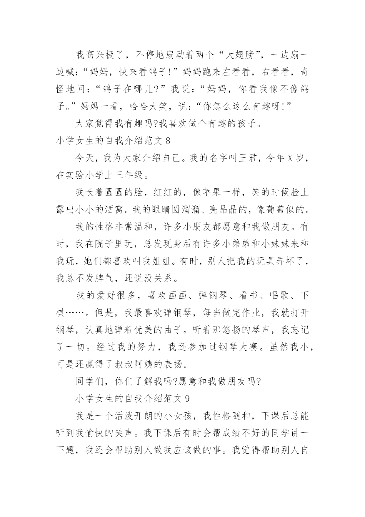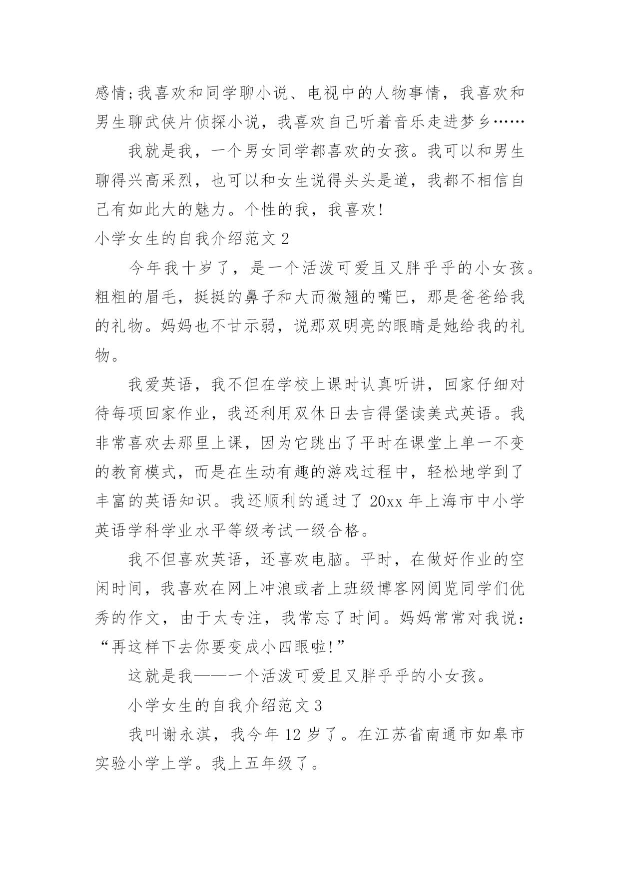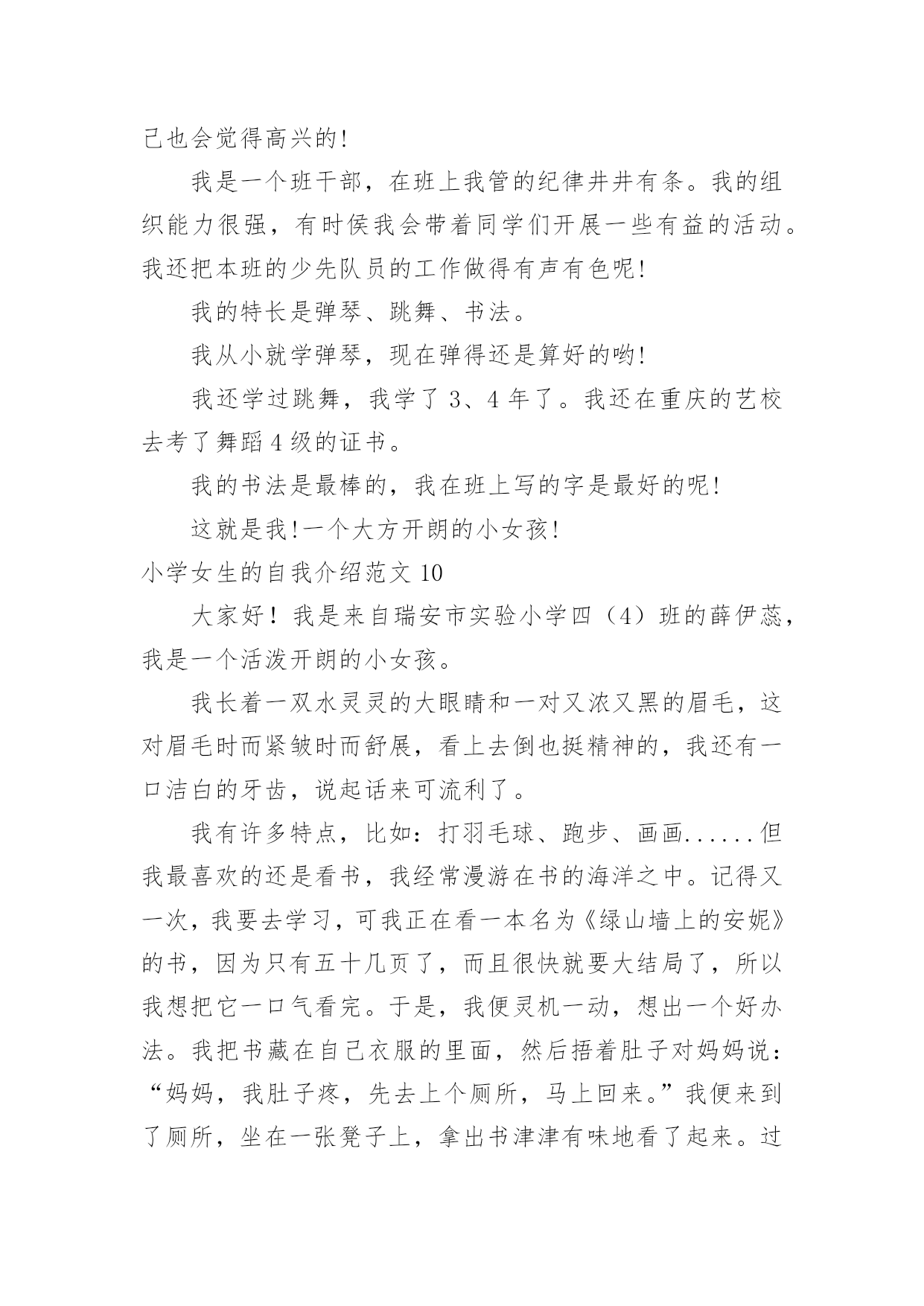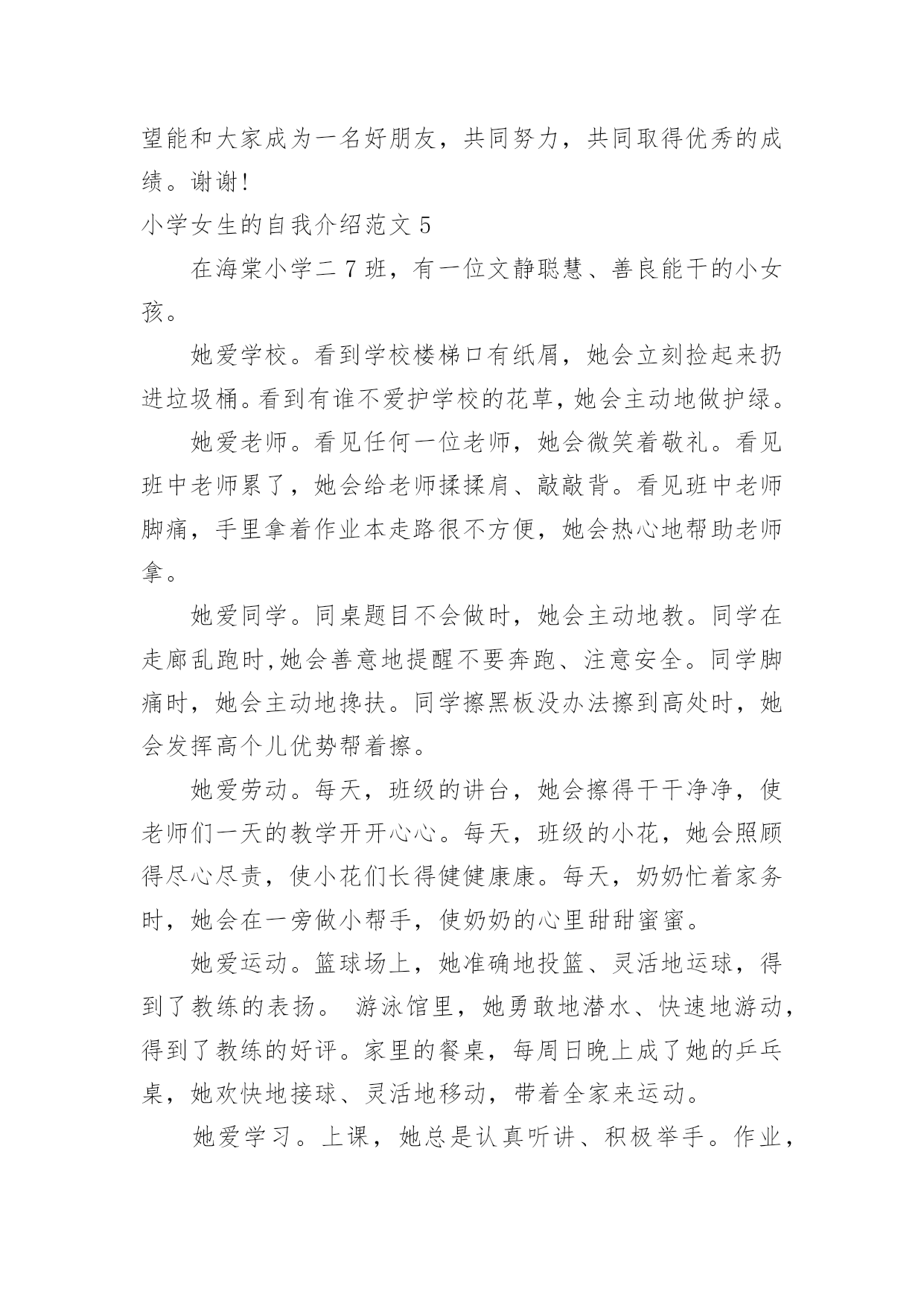 小学女生的自我介绍小学女生的自我介绍范文(集合10篇)当去到一个新环境下,我们难以避免地要作出自我介绍,通过自我介绍可以得到他人的认可。那么自我介绍有什么格式呢?下面是小编精心整理的小学女生的自我介绍范文,欢迎阅读与收藏。小学女生的自我介绍范文1大家好!我叫李可,是五年级的学生,现在十一岁,我有特别多的爱好。我弹得一手好古筝,爱唱歌,喜欢看侦探小说,看武侠片,看动画片《柯南》,爱自己动手画卡通人物……我在班上成绩好,人缘也不错。我喜欢交脾气好,和我有共同爱好的朋友,我也希望有更多的人与我交朋友。我爱写作文,每篇作文都有和别人不同的特点。写景时,我喜欢把语句写得优美流畅;写状物时,我喜欢写得生动具体;写议论文时,我喜欢发表自己的见解;写想象作文时,我喜欢大胆地想象,无拘无束;写人和事时,我喜欢表达自己的真情实感;写同学之间发生的事,我喜欢模仿中学生写作,适当加入一些新潮词语和小小的幽默……我喜欢各种可爱好玩的小玩意;我喜欢独来独往地做自己喜欢的事,摆出高傲的姿态;我喜欢和同学打成一片,不会寂寞;我喜欢给远方的朋友写信,毫不掩饰地表达自己的感情;我喜欢和同学聊小说、电视中的人物事情,我喜欢和男生聊武侠片侦探小说,我喜欢自己听着音乐走进梦乡……我就是我,一个男女同学都喜欢的女孩。我可以和男生聊得兴高采烈,也可以和女生说得头头是道,我都不相信自己有如此大的魅力。个性的我,我喜欢!小学女生的自我介绍范文2今年我十岁了,是一个活泼可爱且又胖乎乎的小女孩。粗粗的眉毛,挺挺的鼻子和大而微翘的嘴巴,那是爸爸给我的礼物。妈妈也不甘示弱,说那双明亮的眼睛是她给我的礼物。我爱英语,我不但在学校上课时认真听讲,回家仔细对待每项回家作业,我还利用双休日去吉得堡读美式英语。我非常喜欢去那里上课,因为它跳出了平时在课堂上单一不变的教育模式,而是在生动有趣的游戏过程中,轻松地学到了丰富的英语知识。我还顺利的通过了20xx年上海市中小学英语学科学业水平等级考试一级合格。我不但喜欢英语,还喜欢电脑。平时,在做好作业的空闲时间,我喜欢在网上冲浪或者上班级博客网阅览同学们优秀的作文,由于太专注,我常忘了时间。妈妈常常对我说:“再这样下去你要变成小四眼啦!”这就是我——一个活泼可爱且又胖乎乎的小女孩。小学女生的自我介绍范文3我叫谢永淇,我今年12岁了。在江苏省南通市如皋市实验小学上学。我上五年级了。我的成绩一般,是一个数学祖长。一头乌黑的头发,一个小小的鼻子下长着一张能说会道的嘴巴。我的爱好有很多,比如看书,跑步,踢足球等等我可是一个小书虫。有一次,我正在津津有味地看着一本【十万个为什么】,突然,妈妈说家里没盐了,叫我去附近的商店买一包盐。我放下手中的【十万个为什么】急匆匆地跑出去买盐了我一道商店拿了盐,付了钱就回家了。我一回家就又看了起来。妈妈问我‘‘你买的盐在哪。’我这才想起来,刚刚付钱后忘拿盐了。我赶忙去拿盐你们说,我是不是一个小书虫啊。小学女生的自我介绍范文4我的名字叫XX,今年9岁了,我在孟晏完小三年级读书。我有一双明亮的眼睛,在长长的睫毛衬托下显得更加迷人。我有一个小巧的鼻子,有一张小小的嘴巴,我的身高是1米3左右。大家都说我长的非常可爱,像一个布娃娃。大家都说我很文静,像个小淑女,我的爱好是学习,因为只有学习好了长大才能做想做的事,除了学习我的.爱好是打羽毛球,因为打羽毛球可以锻炼身体。我的优点是帮妈妈做家务,而且同学生气的时候我还能给同学逗笑。但是我有一个最大的缺点是胆小,有一次晚间睡觉的时候妈妈有事出去了,我非常害怕。我现在是班级的学习委员,要以身作则,好好学习。希望能和大家成为一名好朋友,共同努力,共同取得优秀的成绩。谢谢!小学女生的自我介绍范文5在海棠小学二7班,有一位文静聪慧、善良能干的小女孩。她爱学校。看到学校楼梯口有纸屑,她会立刻捡起来扔进垃圾桶。看到有谁不爱护学校的花草,她会主动地做护绿。她爱老师。看见任何一位老师,她会微笑着敬礼。看见班中老师累了,她会给老师揉揉肩、敲敲背。看见班中老师脚痛,手里拿着作业本走路很不方便,她会热心地帮助老师拿。她爱同学。同桌题目不会做时,她会主动地教。同学在走廊乱跑时,她会善意地提醒不要奔跑、注意安全。同学脚痛时,她会主动地搀扶。同学擦黑板没办法擦到高处时,她会发挥高个儿优势帮着擦。她爱劳动。每天,班级的讲台,她会擦得干干净净,使老师们一天的教学开开心心。每天,班级的小花,她会照顾得尽心尽责,使小花们长得健健康康。每天,奶奶忙着家务时,她会在一旁做小帮手,使奶奶的心里甜甜蜜蜜。她爱运动。篮球场上,她准确地投篮、灵活地运球,得到了教练的表扬。游泳馆里,她勇敢地潜水、快速地游动,得到了教练的好评。家里的餐桌,每周日晚上成了她的乒乓桌,她欢快地接球、灵活地移动,带着全家来运动。她爱学习。上课,她总是认真听讲、积